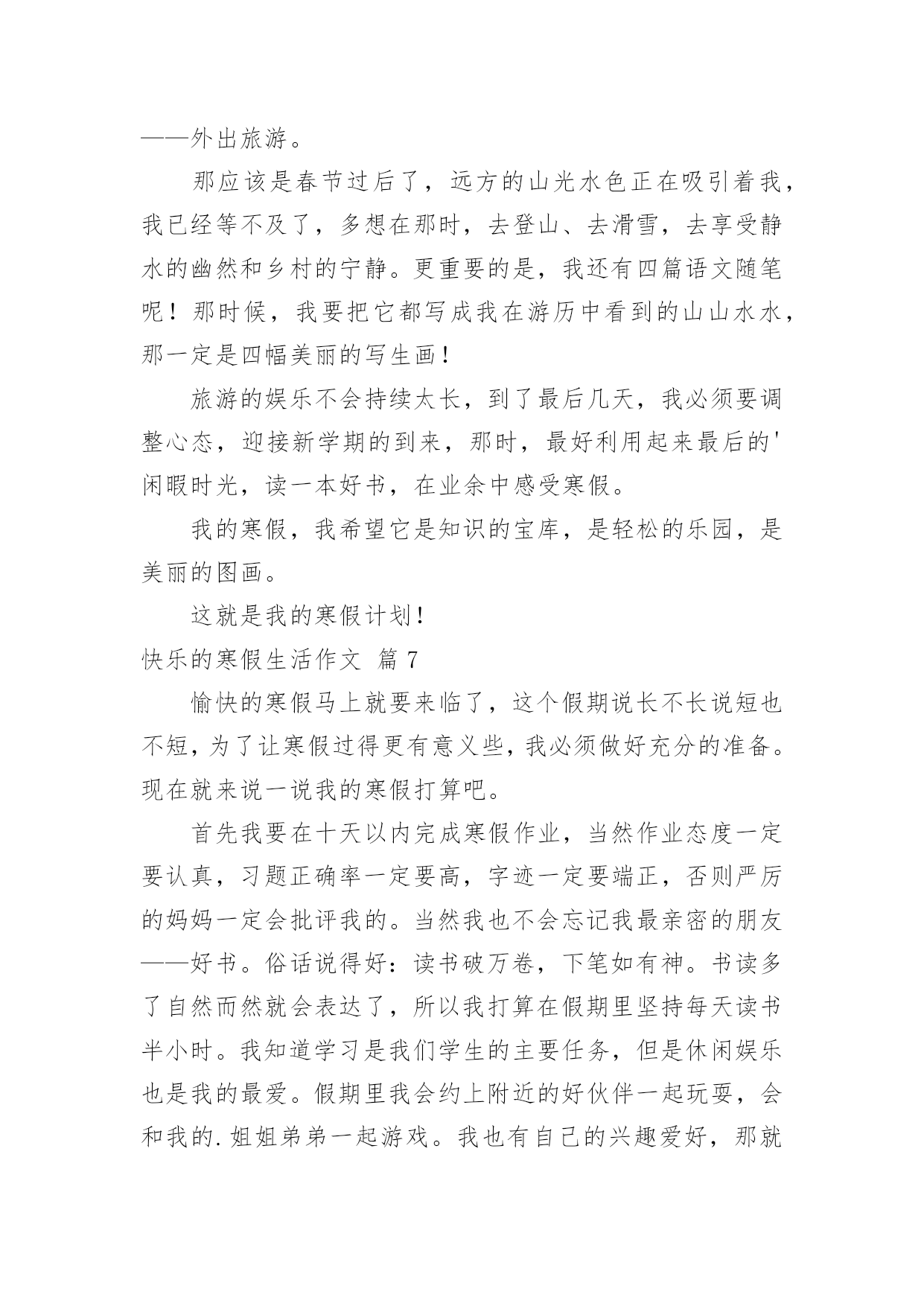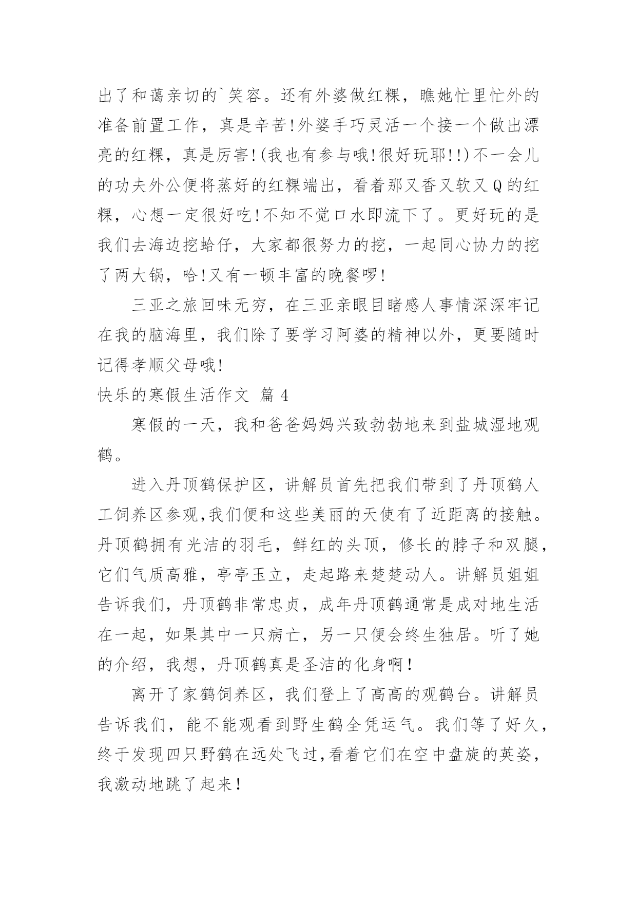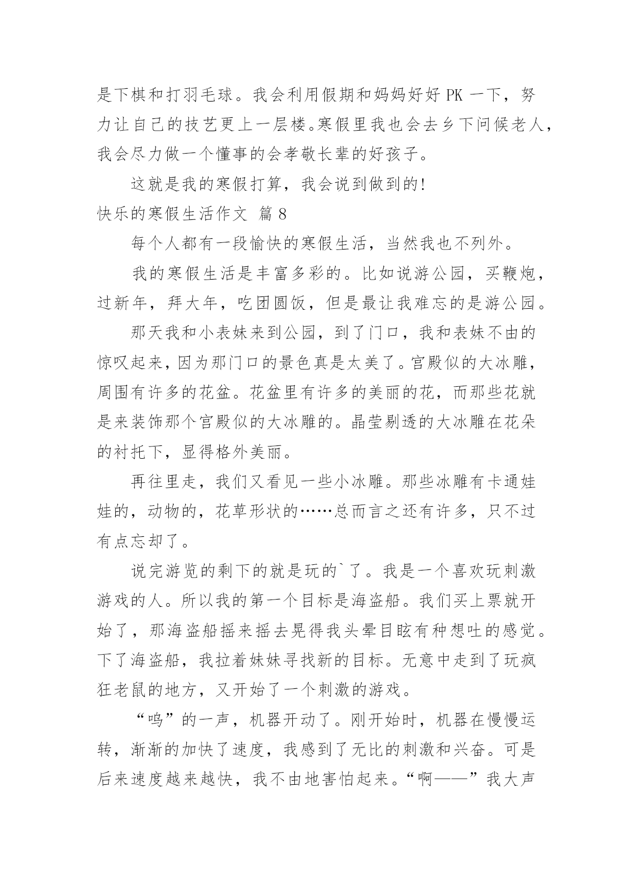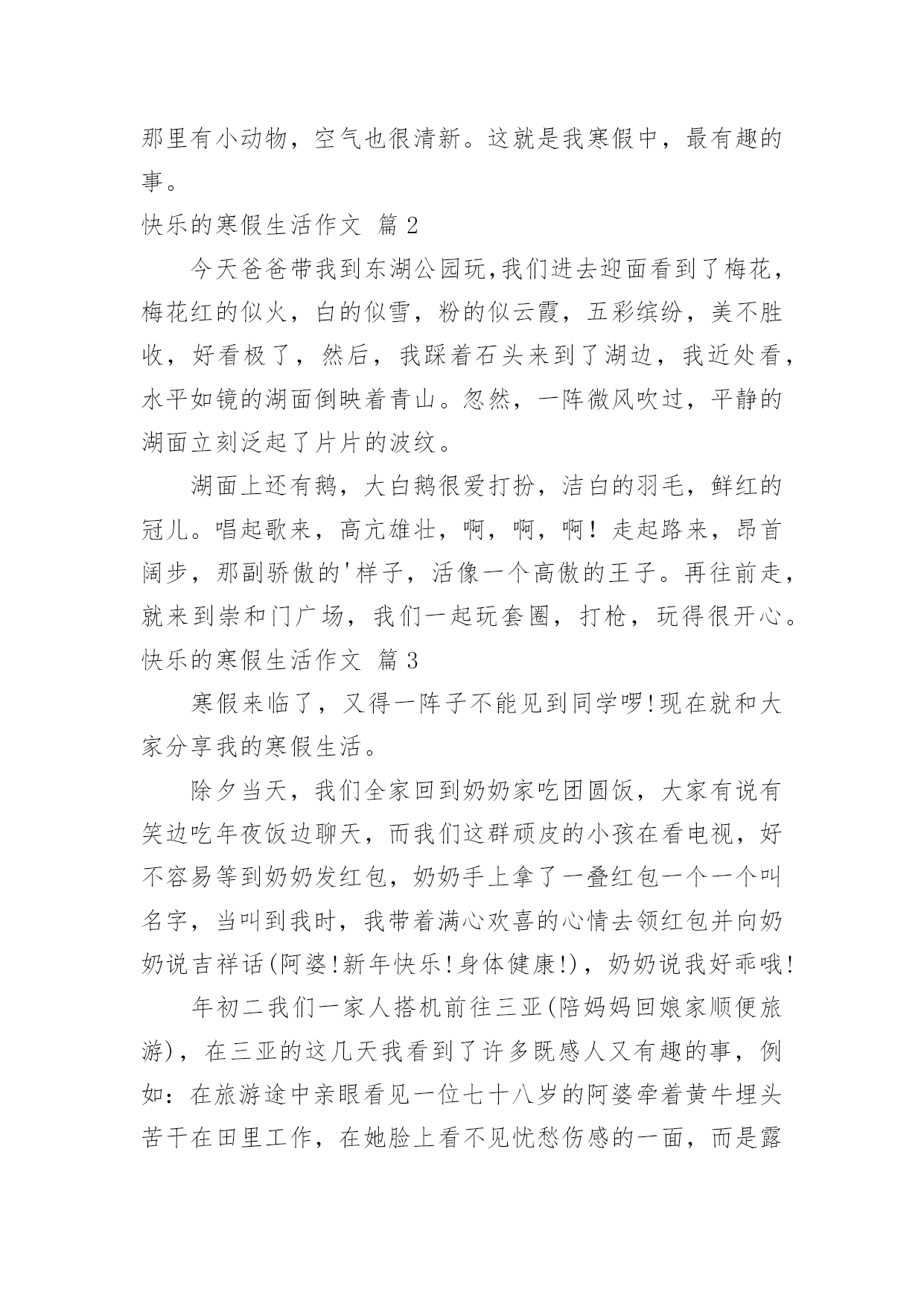 快乐的寒假生活作文【推荐】快乐的寒假生活作文汇编9篇在日常学习、工作和生活中,大家都写过作文,肯定对各类作文都很熟悉吧,作文是一种言语活动,具有高度的综合性和创造性。相信很多朋友都对写作文感到非常苦恼吧,下面是小编整理的快乐的寒假生活作文9篇,欢迎阅读,希望大家能够喜欢。快乐的寒假生活作文篇1寒假这些天发生的趣事可真多啊,寒假的第一天,也是,我跑步打卡的'第一天。最开始,我是和妹妹一起跑的。妹妹和我在院子里比赛,院子里还有一个池子,池子里还有我的宠物-小鱼。雨天的时候,我在车库里跑,因为雨太大了,你就像一个巨人在跺脚。阴天的时候,我在马路上跑,周围的车子上奔流不息的河水,飞快地向前开去,我一时兴起就和车子比起赛来了,我奋力地向前奔跑,眼看着就要落后了,突然红灯亮了,车子停下了,最后我终于赢了!我立刻眉开眼笑起来。有一次,我在马路上跑的时候,突然听到了,有人喊救命!我跑过去一看好大一个坑啊,仔细一看,里面有一个外国人,个子矮矮的,像小人国里出来的。他很胖,我使出九牛二虎之力,终于把他拉上来了,他连声说感谢就走了。我喜欢跑步打卡这一项运动,其实我想去森林跑,因为那里有小动物,空气也很清新。这就是我寒假中,最有趣的事。快乐的寒假生活作文篇2今天爸爸带我到东湖公园玩,我们进去迎面看到了梅花,梅花红的似火,白的似雪,粉的似云霞,五彩缤纷,美不胜收,好看极了,然后,我踩着石头来到了湖边,我近处看,水平如镜的湖面倒映着青山。忽然,一阵微风吹过,平静的湖面立刻泛起了片片的波纹。湖面上还有鹅,大白鹅很爱打扮,洁白的羽毛,鲜红的冠儿。唱起歌来,高亢雄壮,啊,啊,啊!走起路来,昂首阔步,那副骄傲的'样子,活像一个高傲的王子。再往前走,就来到崇和门广场,我们一起玩套圈,打枪,玩得很开心。快乐的寒假生活作文篇3寒假来临了,又得一阵子不能见到同学啰!现在就和大家分享我的寒假生活。除夕当天,我们全家回到奶奶家吃团圆饭,大家有说有笑边吃年夜饭边聊天,而我们这群顽皮的小孩在看电视,好不容易等到奶奶发红包,奶奶手上拿了一叠红包一个一个叫名字,当叫到我时,我带着满心欢喜的心情去领红包并向奶奶说吉祥话(阿婆!新年快乐!身体健康!),奶奶说我好乖哦!年初二我们一家人搭机前往三亚(陪妈妈回娘家顺便旅游),在三亚的这几天我看到了许多既感人又有趣的事,例如:在旅游途中亲眼看见一位七十八岁的阿婆牵着黄牛埋头苦干在田里工作,在她脸上看不见忧愁伤感的一面,而是露出了和蔼亲切的`笑容。还有外婆做红粿,瞧她忙里忙外的准备前置工作,真是辛苦!外婆手巧灵活一个接一个做出漂亮的红粿,真是厉害!(我也有参与哦!很好玩耶!!)不一会儿的功夫外公便将蒸好的红粿端出,看着那又香又软又Q的红粿,心想一定很好吃!不知不觉口水即流下了。更好玩的是我们去海边挖蛤仔,大家都很努力的挖,一起同心协力的挖了两大锅,哈!又有一顿丰富的晚餐啰!三亚之旅回味无穷,在三亚亲眼目睹感人事情深深牢记在我的脑海里,我们除了要学习阿婆的精神以外,更要随时记得孝顺父母哦!快乐的寒假生活作文篇4寒假的一天,我和爸爸妈妈兴致勃勃地来到盐城湿地观鹤。进入丹顶鹤保护区,讲解员首先把我们带到了丹顶鹤人工饲养区参观,我们便和这些美丽的天使有了近距离的接触。丹顶鹤拥有光洁的羽毛,鲜红的头顶,修长的脖子和双腿,它们气质高雅,亭亭玉立,走起路来楚楚动人。讲解员姐姐告诉我们,丹顶鹤非常忠贞,成年丹顶鹤通常是成对地生活在一起,如果其中一只病亡,另一只便会终生独居。听了她的介绍,我想,丹顶鹤真是圣洁的化身啊!离开了家鹤饲养区,我们登上了高高的观鹤台。讲解员告诉我们,能不能观看到野生鹤全凭运气。我们等了好久,终于发现四只野鹤在远处飞过,看着它们在空中盘旋的英姿,我激动地跳了起来!回去的路上,我不由自主地想起了语文课本中的《美丽的丹顶鹤》,刚才观鹤的`情景也随着课文再一次浮现在我的眼前,真是百闻不如一见啊!美丽的丹顶鹤真让人喜爱。快乐的寒假生活作文篇5转眼之间,快乐而又充实的寒假生活就结束了。放假之初,为了让孩子度过一个丰富而有意义的寒假生活,结合老师的计划安排,我和他又一起制订了一份新的寒假计划。“凡事有预则立”,有了这份计划,既能培养孩子养成按时做事的好习惯,也能对他的整个假期生活确立一个明确的目标。按照这份计划安排,每天早晨他吃过早餐后的第一件事就是做寒假作业,所以他的这份寒假作业几乎是没费什么力气就完成了。做完作业,再开始绘画、跳绳、拍球、打羽毛球等。孩子的体育成绩一直是他的弱项,我们就想利用这个假期把他的不足弥补起来。经过一个假期的锻炼,他的跳绳取得了明显进步,从过去只能跳两三个到连续跳几十个,他自己也欣喜不已。成绩虽然不起眼,但是我们觉得,关注孩子的弱点,发挥他的长项,才能够让他全面发展,这对培养他的自信心很重要。一年级学生经过一个学期的学