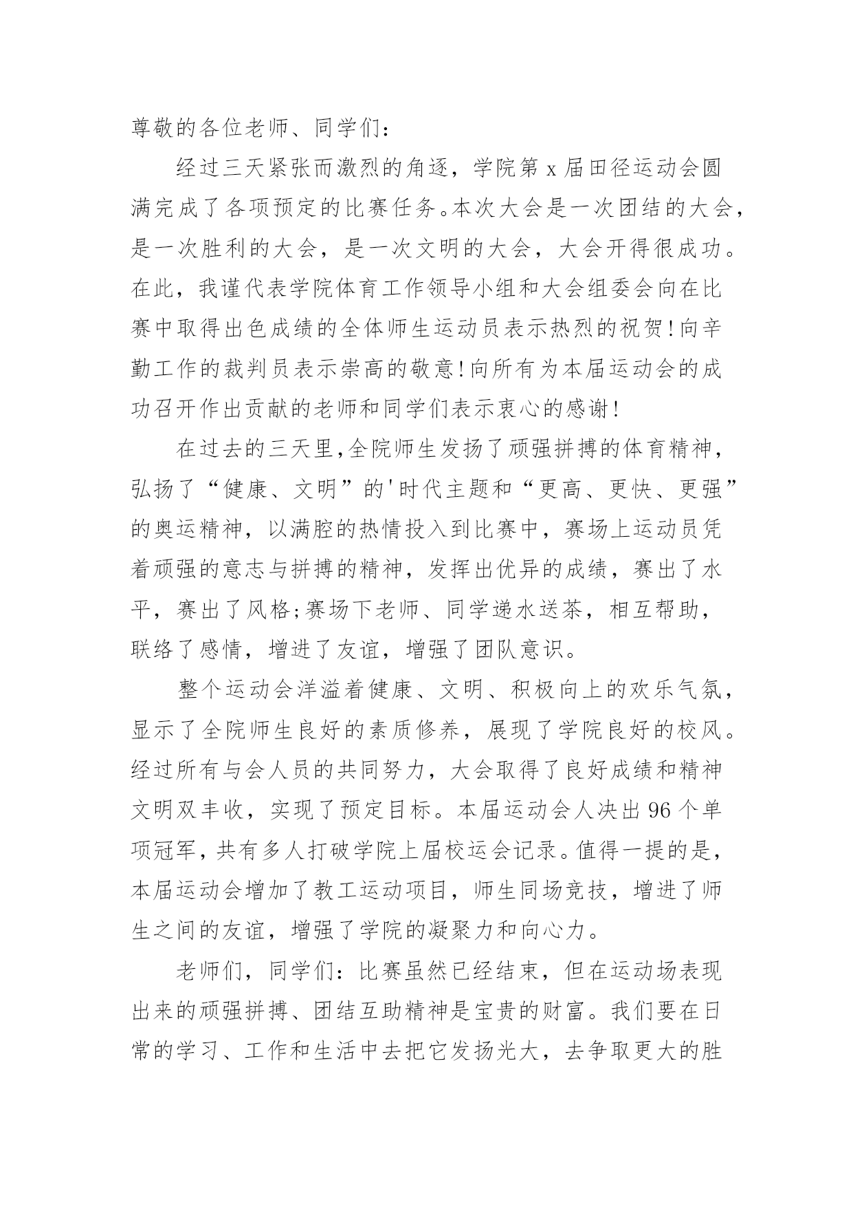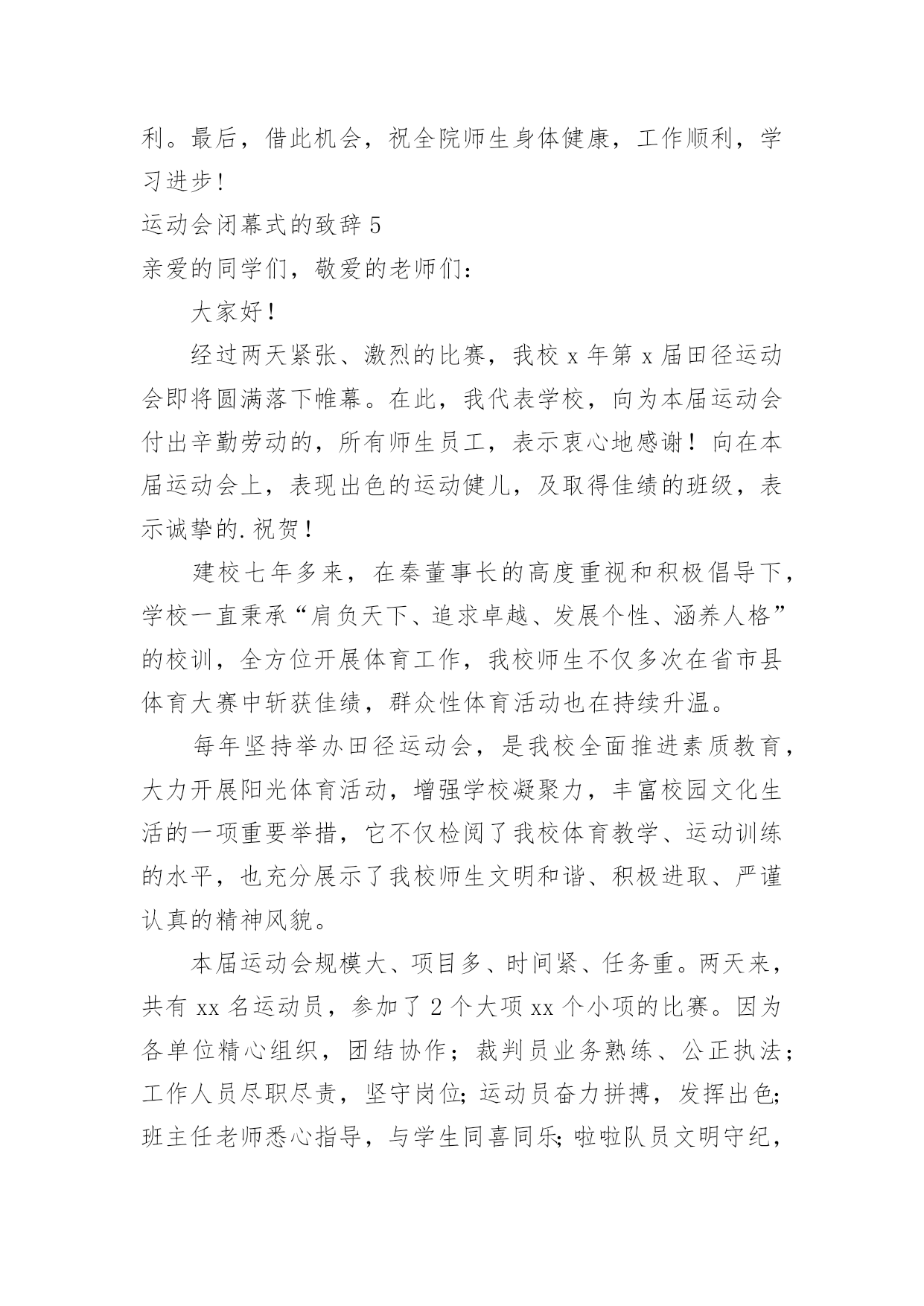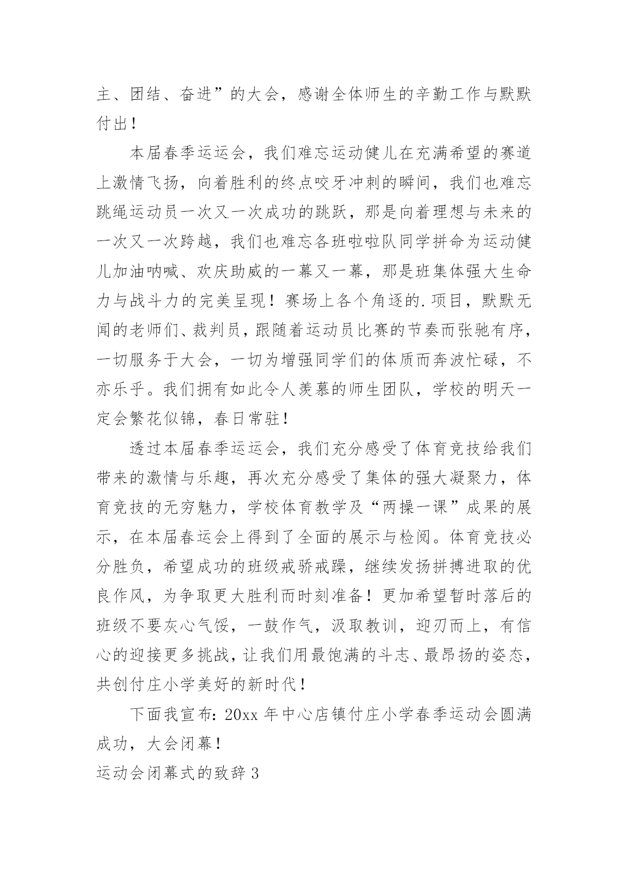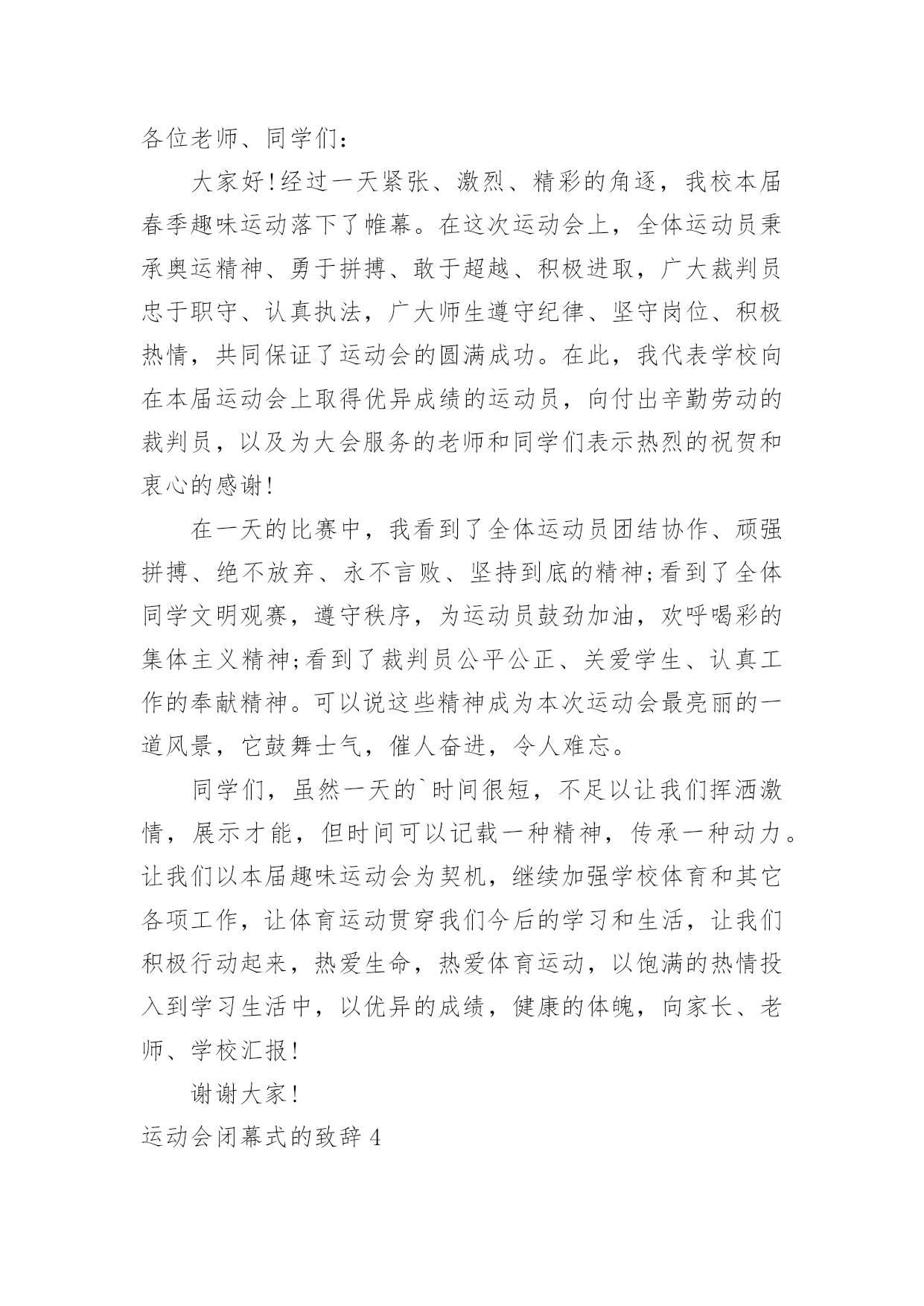 运动会闭幕式的致辞运动会闭幕式的致辞在日常学习、工作或生活中,大家对致辞都不陌生吧,致辞是指在仪式上表示勉励、感谢、祝贺、哀悼等的话,向他人表达思想感情的文字或语言。那么你有真正了解过致辞吗?以下是小编收集整理的运动会闭幕式的致辞,希望对大家有所帮助。运动会闭幕式的致辞1各位领导、老师,全体运动员们:大家下午好!异彩纷呈、硕果累累的我校首届校园艺术节、田径运动会今天就要隆重闭幕了。此时此刻,我有太多的话想要对大家说,有太多的感谢想要对大家表达。我要想对大家说的是:运动会比赛项目已经顺利结束了。这次运动会,无论从组织安排、项目设置、器材准备、过程管理还是从同学们的运动热情、观众的加油鼓劲、工作服务同学的认真负责等各方面来看,师生们的一致评价是:规范、严谨、高效、科学,真正体现了学校提出的“运动、健康、快乐、更高、更快、更强”的运动宗旨。所以,借此机会,我谨代表学校对各位运动员在运动场上取得的优异成绩、对老师们的辛勤付出、尤其是对整个组织机构的默默奉献表示热烈的祝贺和衷心的感谢!这次校园艺术节,布局谋篇精心合理,设计运作创意求新,开幕式热烈隆重,充满了欢快、喜庆和祥和的气氛,有老师说:“看到了开幕式,有一种想哭的冲动”,我知道这是激动的泪水,这是师生齐心的表现,其实我看到了开幕式,我也觉得非常振奋,我也非常激动。当然,团体操表演也非常不错,同学们的表演都十分到位,十分给力。在这次校园艺术节中还设置了诗歌朗诵比赛,我们xx个班级班班参与,每个班都各有特色,每个班都做了充分的准备,虽然我们只表彰了xx多个班级,但是竞技场上没有失败者,参与就是人生的经历,参与就是最大的成功。我更相信,让大家影响至为深刻的,感动极其强烈的,肯定是现在还在我们眼前心中萦绕回旋,余音绕梁,激动不息的文艺晚会。这台晚会,安排布置巧,节目质量高,各个环节精彩不断,高潮迭起,观众与演员互动,场上和场下齐舞,所有的.同学和老师都融入其中,所有的领导和来宾都为之震撼,火炬中学和永新中学的孩子们群情振奋,全校师生都共享在这欢乐的海洋里。可以毫不夸张地讲:这是迄今为止我们高新区校园文艺汇演,甚至是我们xx市校园艺术节文艺汇演中节目质量都非常高的一台大型综艺类盛大演出。说实在话,我为你们感到骄傲,为我们高新区实验中学在短短的几个月时间内能够打造出如此高品质晚会感到自豪,我要谢谢艺体处吴咏梅主任和你的同事们,谢谢学校各部门的大力支持,尤其要谢谢的是同学们的精彩演出。当然,本次运动会和艺术节也有一些值得我们去总结、去思考的地方,无论是前期筹备工作、赛中管理工作、安全防护工作、运动竞技培训还是晚会统筹工作、节目深加工工作、弘扬主旋律工作、裁判工作等等,我认为都还需要我们主管部门去总结、去思索,在工作中求进步,在探索中求发展。老师们,同学们,到现在为止,我越来越坚定了我校的办学方针,那就是一定要坚持“文化奠基,专业扬长”的办学思路,一定要坚持“艺文并举,动静结合”办学途径,一定要坚信“一切为了学生终生发展奠基,一切为了学生个性发展设计”这一学校办学颠扑不破的真理。各位老师,各位同学,xx中学首届校园艺术节、田径运动会的三天时间是我们经久难忘的三天时间,在各项议程已经顺利完成即将闭幕之际,我再一次对各位的辛勤付出表示诚挚的谢意,祝老师们、同学们工作愉快、学习顺利,让我们期待下一届艺术节、运动会会给我们带来更为精彩的表演。现在,我宣布:xx区实验中学首届校园艺术节、田径运动会胜利闭幕!谢谢大家!运动会闭幕式的致辞2老师们,同学们:经过一天紧张有序的比赛,在全体运动员积极配合、不懈拼搏进取下,特别是大会裁判员、工作人员团结一致、秉公执法,20xx年中心店镇付庄小学春季运动会圆满结束各项议程,没有全体师生的齐心协力,就不可能组织成一届“民主、团结、奋进”的大会,感谢全体师生的辛勤工作与默默付出!本届春季运运会,我们难忘运动健儿在充满希望的赛道上激情飞扬,向着胜利的终点咬牙冲刺的瞬间,我们也难忘跳绳运动员一次又一次成功的跳跃,那是向着理想与未来的一次又一次跨越,我们也难忘各班啦啦队同学拼命为运动健儿加油呐喊、欢庆助威的一幕又一幕,那是班集体强大生命力与战斗力的完美呈现!赛场上各个角逐的.项目,默默无闻的老师们、裁判员,跟随着运动员比赛的节奏而张驰有序,一切服务于大会,一切为增强同学们的体质而奔波忙碌,不亦乐乎。我们拥有如此令人羡慕的师生团队,学校的明天一定会繁花似锦,春日常驻!透过本届春季运运会,我们充分感受了体育竞技给我们带来的激情与乐趣,再次充分感受了集体的强大凝聚力,体育竞技的无穷魅力,学校体育教学及“两操一课”成果的展示,在本届春运会上得到了全面的展示与检阅。体育竞技必分胜负,希望成功的班级戒骄戒躁,继续发扬拼搏进取的优良作风,为争取更大胜利而时刻准备!更加希望暂时落后的班级不要