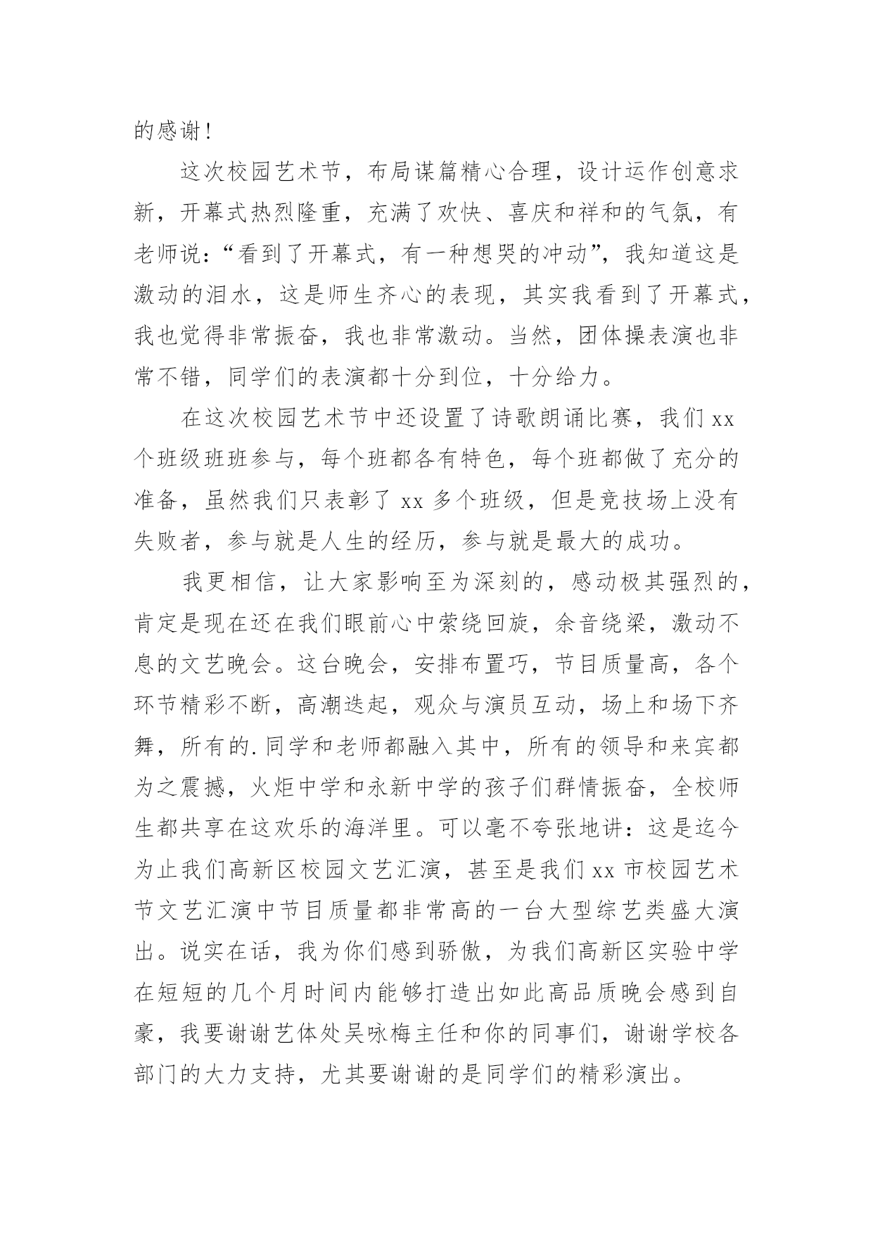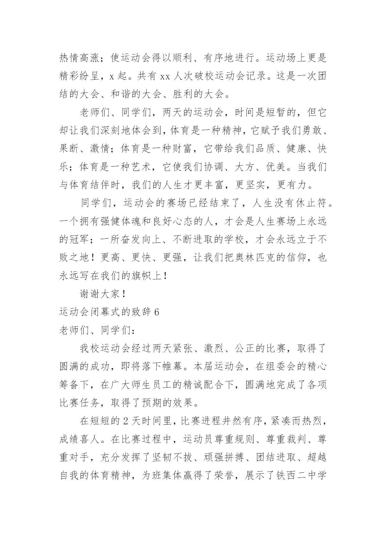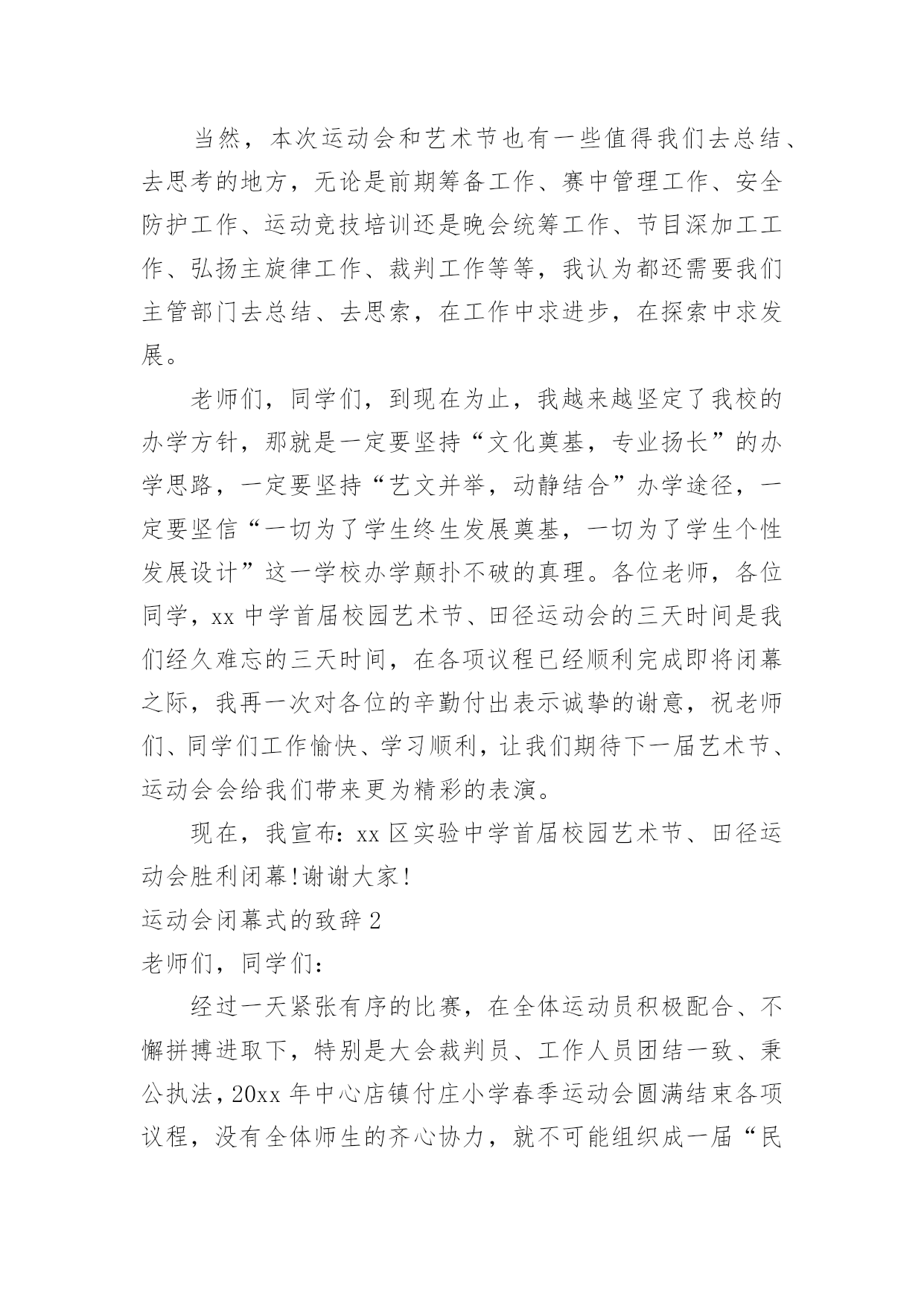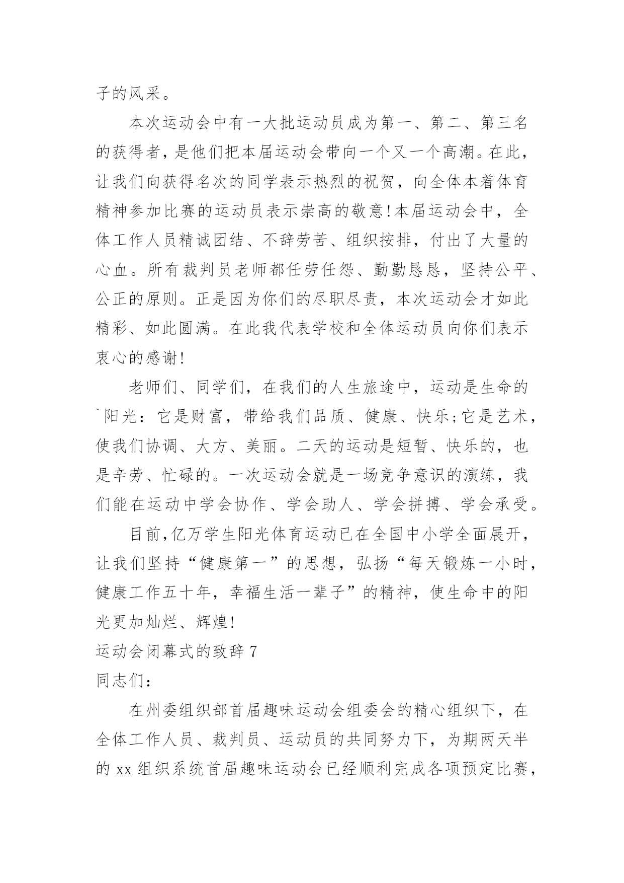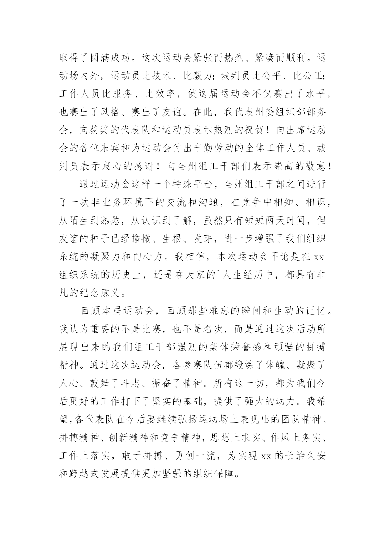 运动会闭幕式的致辞运动会闭幕式的致辞在日常学习、工作或生活中,大家对致辞都不陌生吧,致辞是指在仪式上表示勉励、感谢、祝贺、哀悼等的话,向他人表达思想感情的文字或语言。那么你有真正了解过致辞吗?以下是小编收集整理的运动会闭幕式的致辞,希望对大家有所帮助。运动会闭幕式的致辞1各位领导、老师,全体运动员们:大家下午好!异彩纷呈、硕果累累的我校首届校园艺术节、田径运动会今天就要隆重闭幕了。此时此刻,我有太多的话想要对大家说,有太多的感谢想要对大家表达。我要想对大家说的是:运动会比赛项目已经顺利结束了。这次运动会,无论从组织安排、项目设置、器材准备、过程管理还是从同学们的运动热情、观众的加油鼓劲、工作服务同学的认真负责等各方面来看,师生们的一致评价是:规范、严谨、高效、科学,真正体现了学校提出的“运动、健康、快乐、更高、更快、更强”的运动宗旨。所以,借此机会,我谨代表学校对各位运动员在运动场上取得的优异成绩、对老师们的辛勤付出、尤其是对整个组织机构的默默奉献表示热烈的祝贺和衷心的感谢!这次校园艺术节,布局谋篇精心合理,设计运作创意求新,开幕式热烈隆重,充满了欢快、喜庆和祥和的气氛,有老师说:“看到了开幕式,有一种想哭的冲动”,我知道这是激动的泪水,这是师生齐心的表现,其实我看到了开幕式,我也觉得非常振奋,我也非常激动。当然,团体操表演也非常不错,同学们的表演都十分到位,十分给力。在这次校园艺术节中还设置了诗歌朗诵比赛,我们xx个班级班班参与,每个班都各有特色,每个班都做了充分的准备,虽然我们只表彰了xx多个班级,但是竞技场上没有失败者,参与就是人生的经历,参与就是最大的成功。我更相信,让大家影响至为深刻的,感动极其强烈的,肯定是现在还在我们眼前心中萦绕回旋,余音绕梁,激动不息的文艺晚会。这台晚会,安排布置巧,节目质量高,各个环节精彩不断,高潮迭起,观众与演员互动,场上和场下齐舞,所有的.同学和老师都融入其中,所有的领导和来宾都为之震撼,火炬中学和永新中学的孩子们群情振奋,全校师生都共享在这欢乐的海洋里。可以毫不夸张地讲:这是迄今为止我们高新区校园文艺汇演,甚至是我们xx市校园艺术节文艺汇演中节目质量都非常高的一台大型综艺类盛大演出。说实在话,我为你们感到骄傲,为我们高新区实验中学在短短的几个月时间内能够打造出如此高品质晚会感到自豪,我要谢谢艺体处吴咏梅主任和你的同事们,谢谢学校各部门的大力支持,尤其要谢谢的是同学们的精彩演出。当然,本次运动会和艺术节也有一些值得我们去总结、去思考的地方,无论是前期筹备工作、赛中管理工作、安全防护工作、运动竞技培训还是晚会统筹工作、节目深加工工作、弘扬主旋律工作、裁判工作等等,我认为都还需要我们主管部门去总结、去思索,在工作中求进步,在探索中求发展。老师们,同学们,到现在为止,我越来越坚定了我校的办学方针,那就是一定要坚持“文化奠基,专业扬长”的办学思路,一定要坚持“艺文并举,动静结合”办学途径,一定要坚信“一切为了学生终生发展奠基,一切为了学生个性发展设计”这一学校办学颠扑不破的真理。各位老师,各位同学,xx中学首届校园艺术节、田径运动会的三天时间是我们经久难忘的三天时间,在各项议程已经顺利完成即将闭幕之际,我再一次对各位的辛勤付出表示诚挚的谢意,祝老师们、同学们工作愉快、学习顺利,让我们期待下一届艺术节、运动会会给我们带来更为精彩的表演。现在,我宣布:xx区实验中学首届校园艺术节、田径运动会胜利闭幕!谢谢大家!运动会闭幕式的致辞2老师们,同学们:经过一天紧张有序的比赛,在全体运动员积极配合、不懈拼搏进取下,特别是大会裁判员、工作人员团结一致、秉公执法,20xx年中心店镇付庄小学春季运动会圆满结束各项议程,没有全体师生的齐心协力,就不可能组织成一届“民主、团结、奋进”的大会,感谢全体师生的辛勤工作与默默付出!本届春季运运会,我们难忘运动健儿在充满希望的赛道上激情飞扬,向着胜利的终点咬牙冲刺的瞬间,我们也难忘跳绳运动员一次又一次成功的跳跃,那是向着理想与未来的一次又一次跨越,我们也难忘各班啦啦队同学拼命为运动健儿加油呐喊、欢庆助威的一幕又一幕,那是班集体强大生命力与战斗力的完美呈现!赛场上各个角逐的.项目,默默无闻的老师们、裁判员,跟随着运动员比赛的节奏而张驰有序,一切服务于大会,一切为增强同学们的体质而奔波忙碌,不亦乐乎。我们拥有如此令人羡慕的师生团队,学校的明天一定会繁花似锦,春日常驻!透过本届春季运运会,我们充分感受了体育竞技给我们带来的激情与乐趣,再次充分感受了集体的强大凝聚力,体育竞技的无穷魅力,学校体育教学及“两操一课”成果的展示,在本届春运会上得到了全面的展示与检阅。体育竞技必分胜负,希望成功的班级戒骄戒躁,继续发扬拼搏进取的优良作风,为争取更大胜利而时刻准备!更加希望暂时落后的班级不要