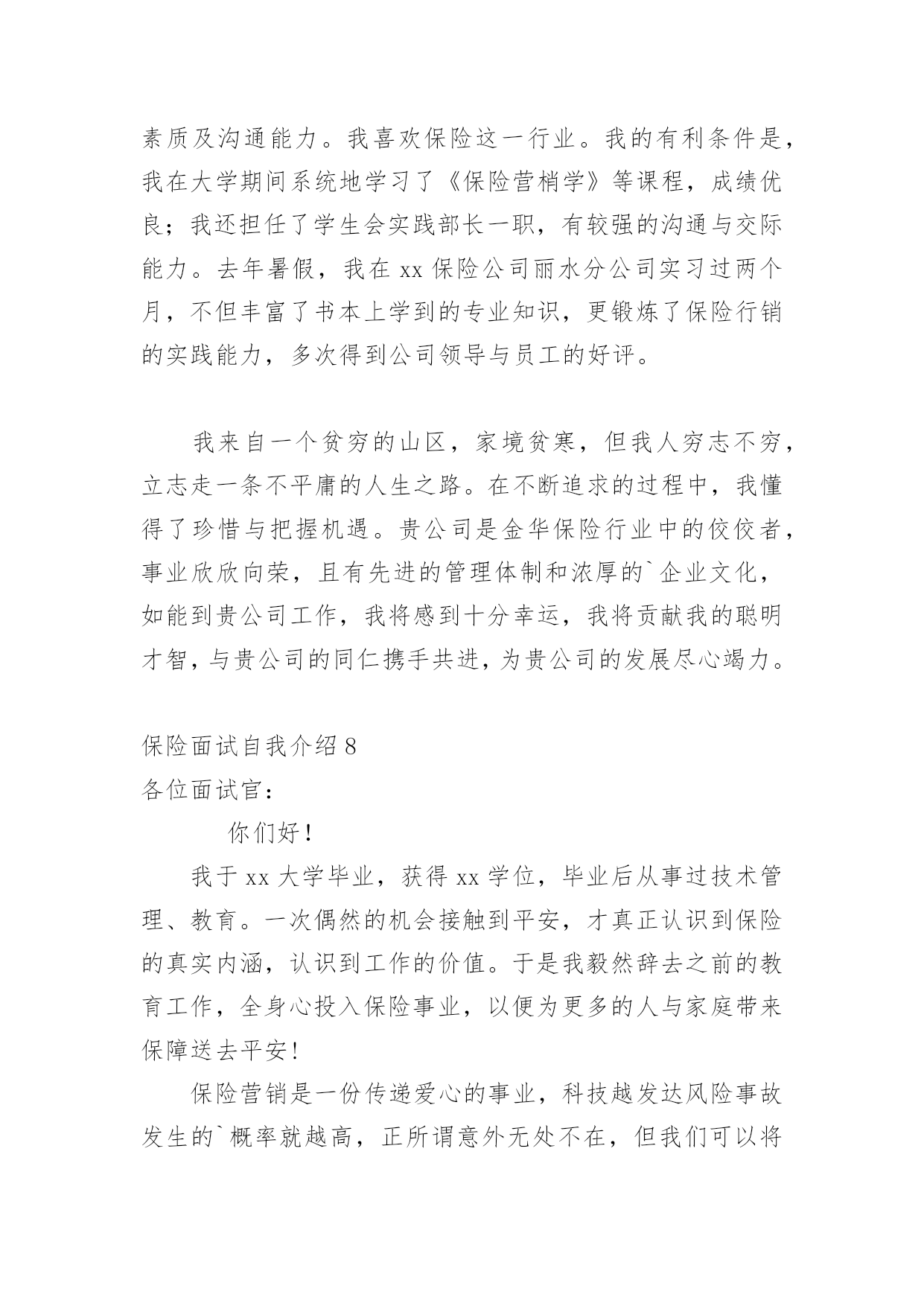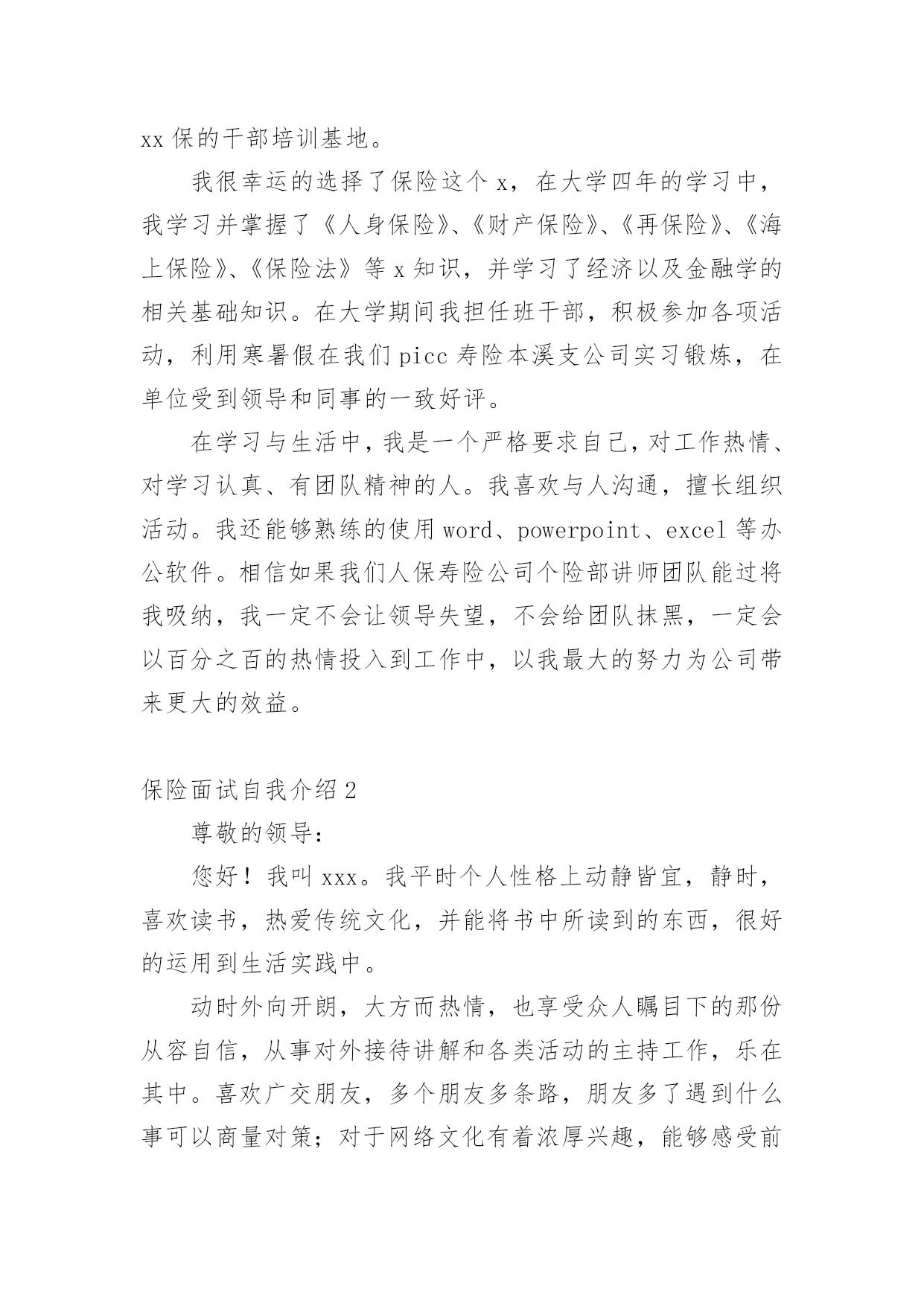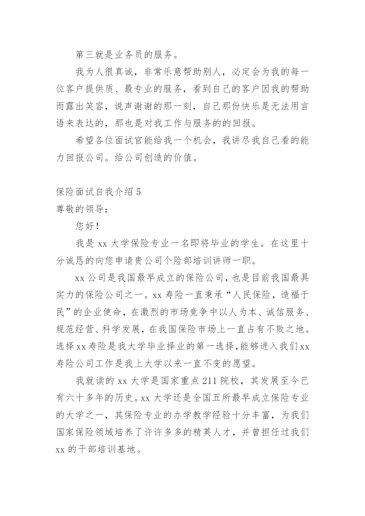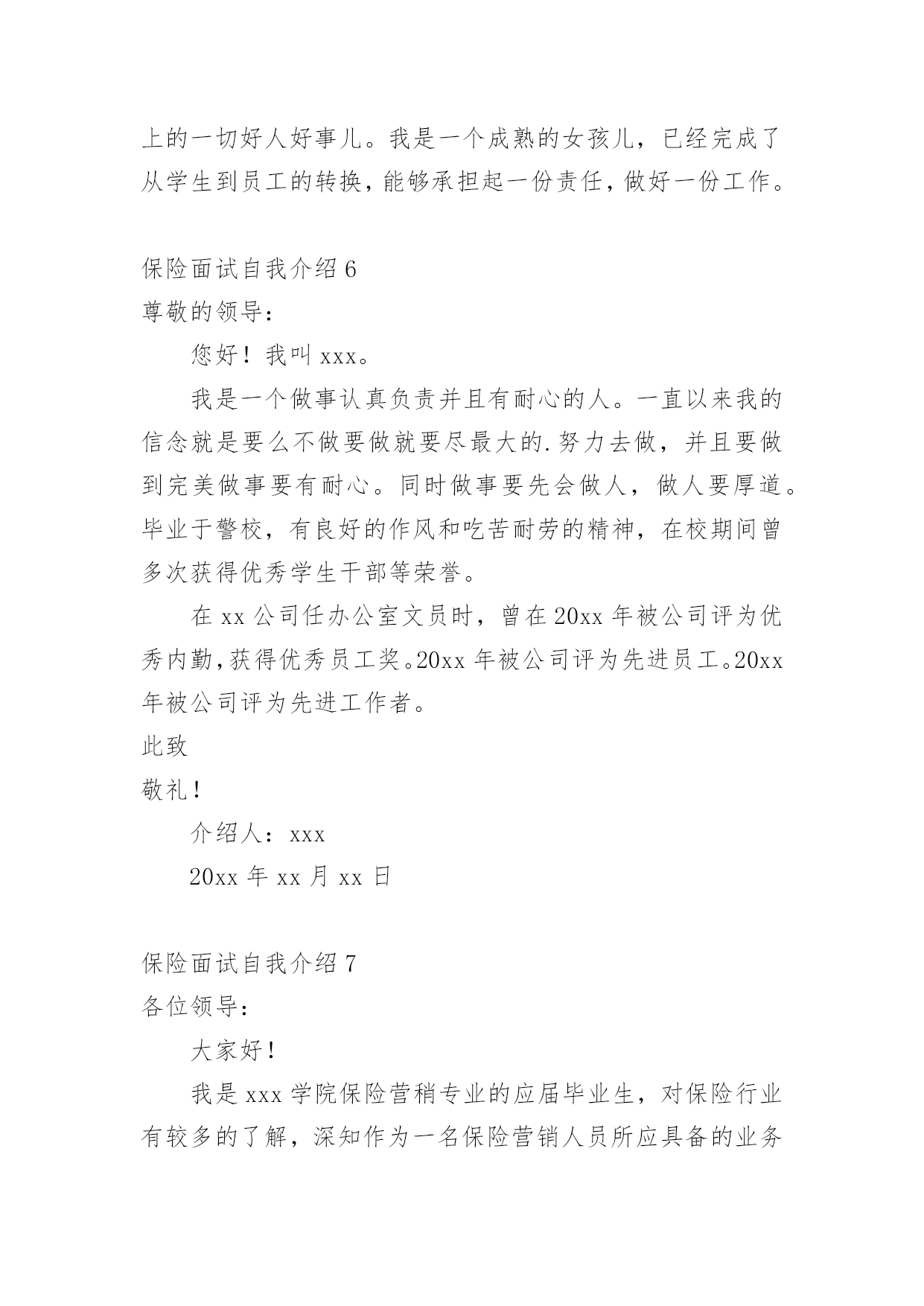 保险面试自我介绍当来到一个陌生环境中,时常需要用到自我介绍,自我介绍是让陌生人彼此认识的好方法。但是自我介绍有什么要求呢?以下是小编收集整理的保险面试自我介绍,欢迎阅读,希望大家能够喜欢。保险面试自我介绍1尊敬的领导:您好!我是xxxx大学保险x一名即将毕业的学生。在这里十分诚恳的向您申请贵公司个险部培训讲师一职。xx保公司是我国最早成立的保险公司,也是目前我国最具实力的保险公司之一。xx保寿险一直秉承“x保险,造福于民”的企业使命,在激烈的市场竞争中以人为本、诚信服务、规范经营、科学发展,在我国保险市场上一直占有不败之地。选择xx保寿险是我大学毕业择业的第一选择,能够进入我们人保寿险公司工作是我上大学以来一直不变的愿望。我就读的辽宁大学是国家重点211院校,其发展至今已有六十多年的历史。辽宁大学还是全国五所最早成立保险x的'大学之一,其保险x的办学教学经验十分丰富,为我们国家保险领域培养了许许多多的精英人才,并曾担任过我们xx保的干部培训基地。我很幸运的选择了保险这个x,在大学四年的学习中,我学习并掌握了《人身保险》、《财产保险》、《再保险》、《海上保险》、《保险法》等x知识,并学习了经济以及金融学的相关基础知识。在大学期间我担任班干部,积极参加各项活动,利用寒暑假在我们picc寿险本溪支公司实习锻炼,在单位受到领导和同事的一致好评。在学习与生活中,我是一个严格要求自己,对工作热情、对学习认真、有团队精神的人。我喜欢与人沟通,擅长组织活动。我还能够熟练的使用word、powerpoint、excel等办公软件。相信如果我们人保寿险公司个险部讲师团队能过将我吸纳,我一定不会让领导失望,不会给团队抹黑,一定会以百分之百的热情投入到工作中,以我最大的努力为公司带来更大的效益。保险面试自我介绍2尊敬的领导:您好!我叫xxx。我平时个人性格上动静皆宜,静时,喜欢读书,热爱传统文化,并能将书中所读到的东西,很好的运用到生活实践中。动时外向开朗,大方而热情,也享受众人瞩目下的那份从容自信,从事对外接待讲解和各类活动的主持工作,乐在其中。喜欢广交朋友,多个朋友多条路,朋友多了遇到什么事可以商量对策;对于网络文化有着浓厚兴趣,能够感受前卫文化、科技潮流带来的乐趣。不夸张的说安静时像只小绵羊,潜力爆发起来像像只狮子!我责任意识强,该认真工作的时候,一丝不苟,该休息的时候,我会安静下来好好休息;同时对创意有着自我的分析和见解,愿意和大家一起分享思维的.感受。人都有优点和弱点,工作两年感受就是要不断的学习,充实自己,成功或者失败都不能说明什么,在工作中不断的总结经验教训,完善自我,才是最大的乐趣。此致敬礼!介绍人:xxx20xx年xx月xx日保险面试自我介绍3尊敬的经理:您好!我叫,看到贵公司正在招聘关于保险经纪这个消息,我感到非常高兴。因为目前我正在找工作,看了贵公司关于这个职位的要求与待遇,我觉得自己挺合适的,争取可以到贵公司当一名保险经纪。在保险这个行业,我已经在这个行业呆了有3年多的.时间了,期间卖了数百套的保险,从安全险、教育险、到现在的房产一路走来,卖出的保险,最高的成交额达到3千多万,所以,我相信自己有能力在这个行业立足,也有信心可以当贵公司出色的经纪人,希望您看完这封求职信后可以考虑一下我。另外,本人拥有优秀的人际交往能力,优秀的客户服务技巧,以及习惯了快节奏高压力的工作与思考的能力,成功地完成公司的任务。综合这些条件,我相信自己将会是贵公司保险经纪的最佳人选。保险面试自我介绍4各位领导、各位评委:你们好!我于x大学毕业,获得x学位,毕业后从事过技术管理、教育。一次偶然的机会接触到平安,才真正认识到保险的真实内涵,认识到工作的价值。于是我毅然辞去之前的教育工作,全身心投入保险事业,以便为更多的.人与家庭带来保障送去平安!保险营销是一份传递爱心的事业,科技越发达风险事故发生的概率就越高,正所谓意外无处不在,但我们可以将这样的风险有效地转移给保险公司,让自己有个保障,同时对身边的亲人也是责任心的体现。选择保险,要考虑三个问题:第一选择一个实力较好的保险公司;第二看这份保单是否适合自己;第三就是业务员的服务。我为人很真诚,非常乐意帮助别人,必定会为我的每一位客户提供质、最专业的服务,看到自己的客户因我的帮助而露出笑容,说声谢谢的那一刻,自己那份快乐是无法用言语来表达的,那也是对我工作与服务的的回报。希望各位面试官能给我一个机会,我讲尽我自己看的能力回报公司。给公司创造的价值。保险面试自我介绍5尊敬的领导:您好!我是xx大学保险专业一名即将毕业的学生。在这里十分诚恳的向您申请贵公司个险部培训讲师一职。xx公司是我国最早成立的保险公司,也是目前我国最具实力的保险公司之一。xx寿险一直秉承“人民保险,造福于民”的企业使命,在激烈的市场竞争中