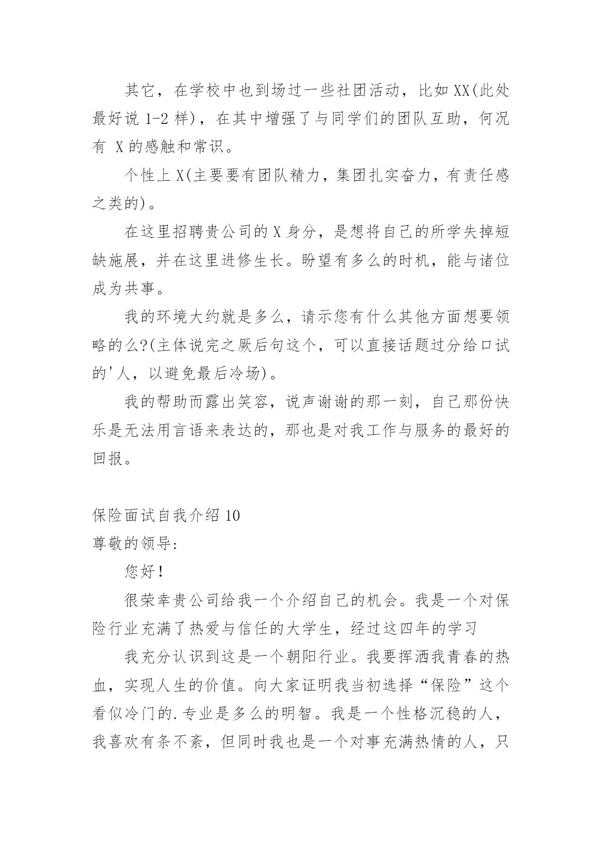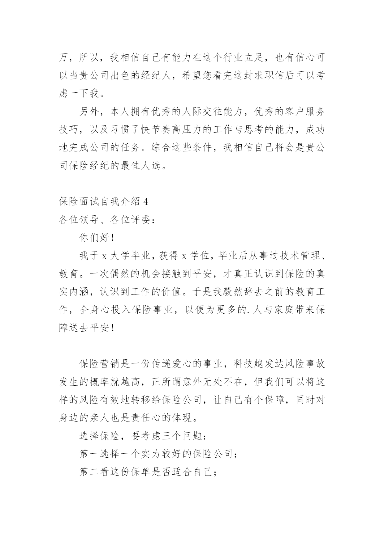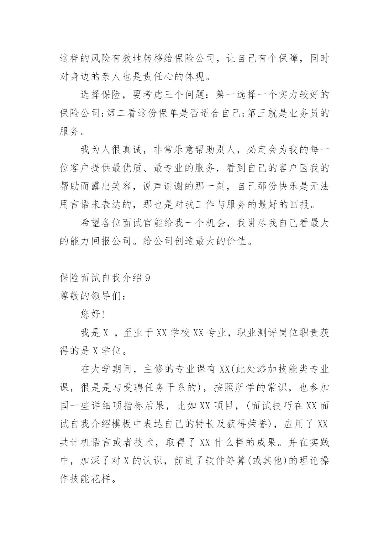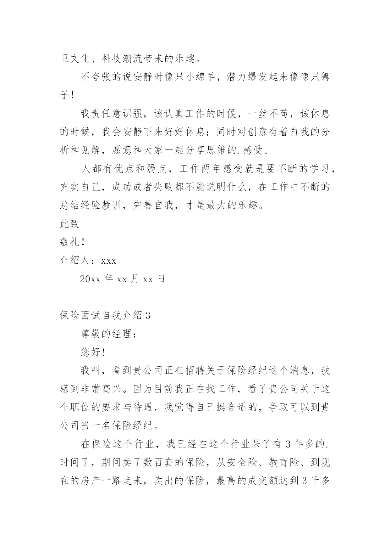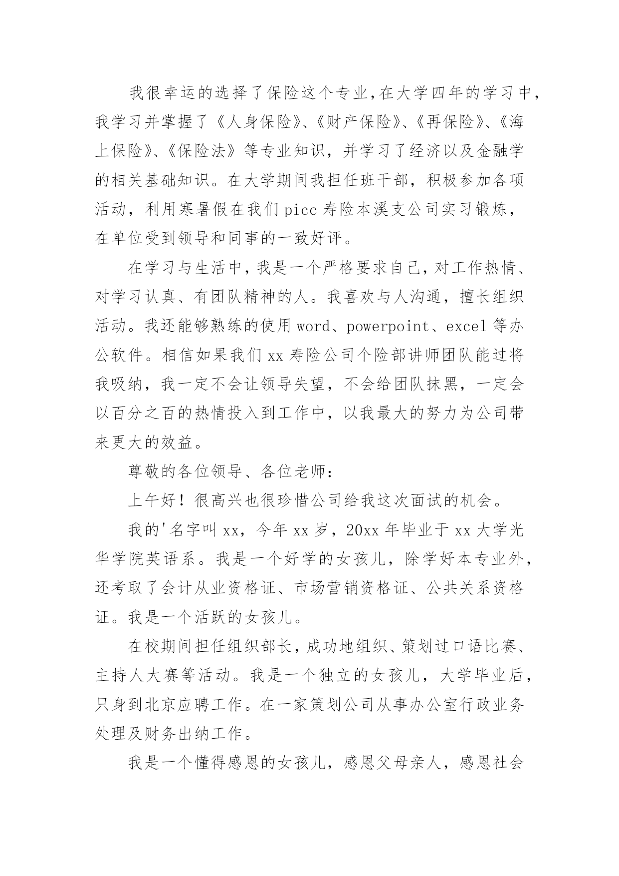 保险面试自我介绍当来到一个陌生环境中,时常需要用到自我介绍,自我介绍是让陌生人彼此认识的好方法。但是自我介绍有什么要求呢?以下是小编收集整理的保险面试自我介绍,欢迎阅读,希望大家能够喜欢。保险面试自我介绍1尊敬的领导:您好!我是xxxx大学保险x一名即将毕业的学生。在这里十分诚恳的向您申请贵公司个险部培训讲师一职。xx保公司是我国最早成立的保险公司,也是目前我国最具实力的保险公司之一。xx保寿险一直秉承“x保险,造福于民”的企业使命,在激烈的市场竞争中以人为本、诚信服务、规范经营、科学发展,在我国保险市场上一直占有不败之地。选择xx保寿险是我大学毕业择业的第一选择,能够进入我们人保寿险公司工作是我上大学以来一直不变的愿望。我就读的辽宁大学是国家重点211院校,其发展至今已有六十多年的历史。辽宁大学还是全国五所最早成立保险x的'大学之一,其保险x的办学教学经验十分丰富,为我们国家保险领域培养了许许多多的精英人才,并曾担任过我们xx保的干部培训基地。我很幸运的选择了保险这个x,在大学四年的学习中,我学习并掌握了《人身保险》、《财产保险》、《再保险》、《海上保险》、《保险法》等x知识,并学习了经济以及金融学的相关基础知识。在大学期间我担任班干部,积极参加各项活动,利用寒暑假在我们picc寿险本溪支公司实习锻炼,在单位受到领导和同事的一致好评。在学习与生活中,我是一个严格要求自己,对工作热情、对学习认真、有团队精神的人。我喜欢与人沟通,擅长组织活动。我还能够熟练的使用word、powerpoint、excel等办公软件。相信如果我们人保寿险公司个险部讲师团队能过将我吸纳,我一定不会让领导失望,不会给团队抹黑,一定会以百分之百的热情投入到工作中,以我最大的努力为公司带来更大的效益。保险面试自我介绍2尊敬的领导:您好!我叫xxx。我平时个人性格上动静皆宜,静时,喜欢读书,热爱传统文化,并能将书中所读到的东西,很好的运用到生活实践中。动时外向开朗,大方而热情,也享受众人瞩目下的那份从容自信,从事对外接待讲解和各类活动的主持工作,乐在其中。喜欢广交朋友,多个朋友多条路,朋友多了遇到什么事可以商量对策;对于网络文化有着浓厚兴趣,能够感受前卫文化、科技潮流带来的乐趣。不夸张的说安静时像只小绵羊,潜力爆发起来像像只狮子!我责任意识强,该认真工作的时候,一丝不苟,该休息的时候,我会安静下来好好休息;同时对创意有着自我的分析和见解,愿意和大家一起分享思维的.感受。人都有优点和弱点,工作两年感受就是要不断的学习,充实自己,成功或者失败都不能说明什么,在工作中不断的总结经验教训,完善自我,才是最大的乐趣。此致敬礼!介绍人:xxx20xx年xx月xx日保险面试自我介绍3尊敬的经理:您好!我叫,看到贵公司正在招聘关于保险经纪这个消息,我感到非常高兴。因为目前我正在找工作,看了贵公司关于这个职位的要求与待遇,我觉得自己挺合适的,争取可以到贵公司当一名保险经纪。在保险这个行业,我已经在这个行业呆了有3年多的.时间了,期间卖了数百套的保险,从安全险、教育险、到现在的房产一路走来,卖出的保险,最高的成交额达到3千多万,所以,我相信自己有能力在这个行业立足,也有信心可以当贵公司出色的经纪人,希望您看完这封求职信后可以考虑一下我。另外,本人拥有优秀的人际交往能力,优秀的客户服务技巧,以及习惯了快节奏高压力的工作与思考的能力,成功地完成公司的任务。综合这些条件,我相信自己将会是贵公司保险经纪的最佳人选。保险面试自我介绍4各位领导、各位评委:你们好!我于x大学毕业,获得x学位,毕业后从事过技术管理、教育。一次偶然的机会接触到平安,才真正认识到保险的真实内涵,认识到工作的价值。于是我毅然辞去之前的教育工作,全身心投入保险事业,以便为更多的.人与家庭带来保障送去平安!保险营销是一份传递爱心的事业,科技越发达风险事故发生的概率就越高,正所谓意外无处不在,但我们可以将这样的风险有效地转移给保险公司,让自己有个保障,同时对身边的亲人也是责任心的体现。选择保险,要考虑三个问题:第一选择一个实力较好的保险公司;第二看这份保单是否适合自己;第三就是业务员的服务。我为人很真诚,非常乐意帮助别人,必定会为我的每一位客户提供质、最专业的服务,看到自己的客户因我的帮助而露出笑容,说声谢谢的那一刻,自己那份快乐是无法用言语来表达的,那也是对我工作与服务的的回报。希望各位面试官能给我一个机会,我讲尽我自己看的能力回报公司。给公司创造的价值。保险面试自我介绍5尊敬的领导:您好!我是xx大学保险专业一名即将毕业的学生。在这里十分诚恳的向您申请贵公司个险部培训讲师一职。xx公司是我国最早成立的保险公司,也是目前我国最具实力的保险公司之一。xx寿险一直秉承“人民保险,造福于民”的企业使命,在激烈的市场竞争中