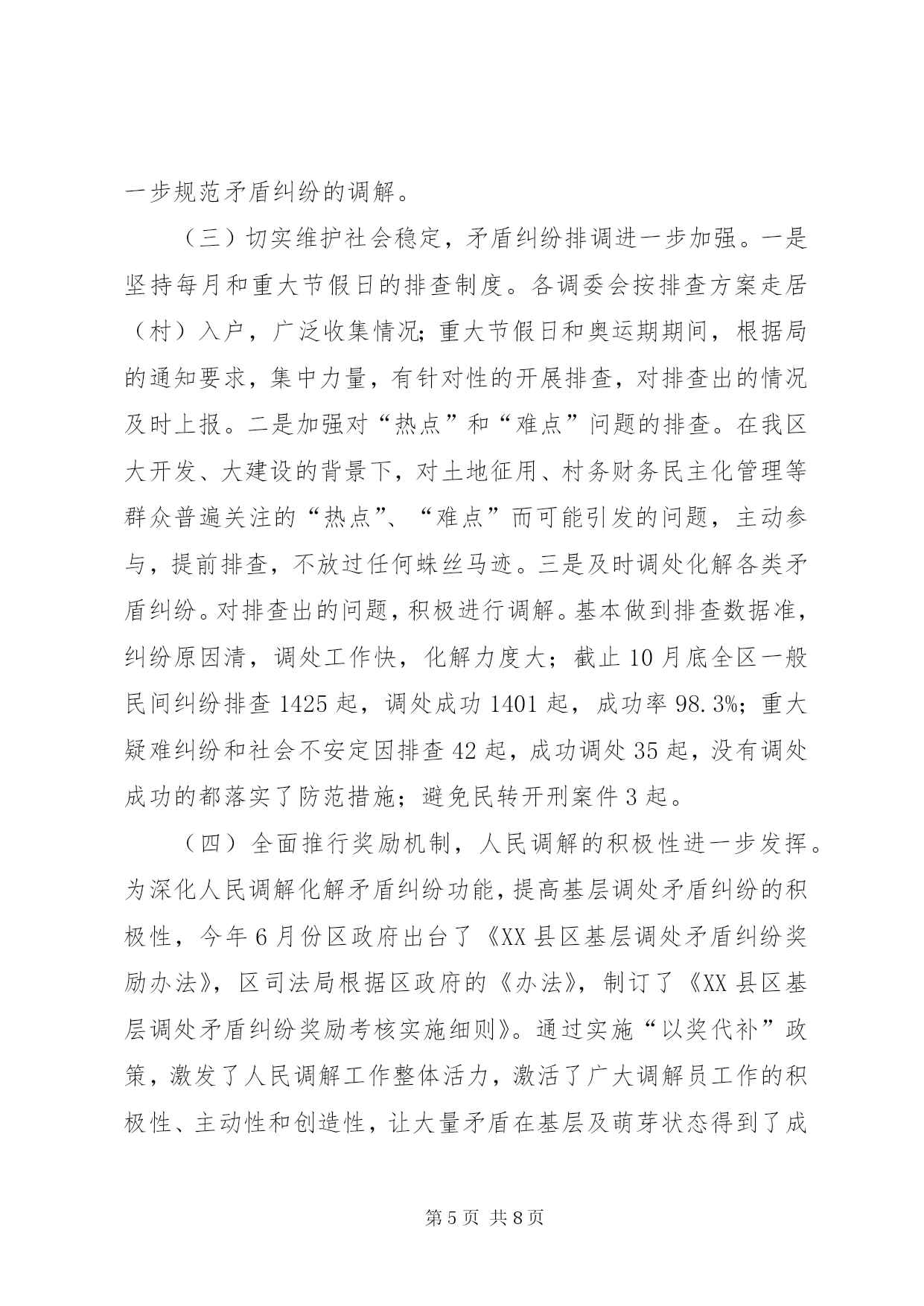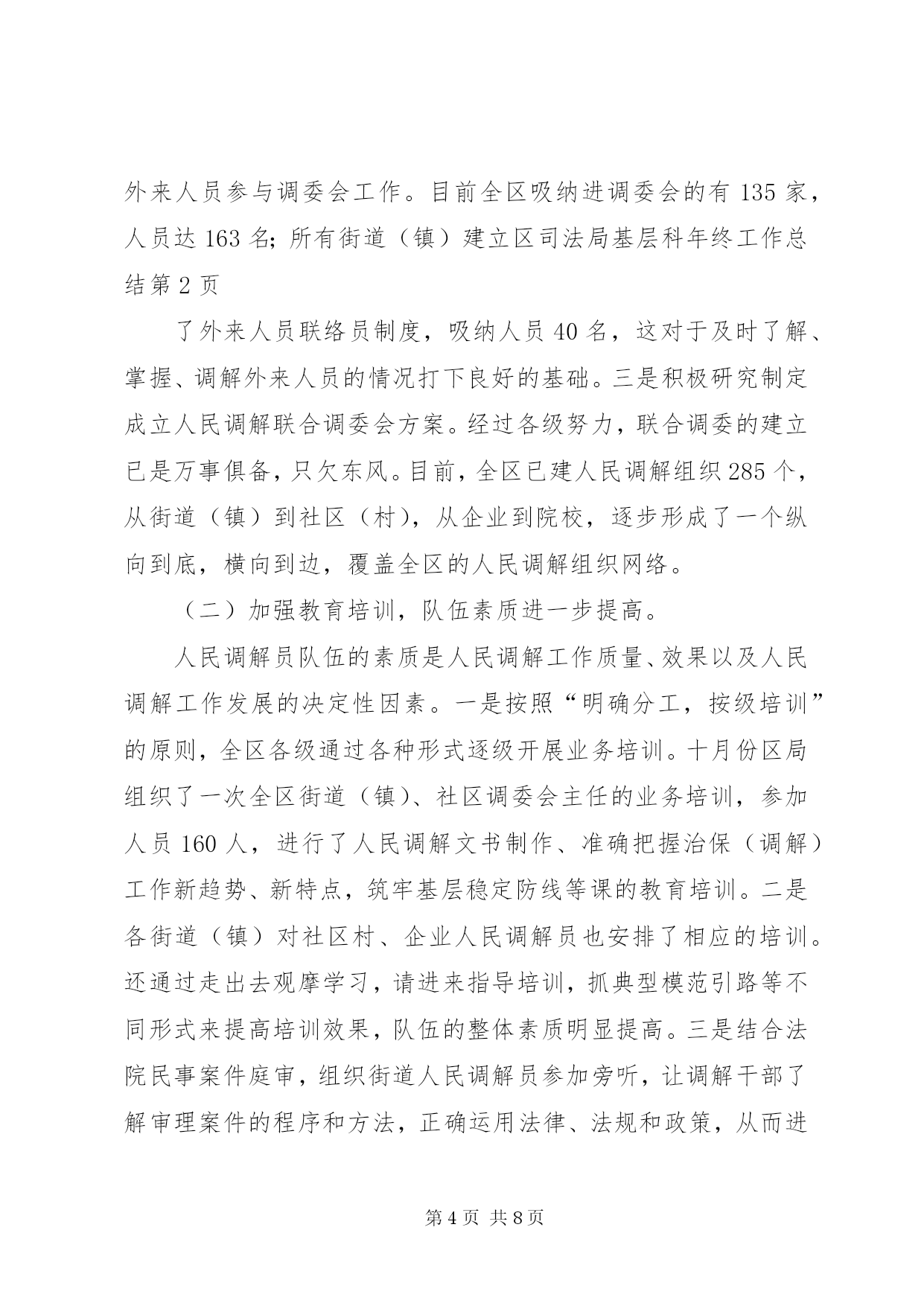 第PAGE\*Arabic\*MERGEFORMAT8页共NUMPAGES\*MERGEFORMAT8页区司法局基层科年终工作总结20xx年,我区基层司法行政工作以党的十七精神和科学发展观为指导,以创建“平安江北”、“和谐江北”为目标,认真落实上级关于进一步加强司法所建设和人民调解工作的指示精神,坚持重心下移,加强业务指导,实基层基础,切实加强司法所建设和发挥人民调解工作作用,为促进我区社会治安综合治理,优化投资环境,全面建设小康社会作出了新的贡献。一、以健全组织机构为契机,不断提高司法所的规范化建设水平根据浙委办〔20xx〕79号文件和甬党办〔20xx〕2号文件精神,狠抓司法所的组织建设,基础建设、业务建设和队伍建设,注重发挥司法所在预防和化解矛盾纠纷、推进依法治理、维护基层社会稳定、服务地方经济发展等方面的职能作用。(一)结合我区实际,健全完善组织机构。及时向区领导汇报上级关于司法所建设的指示精神,与有关单位积极协调贯彻落实上级精神的具体方案和措施,经过各方努力,先后出台北区委办﹝20xx﹞23号《关于进一步加强基层司法所建设的意见》和北区编办﹝20xx﹞27号《关于XX县区基层司法所机构设置等事宜的通知》,全区八个司法所全部明确为派驻所,统一挂牌为XX县区司法局××所。司法所继续实行司法行政机关与镇(街道)双重管理的体制。坚持在街道党工委(镇党委)、办事处(镇政府)的领导下开展工作,充分运用街道(镇)综治工作中心平台,积极发挥职能作用。(二)理顺工作职责,坚持司法行政编制专管专用。按照省市两级要求,管好用好司法行政编制,实行专编专用。北区编办﹝20xx﹞27号《关于XX县区基层司法所机构设置等事宜的通知》,全区司法行政专项编制人员15名,明确要求落实到各司法所任职。司法所司法行政专项编制人员的任免、调动和录用须征求司法局的意见,确保人员配置稳定。区司法局按照职责要求,突出抓好对司法行政专项编制人员的管理和培养使用。(三)加强司法所基础设施建设,加快司法所规范化建设的步伐。街道党工委(镇党委)、办事处(镇政府)以“综治工作中心”为平台,高度重视司法所基础建设,将司法所建设纳入当地经济社会发展总体规划,加大投入,目前全区司法所共有办公用房38间,面积995米,配有电脑24台,打(复)印机9台,传真机8台,按照《XX省司法行政系统基层基础设施建设“十一五”规划》三类标准的要求,全区司法所达标率为87%。在硬件基本达到了规范化建设要求的同时,各司法所也加强了软件建设,健全和完善了各类规章制度,台账内容丰富标准,墙上公示规范。(四)努力提高队伍素质,积极发挥司法所职能作用。按照有关干部教育培训规划的要求,注重司法所工作人员的教育培训,通过集中培训、以会代训、工作指导等方式,引导和教育司法所工作人员掌握相关业务知识和技能,不断增强解决实际问题的能力和水平。今年组织了司法所长参加了市局在绍兴党校的培训,系统学习了司法所建设、人民调解、社区矫正和有关法律法规。利用司法所长例会时机,对司法所的工作进行讲评指导。此外,还对司法所有关人员进行数据统计、信息报道、人民调解协议书制作等的培训。保证了各司法所紧紧围绕党委政府中心工作,认真做好各项工作,使司法所成为基层“调处纠纷的阵地,法制宣传的课堂,安置帮教的渠道,法律援助的桥梁”。二、以落实科学发展观为指导,不断推进人民调解工作新发展随着我区工业化、城镇化的推进,各种利益格局也进行了调整,社会管理中的新情况、新矛盾不断出现。因此,从年初开始就深入基层调研,积极探索人民调解工作的新途径、新方法。经过上下共同努力,今年人民调解有了新突破、新提高。(一)健全网络体系,组织建设进一步加强。一是积极抓好百人以上企业调委会建设。今年上半年,在慈城镇进行百人企业建立调委会工作的试点,现有的52家百人企业全部建立了调委会,6月中旬在慈城召开了总结交流大会,在全区推开了百人企业建调委会的工作序幕。截止10月底,全区215家百人以上企业,建调委会的已达131家,占总数的60.93%。二是积极吸纳外来人员参与调委会工作。目前全区吸纳进调委会的有135家,人员达163名;所有街道(镇)建立区司法局基层科年终工作总结了外来人员联络员制度,吸纳人员40名,这对于及时了解、掌握、调解外来人员的情况打下良好的基础。三是积极研究制定成立人民调解联合调委会方案。经过各级努力,联合调委的建立已是万事俱备,只欠东风。目前,全区已建人民调解组织285个,从街道(镇)到社区(村),从企业到院校,逐步形成了一个纵向到底,横向到边,覆盖全区的人民调解组织网络。(二)加强教育培训,队伍素质进一步提高。人民调解员队伍的素质是人民调解工作质量、效果以及人民调解工作发展的决定性因素。一是按照“明确分工,按级培训”的原则,全区