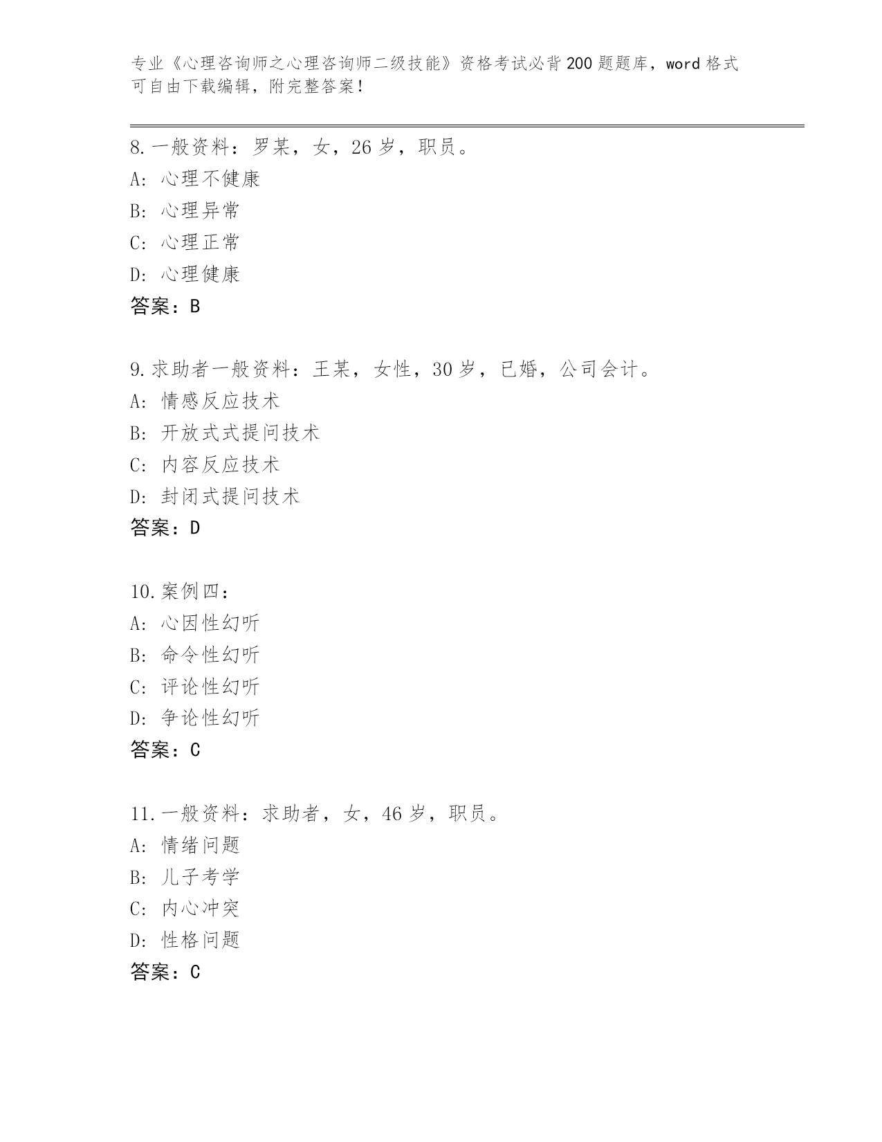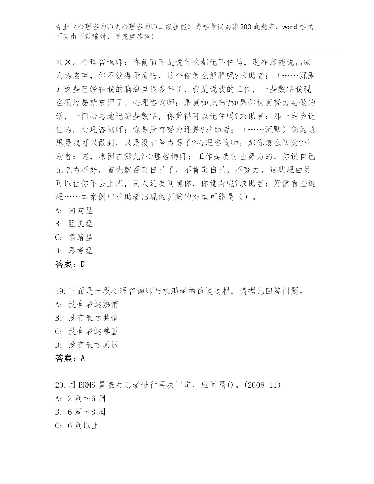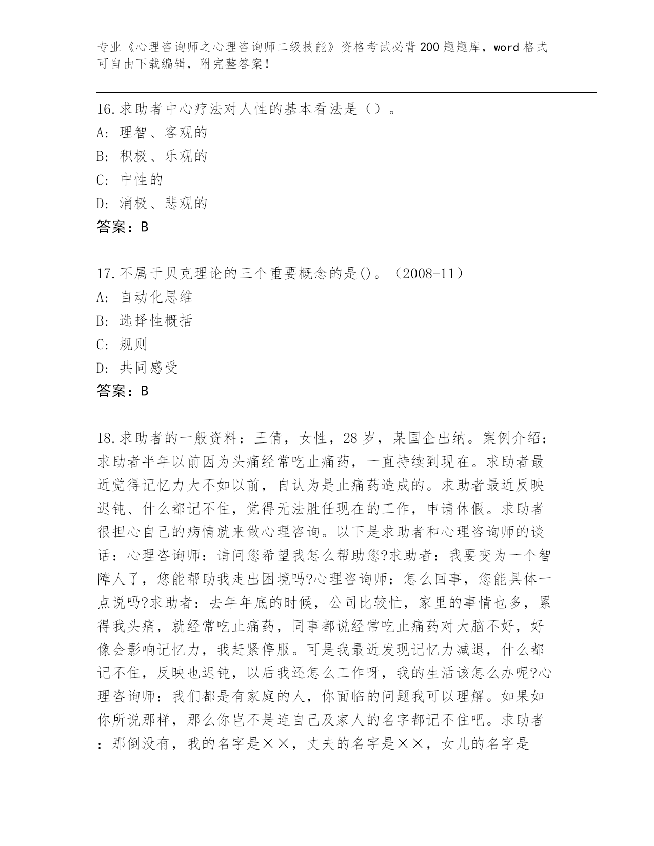 山西省定襄县整理《心理咨询师之心理咨询师二级技能》资格考试必背200题通关秘籍题库附答案【培优B卷】