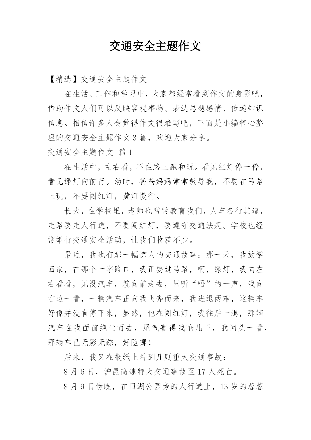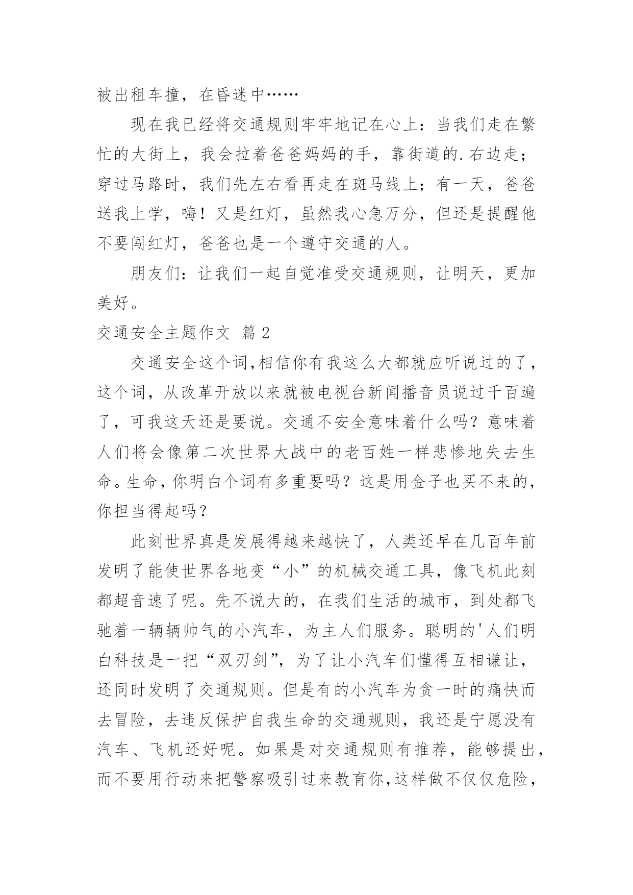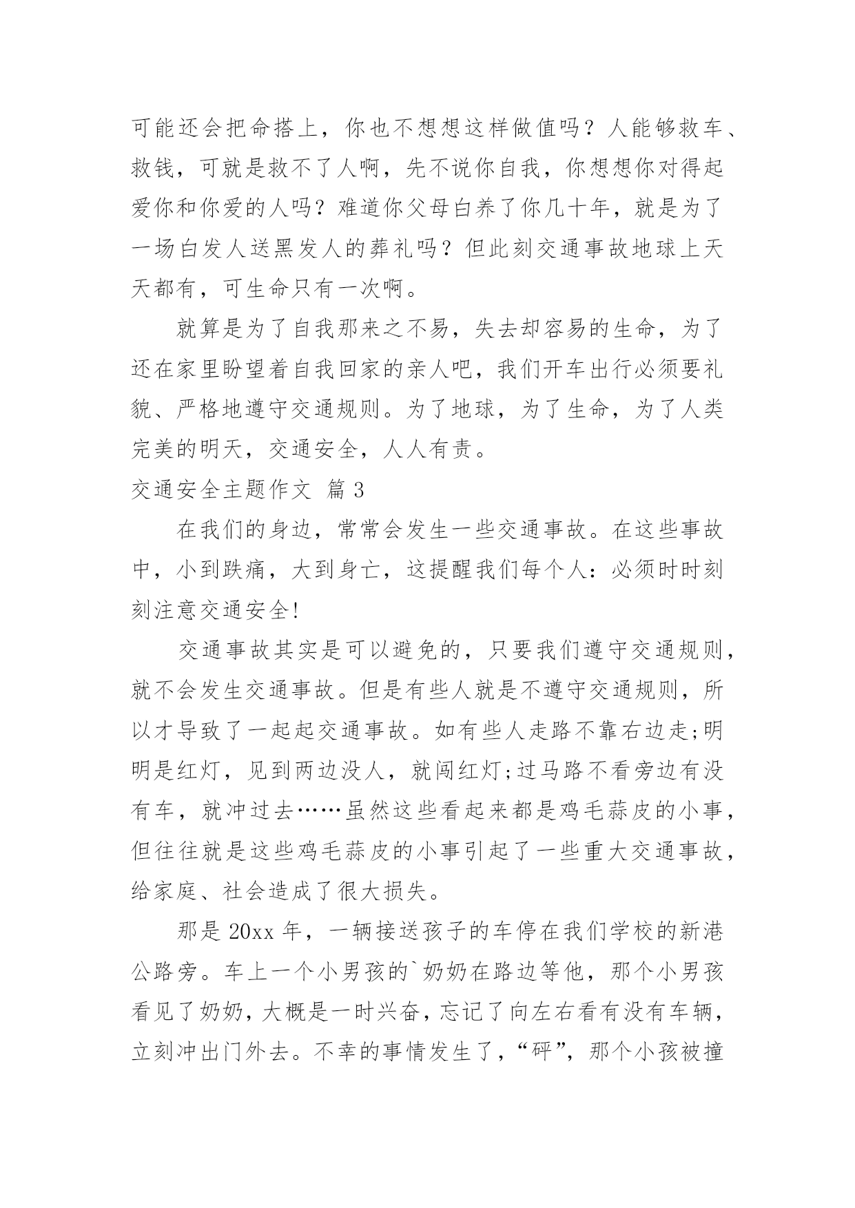 交通安全主题作文【精选】交通安全主题作文在生活、工作和学习中,大家都经常看到作文的身影吧,借助作文人们可以反映客观事物、表达思想感情、传递知识信息。相信许多人会觉得作文很难写吧,下面是小编精心整理的交通安全主题作文3篇,欢迎大家分享。交通安全主题作文篇1在生活中,左右看,不在路上跑和玩。看见红灯停一停,看见绿灯向前行。幼时,爸爸妈妈常常教导我,不要在马路上玩,不要闯红灯,黄灯慢行。长大,在学校里,老师也常常教育我们,人车各行其道,走路要走人行道,不要闯红灯,要遵守交通法规。学校也经常举行交通安全活动,让我们收获不少。最近,我也有那一幅惊人的交通故事:那一天,我放学回家,在那个十字路口,我正要过马路,啊,绿灯,我向左右看看,见没汽车,就向前走去,只听“唔”的一声,我向右边一看,一辆汽车正向我飞奔而来,我进退两难,这辆车好像并没有停下来,显然,他在闯红灯,我往后一退,那辆汽车在我面前绝尘而去,尾气害得我呛几下,我回头一看,那辆车已无影无踪,好险哪!后来,我又在报纸上看到几则重大交通事故:8月6日,沪昆高速特大交通事故至17人死亡。8月9日傍晚,在日湖公园旁的人行道上,13岁的蓉蓉被出租车撞,在昏迷中……现在我已经将交通规则牢牢地记在心上:当我们走在繁忙的大街上,我会拉着爸爸妈妈的手,靠街道的.右边走;穿过马路时,我们先左右看再走在斑马线上;有一天,爸爸送我上学,嗨!又是红灯,虽然我心急万分,但还是提醒他不要闯红灯,爸爸也是一个遵守交通的人。朋友们:让我们一起自觉准受交通规则,让明天,更加美好。交通安全主题作文篇2交通安全这个词,相信你有我这么大都就应听说过的了,这个词,从改革开放以来就被电视台新闻播音员说过千百遍了,可我这天还是要说。交通不安全意味着什么吗?意味着人们将会像第二次世界大战中的老百姓一样悲惨地失去生命。生命,你明白个词有多重要吗?这是用金子也买不来的,你担当得起吗?此刻世界真是发展得越来越快了,人类还早在几百年前发明了能使世界各地变“小”的机械交通工具,像飞机此刻都超音速了呢。先不说大的,在我们生活的城市,到处都飞驰着一辆辆帅气的小汽车,为主人们服务。聪明的'人们明白科技是一把“双刃剑”,为了让小汽车们懂得互相谦让,还同时发明了交通规则。但是有的小汽车为贪一时的痛快而去冒险,去违反保护自我生命的交通规则,我还是宁愿没有汽车、飞机还好呢。如果是对交通规则有推荐,能够提出,而不要用行动来把警察吸引过来教育你,这样做不仅仅危险,可能还会把命搭上,你也不想想这样做值吗?人能够救车、救钱,可就是救不了人啊,先不说你自我,你想想你对得起爱你和你爱的人吗?难道你父母白养了你几十年,就是为了一场白发人送黑发人的葬礼吗?但此刻交通事故地球上天天都有,可生命只有一次啊。就算是为了自我那来之不易,失去却容易的生命,为了还在家里盼望着自我回家的亲人吧,我们开车出行必须要礼貌、严格地遵守交通规则。为了地球,为了生命,为了人类完美的明天,交通安全,人人有责。交通安全主题作文篇3在我们的身边,常常会发生一些交通事故。在这些事故中,小到跌痛,大到身亡,这提醒我们每个人:必须时时刻刻注意交通安全!交通事故其实是可以避免的,只要我们遵守交通规则,就不会发生交通事故。但是有些人就是不遵守交通规则,所以才导致了一起起交通事故。如有些人走路不靠右边走;明明是红灯,见到两边没人,就闯红灯;过马路不看旁边有没有车,就冲过去……虽然这些看起来都是鸡毛蒜皮的小事,但往往就是这些鸡毛蒜皮的小事引起了一些重大交通事故,给家庭、社会造成了很大损失。那是20xx年,一辆接送孩子的车停在我们学校的新港公路旁。车上一个小男孩的`奶奶在路边等他,那个小男孩看见了奶奶,大概是一时兴奋,忘记了向左右看有没有车辆,立刻冲出门外去。不幸的事情发生了,“砰”,那个小孩被撞倒在地,当场死亡。这个小孩是怎么会被车撞的呢?就是由于那个小孩下车时,没有看看左边右边有没有车,而是一下字就冲出去。这样看起来非常不起眼的一个动作,造成了无法挽回的遗憾。
