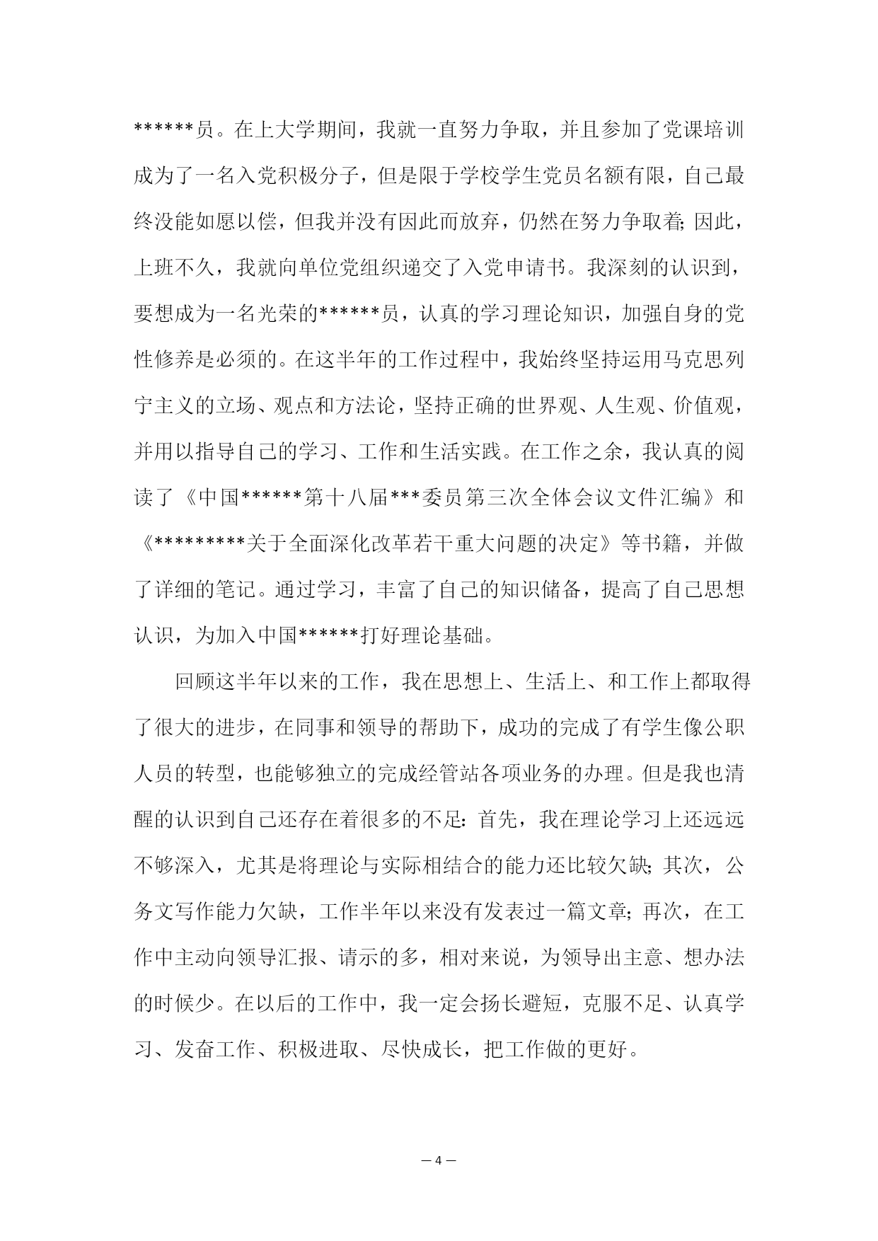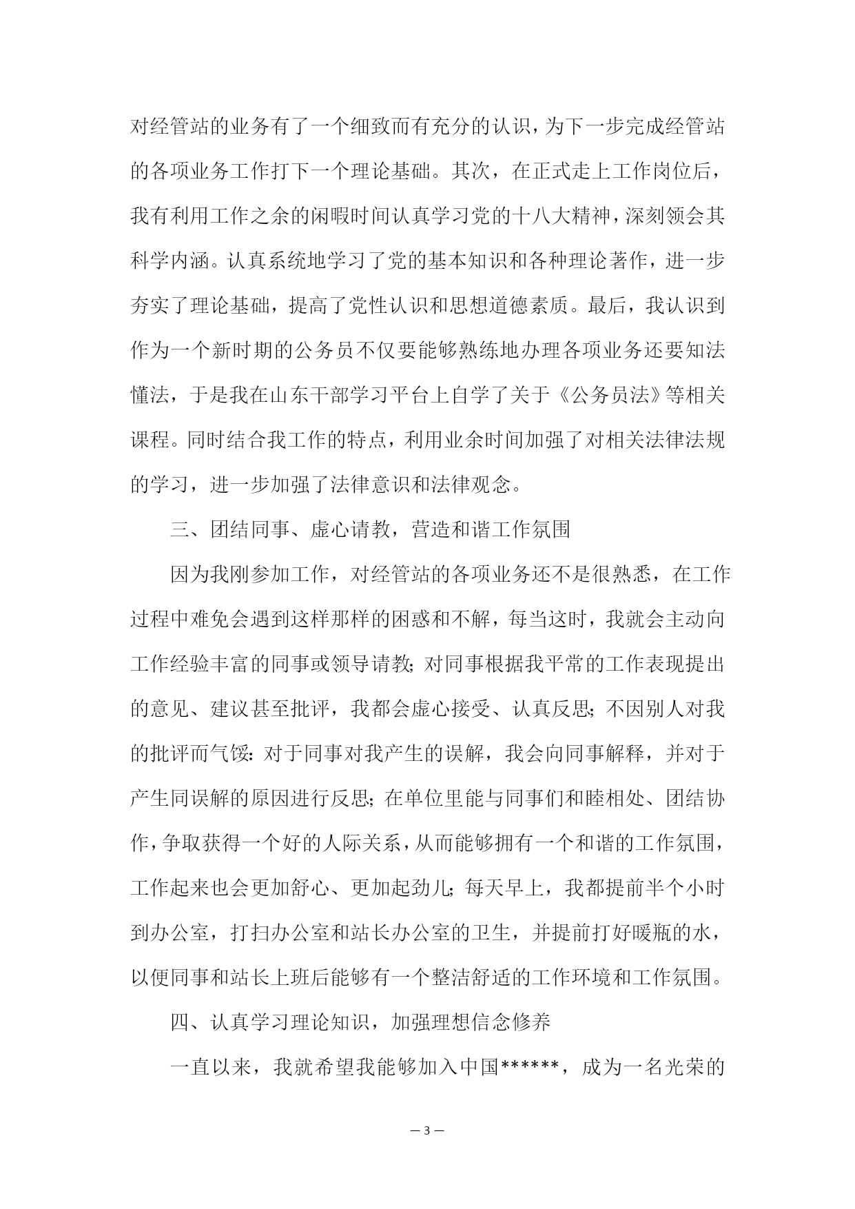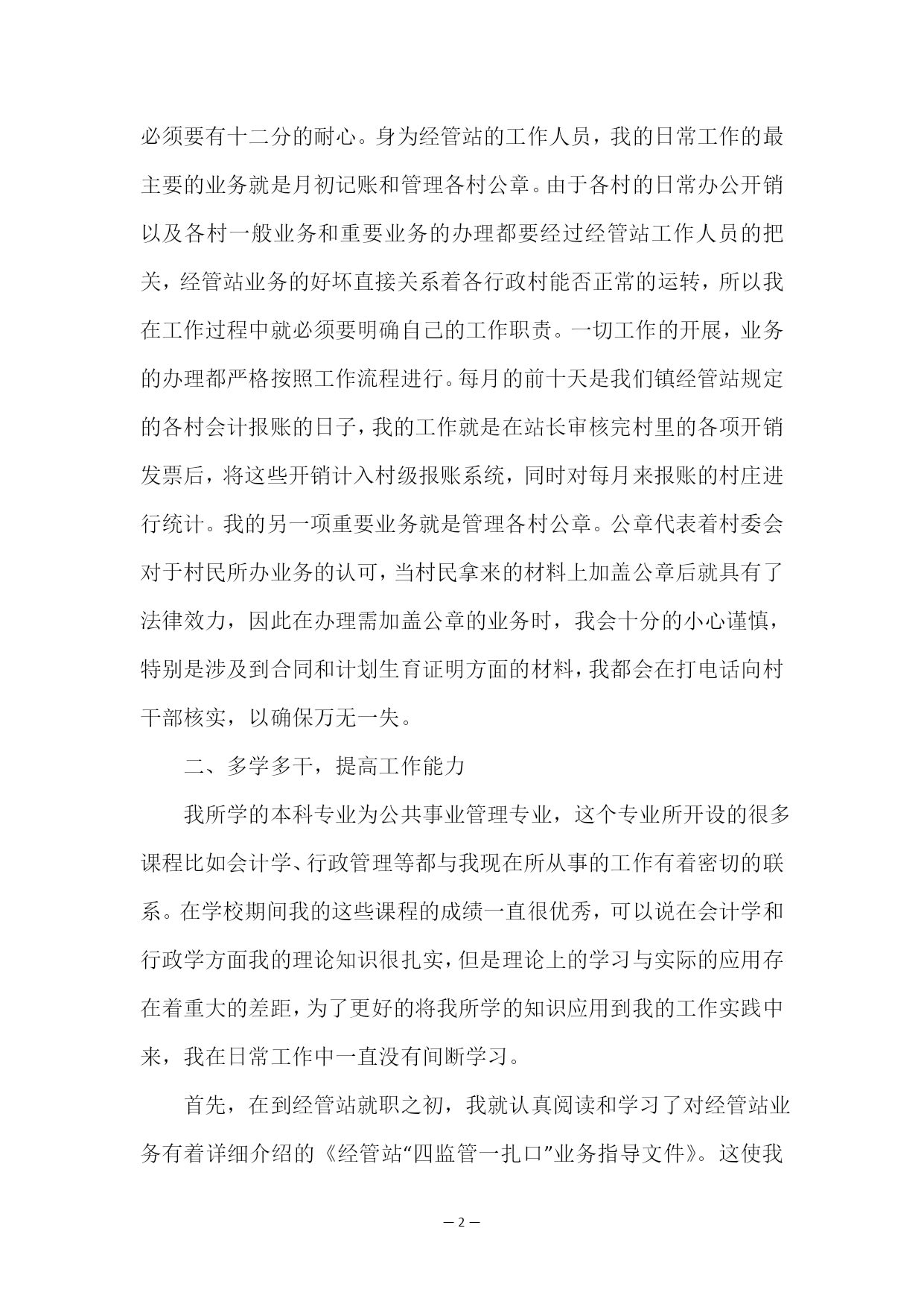 —PAGE\*MERGEFORMAT4—乡镇新任公务员个人工作总结乡镇新任公务员个人工作总结2022年7月我从XX医学院公共事业管理专业毕业,并通过公务员考试成为了一名乡镇公务人员。作为一个刚刚走出大学校门的大学生,没有任何工作经验的我对于如何做好行政工作,如何做好一名合格的公务员感觉很茫然。离开了大学,我的身份不在是一名无忧无虑,只需要关心课程的学生,而成为了一名在乡镇经管站工作的,每天需要面对各种各样业务的公务人员。如何完成由学生到国家公职人员的身份上的转变?如何在自己的工作岗位上做好自己的本职工作?如何能够使自己成长为一个合当前隐藏内容免费查看格的、优秀的公务员?在这半年的工作时间里,我一直在思考,也一直在用着三个问题鞭策着自己,现在我将我这半年来的工作学习情况总结如下:一、明确自己的职责,准确定位自己的身份。我所就职的单位是我们镇的经管站,是镇上的窗口性单位,其主要职责就是管理各村的财务收支情况以及各村的公章。因为掌握着各村公章,所以我接触最多的就是各村的干部和村民。因此在工作过程中最重要的就是定位好自己的身份,时刻铭记我已经不是一名学生,而是一位政府工作人员。作为学生,我的身上没有服务人民的责任,我可以逞一时口舌之快;但是作为一名公务员,我肩负着服务人民的责任,我的一举一动都代表着政府的形象,在群众来经管站办业务时必须要有十二分的耐心。身为经管站的工作人员,我的日常工作的最主要的业务就是月初记账和管理各村公章。由于各村的日常办公开销以及各村一般业务和重要业务的办理都要经过经管站工作人员的把关,经管站业务的好坏直接关系着各行政村能否正常的运转,所以我在工作过程中就必须要明确自己的工作职责。一切工作的开展,业务的办理都严格按照工作流程进行。每月的前十天是我们镇经管站规定的各村会计报账的日子,我的工作就是在站长审核完村里的各项开销发票后,将这些开销计入村级报账系统,同时对每月来报账的村庄进行统计。我的另一项重要业务就是管理各村公章。公章代表着村委会对于村民所办业务的认可,当村民拿来的材料上加盖公章后就具有了法律效力,因此在办理需加盖公章的业务时,我会十分的小心谨慎,特别是涉及到合同和计划生育证明方面的材料,我都会在打电话向村干部核实,以确保万无一失。二、多学多干,提高工作能力我所学的本科专业为公共事业管理专业,这个专业所开设的很多课程比如会计学、行政管理等都与我现在所从事的工作有着密切的联系。在学校期间我的这些课程的成绩一直很优秀,可以说在会计学和行政学方面我的理论知识很扎实,但是理论上的学习与实际的应用存在着重大的差距,为了更好的将我所学的知识应用到我的工作实践中来,我在日常工作中一直没有间断学习。首先,在到经管站就职之初,我就认真阅读和学习了对经管站业务有着详细介绍的《经管站“四监管一扎口”业务指导文件》。这使我对经管站的业务有了一个细致而有充分的认识,为下一步完成经管站的各项业务工作打下一个理论基础。其次,在正式走上工作岗位后,我有利用工作之余的闲暇时间认真学习党的十八大精神,深刻领会其科学内涵。认真系统地学习了党的基本知识和各种理论著作,进一步夯实了理论基础,提高了党性认识和思想道德素质。最后,我认识到作为一个新时期的公务员不仅要能够熟练地办理各项业务还要知法懂法,于是我在山东干部学习平台上自学了关于《公务员法》等相关课程。同时结合我工作的特点,利用业余时间加强了对相关法律法规的学习,进一步加强了法律意识和法律观念。三、团结同事、虚心请教,营造和谐工作氛围因为我刚参加工作,对经管站的各项业务还不是很熟悉,在工作过程中难免会遇到这样那样的困惑和不解,每当这时,我就会主动向工作经验丰富的同事或领导请教;对同事根据我平常的工作表现提出的意见、建议甚至批评,我都会虚心接受、认真反思;不因别人对我的批评而气馁:对于同事对我产生的误解,我会向同事解释,并对于产生同误解的原因进行反思;在单位里能与同事们和睦相处、团结协作,争取获得一个好的人际关系,从而能够拥有一个和谐的工作氛围,工作起来也会更加舒心、更加起劲儿;每天早上,我都提前半个小时到办公室,打扫办公室和站长办公室的卫生,并提前打好暖瓶的水,以便同事和站长上班后能够有一个整洁舒适的工作环境和工作氛围。四、认真学习理论知识,加强理想信念修养一直以来,我就希望我能够加入中国******,成为一名光荣的******员。在上大学期间,我就一直努力争取,并且参加了党课培训成为了一名入党积极分子,但是限于学校学生党员名额有限,自己最终没能如愿以偿,但我并没有因此而放弃,仍然在努力争取着;因此,上班不久,我就向单位党组织递交了入党申请书。我深刻的认识到,要想成为一名光荣的******员,认真的学习理论知识,加强自身的党性修养是必须的。在这半年的工作过