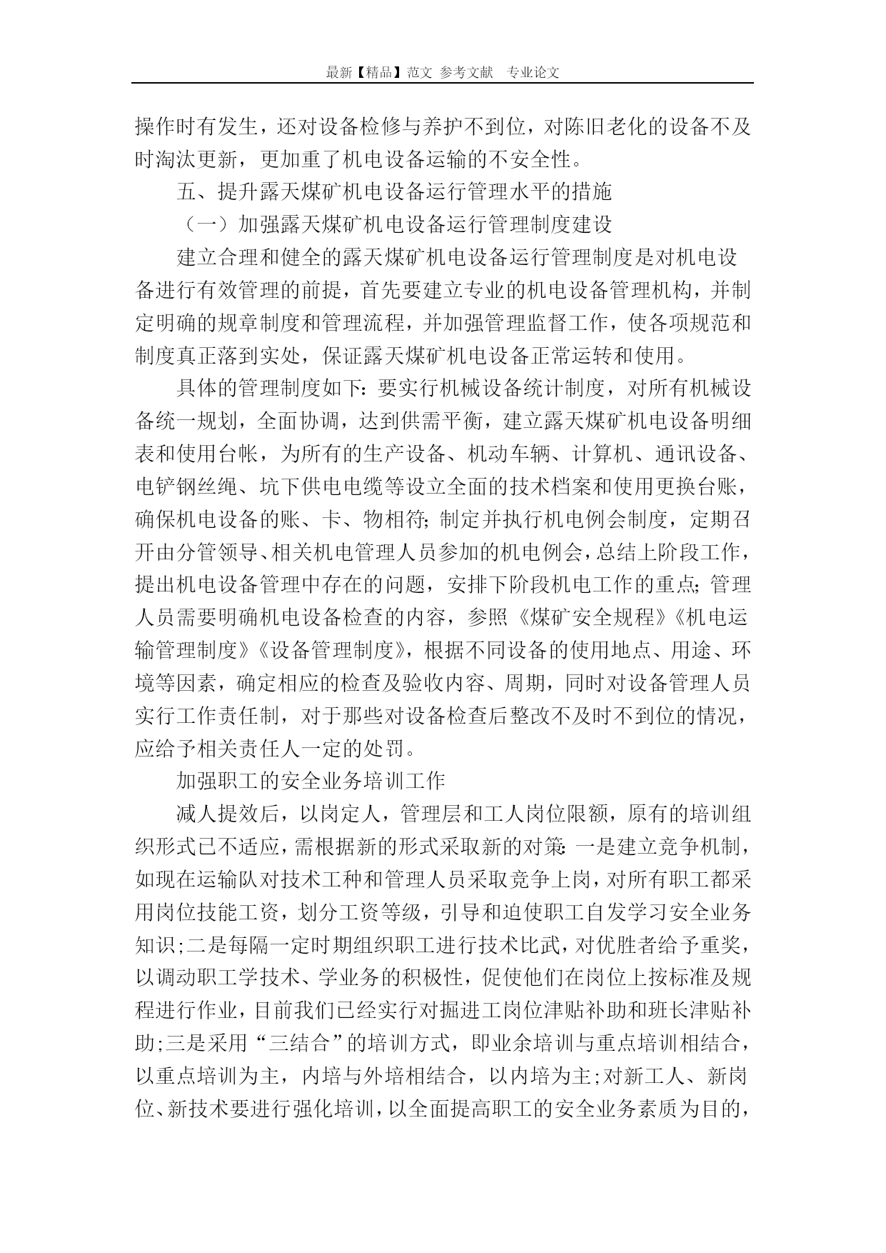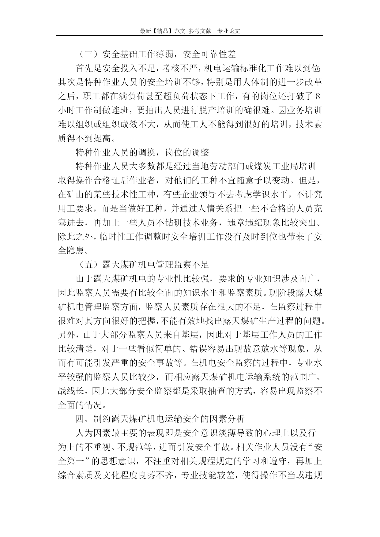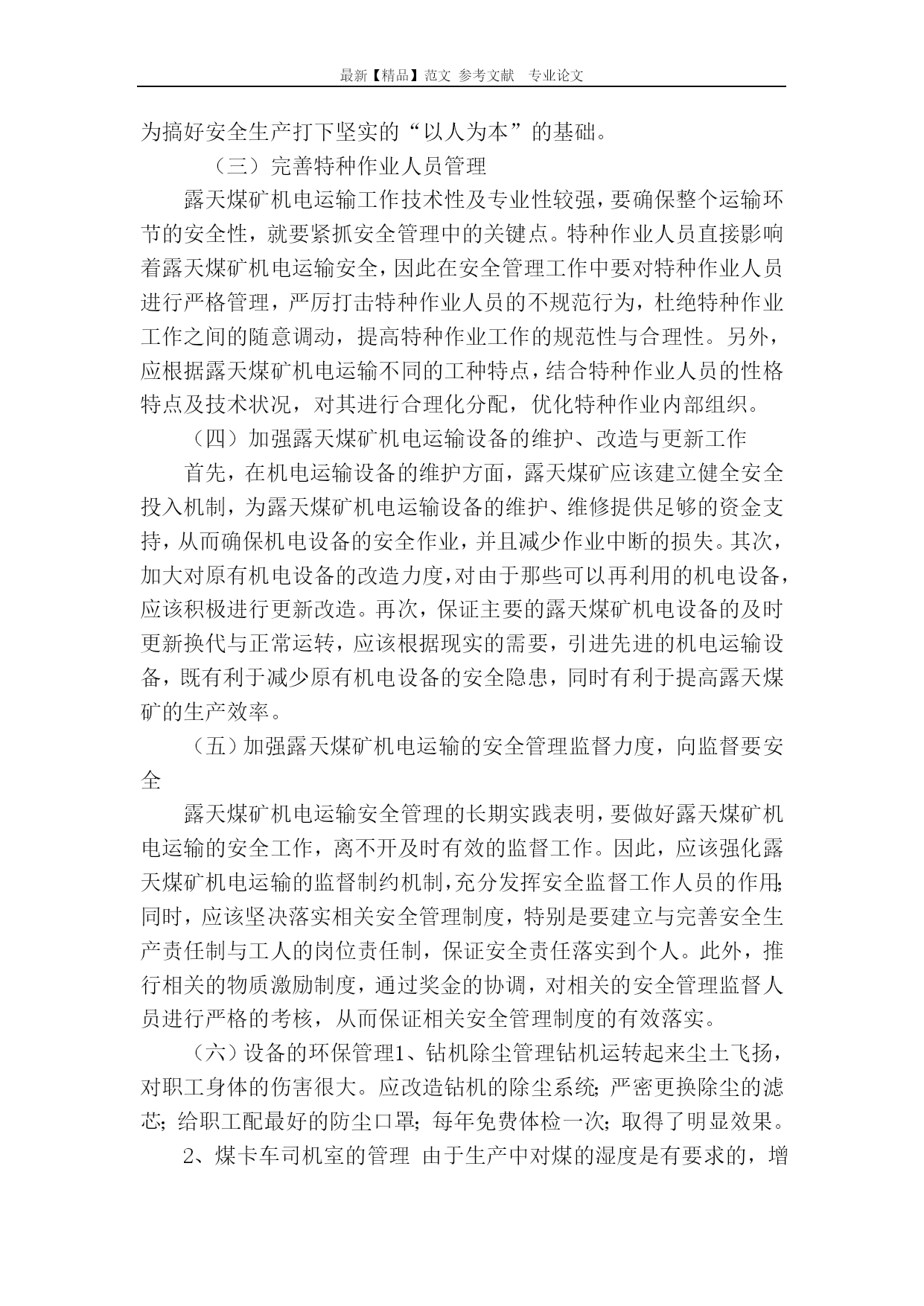 最新【精品】范文参考文献专业论文露天煤矿机电运输的安全管理分析露天煤矿机电运输的安全管理分析摘要:露天煤矿开采需要运输大量的土岩,所以就会使用到大量的机电设备,这一过程中一定要采取科学合理的管理措施,加强煤矿机电设备的管理。本文主要阐述了提升露天煤矿机电设备运行管理水平的措施,仅供参考。关键词:露天煤矿;机电设备;管理措施中图分类号:TU85文献标识码:A引言近些年来,我国煤矿业快速发展,发生了巨大变化,煤炭是生产中的常用能源之一。随着社会经济的迅速攀升,煤矿资源也随之逐渐消耗,可以说煤矿资源的开发给我国工业发展既带来机遇,又带来了挑战。迄今为止,我国已发生多次煤矿安全事故,严重损坏了我国的人力物力财力,为了改变这一状况,必须对制约露天煤矿机电设备运输安全的因素进行深入分析,并有针对性地采取有效防治措施,为保障煤矿安全生产奠定良好基础。一、煤矿机电运输安全管理的必要性分析随着社会的发展,煤矿建设正在不断的扩张,煤矿机电运输也在飞速增加,然而在这一过程中由于诸多因素的操作不当,导致了一些煤矿机电运输安全事故的发生。这些安全事故损失的不仅仅是国家财力,更严重威胁了工作人员的生命安全。正所谓“百年大计,安全第一”,只有工作人员的安全性得到了保障,才能够做好煤矿机电运输工作。为了降低煤矿机电运输事故的发生率,应全面进行煤矿机电运输安全管理工作,对煤矿机电运输工作中的各个环节进行严格把关,在确保煤矿机电运输安全的情况下再进行一系列运输操作。二、露天煤矿机电设备的运行特点一般情况下,在露天煤矿工作过程中都需要开采和运送大量的煤矿及一些石料,因而不可避免的就会用到钻机、电铲、卡车、推土机、洒水车、起重机、前装机等各种类型的机电设备,然而在对这些设备进行管理的过程中总是存在一些问题,这就在一定程度上使得煤矿的生产成本增加了不少,也没有完全发挥这些机电设备的最大使用效能,所以必须做好露天煤矿机电设备的管理工作。露天煤矿的机电设备运行具有独有的特点,包括专业技术性强、设备种类众多、生产任务工作量大、价值昂贵、作业环境恶劣、分布广、机动性强等,并且机电设备的操作人员较多,而管理人员较少,并且操作人员多为多人倒班作业,这就在一定程度上加大了机电设备出现问题的可能。实际数据表明,因为机电设备管理不善、机电设备故障或操作不当而造成的煤矿事故占到了总事故的近三成。由此看来,管理人员必须首先要具备机电设备管理意识,认识到机电设备运行管理不善所造成事故后果的严重性,并且充分考虑到露天煤矿机电设备运行的特点,包括设备众多、管理难度大、管理点分散等。尤其是当今煤炭市场的竞争越来越激烈,煤矿人员文化素质不是很高。在这些综合压力下,必须要建立起一套切实可行、行之有效的机电设备运行管理体系,从而保证机电设备的正常安全运行,最大限度地发挥机电设备的利用率,进一步提高露天煤矿的生产效率并降低生产成本。三、当前露天煤矿机电运行管理中存在的问题(一)特种作业人员文化程度参差不齐,掌握特种作业技术不娴熟据相关调查统计,在露天煤矿机电运行过程中17起机电运输事故中当事人中小学文化程度的占了40%。对技术工种安全操作知识掌握不牢,熟悉程度不够,是造成多发事故的重要原因。特别是部分设备操作人员文化基础差、态度不端正、上进心不强,学习业务技术的积极性差,素质低,给机电运输安全带来了非常大隐患。(二)安全制度不严,遗留安全隐患①岗位责任制度不健全,责任制度落实不到个人,隐患得不到及时的整改落实;②安全制度执行不严,对安全隐患考核不严,安全奖罚无法落实到个人,不能及时兑现,对管理人员反“三违”的积极性有严重不良影响;③对事故处理不能严格按照“三不放过”原则分析处理,不严肃追责任,工作人员无法受到应有的教育。(三)安全基础工作薄弱,安全可靠性差首先是安全投入不足,考核不严,机电运输标准化工作难以到位;其次是特种作业人员的安全培训不够,特别是用人体制的进一步改革之后,职工都在满负荷甚至超负荷状态下工作,有的岗位还打破了8小时工作制做连班,要抽出人员进行脱产培训的确很难。因业务培训难以组织或组织成效不大,从而使工人不能得到很好的培训,技术素质得不到提高。特种作业人员的调换,岗位的调整特种作业人员大多数都是经过当地劳动部门或煤炭工业局培训取得操作合格证后作业者,对他们的工种不宜随意予以变动。但是,在矿山的某些技术性工种,有些企业领导不去考虑学识水平,不讲究用工要求,而是当做好工种,并通过人情关系把一些不合格的人员充塞进去,再加上一些人员不钻研技术业务,违章违纪现象比较突出。除此之外,临时性工作调整时安全培训工作没有及时到位也带来了安全隐患。(五)露天煤矿机电管理监察不足由于露天煤矿机电的专业性比较强,要求的专业知识涉及面广,因此监察人员需要有比较全