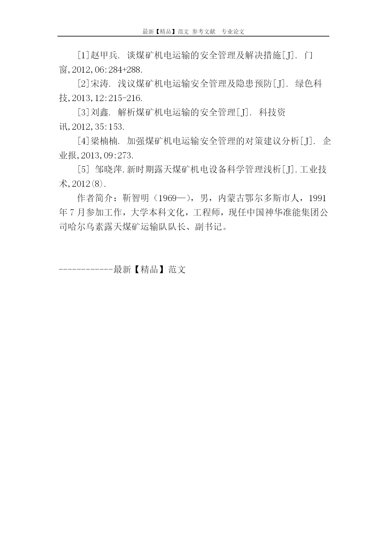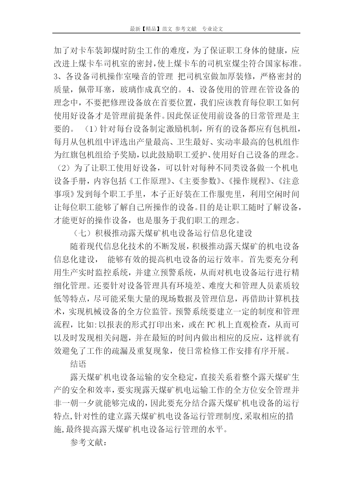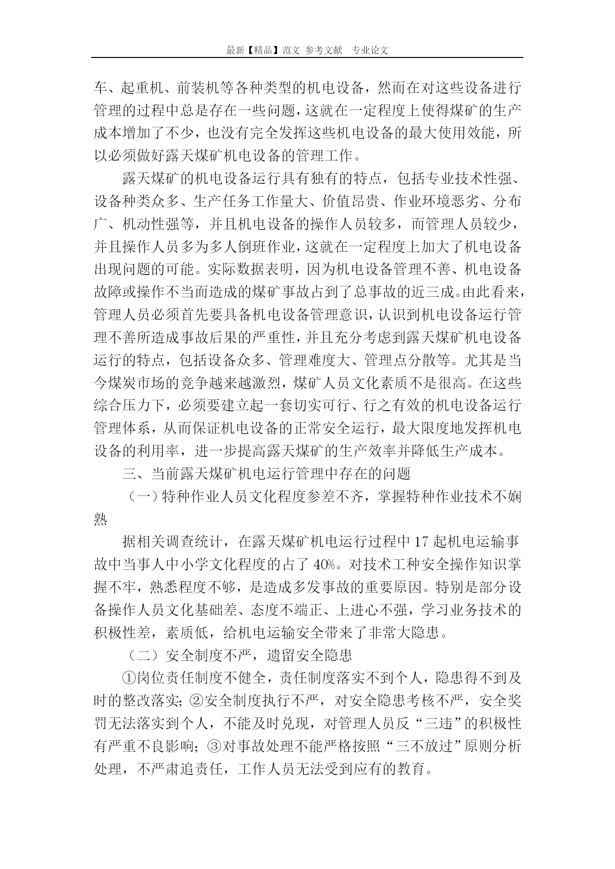 最新【精品】范文参考文献专业论文露天煤矿机电运输的安全管理分析露天煤矿机电运输的安全管理分析摘要:露天煤矿开采需要运输大量的土岩,所以就会使用到大量的机电设备,这一过程中一定要采取科学合理的管理措施,加强煤矿机电设备的管理。本文主要阐述了提升露天煤矿机电设备运行管理水平的措施,仅供参考。关键词:露天煤矿;机电设备;管理措施中图分类号:TU85文献标识码:A引言近些年来,我国煤矿业快速发展,发生了巨大变化,煤炭是生产中的常用能源之一。随着社会经济的迅速攀升,煤矿资源也随之逐渐消耗,可以说煤矿资源的开发给我国工业发展既带来机遇,又带来了挑战。迄今为止,我国已发生多次煤矿安全事故,严重损坏了我国的人力物力财力,为了改变这一状况,必须对制约露天煤矿机电设备运输安全的因素进行深入分析,并有针对性地采取有效防治措施,为保障煤矿安全生产奠定良好基础。一、煤矿机电运输安全管理的必要性分析随着社会的发展,煤矿建设正在不断的扩张,煤矿机电运输也在飞速增加,然而在这一过程中由于诸多因素的操作不当,导致了一些煤矿机电运输安全事故的发生。这些安全事故损失的不仅仅是国家财力,更严重威胁了工作人员的生命安全。正所谓“百年大计,安全第一”,只有工作人员的安全性得到了保障,才能够做好煤矿机电运输工作。为了降低煤矿机电运输事故的发生率,应全面进行煤矿机电运输安全管理工作,对煤矿机电运输工作中的各个环节进行严格把关,在确保煤矿机电运输安全的情况下再进行一系列运输操作。二、露天煤矿机电设备的运行特点一般情况下,在露天煤矿工作过程中都需要开采和运送大量的煤矿及一些石料,因而不可避免的就会用到钻机、电铲、卡车、推土机、洒水车、起重机、前装机等各种类型的机电设备,然而在对这些设备进行管理的过程中总是存在一些问题,这就在一定程度上使得煤矿的生产成本增加了不少,也没有完全发挥这些机电设备的最大使用效能,所以必须做好露天煤矿机电设备的管理工作。露天煤矿的机电设备运行具有独有的特点,包括专业技术性强、设备种类众多、生产任务工作量大、价值昂贵、作业环境恶劣、分布广、机动性强等,并且机电设备的操作人员较多,而管理人员较少,并且操作人员多为多人倒班作业,这就在一定程度上加大了机电设备出现问题的可能。实际数据表明,因为机电设备管理不善、机电设备故障或操作不当而造成的煤矿事故占到了总事故的近三成。由此看来,管理人员必须首先要具备机电设备管理意识,认识到机电设备运行管理不善所造成事故后果的严重性,并且充分考虑到露天煤矿机电设备运行的特点,包括设备众多、管理难度大、管理点分散等。尤其是当今煤炭市场的竞争越来越激烈,煤矿人员文化素质不是很高。在这些综合压力下,必须要建立起一套切实可行、行之有效的机电设备运行管理体系,从而保证机电设备的正常安全运行,最大限度地发挥机电设备的利用率,进一步提高露天煤矿的生产效率并降低生产成本。三、当前露天煤矿机电运行管理中存在的问题(一)特种作业人员文化程度参差不齐,掌握特种作业技术不娴熟据相关调查统计,在露天煤矿机电运行过程中17起机电运输事故中当事人中小学文化程度的占了40%。对技术工种安全操作知识掌握不牢,熟悉程度不够,是造成多发事故的重要原因。特别是部分设备操作人员文化基础差、态度不端正、上进心不强,学习业务技术的积极性差,素质低,给机电运输安全带来了非常大隐患。(二)安全制度不严,遗留安全隐患①岗位责任制度不健全,责任制度落实不到个人,隐患得不到及时的整改落实;②安全制度执行不严,对安全隐患考核不严,安全奖罚无法落实到个人,不能及时兑现,对管理人员反“三违”的积极性有严重不良影响;③对事故处理不能严格按照“三不放过”原则分析处理,不严肃追责任,工作人员无法受到应有的教育。(三)安全基础工作薄弱,安全可靠性差首先是安全投入不足,考核不严,机电运输标准化工作难以到位;其次是特种作业人员的安全培训不够,特别是用人体制的进一步改革之后,职工都在满负荷甚至超负荷状态下工作,有的岗位还打破了8小时工作制做连班,要抽出人员进行脱产培训的确很难。因业务培训难以组织或组织成效不大,从而使工人不能得到很好的培训,技术素质得不到提高。特种作业人员的调换,岗位的调整特种作业人员大多数都是经过当地劳动部门或煤炭工业局培训取得操作合格证后作业者,对他们的工种不宜随意予以变动。但是,在矿山的某些技术性工种,有些企业领导不去考虑学识水平,不讲究用工要求,而是当做好工种,并通过人情关系把一些不合格的人员充塞进去,再加上一些人员不钻研技术业务,违章违纪现象比较突出。除此之外,临时性工作调整时安全培训工作没有及时到位也带来了安全隐患。(五)露天煤矿机电管理监察不足由于露天煤矿机电的专业性比较强,要求的专业知识涉及面广,因此监察人员需要有比较全