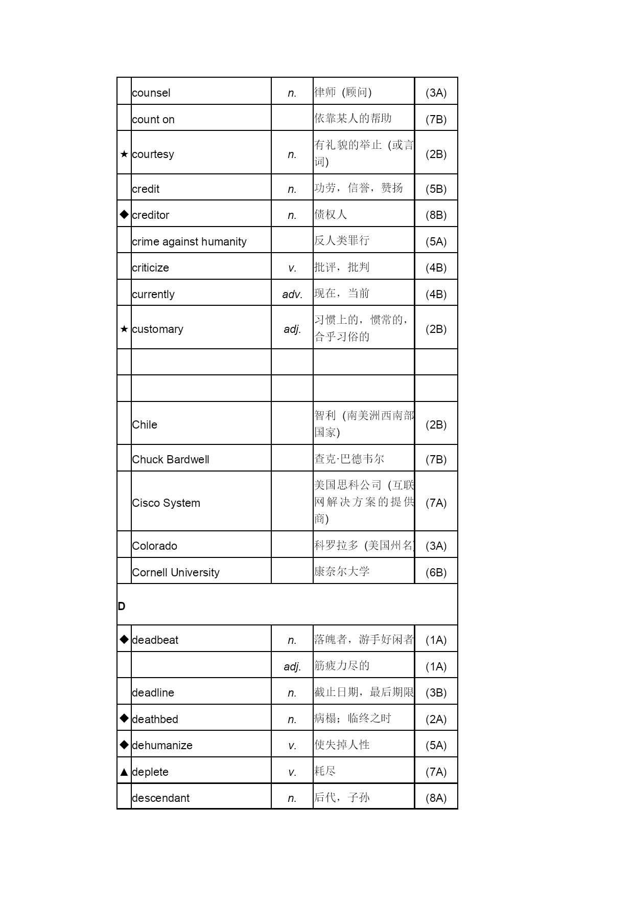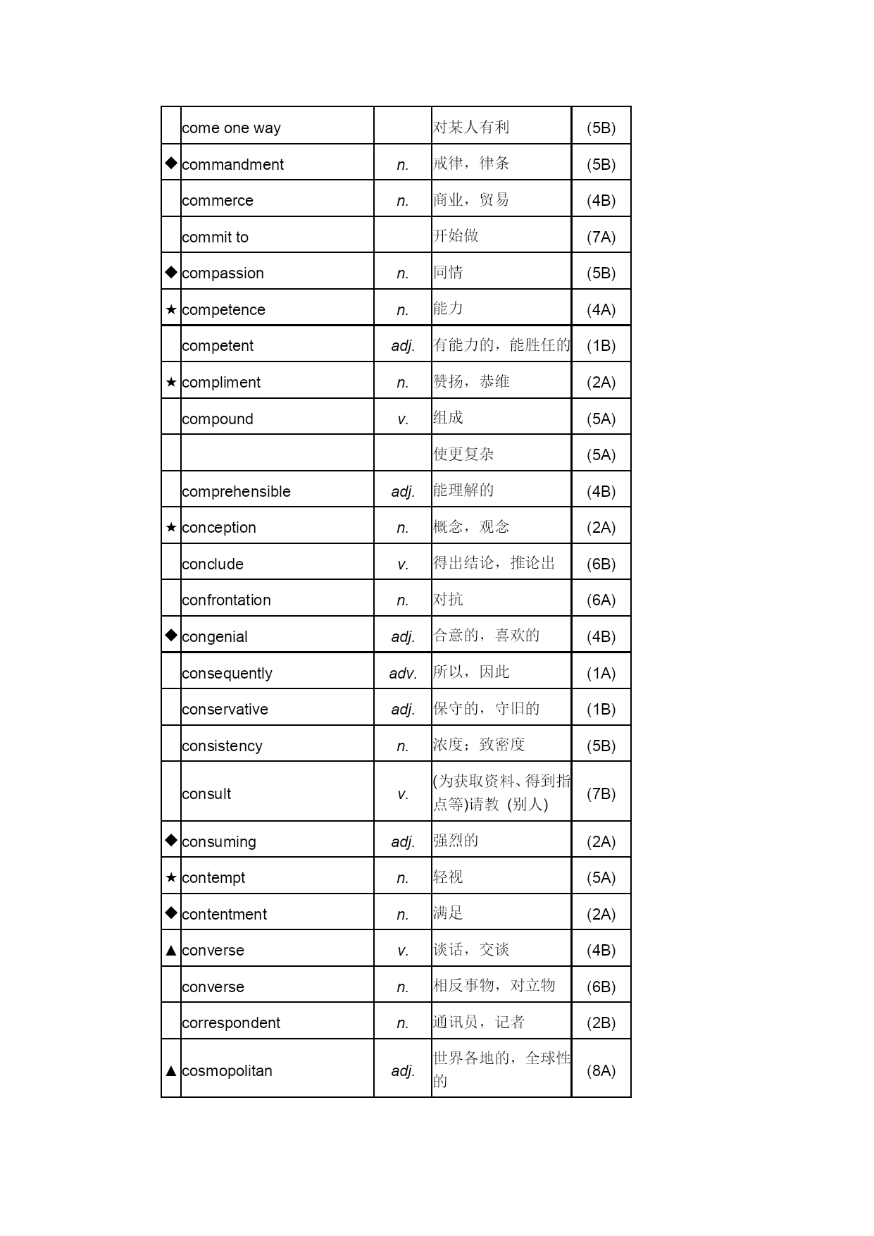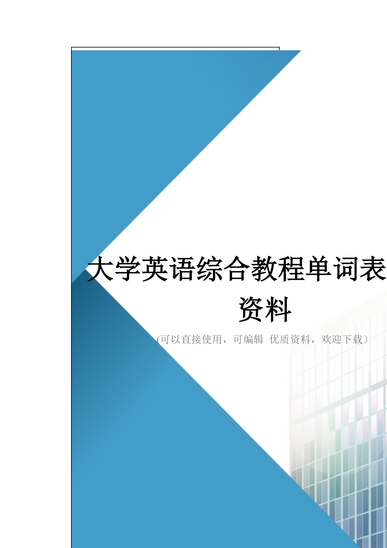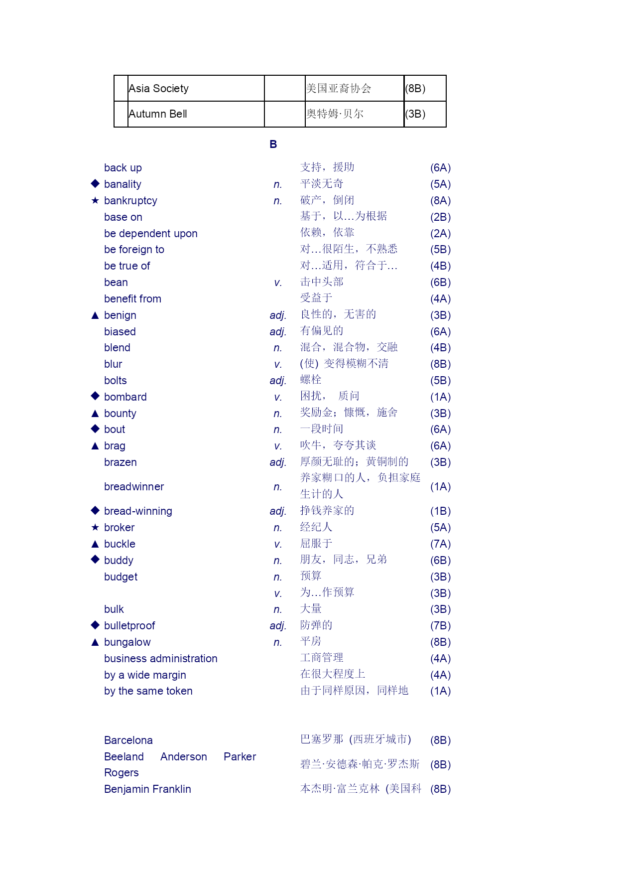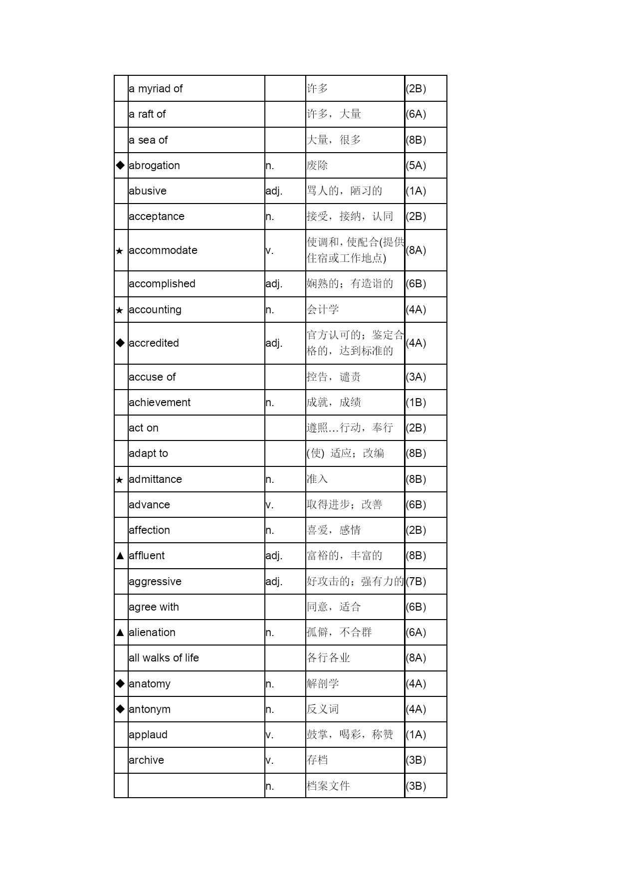 大学英语综合教程单词表优质资料(可以直接使用,可编辑优质资料,欢迎下载)Aamyriadof许多(2B)araftof许多,大量(6A)aseaof大量,很多(8B)◆abrogationn.废除(5A)abusiveadj.骂人的,陋习的(1A)acceptancen.接受,接纳,认同(2B)★accommodatev.使调和,使配合(提供住宿或工作地点)(8A)accomplishedadj.娴熟的;有造诣的(6B)★accountingn.会计学(4A)◆accreditedadj.官方认可的;鉴定合格的,达到标准的(4A)accuseof控告,谴责(3A)achievementn.成就,成绩(1B)acton遵照…行动,奉行(2B)adaptto(使)适应;改编(8B)★admittancen.准入(8B)advancev.取得进步;改善(6B)affectionn.喜爱,感情(2B)▲affluentadj.富裕的,丰富的(8B)aggressiveadj.好攻击的;强有力的(7B)agreewith同意,适合(6B)▲alienationn.孤僻,不合群(6A)allwalksoflife各行各业(8A)◆anatomyn.解剖学(4A)◆antonymn.反义词(4A)applaudv.鼓掌,喝彩,称赞(1A)archivev.存档(3B)n.档案文件(3B)▲ardentadj.热情的;多情的(6A)◆arm-lengthadj.疏远的;保持一定距离的;公平交易的;公正估价的(5B)arousev.激起,唤起(6A)asto至于,关于(2B)◆ascendantadj.上升的,增长的(8B)assessv.估计,评估(8A)★assimilationn.同化(2B)at(the)worst在最坏(或最不利)的情况下(1A)atbest充其量,至多(1A)atthisrate这样的话,这样地(1B)attributionn.归因;归属之事物(3B)audiofilesn.声音文件(3B)◆autismn.自闭症,孤独症(3A)◆avidlyadv.殷切地,贪婪地(6A)AaronPun阿伦·庞(2B)AdolfEichmann阿道夫·艾希曼,纳粹德国的高官,也是在犹太人大屠杀中执行“最终方案”的主要负责者(5A)AIG美国国际集团(5A)ArneDuncan阿恩·邓肯(8B)Arsenal阿森纳(英超足球俱乐部)(6A)ASCAP美国作曲家、作家与出版家协会(3B)AsiaSociety美国亚裔协会(8B)AutumnBell奥特姆·贝尔(3B)Bbackup支持,援助(6A)◆banalityn.平淡无奇(5A)★bankruptcyn.破产,倒闭(8A)baseon基于,以…为根据(2B)bedependentupon依赖,依靠(2A)beforeignto对…很陌生,不熟悉(5B)betrueof对…适用,符合于…(4B)beanv.击中头部(6B)benefitfrom受益于(4A)▲benignadj.良性的,无害的(3B)biasedadj.有偏见的(6A)blendn.混合,混合物,交融(4B)blurv.(使)变得模糊不清(8B)boltsadj.螺栓(5B)◆bombardv.困扰,质问(1A)▲bountyn.奖励金;慷慨,施舍(3B)◆boutn.一段时间(6A)▲bragv.吹牛,夸夸其谈(6A)brazenadj.厚颜无耻的;黄铜制的(3B)breadwinnern.养家糊口的人,负担家庭生计的人(1A)◆bread-winningadj.挣钱养家的(1B)★brokern.经纪人(5A)▲bucklev.屈服于(7A)◆buddyn.朋友,同志,兄弟(6B)budgetn.预算(3B)v.为…作预算(3B)bulkn.大量(3B)◆bulletproofadj.防弹的(7B)▲bungalown.平房(8B)businessadministration工商管理(4A)byawidemargin在很大程度上(4A)bythesametoken由于同样原因,同样地(1A)Barcelona巴塞罗那(西班牙城市)(8B)BeelandAndersonParkerRogers碧兰·安德森·帕克·罗杰斯(8B)BenjaminFranklin本杰明·富兰克林(美国科学家和发明家,著名的政治家、外交家、哲学家、文学家和航海家)(8B)BMI美国音乐作品保护机构(3B)BobGehrke鲍勃·格尔克(3B)BureauofMines矿务局(4A)C◆cacophonousadj.刺耳的,嘈杂的(8B)callfor要求,号召,需要(4B)◆candorn.坦诚(5B)◆cardiovascula