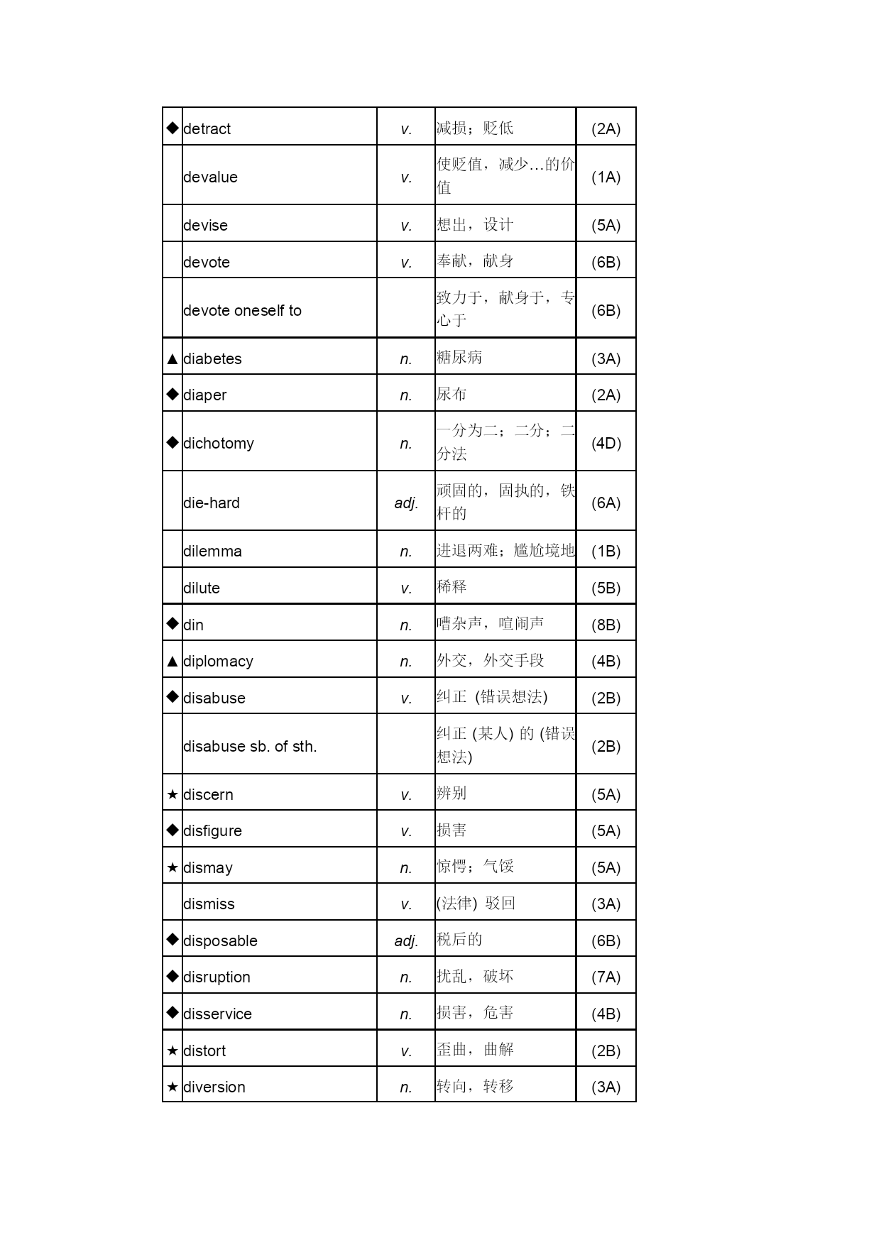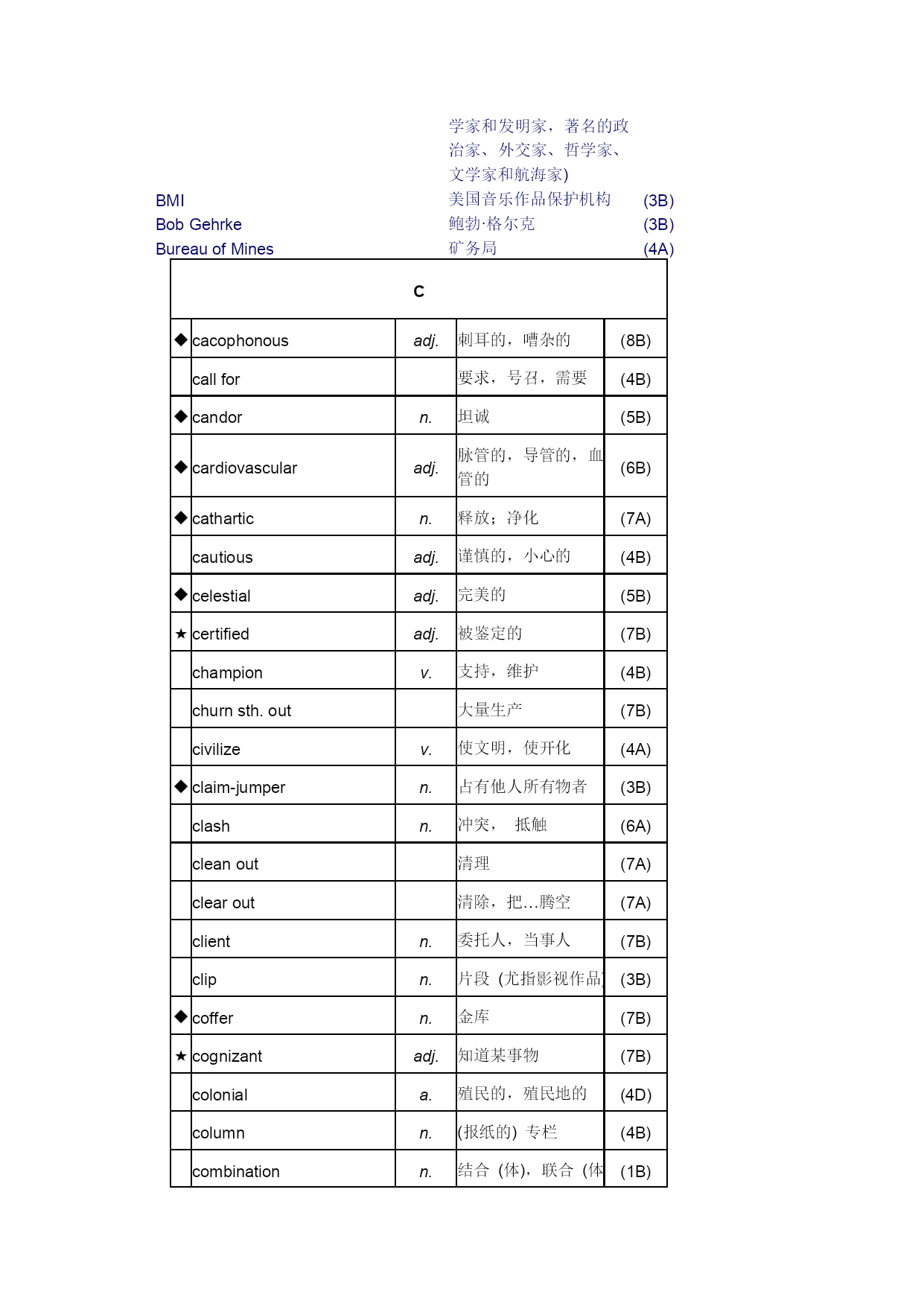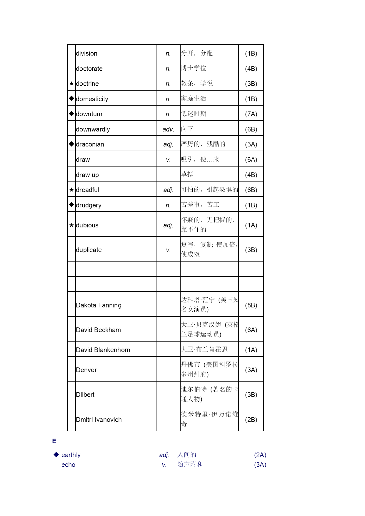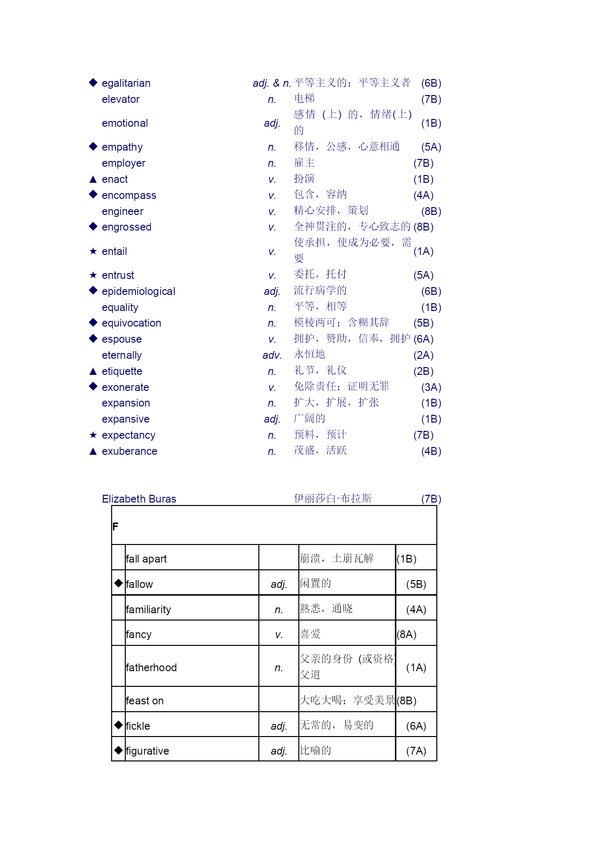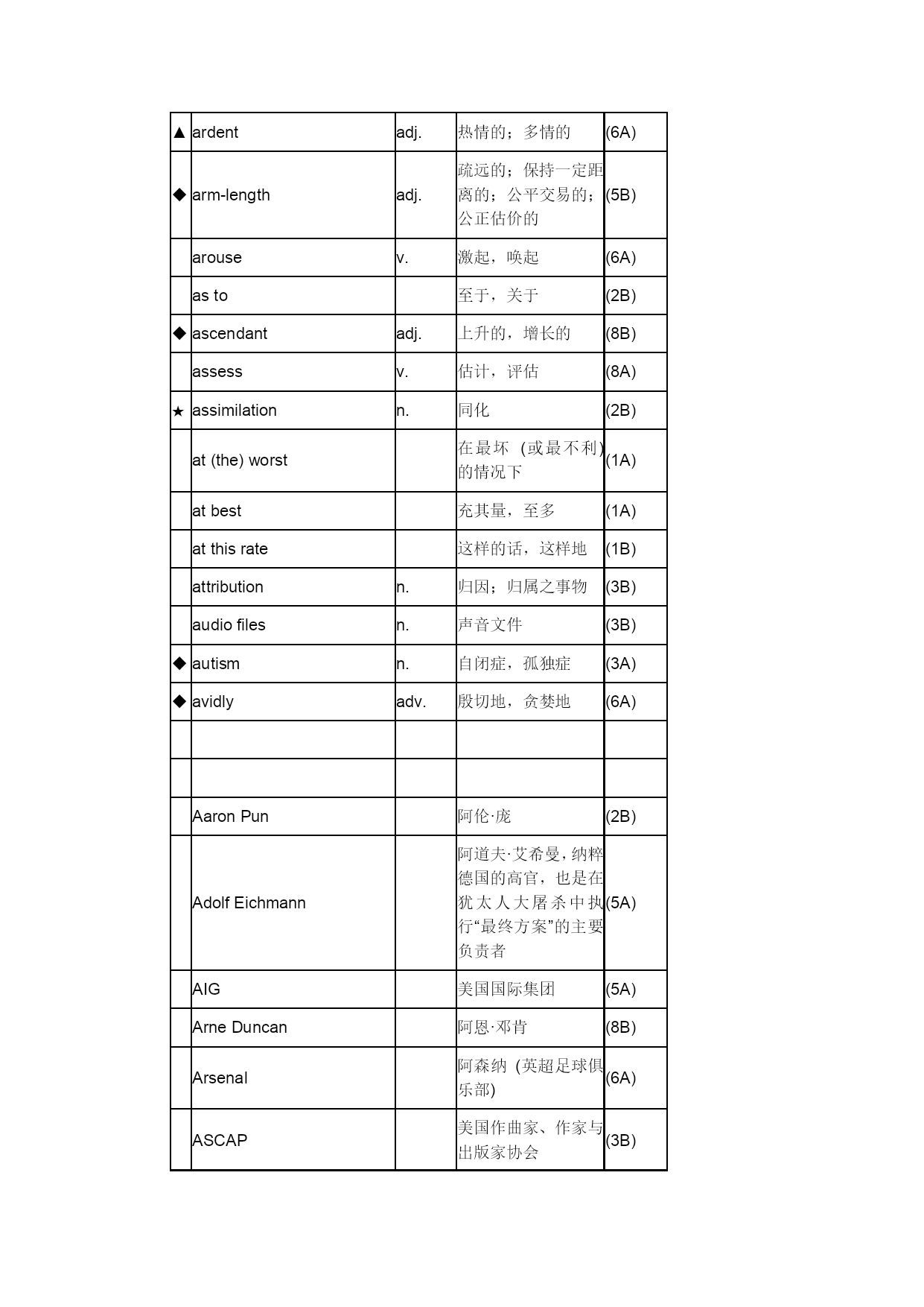 大学英语综合教程单词表优质资料(可以直接使用,可编辑优质资料,欢迎下载)Aamyriadof许多(2B)araftof许多,大量(6A)aseaof大量,很多(8B)◆abrogationn.废除(5A)abusiveadj.骂人的,陋习的(1A)acceptancen.接受,接纳,认同(2B)★accommodatev.使调和,使配合(提供住宿或工作地点)(8A)accomplishedadj.娴熟的;有造诣的(6B)★accountingn.会计学(4A)◆accreditedadj.官方认可的;鉴定合格的,达到标准的(4A)accuseof控告,谴责(3A)achievementn.成就,成绩(1B)acton遵照…行动,奉行(2B)adaptto(使)适应;改编(8B)★admittancen.准入(8B)advancev.取得进步;改善(6B)affectionn.喜爱,感情(2B)▲affluentadj.富裕的,丰富的(8B)aggressiveadj.好攻击的;强有力的(7B)agreewith同意,适合(6B)▲alienationn.孤僻,不合群(6A)allwalksoflife各行各业(8A)◆anatomyn.解剖学(4A)◆antonymn.反义词(4A)applaudv.鼓掌,喝彩,称赞(1A)archivev.存档(3B)n.档案文件(3B)▲ardentadj.热情的;多情的(6A)◆arm-lengthadj.疏远的;保持一定距离的;公平交易的;公正估价的(5B)arousev.激起,唤起(6A)asto至于,关于(2B)◆ascendantadj.上升的,增长的(8B)assessv.估计,评估(8A)★assimilationn.同化(2B)at(the)worst在最坏(或最不利)的情况下(1A)atbest充其量,至多(1A)atthisrate这样的话,这样地(1B)attributionn.归因;归属之事物(3B)audiofilesn.声音文件(3B)◆autismn.自闭症,孤独症(3A)◆avidlyadv.殷切地,贪婪地(6A)AaronPun阿伦·庞(2B)AdolfEichmann阿道夫·艾希曼,纳粹德国的高官,也是在犹太人大屠杀中执行“最终方案”的主要负责者(5A)AIG美国国际集团(5A)ArneDuncan阿恩·邓肯(8B)Arsenal阿森纳(英超足球俱乐部)(6A)ASCAP美国作曲家、作家与出版家协会(3B)AsiaSociety美国亚裔协会(8B)AutumnBell奥特姆·贝尔(3B)Bbackup支持,援助(6A)◆banalityn.平淡无奇(5A)★bankruptcyn.破产,倒闭(8A)baseon基于,以…为根据(2B)bedependentupon依赖,依靠(2A)beforeignto对…很陌生,不熟悉(5B)betrueof对…适用,符合于…(4B)beanv.击中头部(6B)benefitfrom受益于(4A)▲benignadj.良性的,无害的(3B)biasedadj.有偏见的(6A)blendn.混合,混合物,交融(4B)blurv.(使)变得模糊不清(8B)boltsadj.螺栓(5B)◆bombardv.困扰,质问(1A)▲bountyn.奖励金;慷慨,施舍(3B)◆boutn.一段时间(6A)▲bragv.吹牛,夸夸其谈(6A)brazenadj.厚颜无耻的;黄铜制的(3B)breadwinnern.养家糊口的人,负担家庭生计的人(1A)◆bread-winningadj.挣钱养家的(1B)★brokern.经纪人(5A)▲bucklev.屈服于(7A)◆buddyn.朋友,同志,兄弟(6B)budgetn.预算(3B)v.为…作预算(3B)bulkn.大量(3B)◆bulletproofadj.防弹的(7B)▲bungalown.平房(8B)businessadministration工商管理(4A)byawidemargin在很大程度上(4A)bythesametoken由于同样原因,同样地(1A)Barcelona巴塞罗那(西班牙城市)(8B)BeelandAndersonParkerRogers碧兰·安德森·帕克·罗杰斯(8B)BenjaminFranklin本杰明·富兰克林(美国科学家和发明家,著名的政治家、外交家、哲学家、文学家和航海家)(8B)BMI美国音乐作品保护机构(3B)BobGehrke鲍勃·格尔克(3B)BureauofMines矿务局(4A)C◆cacophonousadj.刺耳的,嘈杂的(8B)callfor要求,号召,需要(4B)◆candorn.坦诚(5B)◆cardiovascula