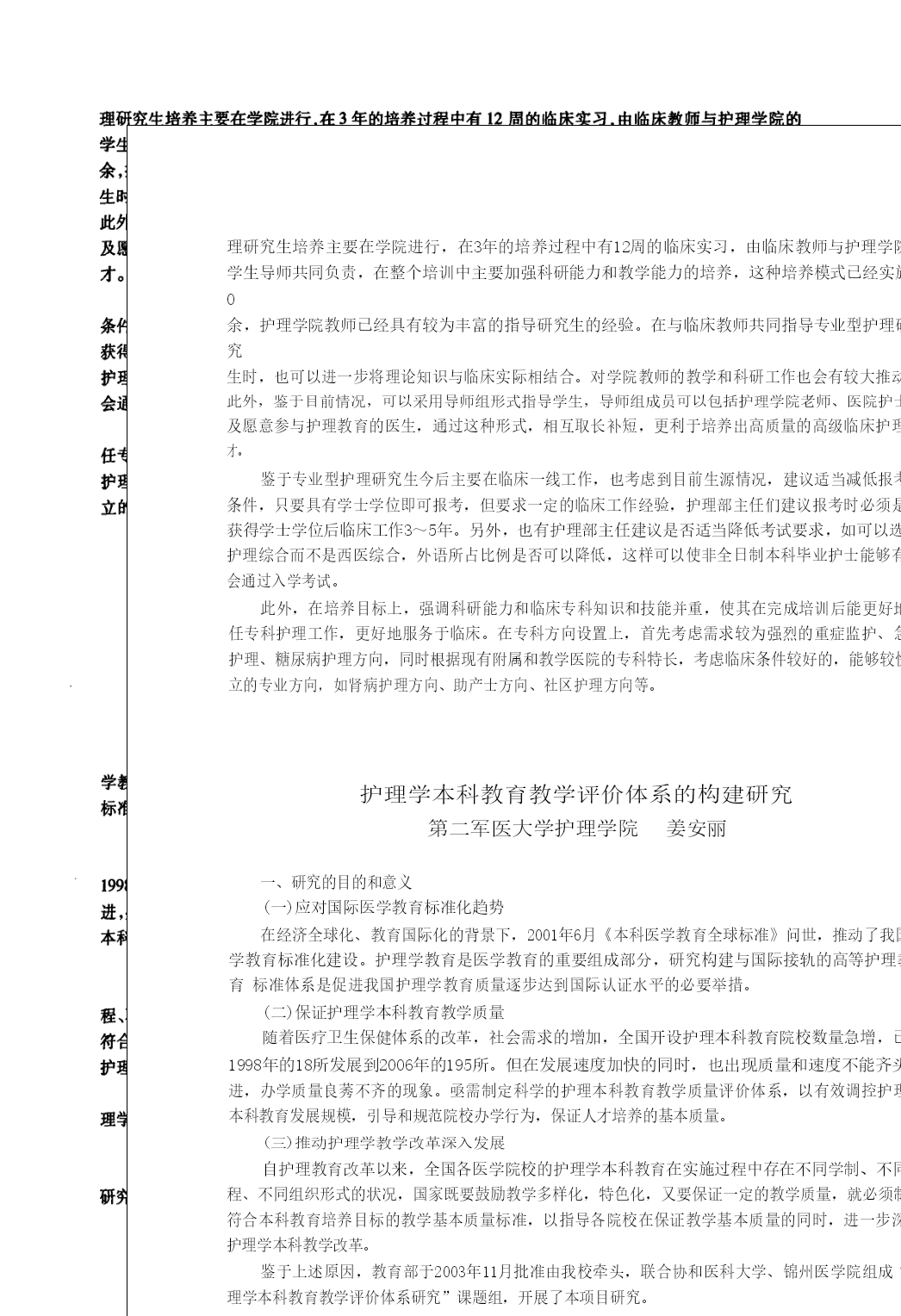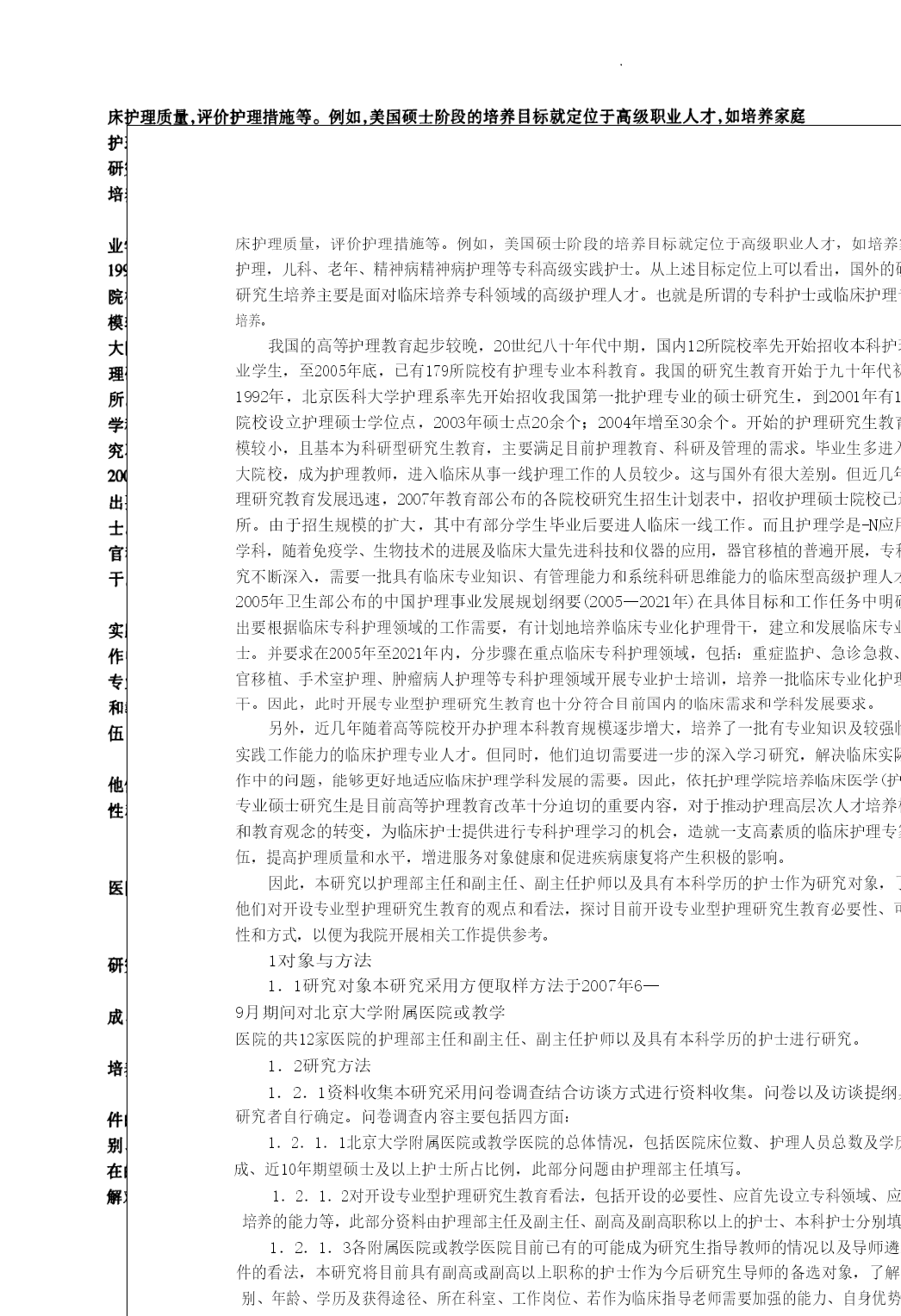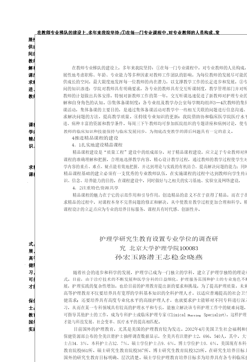 护理学研究生教育设置专业学位的调查研究(完整版)(文档可以直接使用,也可根据实际需要修改使用,可编辑欢迎下载)在教师专业梯队的建设上,多年来我院坚持:①在每一门专业课程中,对专业教师的人员构成,发展性地考虑职称、年龄、专业能力等多种因素对教师工作团队的影响,为每位教师的发展尽可能的提供成长的空间,最大限度地发挥每一位教师的内在潜力,以支撑教学工作的长足进步和发展。②专业问的知识渗透:学院对教师具有明确要求,各专业的教师具有交互听课制度,教学管理部门并对听科教师的计划做出具体安排,特别对新教师工作的第一年,交互听课迅速促进了新教师对护理专业的了解和自身角色的认知。③集体备课制度:各专业组及教学办公室每学期均组织3—4次教师的集体备课活动,集体备课的主要目的,是通过集体备课活动对教学中一些相互关联的问题进行信息沟通、探求解决问题的方法,提高教学质量。④持续专业知识的更新:我院借助协和临床医学院医疗水平先进、病种丰富的资源和教学条件,每周三下午教师均可参加医院组织的专题讲座和病例讨论,使专业教师的临床知识和技能保持与临床发展同步,为彻底改变教学的滞后问题具有一定的意义。4推进精品课程的建设4.1扎实地建设精晶课程精品课程建设是“质量工程”建设中的组成部分,对于精品课程建设,应立足于专业教师对所授课程的准确理解和把握,合理地选择教学内容,精心设计教学过程,通过教师的教学过程使学生对教学内容的重点、难点、疑点能有效地把握,并达到理论与实践的有机结合,提高解决问题的能力;同时,精品课程基础的建立必须有一支优秀的专业教师队伍,在实施课程的过程中达到教师向学生传递知识、信念、培养能力的目的。在课程建设中,同时做好与之相关的实习基地、实验室及网络建设。4.2注重特色资源共享精品课程的魅力在于它的示范作用和引导作用,创造精品的意义不在于获得了精品,而在于在追求精品的过程中,对课程本身不完善问题的修正和解决,从中使教育教学过程更加合理和科学。精品课程设计的立足点应为专业的培养目标服务,课程具有时代感、创新性并。护理学研究生教育设置专业学位的调查研究北京大学护理学院100083孙宏玉路潜王志稳金晓燕随着社会的进步和科学的发展,护理学已成为一门独立的学科,建立了护理学独特的理论和模式。目前,由于诊疗技术的不断发展和医学分科的日益细化,护理服务范围和护士的专业角色不断扩展,护理实践的复杂性增加,也给目前的护理教育提出新的要求和挑战。为了提高护理质量,未来的高等护理教育不仅要培养具有宽厚的学科基本知识的全科护理人才,以适应普遍提高的社会卫生保健需求;还要培养具有高度专业化水平的高级护理人才,也就要求护士能够对不同专科进行深入学习,从而在某一专科领域具有较高的护理水平和专长,能独立解决该专科护理工作中的疑难问题,并可指导其他护士的工作,成为专科护士或临床护理专家(ClinicalNursingSpecialist)。这样护理水平才能与科技发展、社会变革、医疗水平的提高相匹配。目前国外的护理教育,尤其是美国的护理教育较为发达。2002年4月美国卫生社会福利和健康保健资源部公布的全美注册护士抽样调查数据显示,全美共有注册护士2,696。540人,其中,大专护士占34.3%,本科护士占32.7%,硕士学位护士占9.6%,博士学位护士0.6%。美国现有本科护理教育院校661所、硕士研究生教育院校367所、博士研究生教育院校323所。在研究生培养目标上,国外的研究生教育目标明确、层次清楚。硕士学位护理教育培养目标多为培养具有各专科临床护理实践专长的高级实践护士及护士指导者。毕业后可成为护理专家,担任临床护理指导、保证和监督临87l床护理质量,评价护理措施等。例如,美国硕士阶段的培养目标就定位于高级职业人才,如培养家庭护理,儿科、老年、精神病精神病护理等专科高级实践护士。从上述目标定位上可以看出,国外的硕士研究生培养主要是面对临床培养专科领域的高级护理人才。也就是所谓的专科护士或临床护理专家培养。我国的高等护理教育起步较晚,20世纪八十年代中期,国内12所院校率先开始招收本科护理专业学生,至2005年底,已有179所院校有护理专业本科教育。我国的研究生教育开始于九十年代初,1992年,北京医科大学护理系率先开始招收我国第一批护理专业的硕士研究生,到2001年有10所院校设立护理硕士学位点,2003年硕士点20余个;2004年增至30余个。开始的护理研究生教育规模较小,且基本为科研型研究生教育,主要满足目前护理教育、科研及管理的需求。毕业生多进入各大院校,成为护理教师,进入临床从事一线护理工作的人员较少。这与国外有很大差别。但近几年护理研究教育发展迅速,2007年教育部公布的各院校研究生招生计划表中,