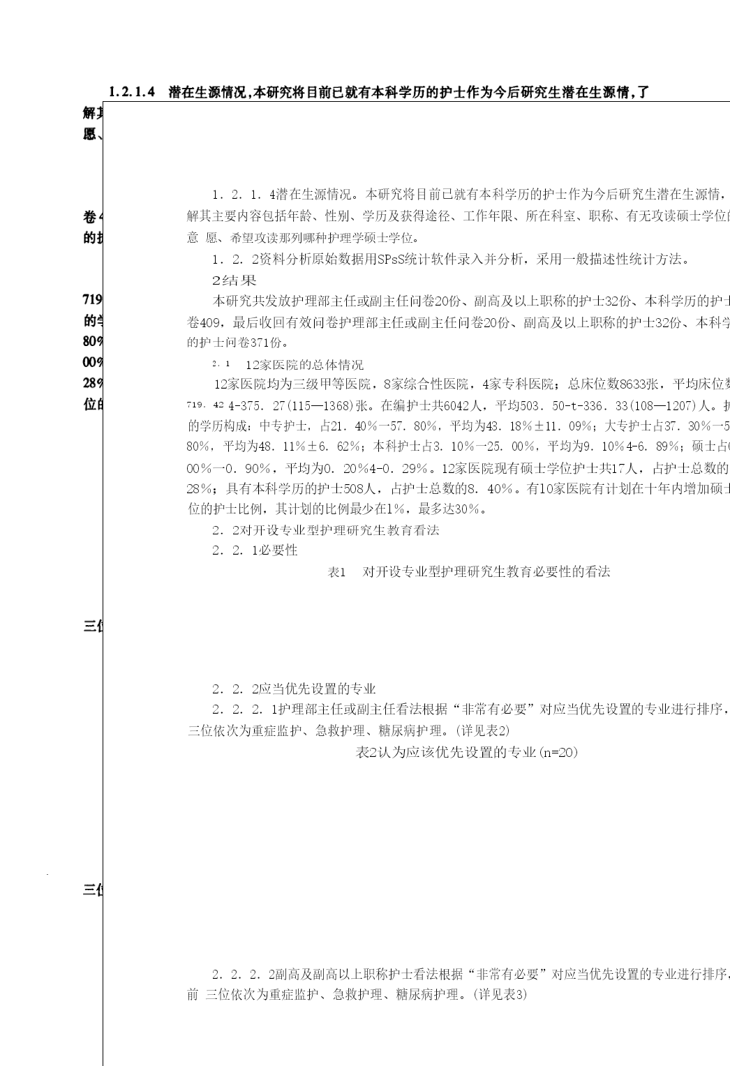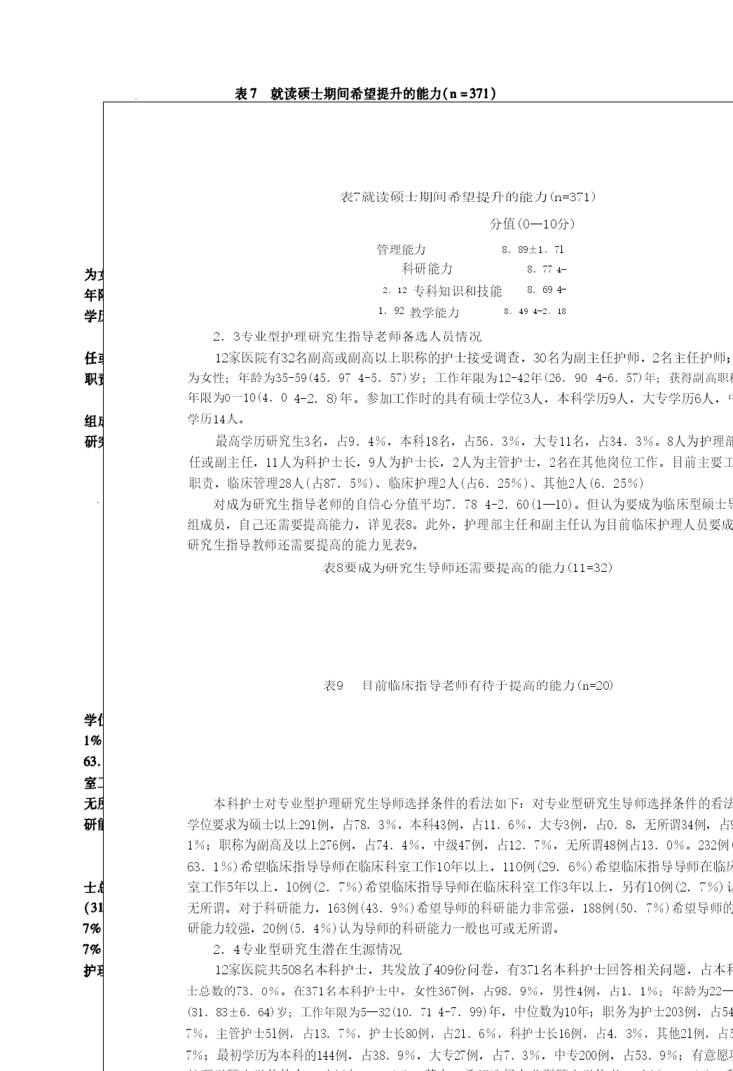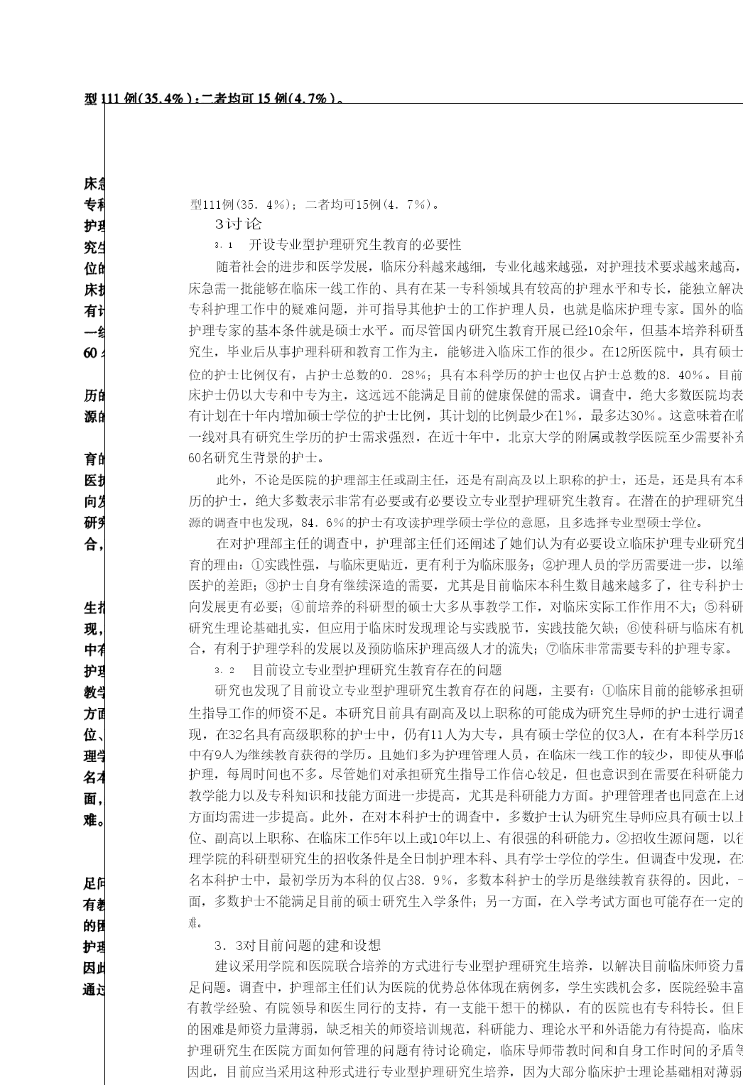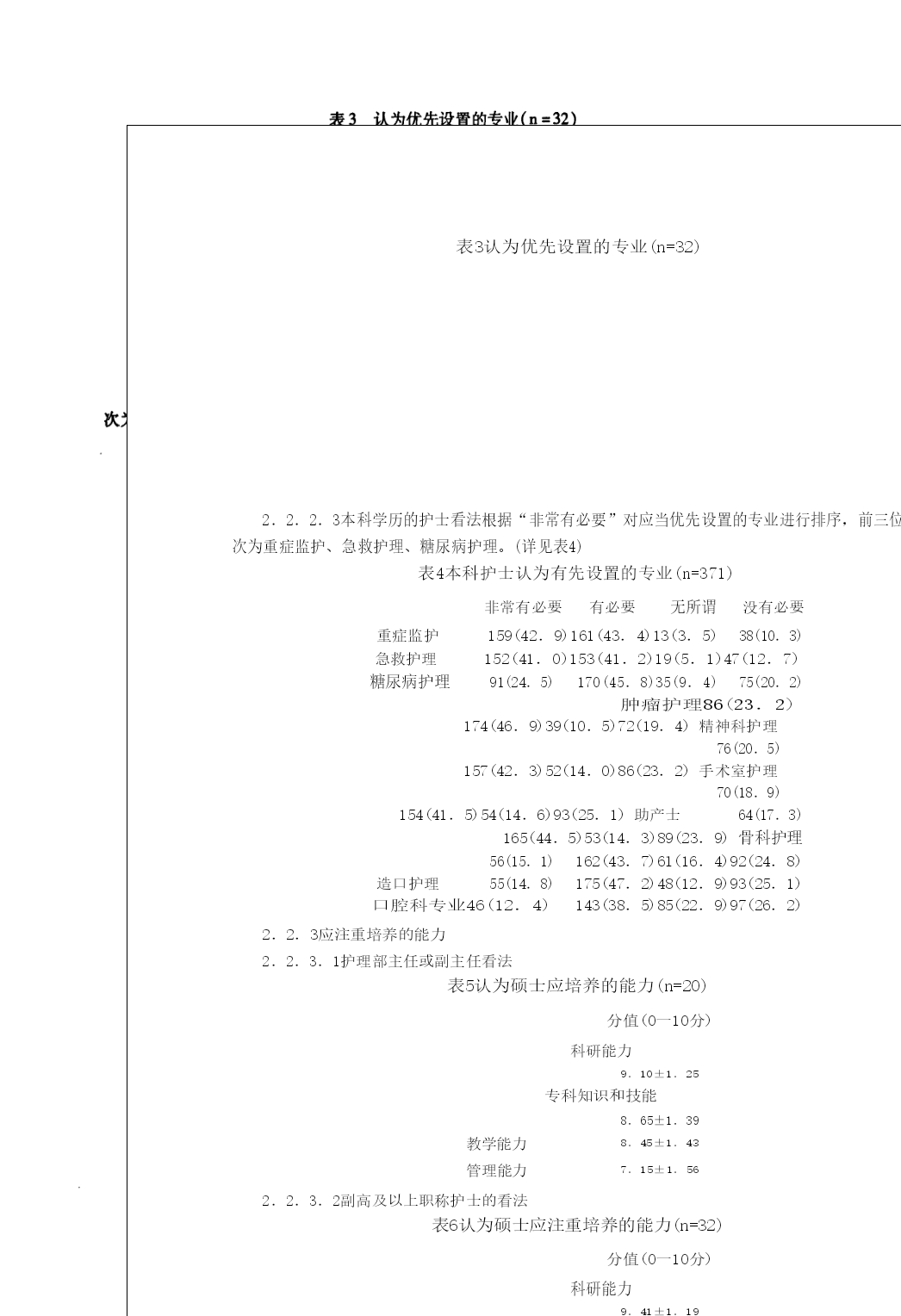 护理学研究生教育设置专业学位的调查研究(完整版)(文档可以直接使用,也可根据实际需要修改使用,可编辑欢迎下载)在教师专业梯队的建设上,多年来我院坚持:①在每一门专业课程中,对专业教师的人员构成,发展性地考虑职称、年龄、专业能力等多种因素对教师工作团队的影响,为每位教师的发展尽可能的提供成长的空间,最大限度地发挥每一位教师的内在潜力,以支撑教学工作的长足进步和发展。②专业问的知识渗透:学院对教师具有明确要求,各专业的教师具有交互听课制度,教学管理部门并对听科教师的计划做出具体安排,特别对新教师工作的第一年,交互听课迅速促进了新教师对护理专业的了解和自身角色的认知。③集体备课制度:各专业组及教学办公室每学期均组织3—4次教师的集体备课活动,集体备课的主要目的,是通过集体备课活动对教学中一些相互关联的问题进行信息沟通、探求解决问题的方法,提高教学质量。④持续专业知识的更新:我院借助协和临床医学院医疗水平先进、病种丰富的资源和教学条件,每周三下午教师均可参加医院组织的专题讲座和病例讨论,使专业教师的临床知识和技能保持与临床发展同步,为彻底改变教学的滞后问题具有一定的意义。4推进精品课程的建设4.1扎实地建设精晶课程精品课程建设是“质量工程”建设中的组成部分,对于精品课程建设,应立足于专业教师对所授课程的准确理解和把握,合理地选择教学内容,精心设计教学过程,通过教师的教学过程使学生对教学内容的重点、难点、疑点能有效地把握,并达到理论与实践的有机结合,提高解决问题的能力;同时,精品课程基础的建立必须有一支优秀的专业教师队伍,在实施课程的过程中达到教师向学生传递知识、信念、培养能力的目的。在课程建设中,同时做好与之相关的实习基地、实验室及网络建设。4.2注重特色资源共享精品课程的魅力在于它的示范作用和引导作用,创造精品的意义不在于获得了精品,而在于在追求精品的过程中,对课程本身不完善问题的修正和解决,从中使教育教学过程更加合理和科学。精品课程设计的立足点应为专业的培养目标服务,课程具有时代感、创新性并。护理学研究生教育设置专业学位的调查研究北京大学护理学院100083孙宏玉路潜王志稳金晓燕随着社会的进步和科学的发展,护理学已成为一门独立的学科,建立了护理学独特的理论和模式。目前,由于诊疗技术的不断发展和医学分科的日益细化,护理服务范围和护士的专业角色不断扩展,护理实践的复杂性增加,也给目前的护理教育提出新的要求和挑战。为了提高护理质量,未来的高等护理教育不仅要培养具有宽厚的学科基本知识的全科护理人才,以适应普遍提高的社会卫生保健需求;还要培养具有高度专业化水平的高级护理人才,也就要求护士能够对不同专科进行深入学习,从而在某一专科领域具有较高的护理水平和专长,能独立解决该专科护理工作中的疑难问题,并可指导其他护士的工作,成为专科护士或临床护理专家(ClinicalNursingSpecialist)。这样护理水平才能与科技发展、社会变革、医疗水平的提高相匹配。目前国外的护理教育,尤其是美国的护理教育较为发达。2002年4月美国卫生社会福利和健康保健资源部公布的全美注册护士抽样调查数据显示,全美共有注册护士2,696。540人,其中,大专护士占34.3%,本科护士占32.7%,硕士学位护士占9.6%,博士学位护士0.6%。美国现有本科护理教育院校661所、硕士研究生教育院校367所、博士研究生教育院校323所。在研究生培养目标上,国外的研究生教育目标明确、层次清楚。硕士学位护理教育培养目标多为培养具有各专科临床护理实践专长的高级实践护士及护士指导者。毕业后可成为护理专家,担任临床护理指导、保证和监督临87l床护理质量,评价护理措施等。例如,美国硕士阶段的培养目标就定位于高级职业人才,如培养家庭护理,儿科、老年、精神病精神病护理等专科高级实践护士。从上述目标定位上可以看出,国外的硕士研究生培养主要是面对临床培养专科领域的高级护理人才。也就是所谓的专科护士或临床护理专家培养。我国的高等护理教育起步较晚,20世纪八十年代中期,国内12所院校率先开始招收本科护理专业学生,至2005年底,已有179所院校有护理专业本科教育。我国的研究生教育开始于九十年代初,1992年,北京医科大学护理系率先开始招收我国第一批护理专业的硕士研究生,到2001年有10所院校设立护理硕士学位点,2003年硕士点20余个;2004年增至30余个。开始的护理研究生教育规模较小,且基本为科研型研究生教育,主要满足目前护理教育、科研及管理的需求。毕业生多进入各大院校,成为护理教师,进入临床从事一线护理工作的人员较少。这与国外有很大差别。但近几年护理研究教育发展迅速,2007年教育部公布的各院校研究生招生计划表中,