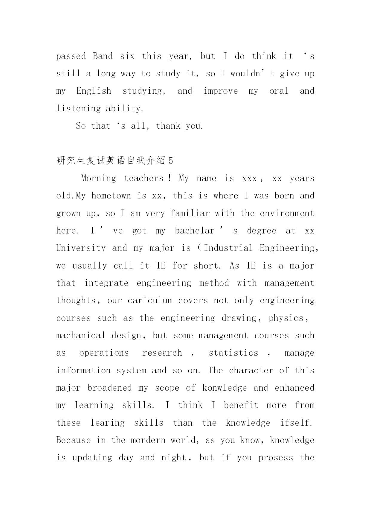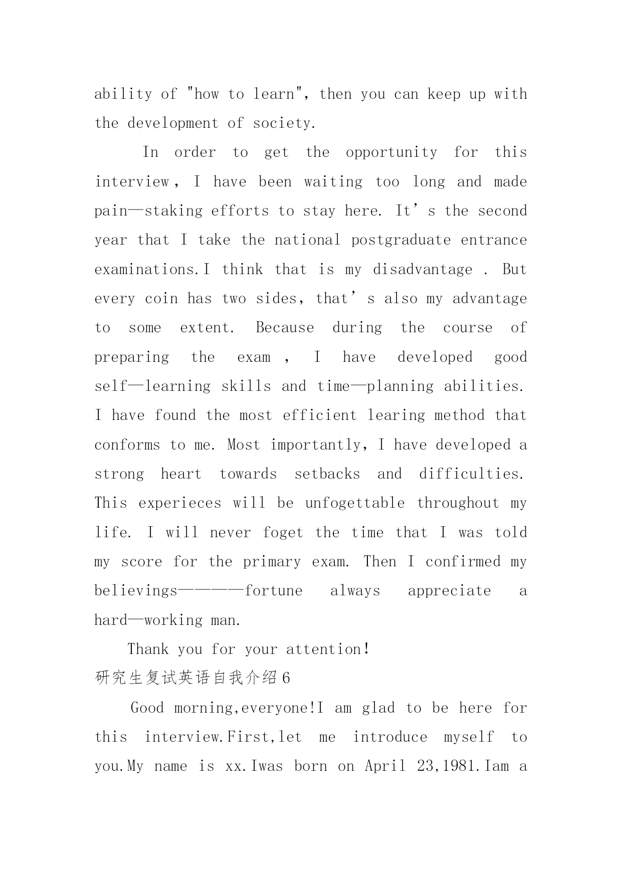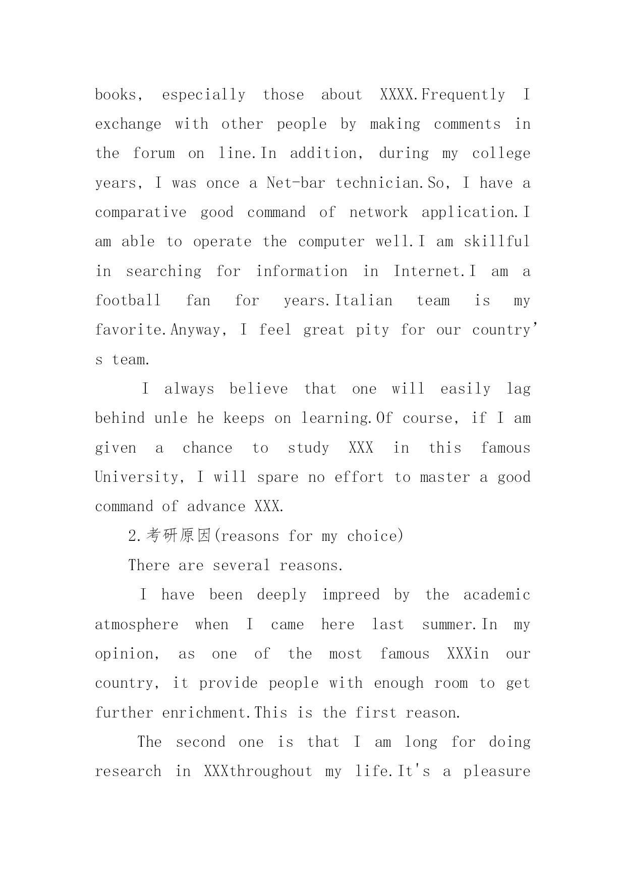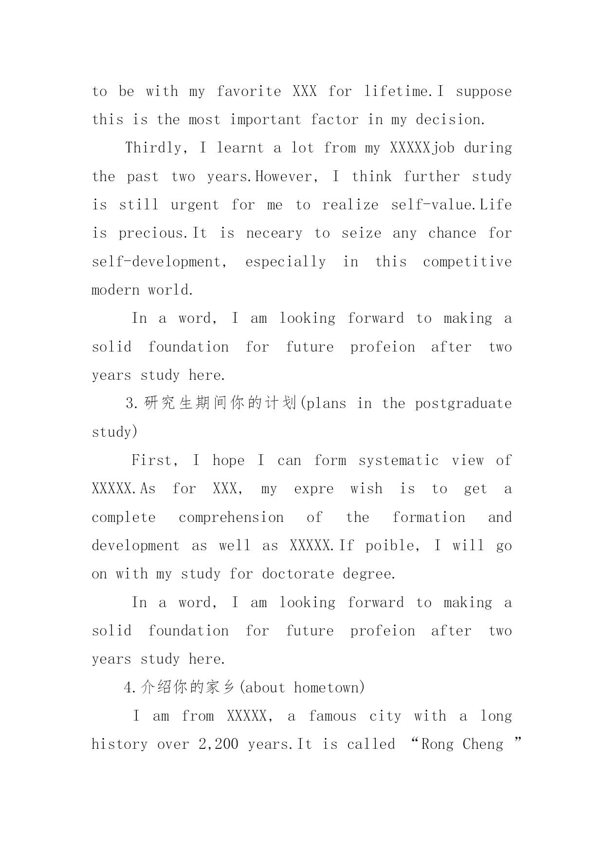 研究生复试英语自我介绍研究生复试英语自我介绍(15篇)当来到一个新环境时,时常要进行自我介绍,通过自我介绍可以得到他人的认可。现在你是否对自我介绍一筹莫展呢?以下是小编收集整理的研究生复试英语自我介绍,欢迎大家分享。研究生复试英语自我介绍11.自我介绍(self-introduce)Goodmorning.Iamgladtobehereforthisinterview.First,pleaseletmeintroducemyself.MynameisXXX,24.IcomefromXXX,thecapitalofXXXXProvince.IgraduatedfromtheXXXXdepartmentofXXXXXUniversityinJuly,20xx.InthepasttwoyearsIhavebeenpreparingforthepostgraduateexaminationwhileIhavebeenteachingXXXXXinNO.XXXXmiddleSchoolandIwasahead-teacherofaclainjuniorgradetwo.NowallmyhardworkhasgotaresultsinceIhaveachancetobeinterviewbyyou.Iamopen-minded,quickinthoughtandveryfondofhistory.Inmysparetime,Ihavebroadinterestslikemanyotheryoungers,suchasreadingbooks,especiallythoseaboutXXXX.FrequentlyIexchangewithotherpeoplebymakingcommentsintheforumonline.Inaddition,duringmycollegeyears,IwasonceaNet-bartechnician.So,Ihaveacomparativegoodcommandofnetworkapplication.Iamabletooperatethecomputerwell.IamskillfulinsearchingforinformationinInternet.Iamafootballfanforyears.Italianteamismyfavorite.Anyway,Ifeelgreatpityforourcountry’steam.Ialwaysbelievethatonewilleasilylagbehindunlehekeepsonlearning.Ofcourse,ifIamgivenachancetostudyXXXinthisfamousUniversity,IwillsparenoefforttomasteragoodcommandofadvanceXXX.2.考研原因(reasonsformychoice)Thereareseveralreasons.IhavebeendeeplyimpreedbytheacademicatmospherewhenIcameherelastsummer.Inmyopinion,asoneofthemostfamousXXXinourcountry,itprovidepeoplewithenoughroomtogetfurtherenrichment.Thisisthefirstreason.ThesecondoneisthatIamlongfordoingresearchinXXXthroughoutmylife.It'sapleasuretobewithmyfavoriteXXXforlifetime.Isupposethisisthemostimportantfactorinmydecision.Thirdly,IlearntalotfrommyXXXXXjobduringthepasttwoyears.However,Ithinkfurtherstudyisstillurgentformetorealizeself-value.Lifeisprecious.Itisnecearytoseizeanychanceforself-development,especiallyinthiscompetitivemodernworld.Inaword,Iamlookingforwardtomakingasolidfoundationforfutureprofeionaftertwoyearsstudyhere.3.研究生期间你的计划(plansinthepostgraduatestudy)First,IhopeIcanformsystematicview