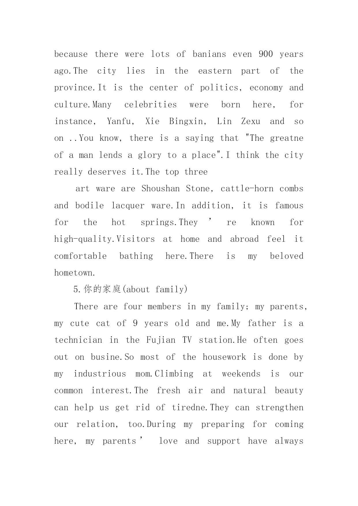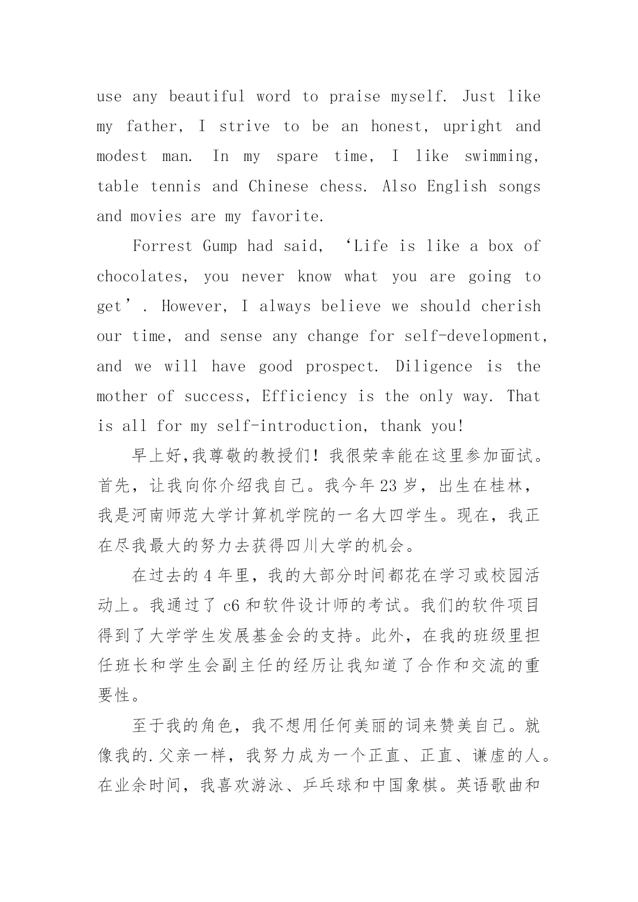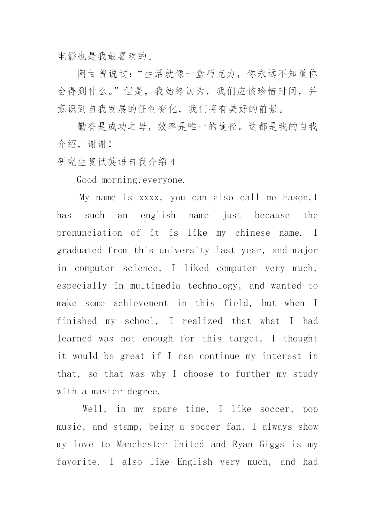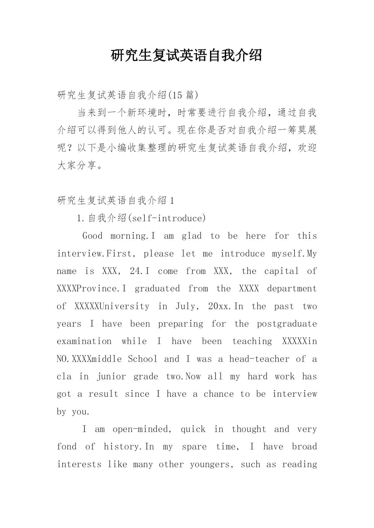研究生复试英语自我介绍研究生复试英语自我介绍(15篇)当来到一个新环境时,时常要进行自我介绍,通过自我介绍可以得到他人的认可。现在你是否对自我介绍一筹莫展呢?以下是小编收集整理的研究生复试英语自我介绍,欢迎大家分享。研究生复试英语自我介绍11.自我介绍(self-introduce)Goodmorning.Iamgladtobehereforthisinterview.First,pleaseletmeintroducemyself.MynameisXXX,24.IcomefromXXX,thecapitalofXXXXProvince.IgraduatedfromtheXXXXdepartmentofXXXXXUniversityinJuly,20xx.InthepasttwoyearsIhavebeenpreparingforthepostgraduateexaminationwhileIhavebeenteachingXXXXXinNO.XXXXmiddleSchoolandIwasahead-teacherofaclainjuniorgradetwo.NowallmyhardworkhasgotaresultsinceIhaveachancetobeinterviewbyyou.Iamopen-minded,quickinthoughtandveryfondofhistory.Inmysparetime,Ihavebroadinterestslikemanyotheryoungers,suchasreadingbooks,especiallythoseaboutXXXX.FrequentlyIexchangewithotherpeoplebymakingcommentsintheforumonline.Inaddition,duringmycollegeyears,IwasonceaNet-bartechnician.So,Ihaveacomparativegoodcommandofnetworkapplication.Iamabletooperatethecomputerwell.IamskillfulinsearchingforinformationinInternet.Iamafootballfanforyears.Italianteamismyfavorite.Anyway,Ifeelgreatpityforourcountry’steam.Ialwaysbelievethatonewilleasilylagbehindunlehekeepsonlearning.Ofcourse,ifIamgivenachancetostudyXXXinthisfamousUniversity,IwillsparenoefforttomasteragoodcommandofadvanceXXX.2.考研原因(reasonsformychoice)Thereareseveralreasons.IhavebeendeeplyimpreedbytheacademicatmospherewhenIcameherelastsummer.Inmyopinion,asoneofthemostfamousXXXinourcountry,itprovidepeoplewithenoughroomtogetfurtherenrichment.Thisisthefirstreason.ThesecondoneisthatIamlongfordoingresearchinXXXthroughoutmylife.It'sapleasuretobewithmyfavoriteXXXforlifetime.Isupposethisisthemostimportantfactorinmydecision.Thirdly,IlearntalotfrommyXXXXXjobduringthepasttwoyears.However,Ithinkfurtherstudyisstillurgentformetorealizeself-value.Lifeisprecious.Itisnecearytoseizeanychanceforself-development,especiallyinthiscompetitivemodernworld.Inaword,Iamlookingforwardtomakingasolidfoundationforfutureprofeionaftertwoyearsstudyhere.3.研究生期间你的计划(plansinthepostgraduatestudy)First,IhopeIcanformsystematicview