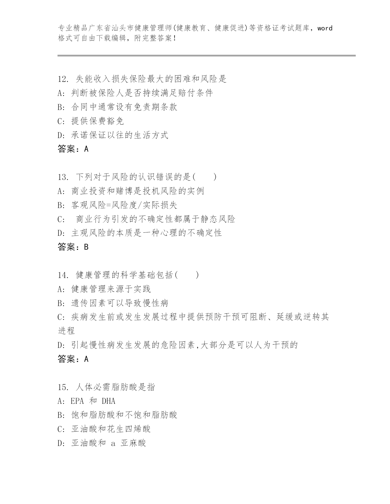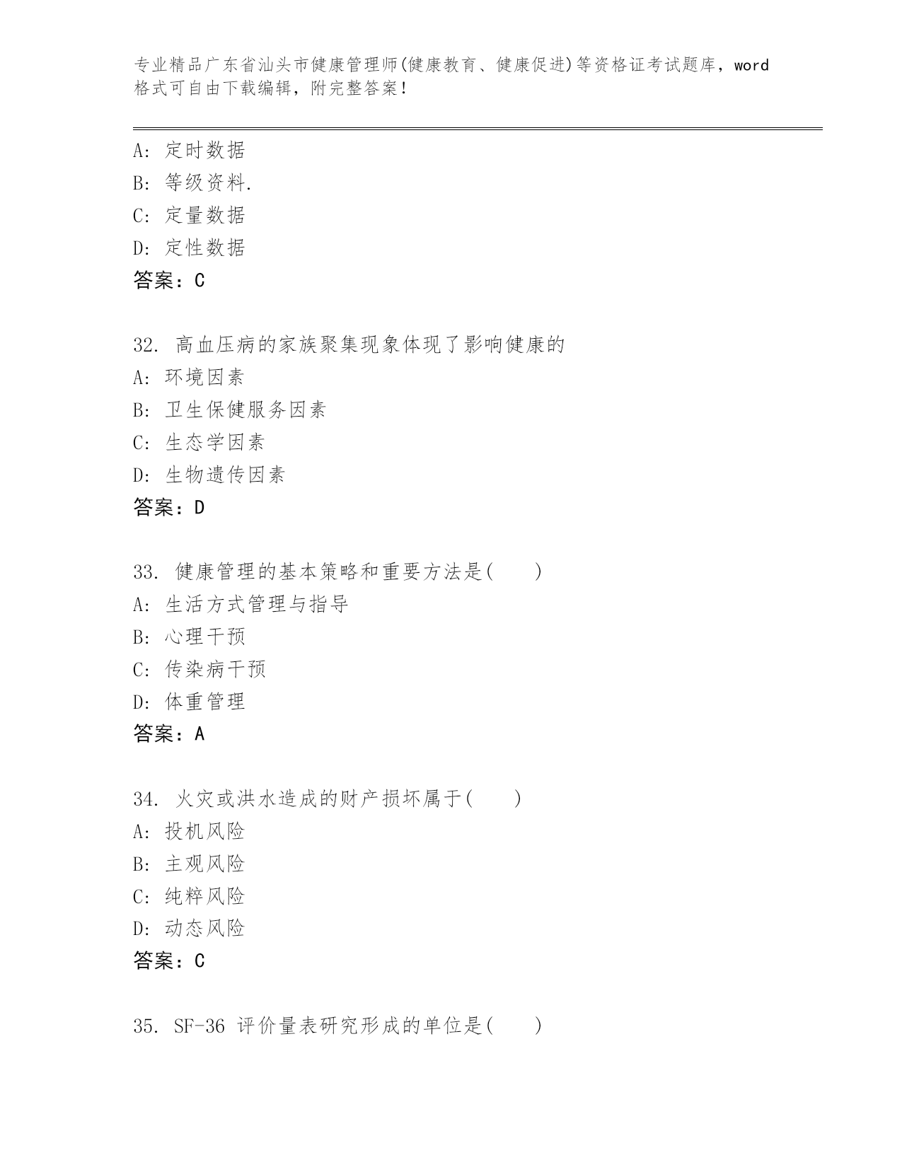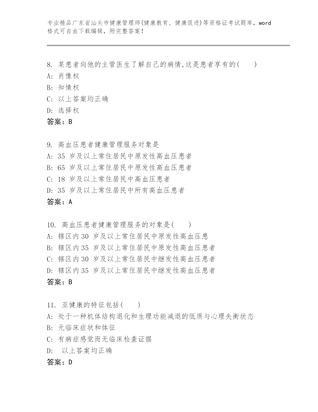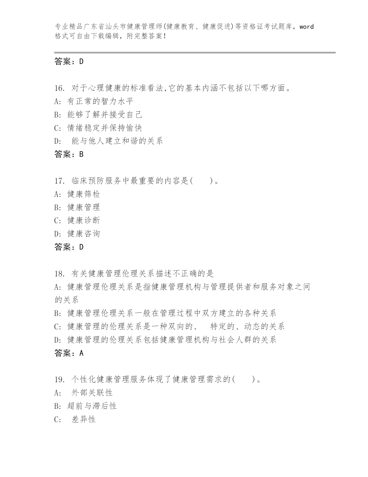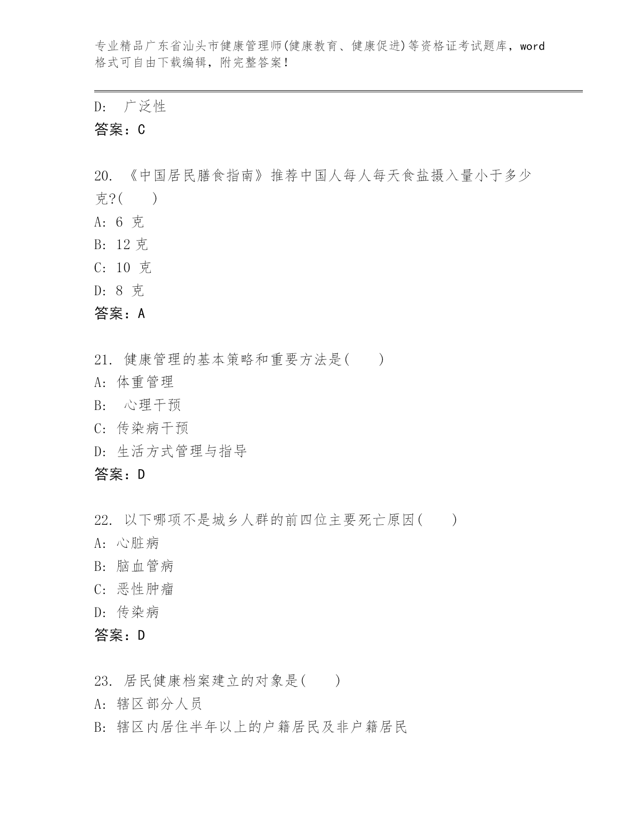 广东省汕头市健康管理师(健康教育、健康促进)等资格证考试内部题库及答案【新】