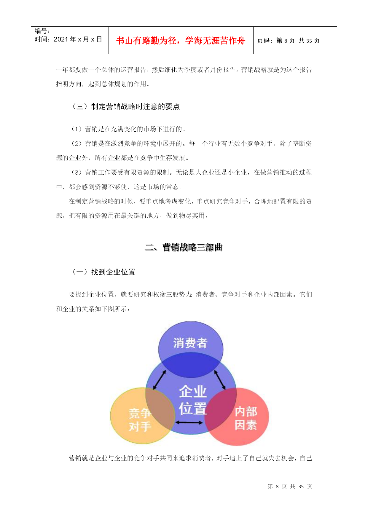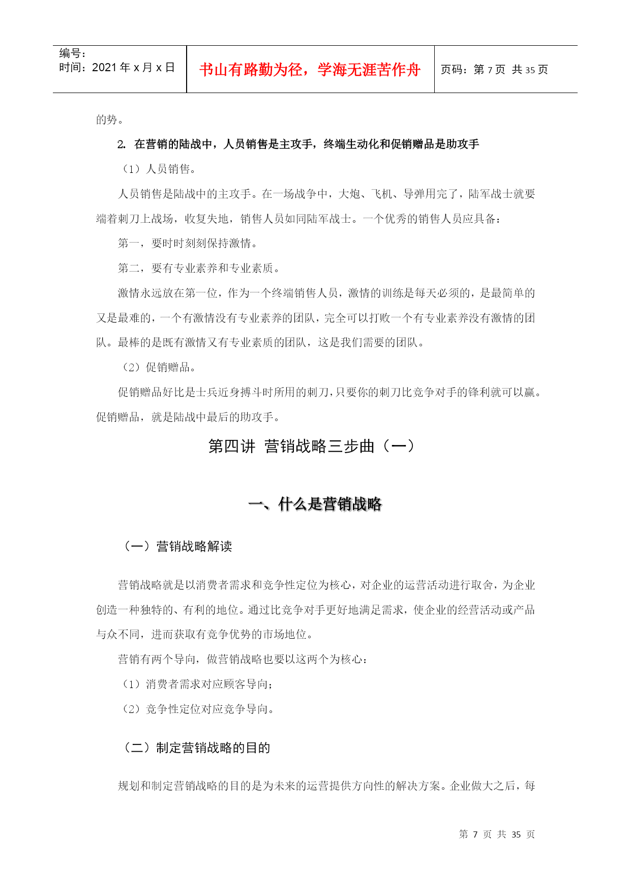 编号:时间:2021年x月x日书山有路勤为径,学海无涯苦作舟页码:第PAGE35页共NUMPAGES35页第PAGE\*MERGEFORMAT35页共NUMPAGES\*MERGEFORMAT35页第一讲市场营销的关键要素(上)一、洞悉消费者的需求——消费者买什么营销就是把东西卖给消费者,怎么能够把东西很快地卖给消费者?首先要研究消费者买什么,进而满足这个需求,就可以把产品以很好的方式卖给消费者。(一)消费者的需求心理分析法国路易•威登成本不足80元的手袋,卖价14666元,翻183倍;日本著名化妆品SKII成本不到8元的神仙水,卖价560元;麦当劳成本不到2元的汉堡,卖价10元钱。相反的,3元一笼的四川肉包,消费者还会讨价还价,为消费者付出了劳动、提供了服务,但是这些却并不值钱!消费者愿意花更多的钱来购买产品只有一个理由:是否提供了区别于别人的某种感受!正是这让消费者无法复制的感受,能比别人赚到几十倍甚至上百倍的利润。1.心理需求心理需求指的是虚荣心的需求。很多人买奢侈品牌是因为要证明给别人看:我不比别人差!虚荣心人皆有之,但是每个人满足心理需求的方式不一样,有的人买化妆品,有的人买服装,有的人买IT产品等。例如,在20、30年前,消费者去购买一台彩电时满足的是心理需求是我买一台彩电,我比别人厉害,旁观的邻居都跑我们家看彩电。现在消费者买家电,特别注重品牌,他们愿意买最贵的和进口的产品。2.生理需求生理需求是指实际的使用价值需求。这种购物需求的消费者追求的是产品的性价比,买实际价值的需求。当代消费者买彩电,已经不再追求虚荣心,而是更愿意满足生理需求,追求产品的性价比,在同一级别的一线品牌中,选择性价比比较高的产品。所以,今天的家电类产品,是为了满足消费者生理需求。作为家电的老板一定要明白,在这样的需求之下,要怎么做市场,定位在哪里?任何一个企业,做一款产品的时候,都要把这个最简单的问题想清楚,然后再去定位怎么去做。每一个消费者的身上都同时具备了买这两种需求的可能性,只不过每个人买不同类别的产品时,需求不一样。在做营销的时候,销售人员先要想明白消费者心理,对于某一特定产品,消费者更多会为虚荣心买单,会为性价比买单。不是所有的产品都可以卖得越贵越好,不是所有的产品做了品牌之后,就可以卖得越贵越好。(二)消费者的购买心理分析消费者的购买心理和他的需求心理有一定的差别,一般情况下,消费者的购买需求有以下两种。1.消费者购买的是他认为的事实消费者不是专家,面对琳琅满目的产品,他不知道如何正确判断产品的质量,但是他会在心里形成一个标准,买他认为质量好的产品、更时尚的品牌、性价比高的品牌,即使这种标准并不科学、准确。消费者买的是他认为的好的产品,但在很多时候“他的认为”与事实根本不相符,但是消费者依然会坚持自己的想法。比如空调的质量哪个品牌的最好,有的人认为是格力,有的人认为三菱。其实,中国空调没有核心技术,压缩机都是从日本进口的,曾经有一个品牌叫华凌(后来被美的兼并),很多空调的技术工人都是从那里培训出来的,做空调的人都知道华凌的生产能力,华凌的技术、工人的组装能力,是非常优秀的,但是有很少有人听说过这个品牌,也不会去买,但如果你熟悉这个行业,你就可能去买,但是普通消费者去购买的全部都是自己认为的。所以,对于企业来说,关键的不是你认为产品好不好,而是消费者认为好不好,你怎么让消费者认为你的产品好,这就需要你对消费者进行不断地传播,与他进行沟通,这是营销要做的工作。2.消费者购买的是占便宜满足感消费者购买不是买便宜的产品,而是买占便宜的产品,这是人性的弱点。产品卖得便宜,消费者可能认为,这产品不是好东西,要不你怎么能卖这么便宜?有竞争对手再散布点言论,那消费者就更不买。其实消费者买的是占到便宜,这就是为什么商场搞活动、打折的时候就会有人山人海的现象,就是迎合了消费者的占便宜心理。在营销工作中,要无时无刻的经常性的让消费者感觉,买你的东西占到便宜了,所以营销要有促销的设计,要经常性的让你的目标顾客感觉占到便宜,你才能够把产品卖好。在美国,促销在推广中的预算是越来越大。因为即便是买奢侈品牌的人、不在乎钱的人也希望找打折的季节去买;买非常名贵的表,不在大陆买,要跑到外面去买,这些都是为了占便宜,占便宜会让人有一种满足感,这和在小店砍价是一个道理。第二讲市场营销的关键要素(中)二、什么是营销(一)营销概念解读营销首先是传播、沟通、经营人心,酒好也怕巷子深。只会做不会忽悠是傻把式;只会忽悠不会做,那是假把式;一半做得好,一半忽悠得好,叫真把式。一个优秀的企业,一定是产品做得不错,忽悠的更不错的企业。从这个意义上说,营销是很简单的事,就是卖东西给别人来获取利润,但首