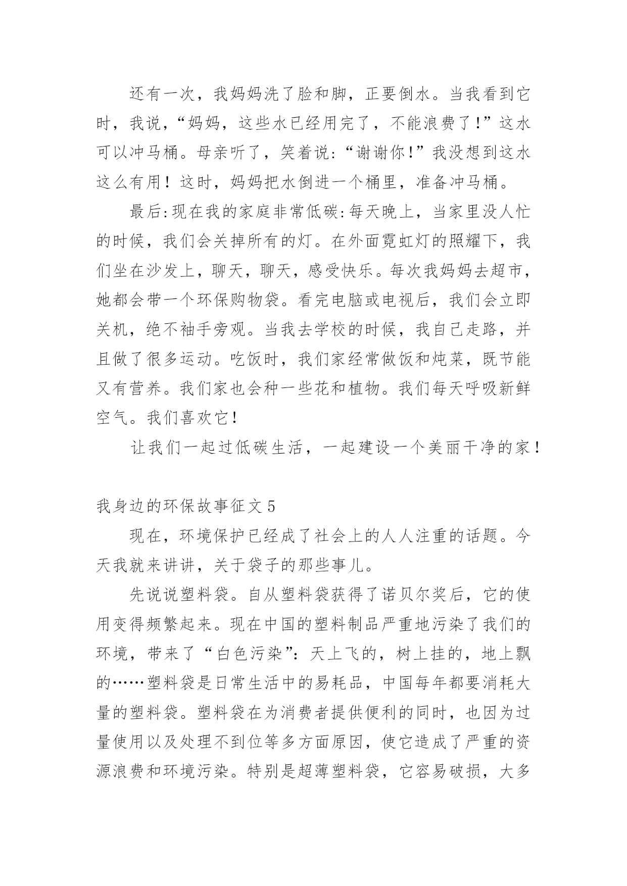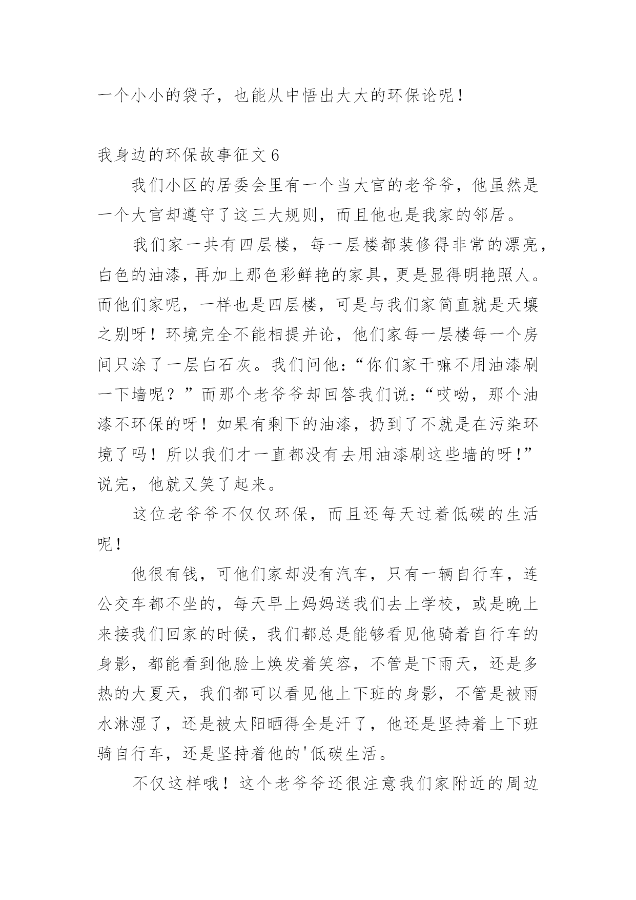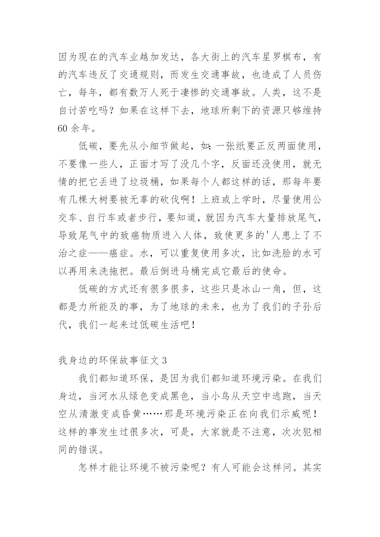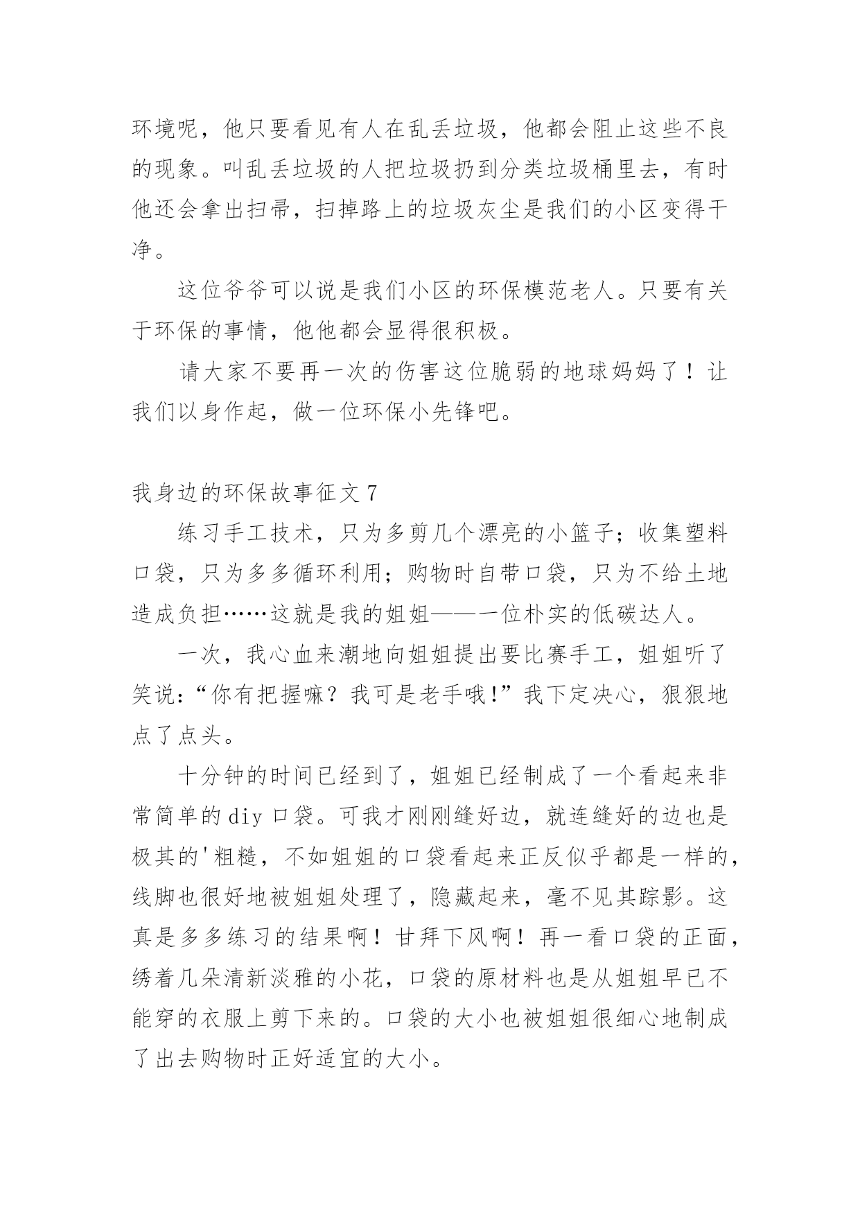 我身边的环保故事征文1我身边的环保故事征文在日常生活或是工作学习中,说到征文,大家肯定都不陌生吧,借助征文人们可以反映客观事物、表达思想感情、传递知识信息。相信很多朋友都对写征文感到非常苦恼吧,下面是小编为大家整理的我身边的环保故事征文,仅供参考,欢迎大家阅读。我身边的环保故事征文1我身边就有一位用自己的行动来证明她对环保极其重视的人,她就是我的妈妈。她的理念一直都是低碳环保,什么东西都要留着,看看什么地方能用上,如果确定没用了,才会扔掉。在家里也总是能看到两个垃圾袋,一个放可回收的,一个放不可回收的'。有一次,我随手把一个塑料瓶扔进了不可回收袋里,正好被妈妈瞧见,没想到平时一直和我说笑的她也严肃了起来,“塑料瓶可回收,不能扔在这里。”我不以为然的说:“不就仍错一次吗,没关系!”妈妈严厉地说:“环保可不是小事,就是有这么多像你一样不重视的人,资源才会急剧减少,唉!”说到这儿,她竟长叹一口气,我只好把瓶子扔到可回收袋里。上周我去上钢琴课时,正准备叫爸爸送我去,妈妈却又发话了:“这么点路还要坐车,走过去!”妈妈的神情是那么的不容置疑,我突然灵光一闪,节能减排,低碳环保呀!于是,我每周都走路或者骑自行车去上课。为环保出一份力,果然很快乐,也难怪妈妈如此注重环保,一举两得嘛。地球上的资源是有限的,无节制的使用下去,灾难总会降临的。节约一点就是造福子孙后代,我也要像妈妈一样,做个低碳达人!我身边的环保故事征文2地球,本来是一个美丽、富饶、资源丰富的宇宙中唯一一个有生命存在的星球。许许多多的生命在这颗星球上繁衍、生息,过着幸福的生活。而现在,因为人类的过度开采资源,这颗美丽的星球已经被折磨得痛苦不堪。本该属于鸟儿们的大森林,变成了一片人烟稀少的荒地;任鸟儿自由飞翔的蔚蓝色天空,已经被化工厂的烟囱排放的乌黑浓烟夺去了鲜艳的色彩。鱼儿们的生息地小河、溪流、江河、大海,一部分也已经被那黄绿的工业废水污染。就因为森林被大量砍伐,造成了许多地区沙尘暴越发增多;就因为人们的物质生活条件越来越好,造成了全球气候变暖,极地冰川消融,数年后许多国家和地区面临着下沉于海洋的危险;就因为海洋等许多湖泊被污染,造成了许多国家数年沉浸在缺水的环境中;与此同时,人类也在过度开采中受到了严厉的处罚:因为过度开采某地区的资源,许多被开采的地区发生了严重的自然灾害,造成了过多的人员伤亡;因为现在的汽车业越加发达,各大街上的汽车星罗棋布,有的汽车违反了交通规则,而发生交通事故,也造成了人员伤亡,每年,都有数万人死于凄惨的交通事故。人类,这不是自讨苦吃吗?如果在这样下去,地球所剩下的资源只够维持60余年。低碳,要先从小细节做起,如:一张纸要正反两面使用,不要像一些人,正面才写了没几个字,反面还没使用,就无情的把它丢进了垃圾桶,如果每个人都这样的话,那每年要有几棵大树要被无辜的砍伐啊!上班或上学时,尽量使用公交车、自行车或者步行,要知道,就因为汽车大量排放尾气,导致尾气中的致癌物质进入人体,致使更多的'人患上了不治之症——癌症。水,可以重复使用多次,比如洗脸的水可以再用来洗拖把。最后倒进马桶完成它最后的使命。低碳的方式还有很多很多,这些只是冰山一角,但,这都是力所能及的事,为了地球的未来,也为了我们的子孙后代,我们一起来过低碳生活吧!我身边的环保故事征文3我们都知道环保,是因为我们都知道环境污染。在我们身边,当河水从绿色变成黑色,当小鸟从天空中逃跑,当天空从清澈变成昏黄……那是环境污染正在向我们示威呢!这样的事发生过很多次,可是,大家就是不注意,次次犯相同的错误。怎样才能让环境不被污染呢?有人可能会这样问。其实很简单,就是我们每个人从身边做起,从自己做起,只要我们不乱扔拉圾、废纸,只要我们大家一起提倡环保,只要每个人都有环保的愿望,那么,总有一天,河水会变成绿色,小鸟会欢乐地歌唱,天空也会变得清澈。在我的老家江苏,广阔的平原上河流纵横,但是,河里有一种植物,叫做水葫芦。长起来是一大堆一大堆的,常常造成河道堵塞。爷爷告诉我,他小时候可以在河里游泳,现在,不但看不到游泳的人了,而且,许多地方水葫芦像被子一样盖着河水,连河水都看不见了。据说,水葫芦是从南美洲引进来的,它长在中国的花园里,后来就“逃”到了河流中,如果让它们疯狂地生长,我想,或许有一天整个中国的河流都会水泄不通。如果我们能把它们都清除了,那么,河流就会重新变得干净清洁,我们也可以在河里游泳了。在我家里,爸爸喜欢抽烟,每次烟飘荡在房间里的时候,满屋子都是呛人的味道,有时眼睛都睁不开。我想对那些爱抽烟的人说:“抽烟害人害己,同时,也害环境。”大家想想,如果一个城市的人全都在抽烟的话,那么,这个城市就会有一股子怪味,人们怎么生活啊?比抽烟更加厉害的有毒气体,是汽车尾气。当一辆辆汽车快速向前行驶时,将刺鼻的黑气喷到空气中,它