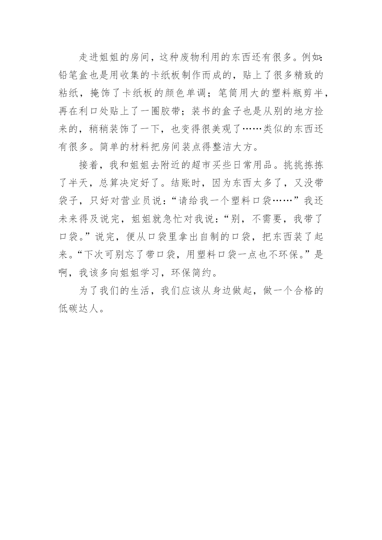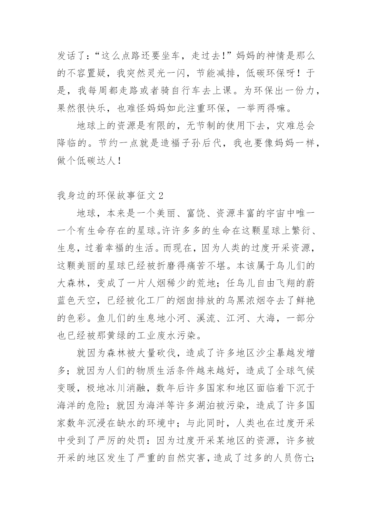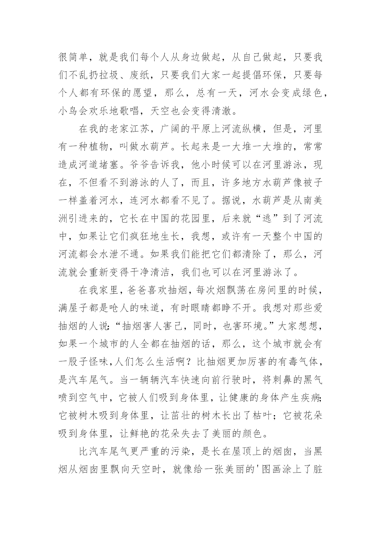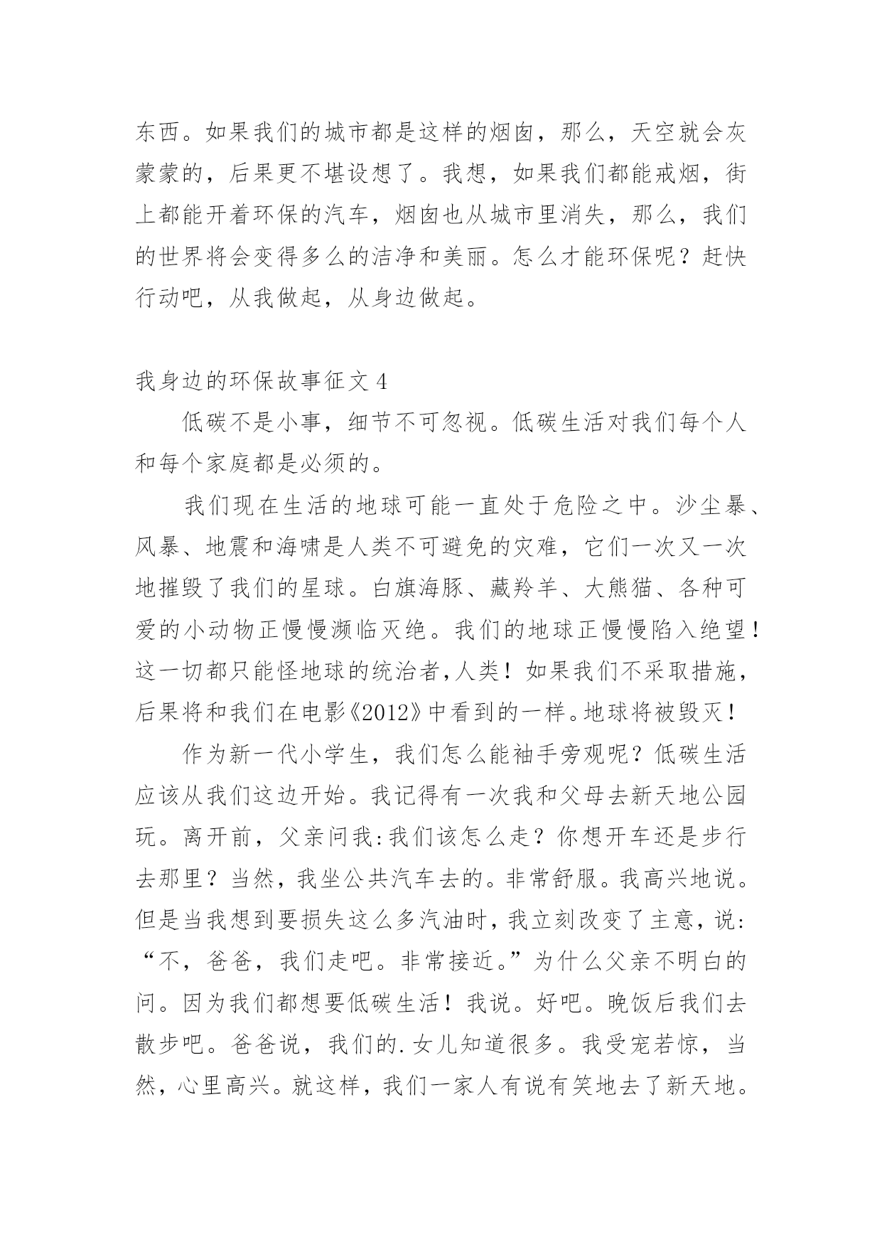 我身边的环保故事征文1我身边的环保故事征文在日常生活或是工作学习中,说到征文,大家肯定都不陌生吧,借助征文人们可以反映客观事物、表达思想感情、传递知识信息。相信很多朋友都对写征文感到非常苦恼吧,下面是小编为大家整理的我身边的环保故事征文,仅供参考,欢迎大家阅读。我身边的环保故事征文1我身边就有一位用自己的行动来证明她对环保极其重视的人,她就是我的妈妈。她的理念一直都是低碳环保,什么东西都要留着,看看什么地方能用上,如果确定没用了,才会扔掉。在家里也总是能看到两个垃圾袋,一个放可回收的,一个放不可回收的'。有一次,我随手把一个塑料瓶扔进了不可回收袋里,正好被妈妈瞧见,没想到平时一直和我说笑的她也严肃了起来,“塑料瓶可回收,不能扔在这里。”我不以为然的说:“不就仍错一次吗,没关系!”妈妈严厉地说:“环保可不是小事,就是有这么多像你一样不重视的人,资源才会急剧减少,唉!”说到这儿,她竟长叹一口气,我只好把瓶子扔到可回收袋里。上周我去上钢琴课时,正准备叫爸爸送我去,妈妈却又发话了:“这么点路还要坐车,走过去!”妈妈的神情是那么的不容置疑,我突然灵光一闪,节能减排,低碳环保呀!于是,我每周都走路或者骑自行车去上课。为环保出一份力,果然很快乐,也难怪妈妈如此注重环保,一举两得嘛。地球上的资源是有限的,无节制的使用下去,灾难总会降临的。节约一点就是造福子孙后代,我也要像妈妈一样,做个低碳达人!我身边的环保故事征文2地球,本来是一个美丽、富饶、资源丰富的宇宙中唯一一个有生命存在的星球。许许多多的生命在这颗星球上繁衍、生息,过着幸福的生活。而现在,因为人类的过度开采资源,这颗美丽的星球已经被折磨得痛苦不堪。本该属于鸟儿们的大森林,变成了一片人烟稀少的荒地;任鸟儿自由飞翔的蔚蓝色天空,已经被化工厂的烟囱排放的乌黑浓烟夺去了鲜艳的色彩。鱼儿们的生息地小河、溪流、江河、大海,一部分也已经被那黄绿的工业废水污染。就因为森林被大量砍伐,造成了许多地区沙尘暴越发增多;就因为人们的物质生活条件越来越好,造成了全球气候变暖,极地冰川消融,数年后许多国家和地区面临着下沉于海洋的危险;就因为海洋等许多湖泊被污染,造成了许多国家数年沉浸在缺水的环境中;与此同时,人类也在过度开采中受到了严厉的处罚:因为过度开采某地区的资源,许多被开采的地区发生了严重的自然灾害,造成了过多的人员伤亡;因为现在的汽车业越加发达,各大街上的汽车星罗棋布,有的汽车违反了交通规则,而发生交通事故,也造成了人员伤亡,每年,都有数万人死于凄惨的交通事故。人类,这不是自讨苦吃吗?如果在这样下去,地球所剩下的资源只够维持60余年。低碳,要先从小细节做起,如:一张纸要正反两面使用,不要像一些人,正面才写了没几个字,反面还没使用,就无情的把它丢进了垃圾桶,如果每个人都这样的话,那每年要有几棵大树要被无辜的砍伐啊!上班或上学时,尽量使用公交车、自行车或者步行,要知道,就因为汽车大量排放尾气,导致尾气中的致癌物质进入人体,致使更多的'人患上了不治之症——癌症。水,可以重复使用多次,比如洗脸的水可以再用来洗拖把。最后倒进马桶完成它最后的使命。低碳的方式还有很多很多,这些只是冰山一角,但,这都是力所能及的事,为了地球的未来,也为了我们的子孙后代,我们一起来过低碳生活吧!我身边的环保故事征文3我们都知道环保,是因为我们都知道环境污染。在我们身边,当河水从绿色变成黑色,当小鸟从天空中逃跑,当天空从清澈变成昏黄……那是环境污染正在向我们示威呢!这样的事发生过很多次,可是,大家就是不注意,次次犯相同的错误。怎样才能让环境不被污染呢?有人可能会这样问。其实很简单,就是我们每个人从身边做起,从自己做起,只要我们不乱扔拉圾、废纸,只要我们大家一起提倡环保,只要每个人都有环保的愿望,那么,总有一天,河水会变成绿色,小鸟会欢乐地歌唱,天空也会变得清澈。在我的老家江苏,广阔的平原上河流纵横,但是,河里有一种植物,叫做水葫芦。长起来是一大堆一大堆的,常常造成河道堵塞。爷爷告诉我,他小时候可以在河里游泳,现在,不但看不到游泳的人了,而且,许多地方水葫芦像被子一样盖着河水,连河水都看不见了。据说,水葫芦是从南美洲引进来的,它长在中国的花园里,后来就“逃”到了河流中,如果让它们疯狂地生长,我想,或许有一天整个中国的河流都会水泄不通。如果我们能把它们都清除了,那么,河流就会重新变得干净清洁,我们也可以在河里游泳了。在我家里,爸爸喜欢抽烟,每次烟飘荡在房间里的时候,满屋子都是呛人的味道,有时眼睛都睁不开。我想对那些爱抽烟的人说:“抽烟害人害己,同时,也害环境。”大家想想,如果一个城市的人全都在抽烟的话,那么,这个城市就会有一股子怪味,人们怎么生活啊?比抽烟更加厉害的有毒气体,是汽车尾气。当一辆辆汽车快速向前行驶时,将刺鼻的黑气喷到空气中,它