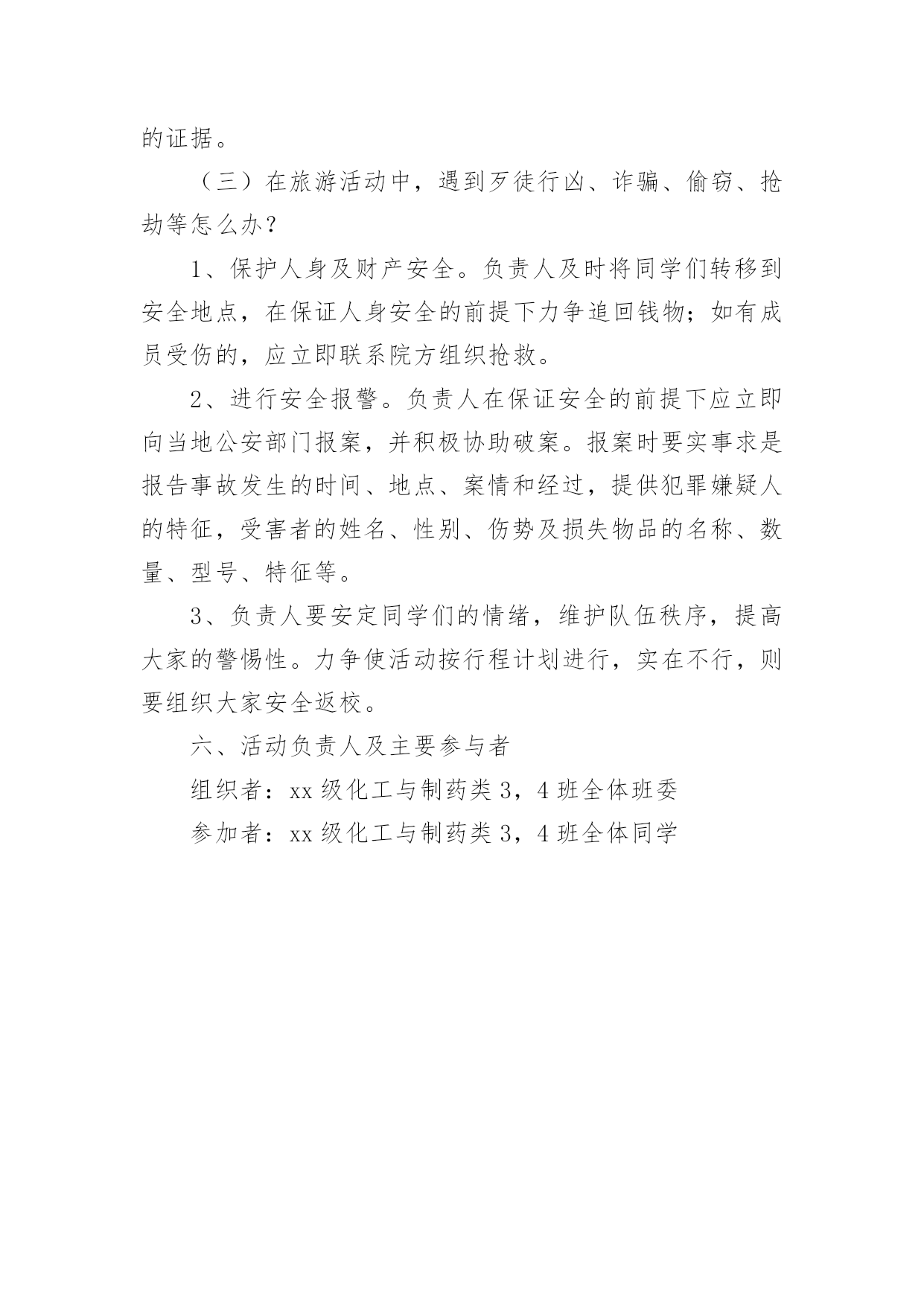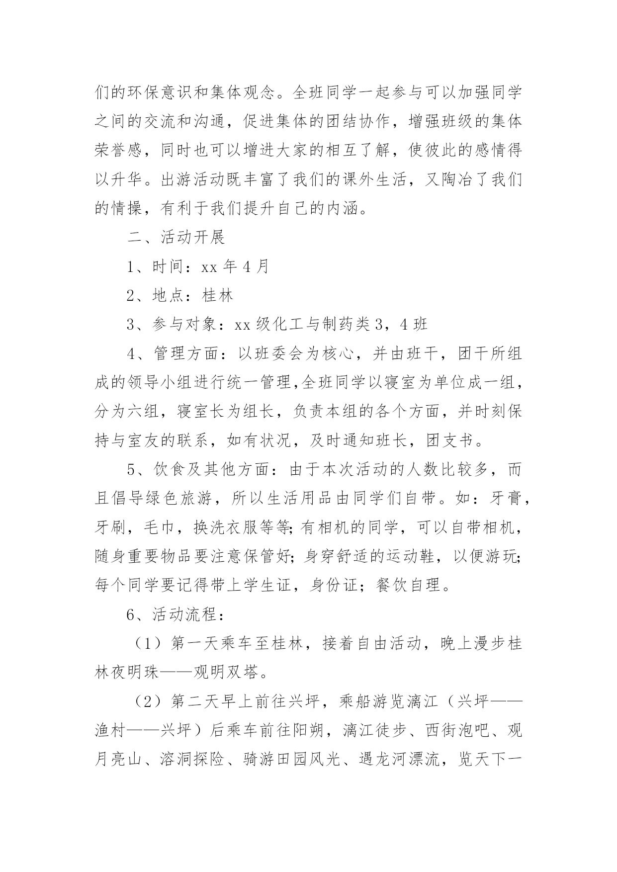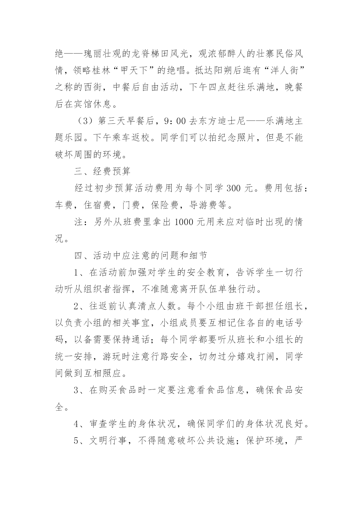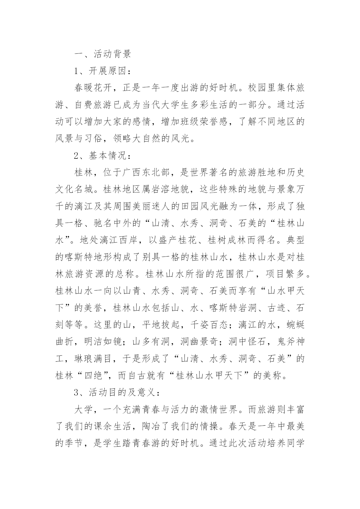 桂林旅游计划书桂林旅游计划书日子如同白驹过隙,成绩已属于过去,新一轮的工作即将来临,不妨坐下来好好写写计划吧。相信大家又在为写计划犯愁了吧?下面是小编为大家收集的桂林旅游计划书,供大家参考借鉴,希望可以帮助到有需要的朋友。旅游早已经成为我们生活中一项必不可少的活动了,在经济大发展的前提下,越来越多的人选择在空闲的时间参加旅游活动。这些都是促进我们国家经济再发展的重要途径,也是扩大内需,提高人们生活的必要措施。随着我校各设施的不断完善,同学们的课余生活也变得更为丰富。校内的各种社团都在开展丰富多彩的校园活动,虽然极大的丰富了同学们的学习和生活,但面对当今的就业形势以及无处不在的竞争压力,理智的思考过后我们知道象牙塔内的安逸与多彩丰满不了我们的羽翼,我们真正所需要的是增加对社会的了解与认知,不断丰富自身的知识储备、扩大视野是理论与实际更好的结合,为进入社会做更多的准备。纵观目前校园内所开展的'各项活动,多偏向于理论性,其实质则是缺少与外界联系的机会。我们班所要开展的桂林旅游这一活动为了拉近大学生与大自然的距离,拓展大学生的视野,为大学生了解大自然、走进大自然提供了一个平台。让同学们有机会走出校园走进大自然。一、活动背景1、开展原因:春暖花开,正是一年一度出游的好时机。校园里集体旅游、自费旅游已成为当代大学生多彩生活的一部分。通过活动可以增加大家的感情,增加班级荣誉感,了解不同地区的风景与习俗,领略大自然的风光。2、基本情况:桂林,位于广西东北部,是世界著名的旅游胜地和历史文化名城。桂林地区属岩溶地貌,这些特殊的地貌与景象万千的漓江及其周围美丽迷人的田园风光融为一体,形成了独具一格、驰名中外的“山清、水秀、洞奇、石美的“桂林山水”。地处漓江西岸,以盛产桂花、桂树成林而得名。典型的喀斯特地形构成了别具一格的桂林山水,桂林山水是对桂林旅游资源的总称。桂林山水所指的范围很广,项目繁多。桂林山水一向以山青、水秀、洞奇、石美而享有“山水甲天下”的美誉,桂林山水包括山、水、喀斯特岩洞、古迹、石刻等等。这里的山,平地拔起,千姿百态;漓江的水,蜿蜒曲折,明洁如镜;山多有洞,洞幽景奇;洞中怪石,鬼斧神工,琳琅满目,于是形成了“山清、水秀、洞奇、石美”的桂林“四绝”,而自古就有“桂林山水甲天下”的美称。3、活动目的及意义:大学,一个充满青春与活力的激情世界。而旅游则丰富了我们的课余生活,陶冶了我们的情操。春天是一年中最美的季节,是学生踏青春游的好时机。通过此次活动培养同学们的环保意识和集体观念。全班同学一起参与可以加强同学之间的交流和沟通,促进集体的团结协作,增强班级的集体荣誉感,同时也可以增进大家的相互了解,使彼此的感情得以升华。出游活动既丰富了我们的课外生活,又陶冶了我们的情操,有利于我们提升自己的内涵。二、活动开展1、时间:xx年4月2、地点:桂林3、参与对象:xx级化工与制药类3,4班4、管理方面:以班委会为核心,并由班干,团干所组成的领导小组进行统一管理,全班同学以寝室为单位成一组,分为六组,寝室长为组长,负责本组的各个方面,并时刻保持与室友的联系,如有状况,及时通知班长,团支书。5、饮食及其他方面:由于本次活动的人数比较多,而且倡导绿色旅游,所以生活用品由同学们自带。如:牙膏,牙刷,毛巾,换洗衣服等等;有相机的同学,可以自带相机,随身重要物品要注意保管好;身穿舒适的运动鞋,以便游玩;每个同学要记得带上学生证,身份证;餐饮自理。6、活动流程:(1)第一天乘车至桂林,接着自由活动,晚上漫步桂林夜明珠——观明双塔。(2)第二天早上前往兴坪,乘船游览漓江(兴坪——渔村——兴坪)后乘车前往阳朔,漓江徒步、西街泡吧、观月亮山、溶洞探险、骑游田园风光、遇龙河漂流,览天下一绝——瑰丽壮观的龙脊梯田风光,观浓郁醉人的壮寨民俗风情,领略桂林“甲天下”的绝唱。抵达阳朔后逛有“洋人街”之称的西街,中餐后自由活动,下午四点赶往乐满地,晚餐后在宾馆休息。(3)第三天早餐后,9:00去东方迪士尼——乐满地主题乐园。下午乘车返校。同学们可以拍纪念照片,但是不能破坏周围的环境。三、经费预算经过初步预算活动费用为每个同学300元。费用包括:车费,住宿费,门费,保险费,导游费等。注:另外从班费里拿出1000元用来应对临时出现的情况。四、活动中应注意的问题和细节1、在活动前加强对学生的安全教育,告诉学生一切行动听从组织者指挥,不准随意离开队伍单独行动。2、往返前认真清点人数。每个小组由班干部担任组长,以负责小组的相关事宜,小组成员要互相记住各自的电话号码,以备需要保持通话;每个同学都要听从班长和小组长的统一安排,游玩时注意行路安全,切勿过分嬉戏打闹,同学间做到互相照应。3、在购买食品时一定要注意看食品信息,确保食品安全。4、审查学生的身体状况,确保同学们的身体状况良好。5、文