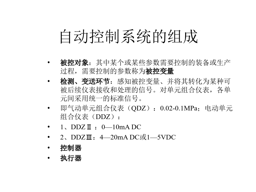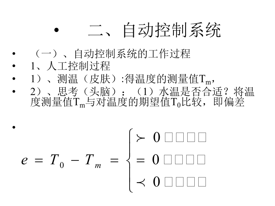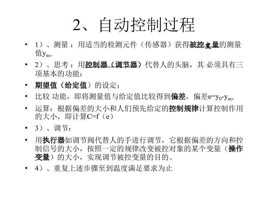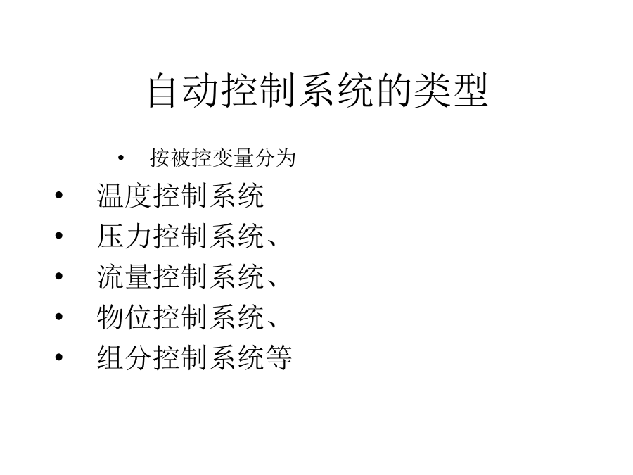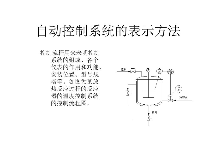 第一章自动控制系统基本概念二、自动控制系统2)、怎么办?即怎么调?调多少?3)、调节(手):根据思考的结果,调节响应阀门。4)、重复上述步骤至到温度满足要求为止。2、自动控制过程自动控制系统的组成自动控制系统的表示方法控制流程图方框图自动控制系统的类型自动控制系统的类型自动控制系统的类型自动控制系统的类型自动控制系统的类型自动控制系统的类型自动控制系统的类型自动控制系统的品质指标自动控制系统的品质指标自动控制系统的品质指标