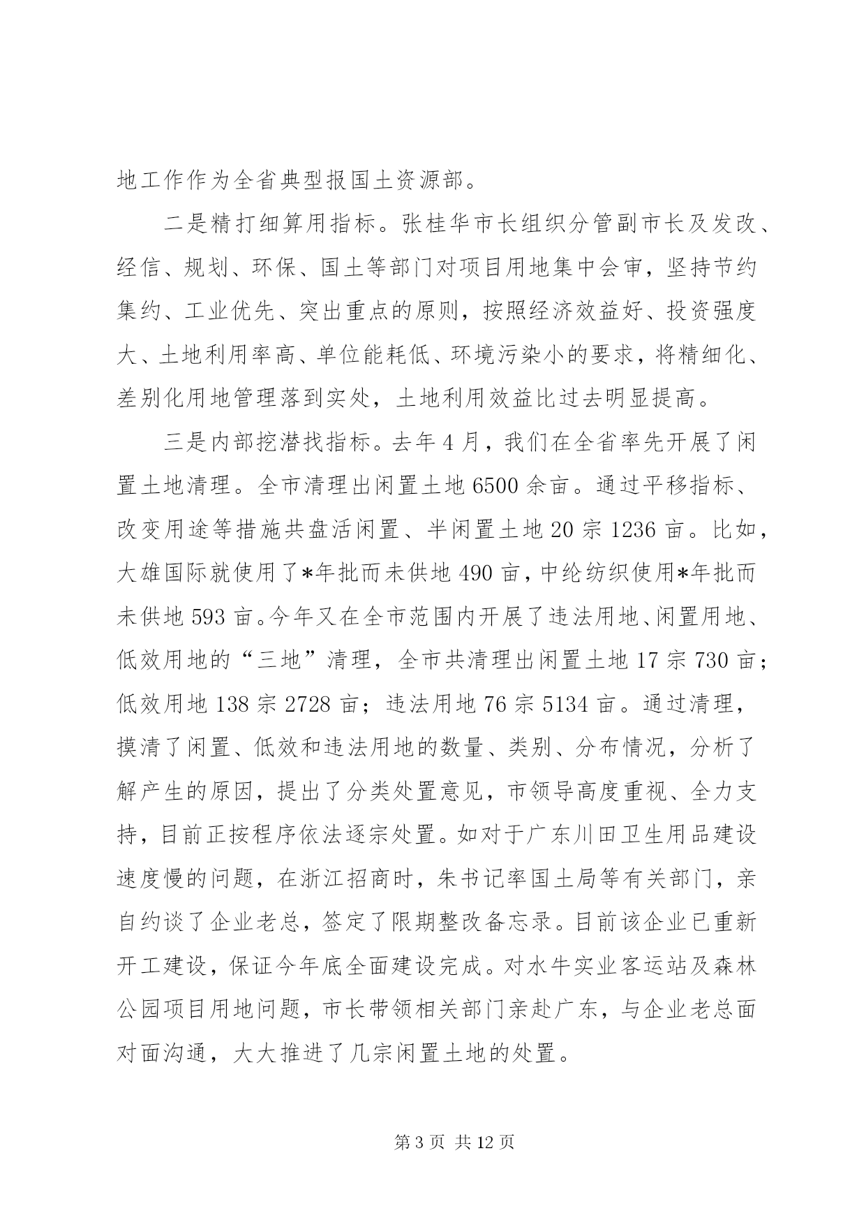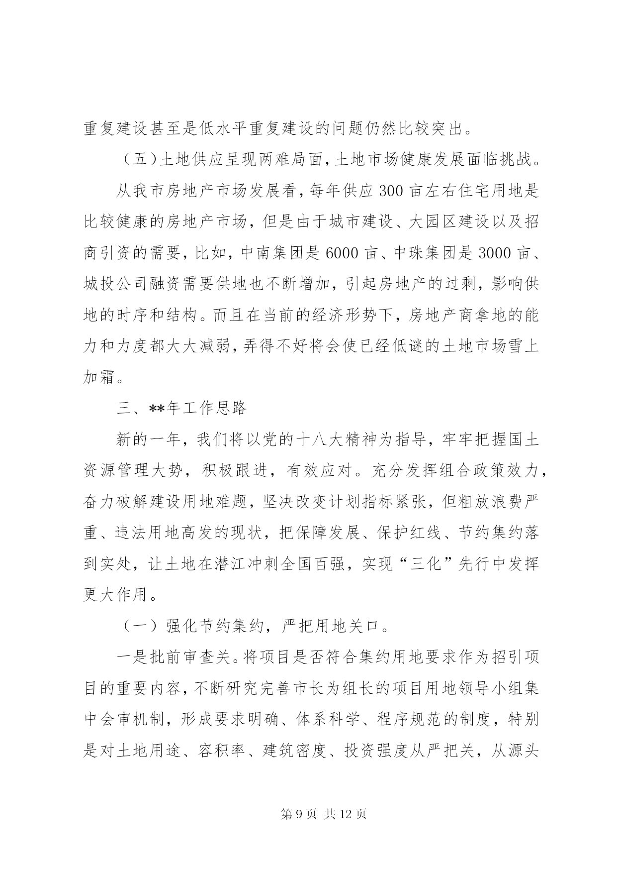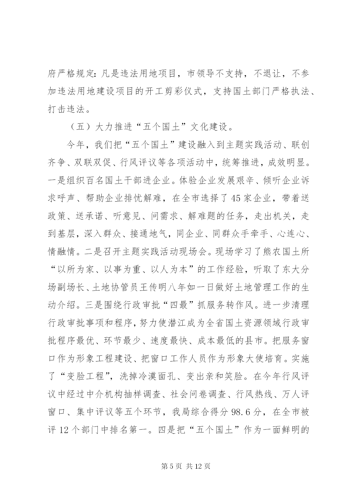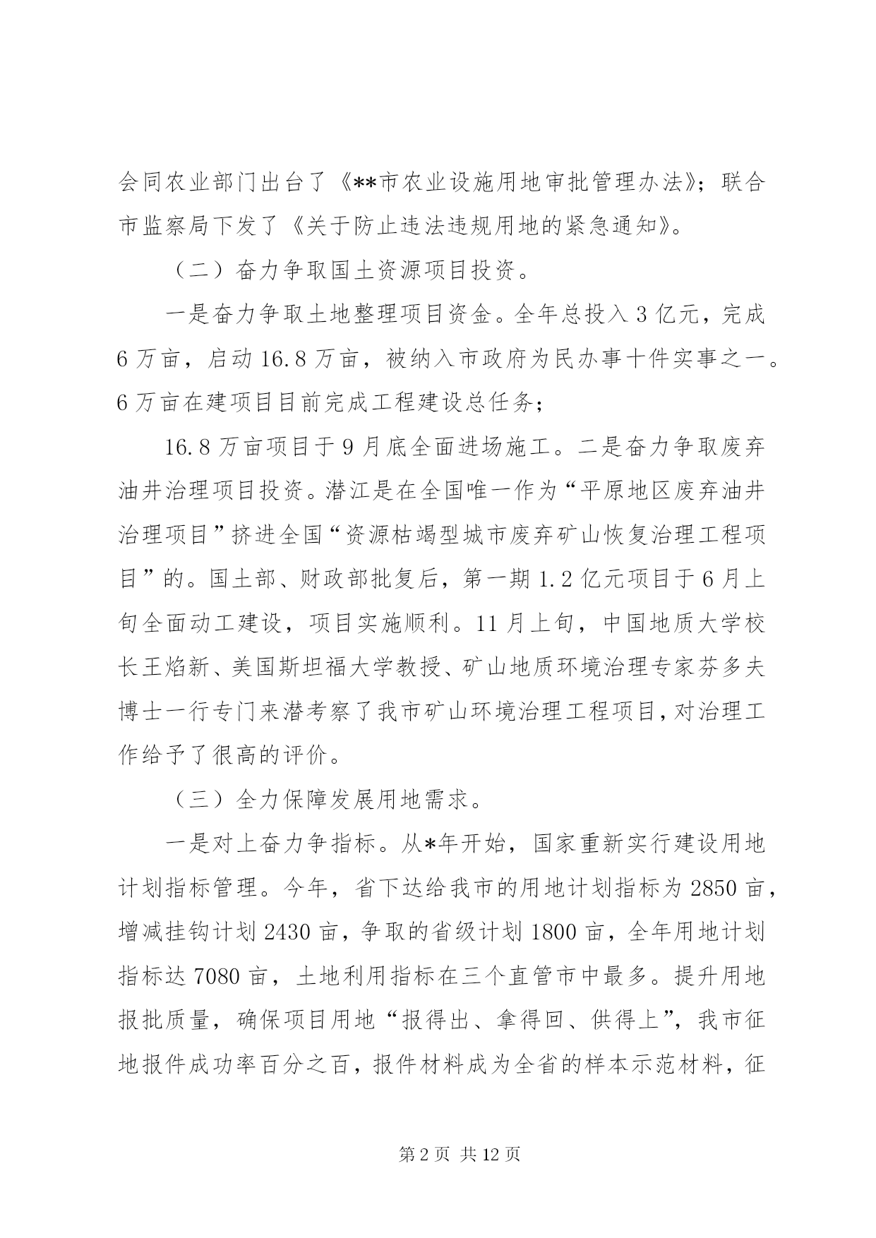 第PAGE\*Arabic\*MERGEFORMAT12页共NUMPAGES\*MERGEFORMAT12页市国土资源局工作总结市国土资源局年度工作总结和下一年工作计划今年来,我局系统干部职工积极投身“争创新业绩”主题实践活动,参与全市“强化投资建设年”和“深化治庸问责年”活动。落实好窗口服务、治庸问责、党建先锋、国土文化四个有形抓手,创新突破,激情作为,为服务和保障潜江“三化”先行区建设提供了强有力的土地资源支撑和服务保障。一、**年工作情况(一)努力构建国土资源管理新格局。我们认真学习贯彻中央领导同志就国土资源管理重要讲话精神并结合实际,特别是在“党委领导、政府负责、部门协调、公众参与、上下联动”的实现形式上进行了一些探索。一是市委高度重视,成立了由市委书记朱汉桥为组长、市长为常务副组长的市国土资源工作领导小组。同时,市委支持市国土资源局与市委党校合作共建“**市领导干部国土资源管理教育培训基地”,并在市委党校挂牌,土地利用管理纳入市委党校局长培训班内容和教学计划。我局举办了国土资源系统青年干部培训班。市委中心学习组将“科学用地促发展报告会”列入了《*论坛》**年度讲座计划。二是市政府以1号文件下发《加强土地利用管理促进节约集约用地的通知》,并在《*日报》全文刊登。三是我局联合监察、人社部门和公检法机关出台了《**市违法用地处置办法》;会同农业部门出台了《**市农业设施用地审批管理办法》;联合市监察局下发了《关于防止违法违规用地的紧急通知》。(二)奋力争取国土资源项目投资。一是奋力争取土地整理项目资金。全年总投入3亿元,完成6万亩,启动16.8万亩,被纳入市政府为民办事十件实事之一。6万亩在建项目目前完成工程建设总任务;16.8万亩项目于9月底全面进场施工。二是奋力争取废弃油井治理项目投资。潜江是在全国唯一作为“平原地区废弃油井治理项目”挤进全国“资源枯竭型城市废弃矿山恢复治理工程项目”的。国土部、财政部批复后,第一期1.2亿元项目于6月上旬全面动工建设,项目实施顺利。11月上旬,中国地质大学校长王焰新、美国斯坦福大学教授、矿山地质环境治理专家芬多夫博士一行专门来潜考察了我市矿山环境治理工程项目,对治理工作给予了很高的评价。(三)全力保障发展用地需求。一是对上奋力争指标。从*年开始,国家重新实行建设用地计划指标管理。今年,省下达给我市的用地计划指标为2850亩,增减挂钩计划2430亩,争取的省级计划1800亩,全年用地计划指标达7080亩,土地利用指标在三个直管市中最多。提升用地报批质量,确保项目用地“报得出、拿得回、供得上”,我市征地报件成功率百分之百,报件材料成为全省的样本示范材料,征地工作作为全省典型报国土资源部。二是精打细算用指标。张桂华市长组织分管副市长及发改、经信、规划、环保、国土等部门对项目用地集中会审,坚持节约集约、工业优先、突出重点的原则,按照经济效益好、投资强度大、土地利用率高、单位能耗低、环境污染小的要求,将精细化、差别化用地管理落到实处,土地利用效益比过去明显提高。三是内部挖潜找指标。去年4月,我们在全省率先开展了闲置土地清理。全市清理出闲置土地6500余亩。通过平移指标、改变用途等措施共盘活闲置、半闲置土地20宗1236亩。比如,大雄国际就使用了*年批而未供地490亩,中纶纺织使用*年批而未供地593亩。今年又在全市范围内开展了违法用地、闲置用地、低效用地的“三地”清理,全市共清理出闲置土地17宗730亩;低效用地138宗2728亩;违法用地76宗5134亩。通过清理,摸清了闲置、低效和违法用地的数量、类别、分布情况,分析了解产生的原因,提出了分类处置意见,市领导高度重视、全力支持,目前正按程序依法逐宗处置。如对于广东川田卫生用品建设速度慢的问题,在浙江招商时,朱书记率国土局等有关部门,亲自约谈了企业老总,签定了限期整改备忘录。目前该企业已重新开工建设,保证今年底全面建设完成。对水牛实业客运站及森林公园项目用地问题,市长带领相关部门亲赴广东,与企业老总面对面沟通,大大推进了几宗闲置土地的处置。(四)着力探索节约集约“五地”模式。一是综合整治,迁村腾地。熊口农场社区和迁村腾地两个试范点建设取得明显成效。熊口农场社区实行“国土整治带动、统一规划设计、农民自主建设、内部自行创新、亲朋邻里互助、农暇闲时施工”,搬迁分散的自然村*户,社区建有幼儿学堂、农家书屋、村民诊所、戏楼舞榭、健身广场、文化长廊。原*户老台基占地310亩,现万家岭社区占地74亩,净增耕地236亩。二是旧城改造,立体增地。去年,我们主动舍弃国土部门自身利益,请市政府出台了《关于加强集镇土地管理的通知》,控制集镇土地零星交易、协议出市国土资源局工作总结让,鼓励支持旧城改造、集中收储、联片开发,总结了熊口镇旧城改造的