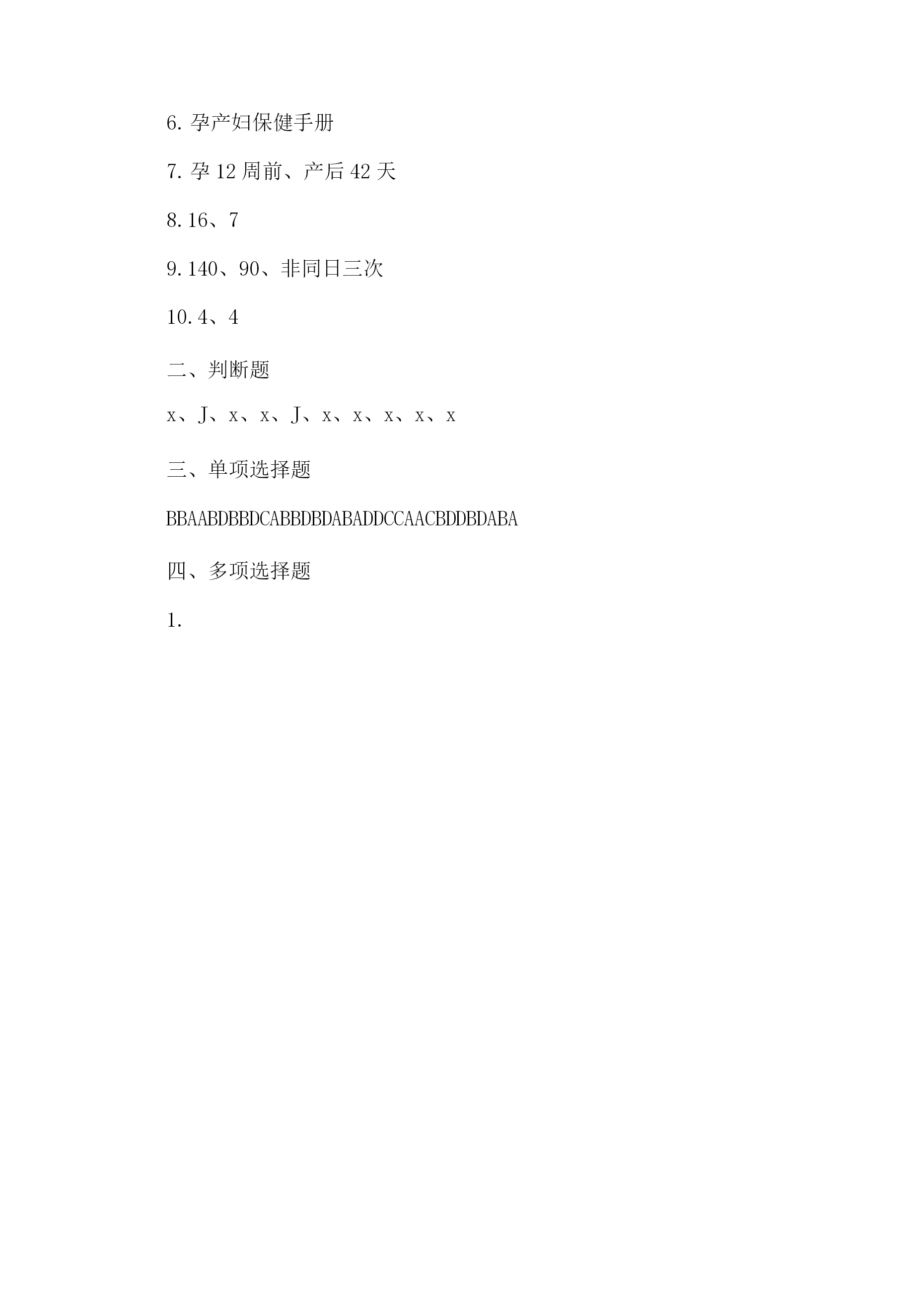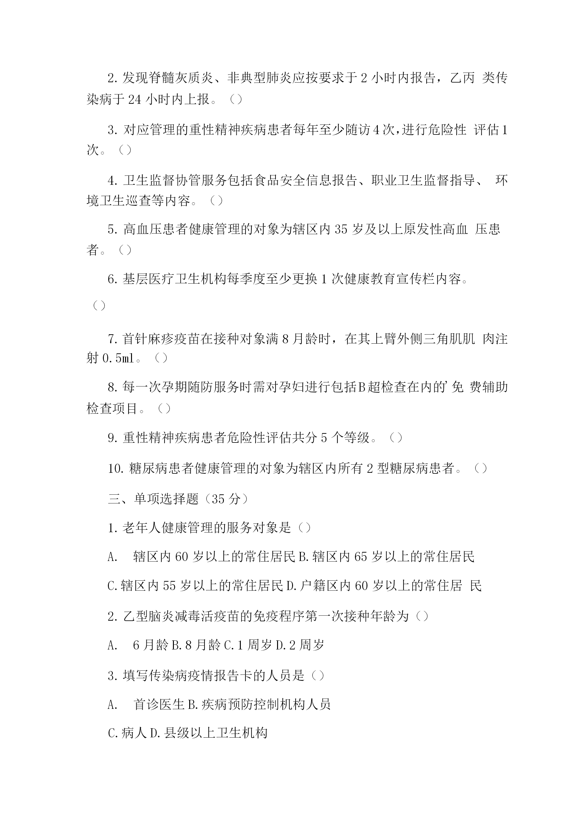 乡村医生公共卫生服务培训试题2017年乡村医生公共卫生服务培训试题一、填空题(20分)城乡居民健康档案管理服务的对象是辖区内居民。居民健康档案的内容包括、、和。新版基本公共卫生服务规范规定居民健康档案的编码采用位编码,将建档居民的作为身份识别码。基层医疗卫生机构每年向辖区居民提供不少于种印刷材料,种视听音像资料。基层医疗卫生机构对0—6岁儿童共需开展次健康管理。孕产妇在孕12周前需由乡镇卫生院建立。孕产妇健康管理的时间一般从至。老年人健康管理服务包括项免费体格检查和项免费辅助检查项目。对首次发现收缩压>mmHg和(或)舒张压>mmHg的居民,在去除可能引起血压升高的因素后预约其复查,次血压高于正常,可初步诊断为高血压。对确诊的2型糖尿病患者每年提供次免费空腹血糖检测,至少进行次面对面随访。二、判断题(15分)所有居民均可免费享受健康体检中的辅助检查项目。()发现脊髓灰质炎、非典型肺炎应按要求于2小时内报告,乙丙类传染病于24小时内上报。()对应管理的重性精神疾病患者每年至少随访4次,进行危险性评估1次。()卫生监督协管服务包括食品安全信息报告、职业卫生监督指导、环境卫生巡查等内容。()高血压患者健康管理的对象为辖区内35岁及以上原发性高血压患者。()基层医疗卫生机构每季度至少更换1次健康教育宣传栏内容。()首针麻疹疫苗在接种对象满8月龄时,在其上臂外侧三角肌肌肉注射0.5ml。()每一次孕期随防服务时需对孕妇进行包括B超检查在内的'免费辅助检查项目。()重性精神疾病患者危险性评估共分5个等级。()糖尿病患者健康管理的对象为辖区内所有2型糖尿病患者。()三、单项选择题(35分)老年人健康管理的服务对象是()辖区内60岁以上的常住居民B.辖区内65岁以上的常住居民C.辖区内55岁以上的常住居民D.户籍区内60岁以上的常住居民乙型脑炎减毒活疫苗的免疫程序第一次接种年龄为()6月龄B.8月龄C.1周岁D.2周岁填写传染病疫情报告卡的人员是()首诊医生B.疾病预防控制机构人员C.病人D.县级以上卫生机构为防止传染病的传播,医疗废物必须做到()无害化处理B.集中存放C.市场流通》有偿处置以下选项不属于重点人群健康管理记录表的是()重性精神疾病患者管理记录表B.居民健康档案信息卡C.孕产妇健康管理记录表D.0~36个月儿童健康管理记录表居民健康档案编码中最后5位编码为()居民家庭序号编码B.乡镇(街道)编码C.村委会或居委会编码D.居民个人序号编码以下不属于乙类传染病的是()艾滋病B.鼠疫C.狂犬病D.麻疹今年我县建立居民健康档案纸质和电子档案确定的年度考核指标分别是()50%和30%B.1%和1%C.95%和70%D.98%和98%对原发性高血压患者,乡镇卫生院、村卫生室、社区卫生服务中心(站)每年要提供()A.至少1次面对面的随访B.至少2次面对面的随访C.至少3次面对面的随访D.至少4次面对面的随访基层医疗卫生机构每年至少开展公共健康咨询活动的次数是()下列不属于个人基本信息表填写内容的是()A.月收入B.家族史C.既往史D.药物过敏史对老年人健康管理管理服务要求描述错误的是()加强宣传,告知服务内容,使更多的老年居民愿意接受服务预约55岁及以上居民到乡镇卫生院、村卫生室、接受健康管理对行动不便、卧床居民可提供预约上门健康检查每次健康检查后及时将相关信息记入健康档案新生儿出生后应接种的疫苗是()A.卡介苗、脊髓灰质炎糖丸B.卡介苗、乙肝疫苗C.脊髓灰质炎糖丸、乙肝疫苗D.肺炎疫苗、脊髓灰质炎糖丸健康档案数据不一致的主要表现为()A.数据表示不一致B.数据名称不一致C.数据含义不一致D.以上均是16.对于原发性高血压紧急转诊者,乡镇卫生院、村卫生室、社区卫生服务中心(站)应在()A.1周内主动随访转诊情况B.2周内主动随访转诊情况C.4周内主动随访转诊情况D.6周内主动随访转诊情况对工作中发现的2型糖尿病高危人群()建议其每半年至少测量1次空腹血糖建议其每半年至少测量1次餐后2小时血糖建议其每年至少测量1次空腹血糖和1次餐后2小时血糖建议其每年至少测量1次空腹血糖乙型肝炎疫苗全程免疫的时间是()A.出生、1、6个月B.1、2、6个月C.1、2、5个月D.2、3、6个月发生突发公共卫生事件初次报告时,非必须报告的信息是()A.波及人群B.原因C.发生地点D.潜在的威胁和影响以下关于甲乙丙类传染病数量说法正确的是()甲类2种、乙类26种、丙类11种甲类3种、乙类25种、丙类10种甲类2种、乙类25种、丙类10种甲类3种、乙类26种、丙类11种麻疹疫苗的初种年龄是()A.6个月