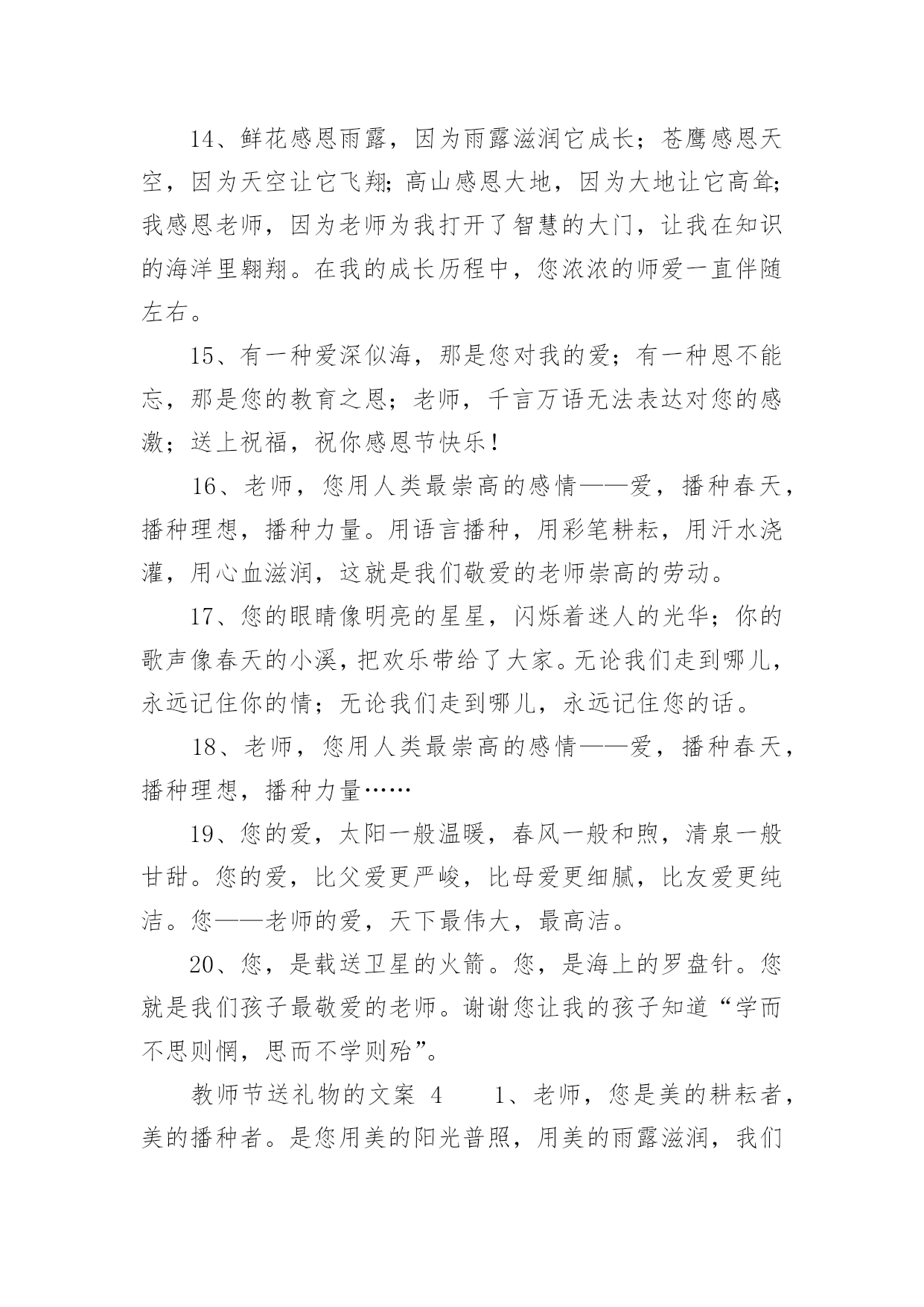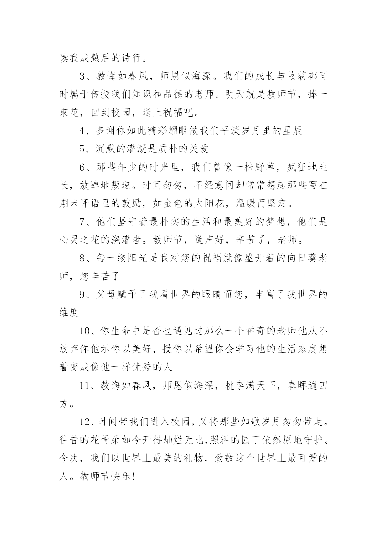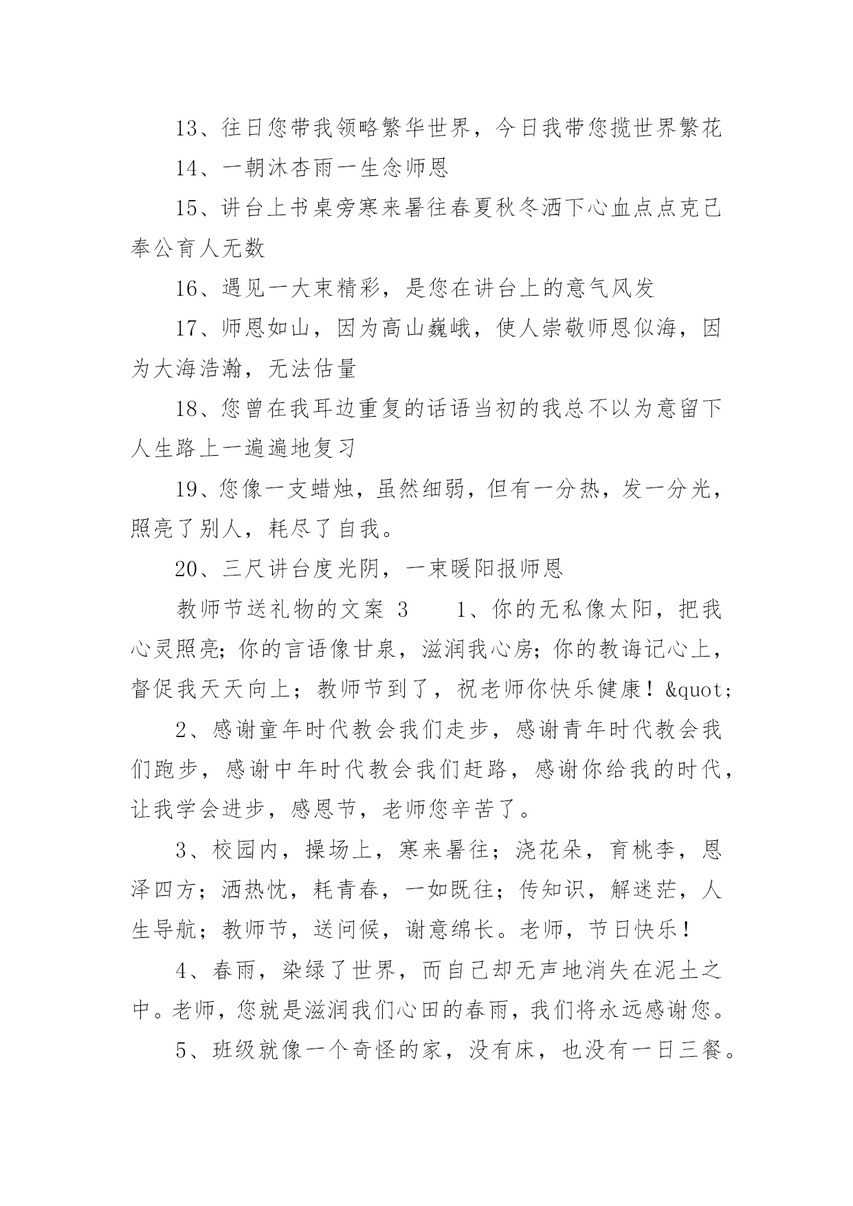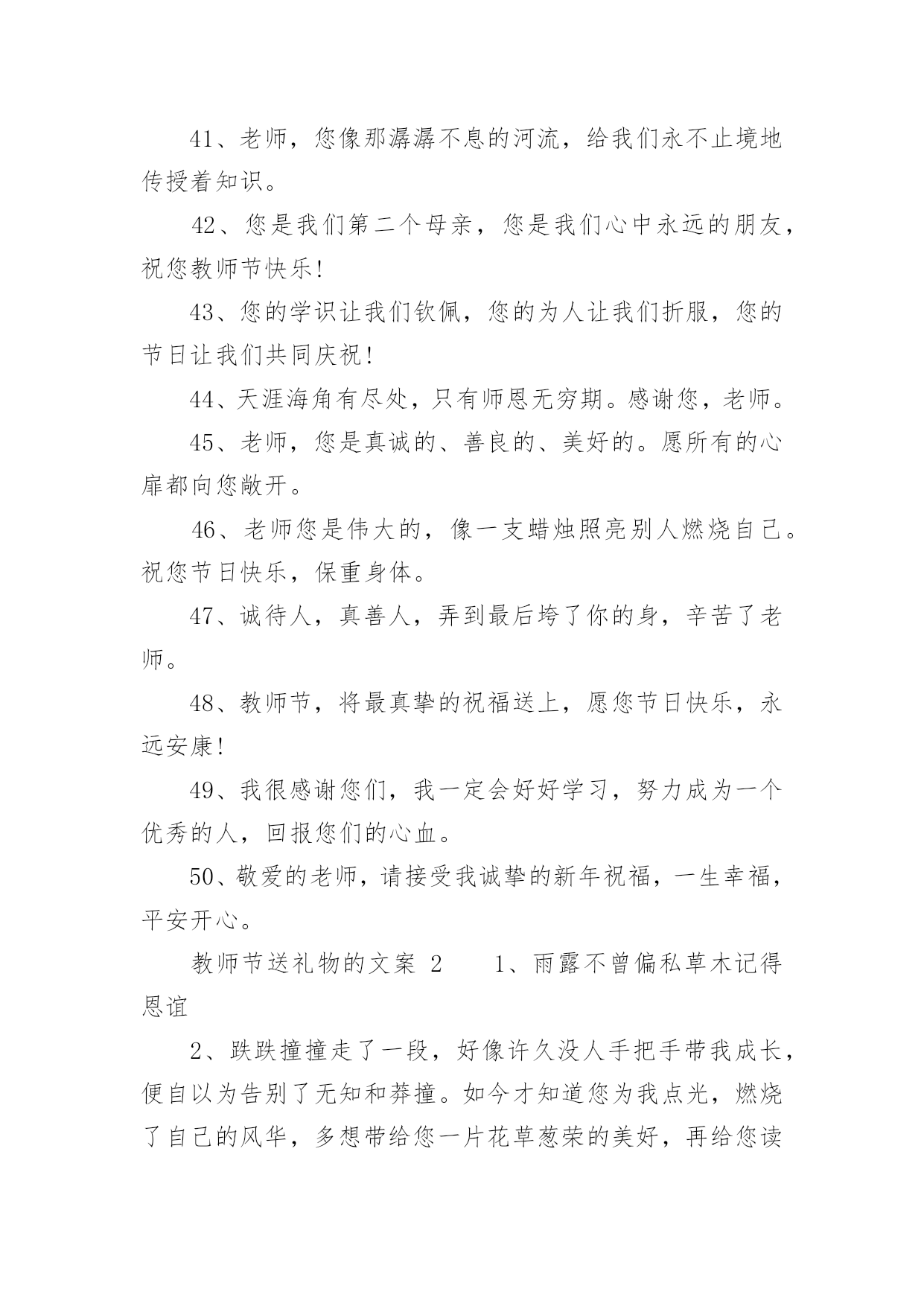 教师节送礼物的文案教师节送礼物的文案(精选150句)在现实生活或工作学习中,许多人对一些广为流传的文案都不陌生吧,文案用以记录和分享生活日常。还在苦苦寻找个性、独特的文案吗?下面是小编为大家整理的教师节送礼物的文案,希望对大家有所帮助。教师节送礼物的文案11、师恩重如山,学生不敢忘,借您的节日送上一份祝福,祝福您身体健康,万事如意,桃李满园!2、三尺讲台容不下您挺拔的身躯,一支粉笔写不尽您渊博的知识,两袖清风尽显您的高大与儒雅。老师,您辛苦了。3、您的教导,我铭刻在心;您的关怀,我感激在心;您的帮助,我感谢在心。谢谢您,老师!4、你用青春耕耘,花园里鲜花灿烂;你用心血浇灌,果园中芬芳弥漫;你用微笑播种,一路上快乐无限;你用智慧领航,人海里精彩不断。教师节,愿你拥有最多财富最大幸福最美祝福:桃李满天下,快乐伴身边。5、老师,节日好!老师,假如我能搏击蓝天,那是您给了我腾飞的翅膀;假如我是击浪的勇士,那是您给了我弄潮的力量!6、您是蜡烛,燃烧自己照亮我们,您是大树,撑开身体呵护我们,您是春蚕,奉献自己关怀我们,感谢您亲爱的老师,教师节祝您开心快乐永远年轻!7、送上一份祝福,愿你的生命中有良师相伴,在黑暗中为你闪耀星光,照亮你的前方,收获一片灿烂的星空!教师节,祝你幸福无边!8、“以前很怕你,现在很想你”,今天教师节,向老师说一声:您辛苦啦!9、教师节到,送您三束花,一束康乃馨,您像慈母教我做人;一束百合花,感谢您不求回报纯洁的爱;一束满天星,那是您的桃李满天下。祝您教师节快乐!10、您给了我灿灿如金的生活真谛,经过岁月的磨洗,弥久而愈明!教师节快乐!11、当星星隐匿在遥远的天际,依稀的灯光依然闪亮在您窗前。正因您的执着,才有我们璀璨的明天!节日快乐!12、经历了风雨,才知道您的可贵。走上了成功,才知道您的伟大。是您指引了人生的方向,是您的培育了无数的英才。谢谢您,我敬爱的老师。教师节快乐!13、教师节来临,愿天下所有的老师:快乐随你一年中的每一天,平安伴你一天中的每一时,健康牵你一时中的每一分,幸福陪你一分中的每一秒!14、老师,您是我心中最重量级的人物,您的教导我记心上,您的教育我记心间,您的教诲我记心里,教师节到了,祝您‘节日快乐’。15、千言万语道不尽我对你的赞美,万语千言诉不完我对你的感激。九月,多情的日子,让我尽情的歌唱吧,教师节,在这个永恒的节日,请接受我们真诚的祝福,愿你们身体健康,永远幸福。16、四季交替,周而复始,是您亲手送走一个个长大的孩子。日复一日,年复一年,是您为理想插上一双双翅膀。您的节日到了,在远方我们为您送去最简单的祝福,老师,您好。17、世有伯乐,然后有千里马。谢谢您,我的老师。教师节快乐!18、吃的是草,挤的是奶,吸收阳光,倾洒氧气,教的是书,育的是人,这就是无私的老师,愿老师们节日快乐,身体健康。19、教师节,为您送上祝福无限,愿欢乐的歌声时时围绕着,欢乐的笑声永远包裹着,欢乐的年华永远伴随着,时刻沉浸在欢乐的海洋!20、您的教诲,太阳一般温暖,春风一般和煦,清泉一般甘甜。您的爱,比父爱严厉,比母爱细腻,比友爱厚重。感谢老师对我的教诲,祝您教师节快乐!21、我这份美好的祝福通过电波,跨过重重高山,越过滔滔江水,掠过高楼大厦,飞到您的身边:祝您教师节快乐!22、金秋九月,是一个收获的季节,更是一个感恩的季节,老师成了这个季节的主题,空气中到处弥漫着感念师恩的情绪。祝:教师节快乐!23、教师节快乐。每个人都有自己的启蒙恩师,每个人都曾受到恩师的点化,每个人都曾受到恩师的照顾,教师节到了,让我们一起祝福我们的恩师:节日快乐,寿比南山。24、有一道彩虹,不出现在雨后,也不出现在天空,它常出现在我心中,鞭策着我堂堂正正地做人――给时刻关怀着我的导师!25、金秋九月,一个收获的季节,一个感恩的季节,一个属于教师的季节。祝全体老师教师节快乐。26、岁月匆匆流逝,而你还是我恩师,不管您变成什么样子,在我中心,您都是最美的花仙子!亲爱的老师,节日快乐,青春永驻!27、曾经,恨你对我严厉。如今,感谢你的严厉,因为你的严厉,才使我的人生充满意义。老师,节日快乐,您辛苦了!28、顽强的毅力可以征服世界上任何一座高峰,当年您凭此教导劣徒,今天我以此驾驭人生。老师,您辛苦啦!29、我虽然不是你最好的学生,但你是我最好的老师,祝您事事顺意,每天都有一份好的心情。教师节快乐!30、您用阳光雨露,哺育我快乐成长;您用浩瀚知识,引领我幸福远航;您用呕心沥血,托起我七彩梦想。祝您教师节快乐31、您的学识让我们敬佩,您的为人让我们折福,您的节日让我们共同庆祝!老师,节日快乐!32、人之初,本无知,幼到老,拜师恩,学字句,学道理,知天下,明礼仪,吾长大,师已老,教师节,念师好。33、从幼儿园到现在,谢谢您以往的照顾,教诲,让我能够立