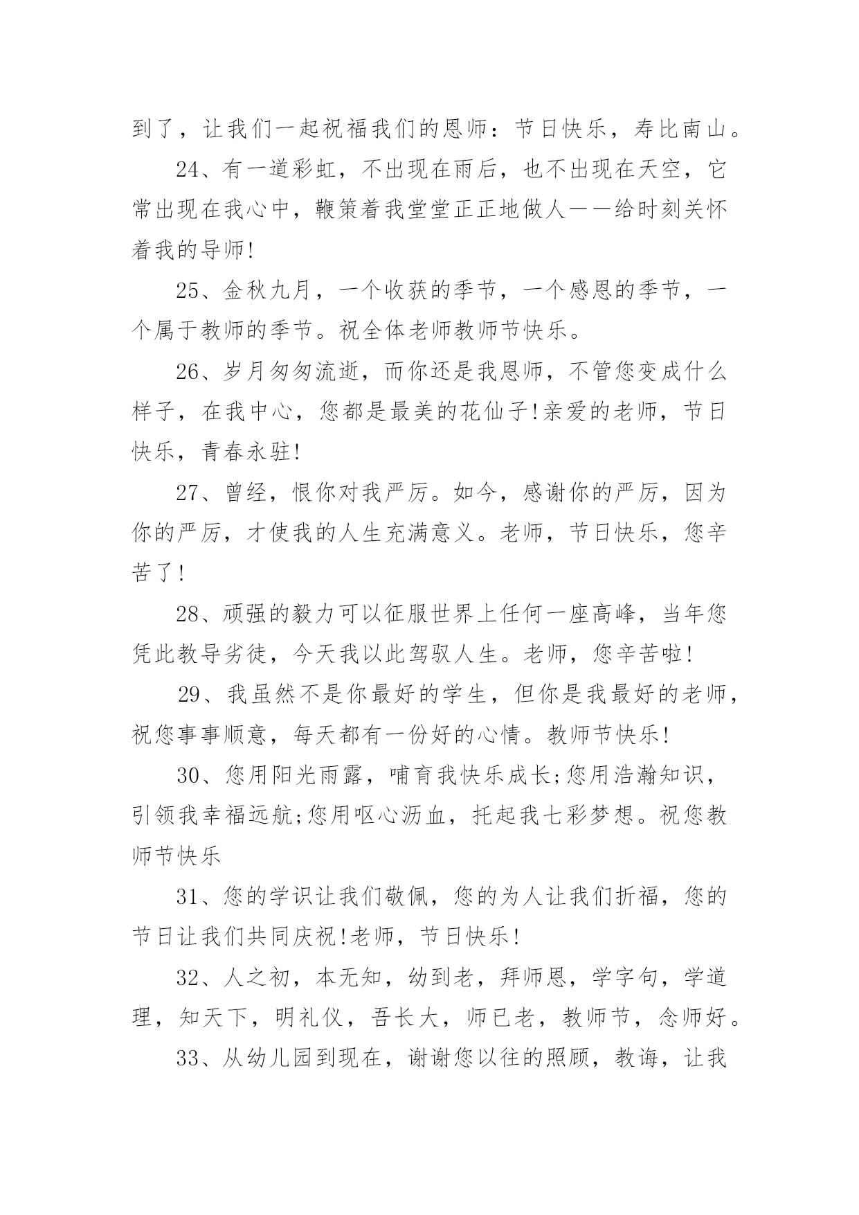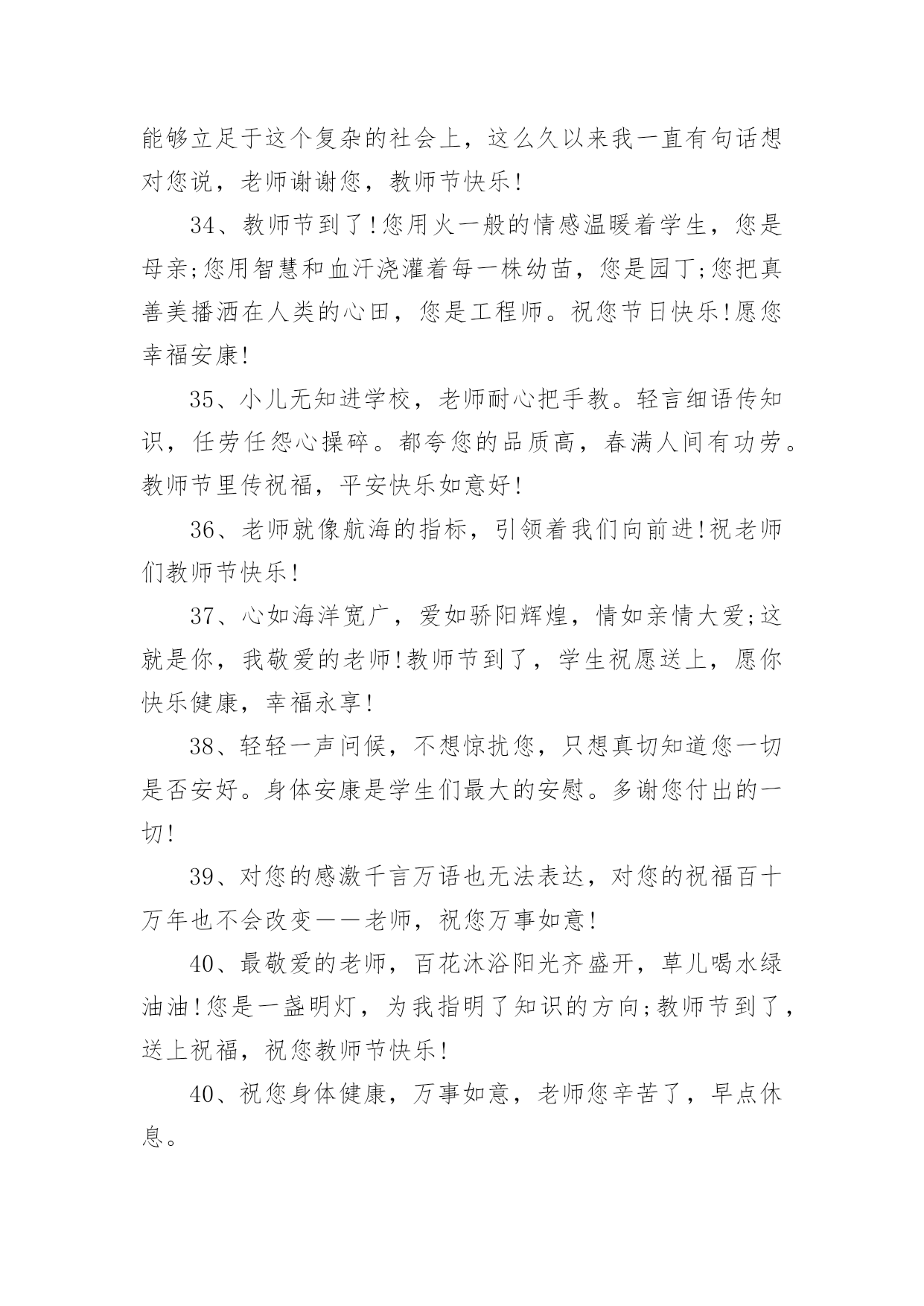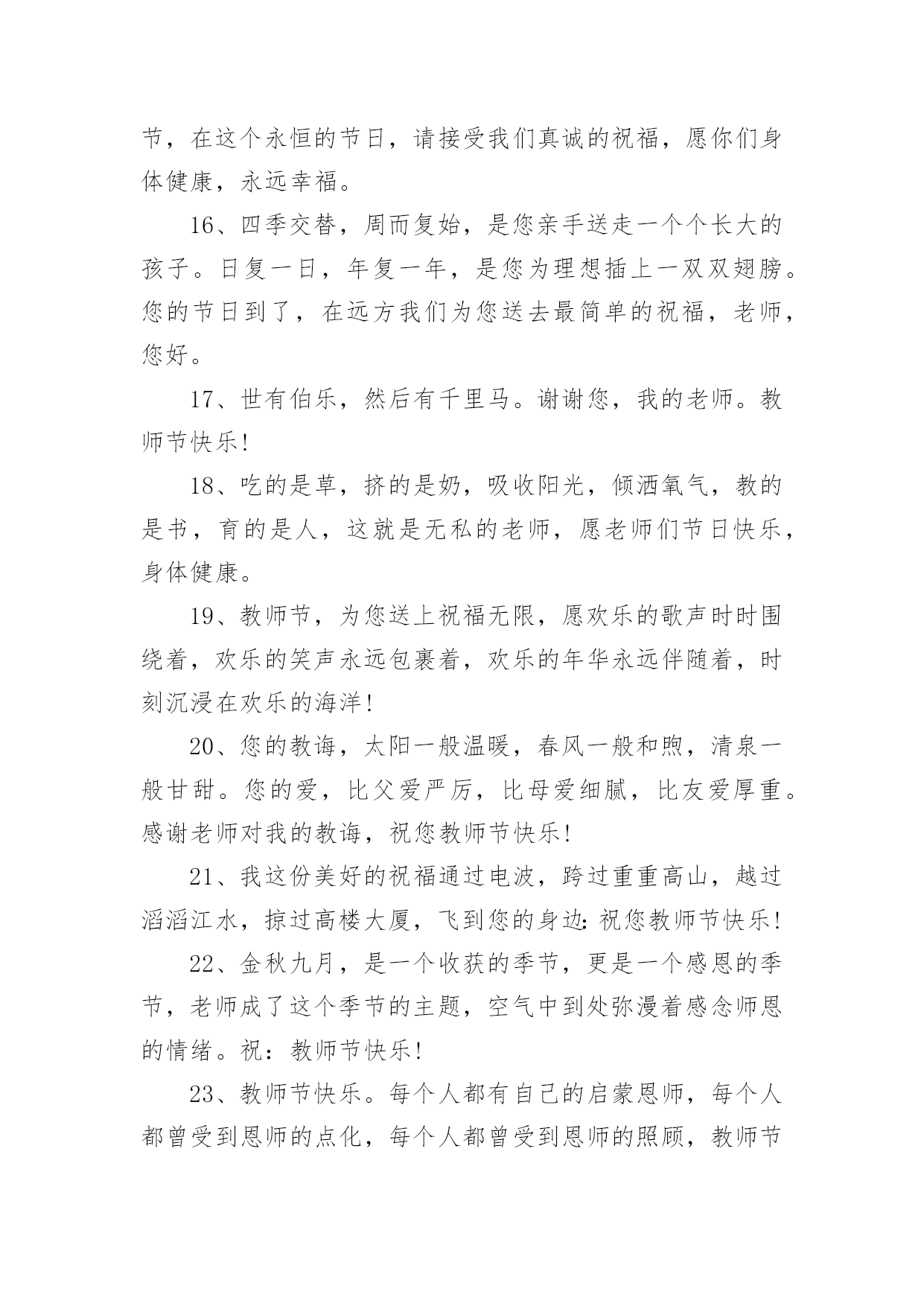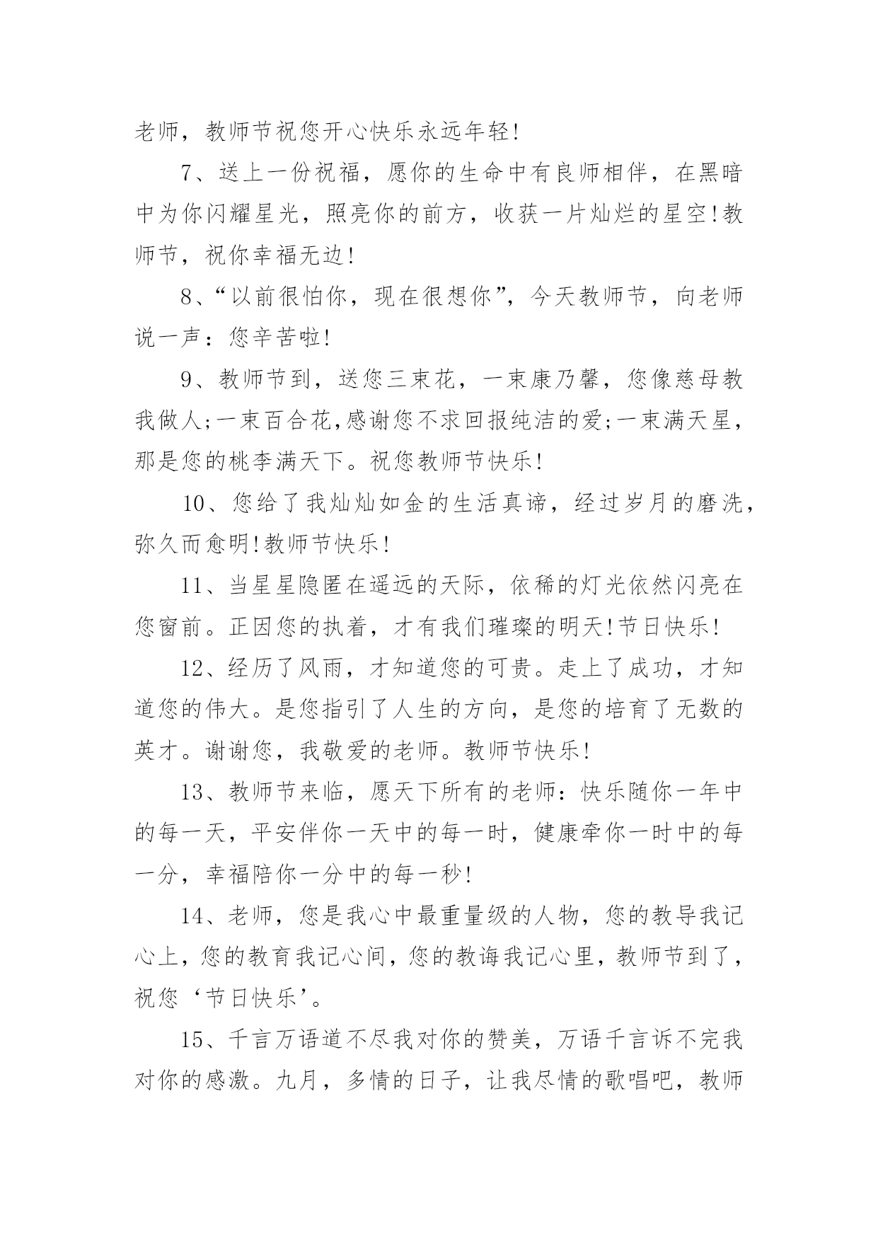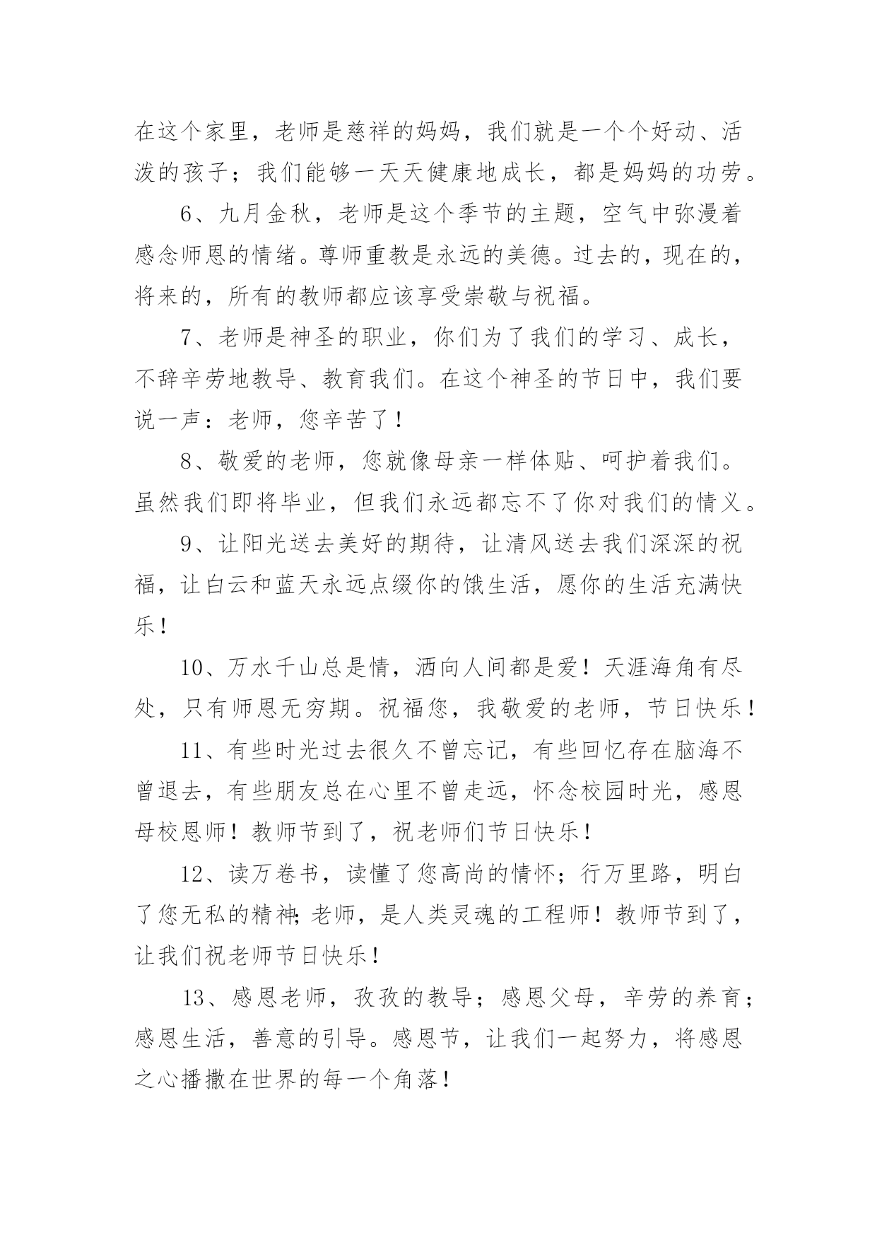 教师节送礼物的文案教师节送礼物的文案(精选150句)在现实生活或工作学习中,许多人对一些广为流传的文案都不陌生吧,文案用以记录和分享生活日常。还在苦苦寻找个性、独特的文案吗?下面是小编为大家整理的教师节送礼物的文案,希望对大家有所帮助。教师节送礼物的文案11、师恩重如山,学生不敢忘,借您的节日送上一份祝福,祝福您身体健康,万事如意,桃李满园!2、三尺讲台容不下您挺拔的身躯,一支粉笔写不尽您渊博的知识,两袖清风尽显您的高大与儒雅。老师,您辛苦了。3、您的教导,我铭刻在心;您的关怀,我感激在心;您的帮助,我感谢在心。谢谢您,老师!4、你用青春耕耘,花园里鲜花灿烂;你用心血浇灌,果园中芬芳弥漫;你用微笑播种,一路上快乐无限;你用智慧领航,人海里精彩不断。教师节,愿你拥有最多财富最大幸福最美祝福:桃李满天下,快乐伴身边。5、老师,节日好!老师,假如我能搏击蓝天,那是您给了我腾飞的翅膀;假如我是击浪的勇士,那是您给了我弄潮的力量!6、您是蜡烛,燃烧自己照亮我们,您是大树,撑开身体呵护我们,您是春蚕,奉献自己关怀我们,感谢您亲爱的老师,教师节祝您开心快乐永远年轻!7、送上一份祝福,愿你的生命中有良师相伴,在黑暗中为你闪耀星光,照亮你的前方,收获一片灿烂的星空!教师节,祝你幸福无边!8、“以前很怕你,现在很想你”,今天教师节,向老师说一声:您辛苦啦!9、教师节到,送您三束花,一束康乃馨,您像慈母教我做人;一束百合花,感谢您不求回报纯洁的爱;一束满天星,那是您的桃李满天下。祝您教师节快乐!10、您给了我灿灿如金的生活真谛,经过岁月的磨洗,弥久而愈明!教师节快乐!11、当星星隐匿在遥远的天际,依稀的灯光依然闪亮在您窗前。正因您的执着,才有我们璀璨的明天!节日快乐!12、经历了风雨,才知道您的可贵。走上了成功,才知道您的伟大。是您指引了人生的方向,是您的培育了无数的英才。谢谢您,我敬爱的老师。教师节快乐!13、教师节来临,愿天下所有的老师:快乐随你一年中的每一天,平安伴你一天中的每一时,健康牵你一时中的每一分,幸福陪你一分中的每一秒!14、老师,您是我心中最重量级的人物,您的教导我记心上,您的教育我记心间,您的教诲我记心里,教师节到了,祝您‘节日快乐’。15、千言万语道不尽我对你的赞美,万语千言诉不完我对你的感激。九月,多情的日子,让我尽情的歌唱吧,教师节,在这个永恒的节日,请接受我们真诚的祝福,愿你们身体健康,永远幸福。16、四季交替,周而复始,是您亲手送走一个个长大的孩子。日复一日,年复一年,是您为理想插上一双双翅膀。您的节日到了,在远方我们为您送去最简单的祝福,老师,您好。17、世有伯乐,然后有千里马。谢谢您,我的老师。教师节快乐!18、吃的是草,挤的是奶,吸收阳光,倾洒氧气,教的是书,育的是人,这就是无私的老师,愿老师们节日快乐,身体健康。19、教师节,为您送上祝福无限,愿欢乐的歌声时时围绕着,欢乐的笑声永远包裹着,欢乐的年华永远伴随着,时刻沉浸在欢乐的海洋!20、您的教诲,太阳一般温暖,春风一般和煦,清泉一般甘甜。您的爱,比父爱严厉,比母爱细腻,比友爱厚重。感谢老师对我的教诲,祝您教师节快乐!21、我这份美好的祝福通过电波,跨过重重高山,越过滔滔江水,掠过高楼大厦,飞到您的身边:祝您教师节快乐!22、金秋九月,是一个收获的季节,更是一个感恩的季节,老师成了这个季节的主题,空气中到处弥漫着感念师恩的情绪。祝:教师节快乐!23、教师节快乐。每个人都有自己的启蒙恩师,每个人都曾受到恩师的点化,每个人都曾受到恩师的照顾,教师节到了,让我们一起祝福我们的恩师:节日快乐,寿比南山。24、有一道彩虹,不出现在雨后,也不出现在天空,它常出现在我心中,鞭策着我堂堂正正地做人――给时刻关怀着我的导师!25、金秋九月,一个收获的季节,一个感恩的季节,一个属于教师的季节。祝全体老师教师节快乐。26、岁月匆匆流逝,而你还是我恩师,不管您变成什么样子,在我中心,您都是最美的花仙子!亲爱的老师,节日快乐,青春永驻!27、曾经,恨你对我严厉。如今,感谢你的严厉,因为你的严厉,才使我的人生充满意义。老师,节日快乐,您辛苦了!28、顽强的毅力可以征服世界上任何一座高峰,当年您凭此教导劣徒,今天我以此驾驭人生。老师,您辛苦啦!29、我虽然不是你最好的学生,但你是我最好的老师,祝您事事顺意,每天都有一份好的心情。教师节快乐!30、您用阳光雨露,哺育我快乐成长;您用浩瀚知识,引领我幸福远航;您用呕心沥血,托起我七彩梦想。祝您教师节快乐31、您的学识让我们敬佩,您的为人让我们折福,您的节日让我们共同庆祝!老师,节日快乐!32、人之初,本无知,幼到老,拜师恩,学字句,学道理,知天下,明礼仪,吾长大,师已老,教师节,念师好。33、从幼儿园到现在,谢谢您以往的照顾,教诲,让我能够立