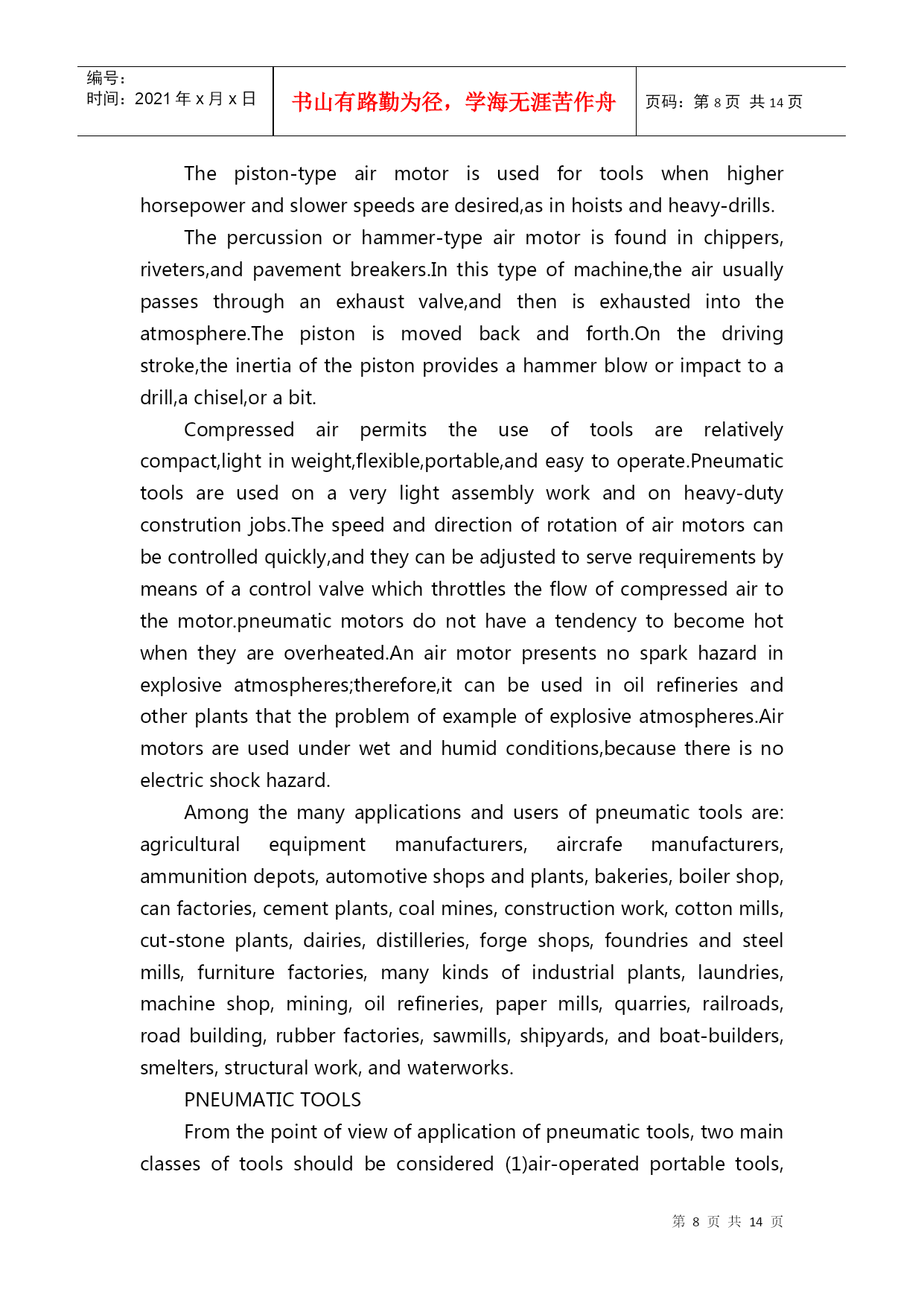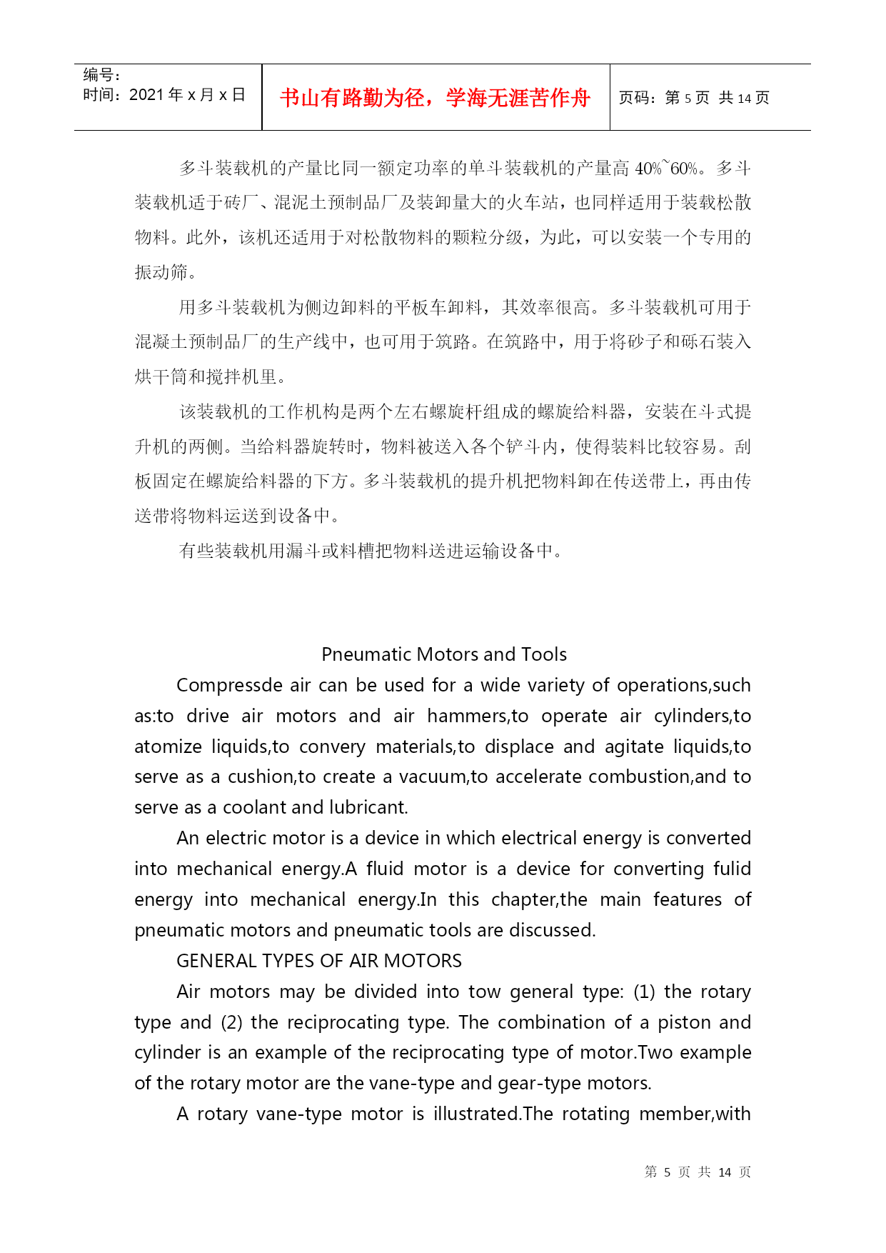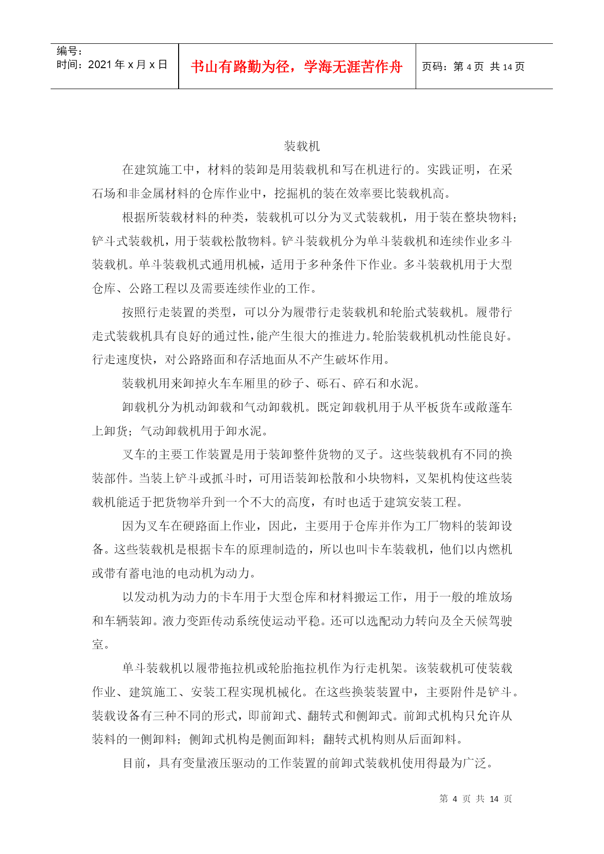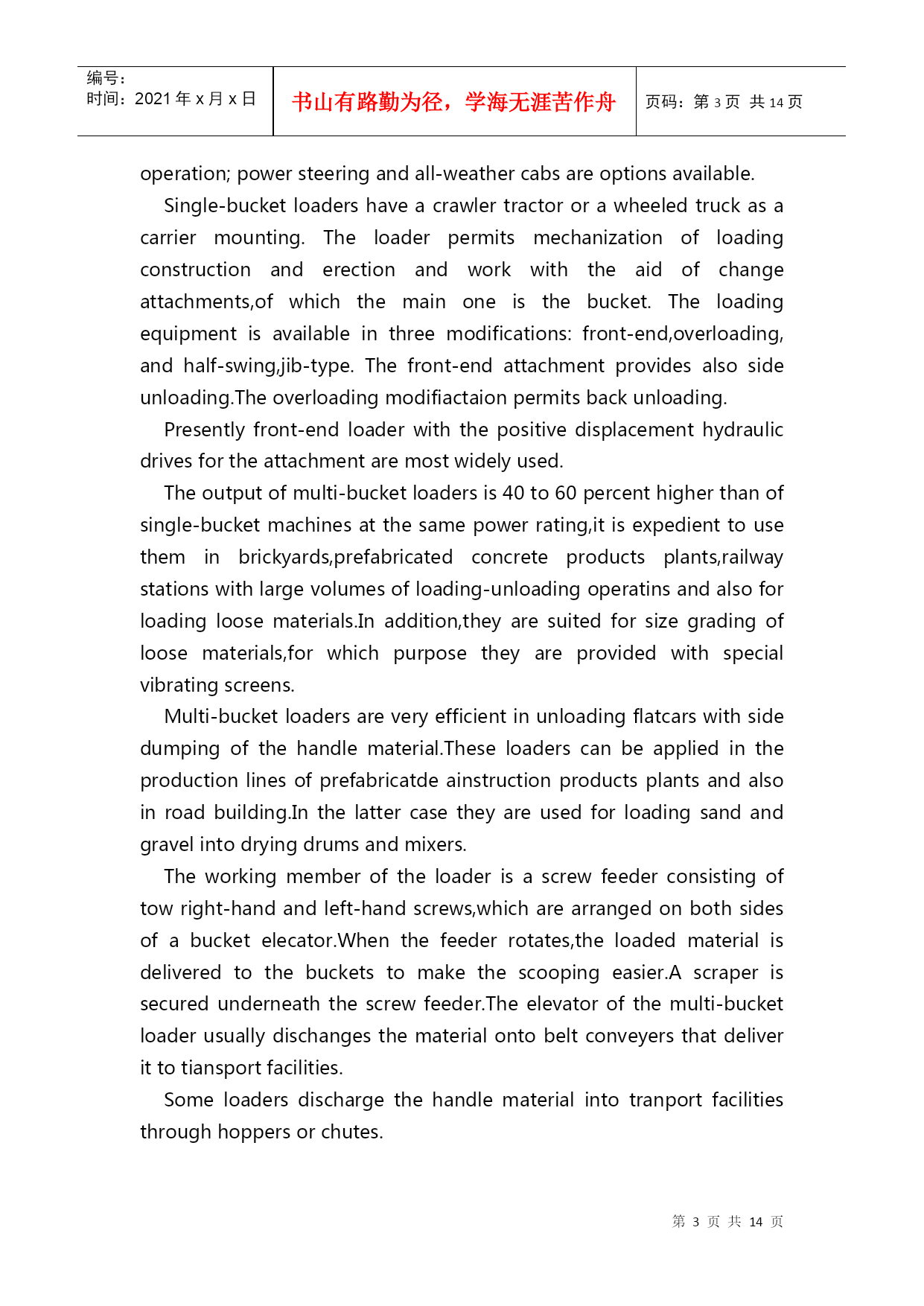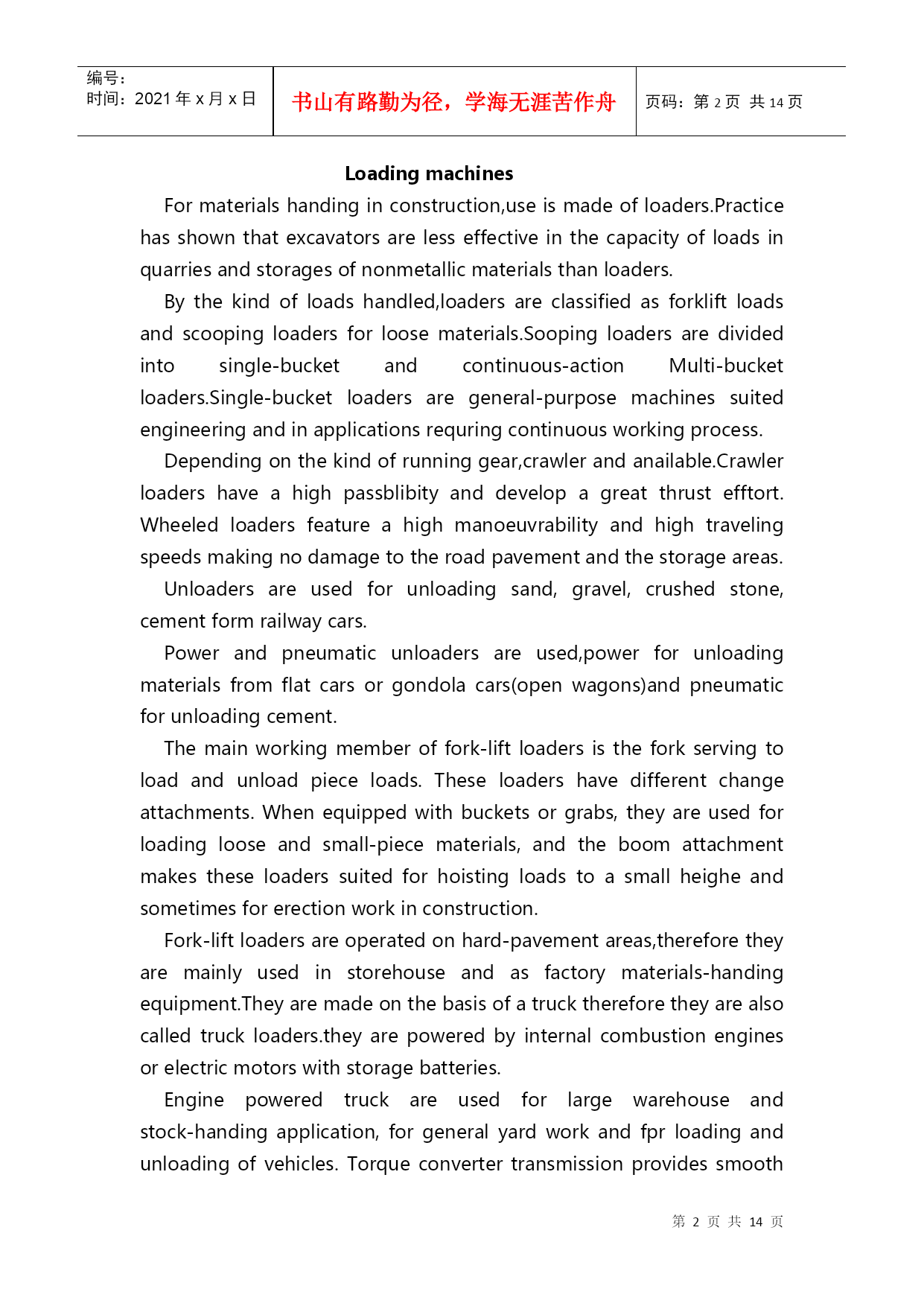PAGEPAGE\*MERGEFORMAT1西南交通大学本科毕业设计(论文)外文资料及翻译年级:2007级学号:20077657姓名:王雪扬专业:工程机械指导老师:李春林2011年5月编号:时间:2021年x月x日书山有路勤为径,学海无涯苦作舟页码:第PAGE14页共NUMPAGES14页第PAGE\*MERGEFORMAT14页共NUMPAGES\*MERGEFORMAT14页LoadingmachinesFormaterialshandinginconstruction,useismadeofloaders.Practicehasshownthatexcavatorsarelesseffectiveinthecapacityofloadsinquarriesandstoragesofnonmetallicmaterialsthanloaders.Bythekindofloadshandled,loadersareclassifiedasforkliftloadsandscoopingloadersforloosematerials.Soopingloadersaredividedintosingle-bucketandcontinuous-actionMulti-bucketloaders.Single-bucketloadersaregeneral-purposemachinessuitedengineeringandinapplicationsrequringcontinuousworkingprocess.Dependingonthekindofrunninggear,crawlerandanailable.Crawlerloadershaveahighpassblibityanddevelopagreatthrustefftort.Wheeledloadersfeatureahighmanoeuvrabilityandhightravelingspeedsmakingnodamagetotheroadpavementandthestorageareas.Unloadersareusedforunloadingsand,gravel,crushedstone,cementformrailwaycars.Powerandpneumaticunloadersareused,powerforunloadingmaterialsfromflatcarsorgondolacars(openwagons)andpneumaticforunloadingcement.Themainworkingmemberoffork-liftloadersistheforkservingtoloadandunloadpieceloads.Theseloadershavedifferentchangeattachments.Whenequippedwithbucketsorgrabs,theyareusedforloadinglooseandsmall-piecematerials,andtheboomattachmentmakestheseloaderssuitedforhoistingloadstoasmallheigheandsometimesforerectionworkinconstruction.Fork-liftloadersareoperatedonhard-pavementareas,thereforetheyaremainlyusedinstorehouseandasfactorymaterials-handingequipment.Theyaremadeonthebasisofatruckthereforetheyarealsocalledtruckloaders.theyarepoweredbyinternalcombustionenginesorelectricmotorswithstoragebatteries.Enginepoweredtruckareusedforlargewarehouseandstock-handingapplication,forgeneralyardworkandfprloadingandunloadingofvehicles.Torqueconvertertransmissionprovidessmoothoperation;powersteeringandall-weathercabsareoptionsavailable.Single-bucketloadersh