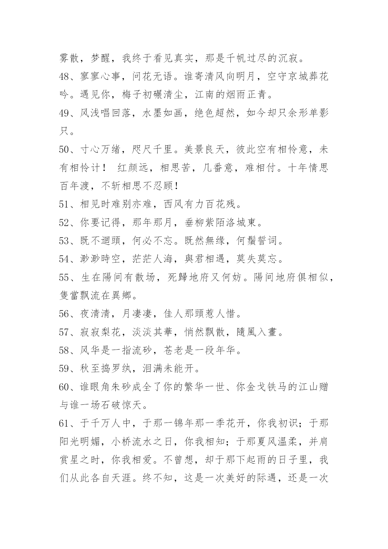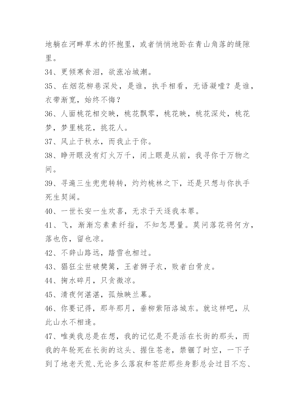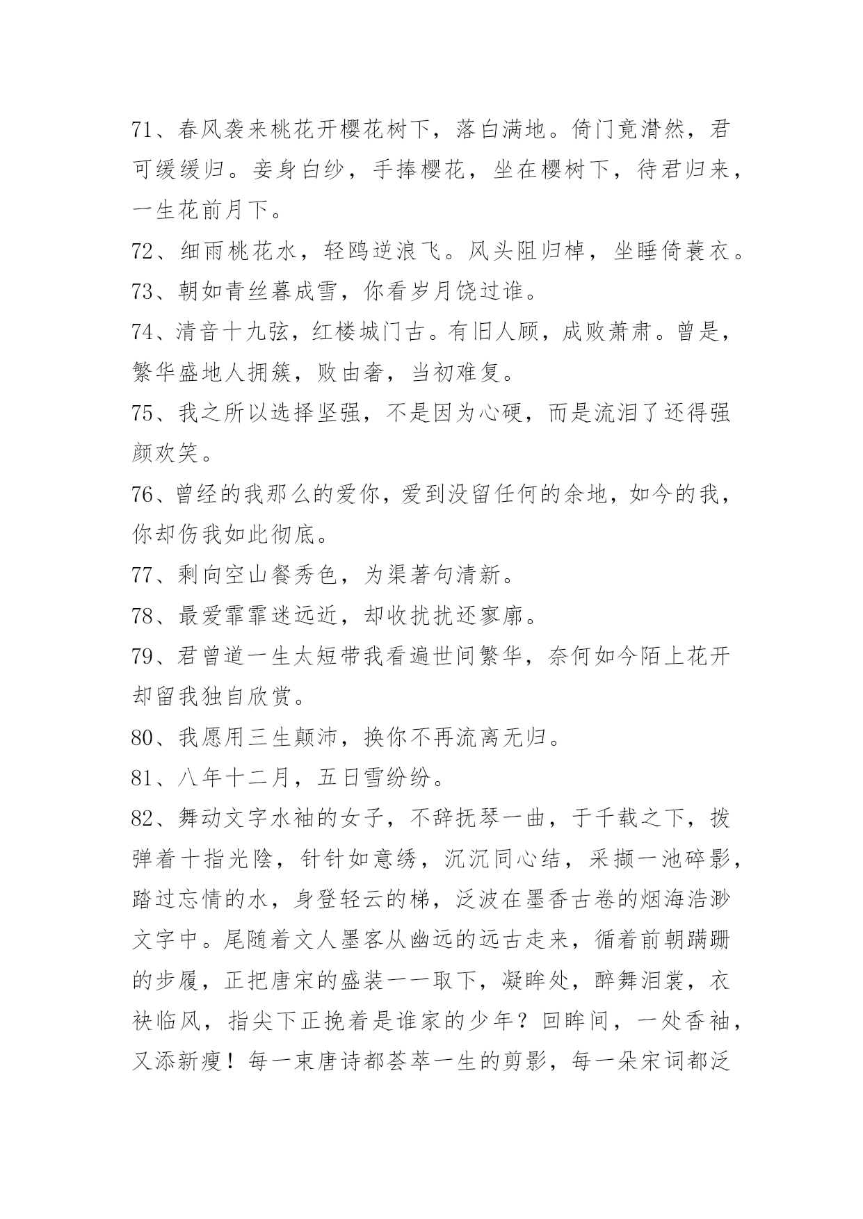 文艺古风句子89条2023年文艺古风句子锦集89条乌云蔽月,人迹踪绝,说不出如斯孤单。以下是关于文艺古风句子89条,仅供参考,大家一起来看看吧。1、日落碧簪外,人行红雨中。幽人诗酒里,又是一春风。杨万里(宋)《春日绝句》2、想君,最后一次想君,向着君的方向吹起长箫,在悠悠月光中,折叠一只白色的纸蝴蝶,放飞风中,在君窗前最后一次翩翩起舞。3、静,花似月,思念纷飞,不退。寒似谁,未曾更变,不觉。4、一帘含香飘逸的樱絮,熏染了一场月圆花满的爱恋。在雨花台前,遥望星语绵绵,不知,那思念的风里,可有你的淡笑温婉。5、瑟瑟的苍穹,绵绵的清愁,在谁的琴曲下柔成了一个千千心结?月落乌啼,那又是唱响了谁的风霜千年?当年一笑惹痴情,注定红尘里,要与在你纠纠缠缠中走过千年。宵的我,无由得却饮醉在了前世的那一场晓风残月里。花深处,杨柳岸边,烟雨楼台依旧是沧海茫茫。6、病柳残香,孤桐疏雨,何堪寂寞楼头?忆别时故里,新月如钩。是羁旅何处?心念老,旧梦难酬。思远,情亦去远,独我悲秋。幽。长不寐,纵使意千回,枉自凝眸。双瞳翦翦,尽付离忧。见花前月影,又记起,昨日兰舟。前雨,沥沥成伤,却怎浇愁?7、玉笛横吹,一曲清音舞落花。墨点砂,一幅丹青尽风雅。8、再次相遇,臣妾不会哭,臣妾只会证明给君看,臣妾没君也过的很好。9、臣妾试着让自己过的快乐,过得好,每每都被别人的好压得喘不过气来。10、如果不能一起去极乐世界,那就让臣妾停留在,她曾经呼吸过的世界吧。11、成绩,臣妾追了君几年无怨无悔,只求君在分数出来那天爱臣妾次。12、醉知酒浓,醒知梦空,原来看残花凋尽也是一种痛。谁在你的墓前,葬下了一生的诺言?红尘画卷,画得谁的生死之恋?最后只能守着那不变的容颜,一守就是一千年。樱花满天,悲伤流转,却掩不住斑驳流年。尽的风华,为谁化作了彼岸花?谁抚我一丝秀发,谁欠我一生代价。13、君心犹不知,万般无奈断琴弦。心可有忆,情丝婉转梅林前。枕黄梁,泪染红袖。栏玉砌改朱颜。一轮寒月,泪语涟涟,望满园芳草,寂寞容颜,舞两袖清风,故人已远。心犹不知。尘往事难再现。心可有忆,海角风吹灭流年。14、多情多感仍多病,多景楼中。酒相逢,乐事回头一笑空。杯且听琵琶语,细捻轻拢。脸春融,斜照江天一抹红。15、我住长江头,君住长江尾。日思君不见君,共饮长江水。水几时收,此恨何时已。愿君心似我心,定不负相思意。16、君送臣妾地上星,臣妾赠君掌中雪。17、沉溺于死亡的姿态。恨只恨,苍天负臣妾。18、君是臣妾最大的秘密,小心翼翼藏在心底。19、让臣妾感谢君,赠臣妾空欢喜。20、臣妾不再会因君而改变,也不再会犹豫说再见。21、臣妾爱君,没有什么目的。只是爱君。22、不爱臣妾就走开,不要耽误臣妾。23、诗画难习步青云,命无科甲二榜荣。24、芳草句,碧云辞,低徊闲自思。25、多少红尘过客,多少过往云烟,一声离别,天涯流散。彩蝶水袖舞清风,暖玉生烟琴几何;梦里销香伊人梦,晓月初升照旧人;秦淮河畔鸳鸯醉,天上宫阙桂花飞。醉眼,泪点伊人颜。心字犹缺,情缘搁浅,一生离散,我却始终落不下那一笔,终是把思念留在那似水年间。26、君已不复,情依旧,但无处可归。27、徐风入夜花影斜,清灯暗许美人歇,几重相思几重叠。28、相思红颜老,守望田园居,闲来梦故人,应似初见时。29、琉璃梳子抚青丝,画心牵肠痴不痴,荧珑镜子映空闺,渡水跋山归不归。30、谁将烟弥散,散了纵横的牵绊,听弦断,断那三千痴缠。31、一世寂寞,不诉离殇。海枯石烂,念念不忘。32、三寸骨,两分情,一曲离殇醉得月朦胧……33、草木葱郁的山间,溪流涓涓的河岸,想起,倾城天下,容华谢后,过尽千帆的容颜,曲终人散的画面,也不过是往事如烟,山河永寂,不如,做一朵陌上花,艳不求名,静静地躺在河畔草木的怀抱里,或者悄悄地卧在青山角落的缝隙里。34、更倾寒食泪,欲涨冶城潮。35、在烟花柳巷深处,是谁,执手相看,无语凝噎?是谁,衣带渐宽,始终不悔?36、人面桃花相交映,桃花飘零,桃花映,桃花深处,桃花梦,梦里桃花,挑花人。37、风止于秋水,而我止于你。38、睁开眼没有灯火万千,闭上眼是从前,我寻你于万物之间。39、寻遍三生兜兜转转,灼灼桃林之下,还是只想与你执手死生契阔。40、一世长安一生欢喜,无求于天逐我本罪。41、飞,渐渐忘素素纤指,不知怎思量。莫问落花将何方,落也伤,留也凉。42、不辞山路远,踏雪也相过。43、猖狂尘世破樊篱,王者狮子衣,败者白骨皮。44、掬水碎月,只贪微凉。45、清夜何湛湛,孤烛映兰幕。46、你要记得,那年那月,垂柳紫陌洛城东。就这样吧,从此山水不相逢。47、唯美我总是在想,我的记忆是不是活在长街的那头,而我的年轮死在长街的这头、握住苍老,禁锢了时空,一下子到了地老天荒、无论多么落寂和苍茫那些身影总会过目不忘、雾散,梦醒,我终于看见真实,那是千帆过尽的沉寂。