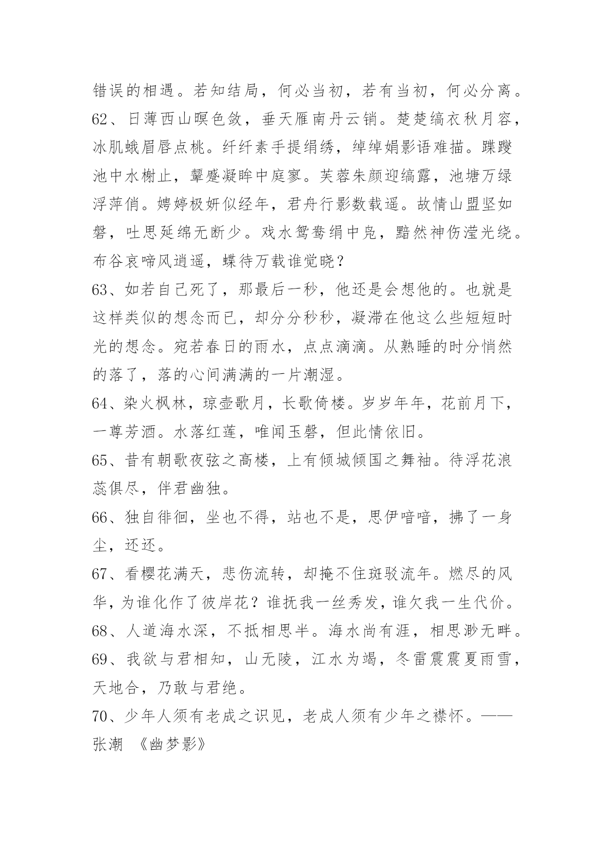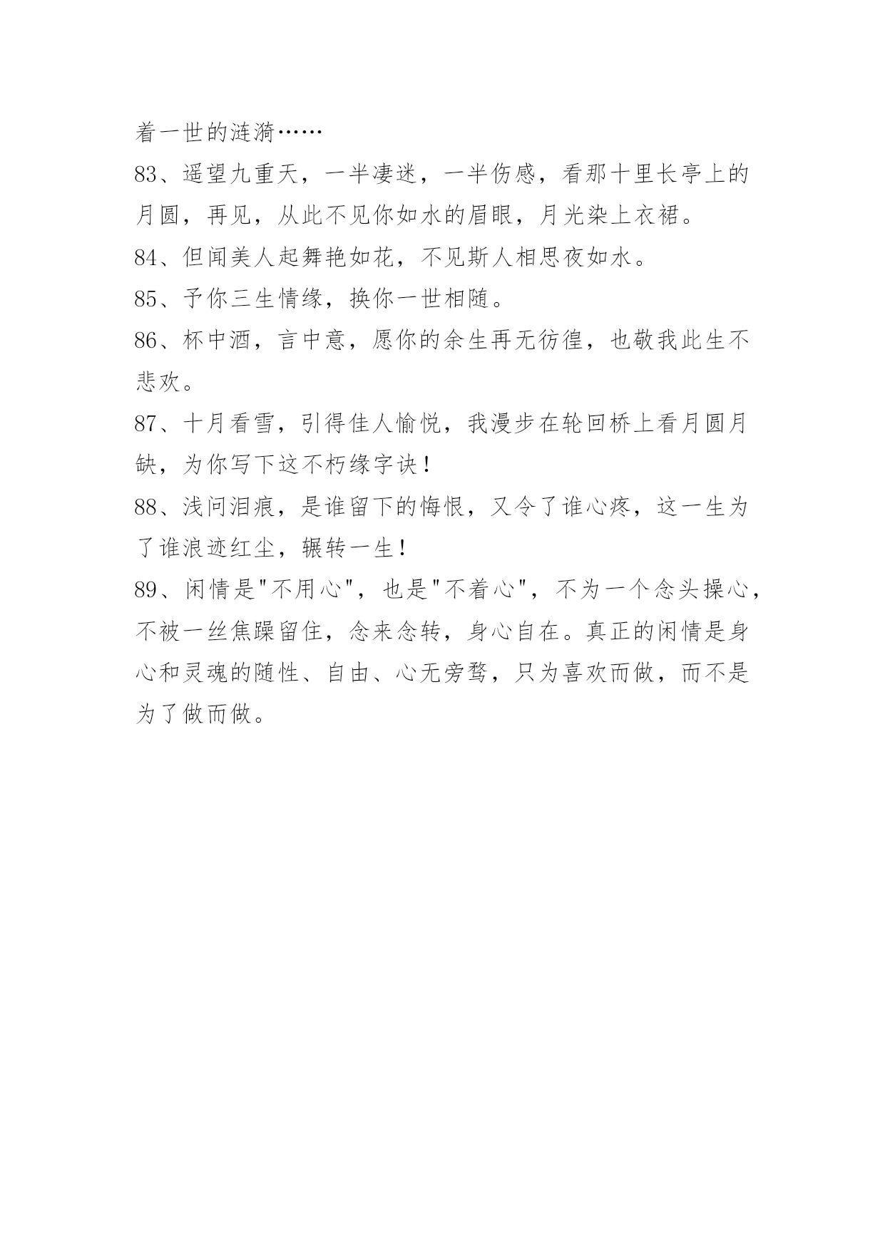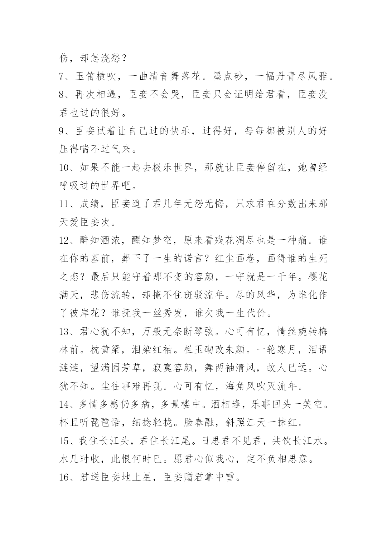 文艺古风句子89条2023年文艺古风句子锦集89条乌云蔽月,人迹踪绝,说不出如斯孤单。以下是关于文艺古风句子89条,仅供参考,大家一起来看看吧。1、日落碧簪外,人行红雨中。幽人诗酒里,又是一春风。杨万里(宋)《春日绝句》2、想君,最后一次想君,向着君的方向吹起长箫,在悠悠月光中,折叠一只白色的纸蝴蝶,放飞风中,在君窗前最后一次翩翩起舞。3、静,花似月,思念纷飞,不退。寒似谁,未曾更变,不觉。4、一帘含香飘逸的樱絮,熏染了一场月圆花满的爱恋。在雨花台前,遥望星语绵绵,不知,那思念的风里,可有你的淡笑温婉。5、瑟瑟的苍穹,绵绵的清愁,在谁的琴曲下柔成了一个千千心结?月落乌啼,那又是唱响了谁的风霜千年?当年一笑惹痴情,注定红尘里,要与在你纠纠缠缠中走过千年。宵的我,无由得却饮醉在了前世的那一场晓风残月里。花深处,杨柳岸边,烟雨楼台依旧是沧海茫茫。6、病柳残香,孤桐疏雨,何堪寂寞楼头?忆别时故里,新月如钩。是羁旅何处?心念老,旧梦难酬。思远,情亦去远,独我悲秋。幽。长不寐,纵使意千回,枉自凝眸。双瞳翦翦,尽付离忧。见花前月影,又记起,昨日兰舟。前雨,沥沥成伤,却怎浇愁?7、玉笛横吹,一曲清音舞落花。墨点砂,一幅丹青尽风雅。8、再次相遇,臣妾不会哭,臣妾只会证明给君看,臣妾没君也过的很好。9、臣妾试着让自己过的快乐,过得好,每每都被别人的好压得喘不过气来。10、如果不能一起去极乐世界,那就让臣妾停留在,她曾经呼吸过的世界吧。11、成绩,臣妾追了君几年无怨无悔,只求君在分数出来那天爱臣妾次。12、醉知酒浓,醒知梦空,原来看残花凋尽也是一种痛。谁在你的墓前,葬下了一生的诺言?红尘画卷,画得谁的生死之恋?最后只能守着那不变的容颜,一守就是一千年。樱花满天,悲伤流转,却掩不住斑驳流年。尽的风华,为谁化作了彼岸花?谁抚我一丝秀发,谁欠我一生代价。13、君心犹不知,万般无奈断琴弦。心可有忆,情丝婉转梅林前。枕黄梁,泪染红袖。栏玉砌改朱颜。一轮寒月,泪语涟涟,望满园芳草,寂寞容颜,舞两袖清风,故人已远。心犹不知。尘往事难再现。心可有忆,海角风吹灭流年。14、多情多感仍多病,多景楼中。酒相逢,乐事回头一笑空。杯且听琵琶语,细捻轻拢。脸春融,斜照江天一抹红。15、我住长江头,君住长江尾。日思君不见君,共饮长江水。水几时收,此恨何时已。愿君心似我心,定不负相思意。16、君送臣妾地上星,臣妾赠君掌中雪。17、沉溺于死亡的姿态。恨只恨,苍天负臣妾。18、君是臣妾最大的秘密,小心翼翼藏在心底。19、让臣妾感谢君,赠臣妾空欢喜。20、臣妾不再会因君而改变,也不再会犹豫说再见。21、臣妾爱君,没有什么目的。只是爱君。22、不爱臣妾就走开,不要耽误臣妾。23、诗画难习步青云,命无科甲二榜荣。24、芳草句,碧云辞,低徊闲自思。25、多少红尘过客,多少过往云烟,一声离别,天涯流散。彩蝶水袖舞清风,暖玉生烟琴几何;梦里销香伊人梦,晓月初升照旧人;秦淮河畔鸳鸯醉,天上宫阙桂花飞。醉眼,泪点伊人颜。心字犹缺,情缘搁浅,一生离散,我却始终落不下那一笔,终是把思念留在那似水年间。26、君已不复,情依旧,但无处可归。27、徐风入夜花影斜,清灯暗许美人歇,几重相思几重叠。28、相思红颜老,守望田园居,闲来梦故人,应似初见时。29、琉璃梳子抚青丝,画心牵肠痴不痴,荧珑镜子映空闺,渡水跋山归不归。30、谁将烟弥散,散了纵横的牵绊,听弦断,断那三千痴缠。31、一世寂寞,不诉离殇。海枯石烂,念念不忘。32、三寸骨,两分情,一曲离殇醉得月朦胧……33、草木葱郁的山间,溪流涓涓的河岸,想起,倾城天下,容华谢后,过尽千帆的容颜,曲终人散的画面,也不过是往事如烟,山河永寂,不如,做一朵陌上花,艳不求名,静静地躺在河畔草木的怀抱里,或者悄悄地卧在青山角落的缝隙里。34、更倾寒食泪,欲涨冶城潮。35、在烟花柳巷深处,是谁,执手相看,无语凝噎?是谁,衣带渐宽,始终不悔?36、人面桃花相交映,桃花飘零,桃花映,桃花深处,桃花梦,梦里桃花,挑花人。37、风止于秋水,而我止于你。38、睁开眼没有灯火万千,闭上眼是从前,我寻你于万物之间。39、寻遍三生兜兜转转,灼灼桃林之下,还是只想与你执手死生契阔。40、一世长安一生欢喜,无求于天逐我本罪。41、飞,渐渐忘素素纤指,不知怎思量。莫问落花将何方,落也伤,留也凉。42、不辞山路远,踏雪也相过。43、猖狂尘世破樊篱,王者狮子衣,败者白骨皮。44、掬水碎月,只贪微凉。45、清夜何湛湛,孤烛映兰幕。46、你要记得,那年那月,垂柳紫陌洛城东。就这样吧,从此山水不相逢。47、唯美我总是在想,我的记忆是不是活在长街的那头,而我的年轮死在长街的这头、握住苍老,禁锢了时空,一下子到了地老天荒、无论多么落寂和苍茫那些身影总会过目不忘、雾散,梦醒,我终于看见真实,那是千帆过尽的沉寂。
