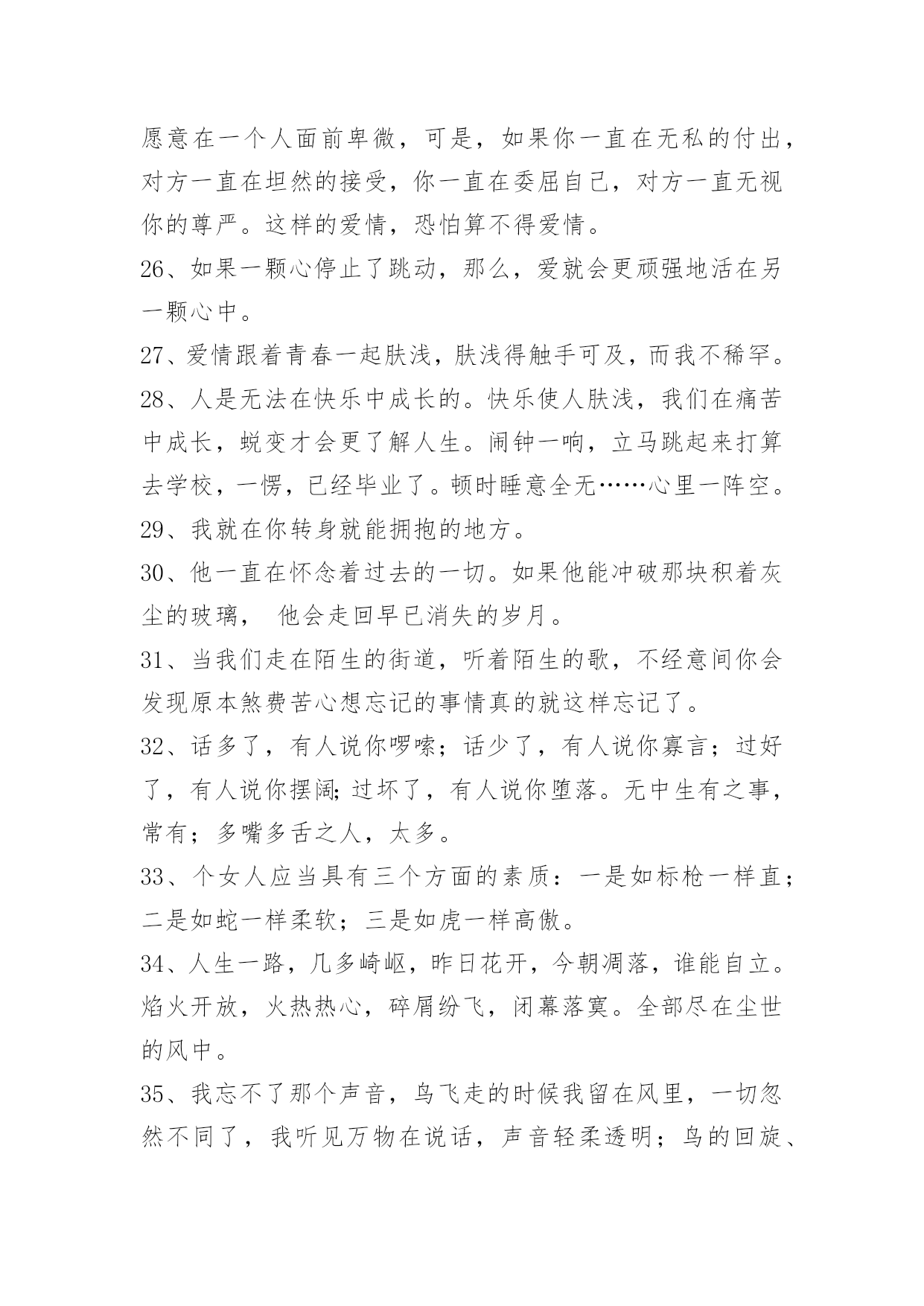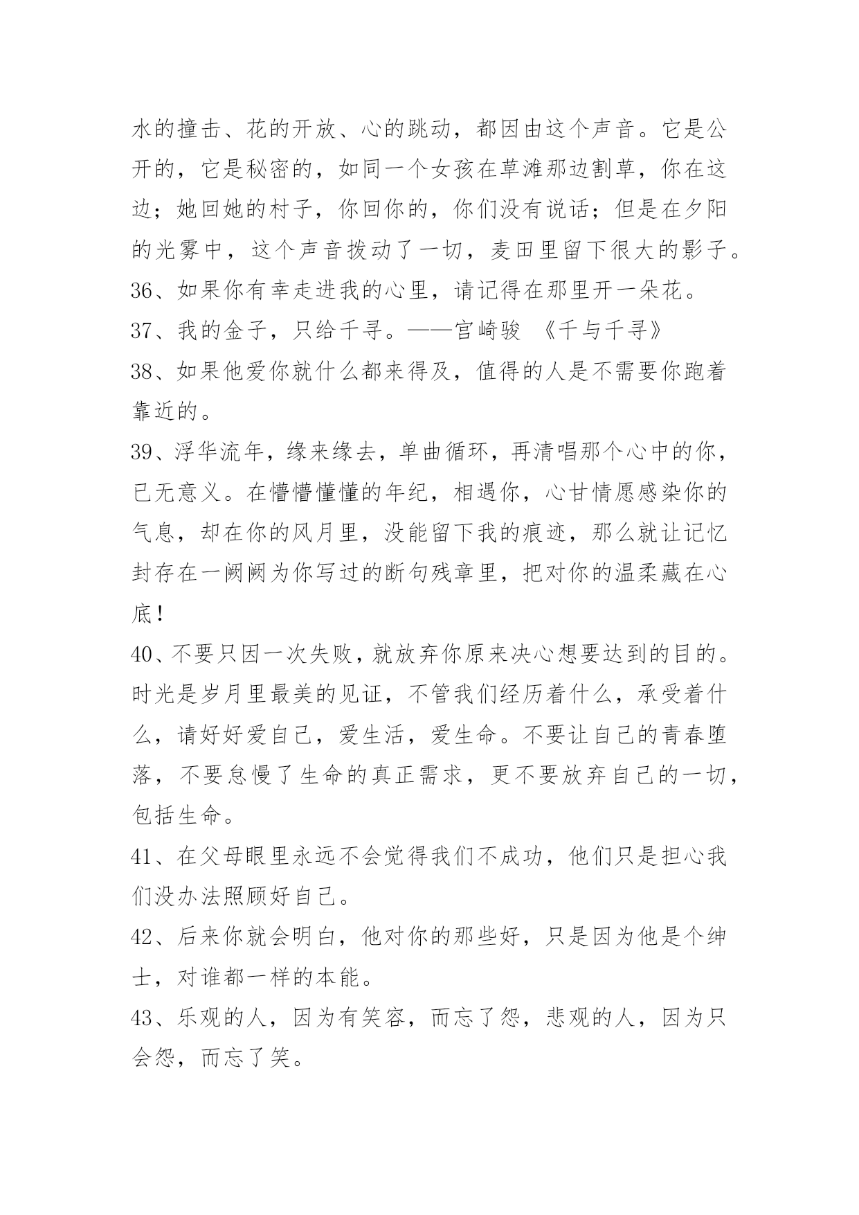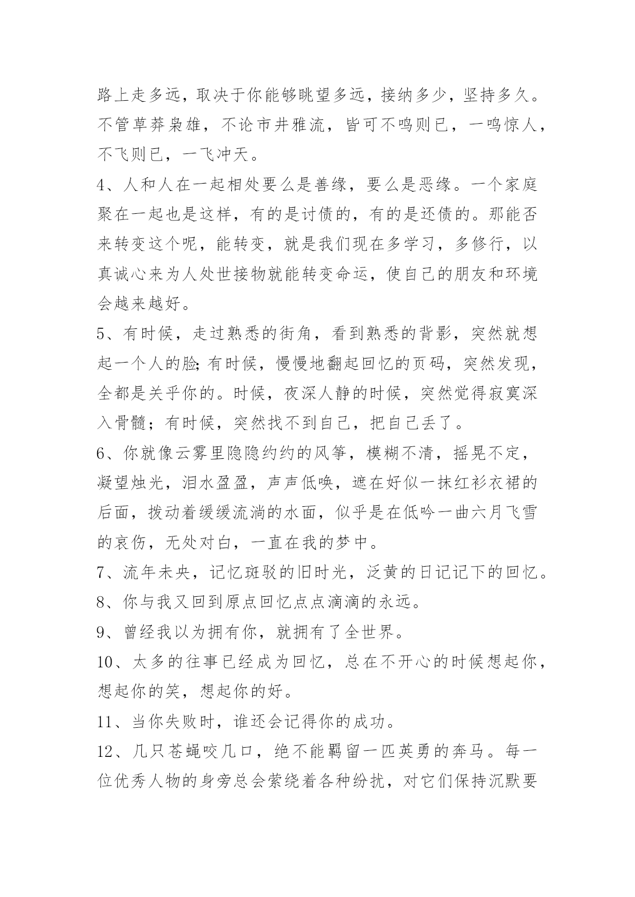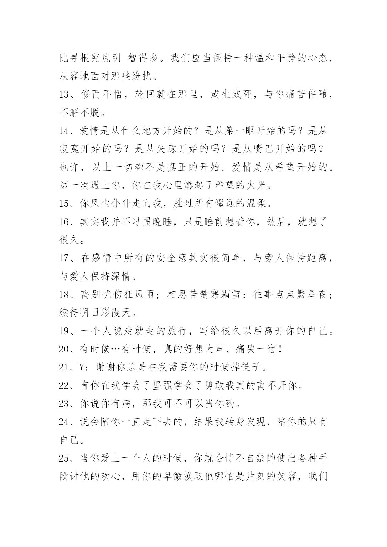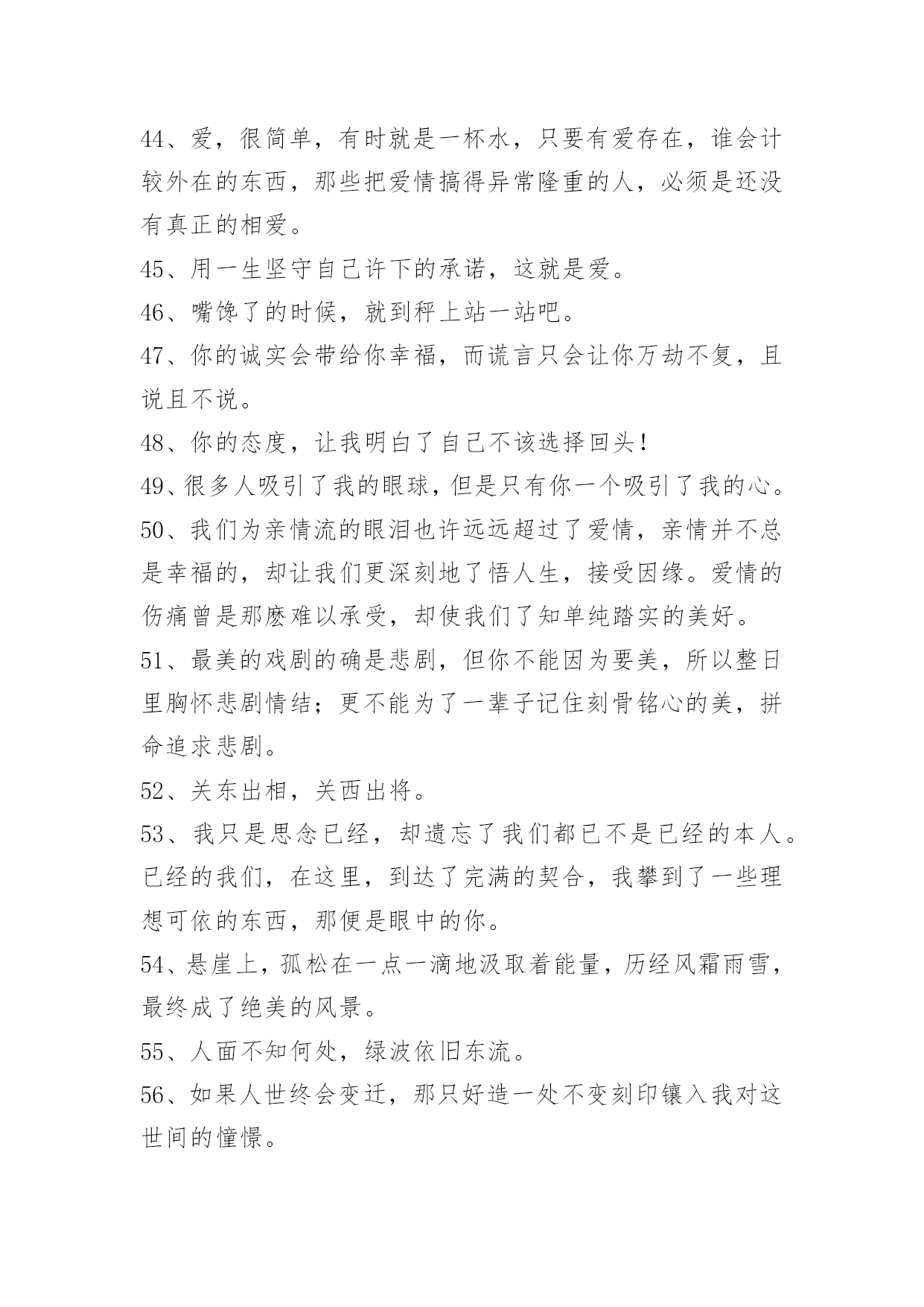 唯美的生活语录摘录2024年通用唯美的生活语录摘录56句对于旅行,从来都记忆模糊。记不得都去了哪些地方,看了哪些风景,遇到哪些人。尽管同学说,去旅行不在于记忆,而在于当时的那份情绪。但是旅行的彼时那刻我的情绪一向是好的吗?一向有记日记的习惯,但是,旅行回来,都懒得写日记来记录,可见内心底对旅行是多么的淡漠。下面是小编精心准备的唯美的生活语录56句,仅供参考,大家一起来看看吧。1、悲伤那么长,淋湿了方向,过去现在未来只在水中央;思念那么深,遮住了梦一场,让鸟儿留在他乡;一双翅膀飞跃了苍茫,从此天上人间都是好时光。装不了的难言,也只对镜子望;剪断红颜独自望月,还是感伤。2、真正的幸福与快乐并不在于你的手中拥有多少外在的物质,而在于你的内心能够容纳多少高贵而美妙的思想。人的一生,从某种角度来说就是一种不断地拥有和失去的过程。在经历过无数次的拥有与失去之后,才能意识到,获得幸福与快乐的关键并不是去无休止地追求什么,而是在适当的时候学会去放弃什么。3、高山不弃顽石,故能铸其巍峨;海洋不拒涓流,故能荡其雄浑;大地不舍万物,故能承载风雨;我们不拘一格,故能傲视乾坤。小天地大舞台,小视野大境界,你能在人生的路上走多远,取决于你能够眺望多远,接纳多少,坚持多久。不管草莽枭雄,不论市井雅流,皆可不鸣则已,一鸣惊人,不飞则已,一飞冲天。4、人和人在一起相处要么是善缘,要么是恶缘。一个家庭聚在一起也是这样,有的是讨债的,有的是还债的。那能否来转变这个呢,能转变,就是我们现在多学习,多修行,以真诚心来为人处世接物就能转变命运,使自己的朋友和环境会越来越好。5、有时候,走过熟悉的街角,看到熟悉的背影,突然就想起一个人的脸;有时候,慢慢地翻起回忆的页码,突然发现,全都是关乎你的。时候,夜深人静的时候,突然觉得寂寞深入骨髓;有时候,突然找不到自己,把自己丢了。6、你就像云雾里隐隐约约的风筝,模糊不清,摇晃不定,凝望烛光,泪水盈盈,声声低唤,遮在好似一抹红衫衣裙的后面,拨动着缓缓流淌的水面,似乎是在低吟一曲六月飞雪的哀伤,无处对白,一直在我的梦中。7、流年未央,记忆斑驳的旧时光,泛黄的日记记下的回忆。8、你与我又回到原点回忆点点滴滴的永远。9、曾经我以为拥有你,就拥有了全世界。10、太多的往事已经成为回忆,总在不开心的时候想起你,想起你的笑,想起你的好。11、当你失败时,谁还会记得你的成功。12、几只苍蝇咬几口,绝不能羁留一匹英勇的奔马。每一位优秀人物的身旁总会萦绕着各种纷扰,对它们保持沉默要比寻根究底明智得多。我们应当保持一种温和平静的心态,从容地面对那些纷扰。13、修而不悟,轮回就在那里,或生或死,与你痛苦伴随,不解不脱。14、爱情是从什么地方开始的?是从第一眼开始的吗?是从寂寞开始的吗?是从失意开始的吗?是从嘴巴开始的吗?也许,以上一切都不是真正的开始。爱情是从希望开始的。第一次遇上你,你在我心里燃起了希望的火光。15、你风尘仆仆走向我,胜过所有遥远的温柔。16、其实我并不习惯晚睡,只是睡前想着你,然后,就想了很久。17、在感情中所有的安全感其实很简单,与旁人保持距离,与爱人保持深情。18、离别忧伤狂风雨;相思苦楚寒霜雪;往事点点繁星夜;续待明日彩霞天。19、一个人说走就走的旅行,写给很久以后离开你的自己。20、有时候…有时候,真的好想大声、痛哭一宿!21、Y:谢谢你总是在我需要你的时候掉链子。22、有你在我学会了坚强学会了勇敢我真的离不开你。23、你说你有病,那我可不可以当你药。24、说会陪你一直走下去的,结果我转身发现,陪你的只有自己。25、当你爱上一个人的时候,你就会情不自禁的使出各种手段讨他的欢心,用你的卑微换取他哪怕是片刻的笑容,我们愿意在一个人面前卑微,可是,如果你一直在无私的付出,对方一直在坦然的接受,你一直在委屈自己,对方一直无视你的尊严。这样的爱情,恐怕算不得爱情。26、如果一颗心停止了跳动,那么,爱就会更顽强地活在另一颗心中。27、爱情跟着青春一起肤浅,肤浅得触手可及,而我不稀罕。28、人是无法在快乐中成长的。快乐使人肤浅,我们在痛苦中成长,蜕变才会更了解人生。闹钟一响,立马跳起来打算去学校,一愣,已经毕业了。顿时睡意全无……心里一阵空。29、我就在你转身就能拥抱的地方。30、他一直在怀念着过去的一切。如果他能冲破那块积着灰尘的玻璃,他会走回早已消失的岁月。31、当我们走在陌生的街道,听着陌生的歌,不经意间你会发现原本煞费苦心想忘记的事情真的就这样忘记了。32、话多了,有人说你啰嗦;话少了,有人说你寡言;过好了,有人说你摆阔;过坏了,有人说你堕落。无中生有之事,常有;多嘴多舌之人,太多。33、个女人应当具有三个方面的素质:一是如标枪一样直;二是如蛇一样柔软;三是如虎一样高傲。34、人生一路,几多崎岖,昨日花开,今朝凋落,谁能自立。