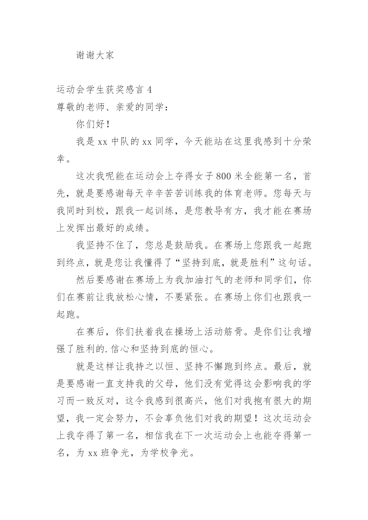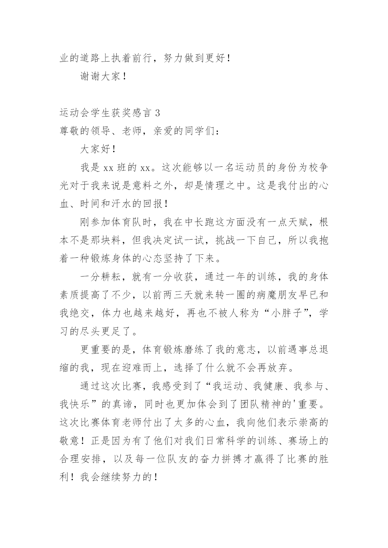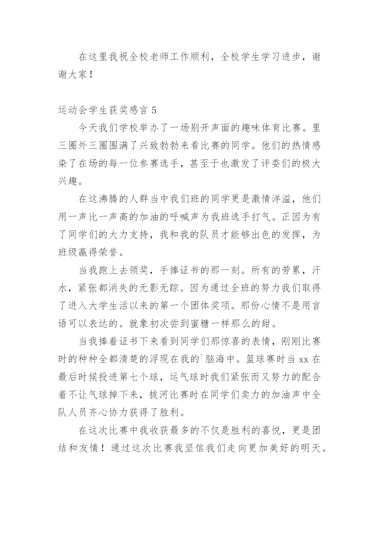 运动会学生获奖感言在日常学习、工作和生活中,我们时常会因不同的人和事内心会有所触动,产生不同的想法,这时写感言就再好不过了。那要怎样写好感言呢?下面是小编收集整理的运动会学生获奖感言,仅供参考,欢迎大家阅读。运动会学生获奖感言1尊敬的各位领导、各位老师、亲爱的同学们:大家下午好!我是应用生物20xx级一班的XX,非常荣幸能作为院运会获奖代表,在这里发言。作为获奖代表,我的心情格外激动,相信此时此刻大家的心情也和我一样难以平静。发展体育运动,增强人民体质是党和国家制定的一项重要方针,是实现民族强盛,国家振兴的重要基础,是社会文明进步的标志。体育兴则民族兴。我院认真贯彻实施这一方针,在全院各部门的努力协作下成功举办了我院第六届学生运动会,在此请允许我代表获奖者对我院的运动会取得圆满成功表示热烈的祝贺。向在为本届运动会付出辛勤劳动的所有工作人员表示诚挚的感谢,正是因为你们我院的运动会才取得圆满成功2400多年前,一位伟大的医学家曾经说过:“阳光、空气、水和运动是生命和健康的源泉。”公元前6世纪,古希腊人有这样一句话:“如果你想健康,快快走路吧!如果你想美丽,快快走路吧!如果你想聪明,快快走路吧!”在10月31日我院举行第六届运动会,就是在践行古代先哲的体育精神,就是在发展和提高我们的健康、美丽和智慧。冬季运动会给我们紧张忙碌的学习生活,带来激情、带来活力;给我们提供了一个展现自我、超越自我的舞台;同时也给我们这些来自不同省份、不同城市的同学们创造了一个相互交流、相互学习的机会。我们借着这个舞台和机会,用我们的智慧和体能,不怕苦、不怕累,团结协作、奋勇向前,充分展现“理学精英”的风采!这次运动会的举行,既是对我院田径运动水平的一次全面检查,也是我院师生精神风貌和综合素质的一次集中展示,虽然下着小雨,时间也仅为一天,但是我们可以看到各位理学健儿顽强拼搏、锐意进取的理学精神,运动会上啦啦队的呐喊声排山倒海,同学们积极参与班上的后勤工作,各级各班凝心聚力,团结一心,展现出空前的集体主义精神,团结拼搏精神,运动健儿们创造出一个又一个的优异成绩,充分展现理学精英的风采,在这一天我们同样可以看到不辞辛劳跟班管理的老师、助班和班委各司其职、兢兢业业,踏实工作为本次比赛做出的巨大努力,因此我代表获奖运动员再次向为本次运动会付出辛劳的'老师和工作人员表示衷心的感谢!院运会结束了,虽然只有短短一天的时间,不能让我们尽情挥洒激情,展示青春,但我们将铭记10月31日,我们将记住一种精神,我们将在以后的学习生活中把“理学精英,锐意创新,生命不息,运动不止”的理学精神带到生活、工作和学习中去,以饱满的热情去创造属于自己的空间!我们要告诉所有人,理学人个个厚积薄发,理学人个个都是精英,生命科学与理学院雄起,生命科学与理学院更强!最后再次祝贺本届院运会取得圆满成功,让我们用双手去拥抱生命科学与理学院更美好的未来!让我们携手同行为生命科学与理学院美好的明天而奋斗!谢谢大家。运动会学生获奖感言2尊敬的各位领导、各位老师:大家好!作为一名运动员,有机会参加比赛并获奖,我很高兴,也非常激动。此时次刻,我想用三个词来表达我的心情。第一个词是感谢。我要感谢学校领导和教练们对我的信任、支持和鼓励,我由衷地感谢你们!(鞠躬)第二个词是自豪。人们常说,一粒种子,只有深深地植根于沃土,才能生机无限;而一名员工,只有置身拼搏创业的氛围,才能蓬勃向上!在领导的信任和教练们的帮助下,小小的我才得以成长,我人生的.画屏上才涂下了一抹最绚烂的色彩。第三个词是行动。为了感谢领导和老师们对我的信和培养,我将把这份感谢与感恩化作行动,将自己的全部智慧与力量奉献给光明支行,勤奋敬业,激情逐梦,在做大做强企业的道路上执着前行,努力做到更好!谢谢大家!运动会学生获奖感言3尊敬的领导、老师,亲爱的同学们:大家好!我是xx班的xx。这次能够以一名运动员的身份为校争光对于我来说是意料之外,却是情理之中。这是我付出的心血、时间和汗水的回报!刚参加体育队时,我在中长跑这方面没有一点天赋,根本不是那块料,但我决定试一试,挑战一下自己,所以我抱着一种锻炼身体的心态坚持了下来。一分耕耘,就有一分收获,通过一年的训练,我的身体素质提高了不少,以前两三天就来转一圈的病魔朋友早已和我绝交,体力也越来越好,再也不被人称为“小胖子”,学习的尽头更足了。更重要的是,体育锻炼磨练了我的意志,以前遇事总退缩的我,现在迎难而上,选择了什么就不会再放弃。通过这次比赛,我感受到了“我运动、我健康、我参与、我快乐”的真谛,同时也更加体会到了团队精神的'重要。这次比赛体育老师付出了太多的心血,我向他们表示崇高的敬意!正是因为有了他们对我们日常科学的训练、赛场上的合理安排,以及每一位队友的奋力拼搏才赢得了比赛的胜利!我会继续努力的!谢谢大家运动会