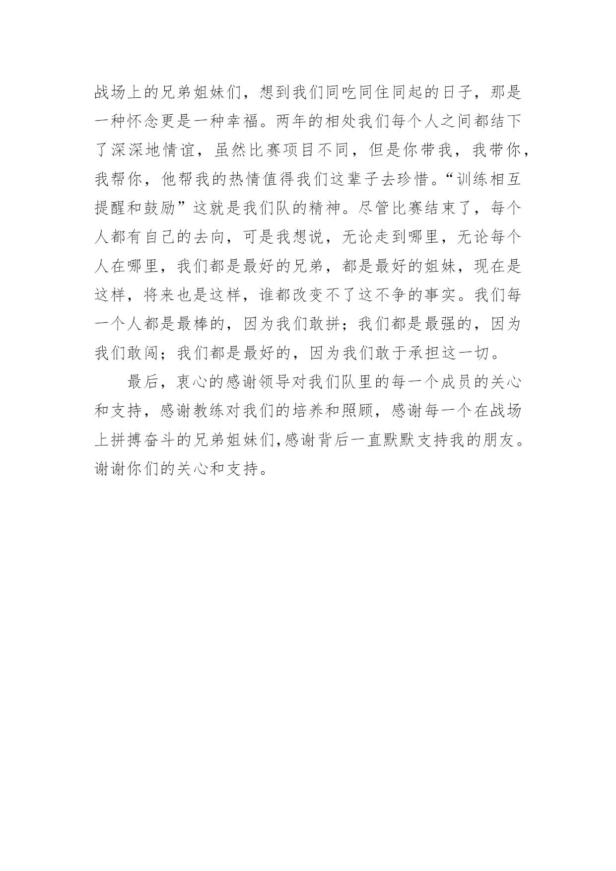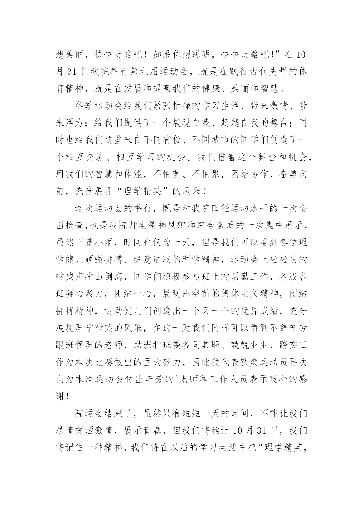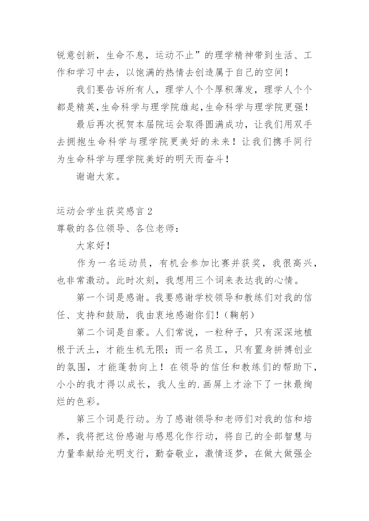 运动会学生获奖感言在日常学习、工作和生活中,我们时常会因不同的人和事内心会有所触动,产生不同的想法,这时写感言就再好不过了。那要怎样写好感言呢?下面是小编收集整理的运动会学生获奖感言,仅供参考,欢迎大家阅读。运动会学生获奖感言1尊敬的各位领导、各位老师、亲爱的同学们:大家下午好!我是应用生物20xx级一班的XX,非常荣幸能作为院运会获奖代表,在这里发言。作为获奖代表,我的心情格外激动,相信此时此刻大家的心情也和我一样难以平静。发展体育运动,增强人民体质是党和国家制定的一项重要方针,是实现民族强盛,国家振兴的重要基础,是社会文明进步的标志。体育兴则民族兴。我院认真贯彻实施这一方针,在全院各部门的努力协作下成功举办了我院第六届学生运动会,在此请允许我代表获奖者对我院的运动会取得圆满成功表示热烈的祝贺。向在为本届运动会付出辛勤劳动的所有工作人员表示诚挚的感谢,正是因为你们我院的运动会才取得圆满成功2400多年前,一位伟大的医学家曾经说过:“阳光、空气、水和运动是生命和健康的源泉。”公元前6世纪,古希腊人有这样一句话:“如果你想健康,快快走路吧!如果你想美丽,快快走路吧!如果你想聪明,快快走路吧!”在10月31日我院举行第六届运动会,就是在践行古代先哲的体育精神,就是在发展和提高我们的健康、美丽和智慧。冬季运动会给我们紧张忙碌的学习生活,带来激情、带来活力;给我们提供了一个展现自我、超越自我的舞台;同时也给我们这些来自不同省份、不同城市的同学们创造了一个相互交流、相互学习的机会。我们借着这个舞台和机会,用我们的智慧和体能,不怕苦、不怕累,团结协作、奋勇向前,充分展现“理学精英”的风采!这次运动会的举行,既是对我院田径运动水平的一次全面检查,也是我院师生精神风貌和综合素质的一次集中展示,虽然下着小雨,时间也仅为一天,但是我们可以看到各位理学健儿顽强拼搏、锐意进取的理学精神,运动会上啦啦队的呐喊声排山倒海,同学们积极参与班上的后勤工作,各级各班凝心聚力,团结一心,展现出空前的集体主义精神,团结拼搏精神,运动健儿们创造出一个又一个的优异成绩,充分展现理学精英的风采,在这一天我们同样可以看到不辞辛劳跟班管理的老师、助班和班委各司其职、兢兢业业,踏实工作为本次比赛做出的巨大努力,因此我代表获奖运动员再次向为本次运动会付出辛劳的'老师和工作人员表示衷心的感谢!院运会结束了,虽然只有短短一天的时间,不能让我们尽情挥洒激情,展示青春,但我们将铭记10月31日,我们将记住一种精神,我们将在以后的学习生活中把“理学精英,锐意创新,生命不息,运动不止”的理学精神带到生活、工作和学习中去,以饱满的热情去创造属于自己的空间!我们要告诉所有人,理学人个个厚积薄发,理学人个个都是精英,生命科学与理学院雄起,生命科学与理学院更强!最后再次祝贺本届院运会取得圆满成功,让我们用双手去拥抱生命科学与理学院更美好的未来!让我们携手同行为生命科学与理学院美好的明天而奋斗!谢谢大家。运动会学生获奖感言2尊敬的各位领导、各位老师:大家好!作为一名运动员,有机会参加比赛并获奖,我很高兴,也非常激动。此时次刻,我想用三个词来表达我的心情。第一个词是感谢。我要感谢学校领导和教练们对我的信任、支持和鼓励,我由衷地感谢你们!(鞠躬)第二个词是自豪。人们常说,一粒种子,只有深深地植根于沃土,才能生机无限;而一名员工,只有置身拼搏创业的氛围,才能蓬勃向上!在领导的信任和教练们的帮助下,小小的我才得以成长,我人生的.画屏上才涂下了一抹最绚烂的色彩。第三个词是行动。为了感谢领导和老师们对我的信和培养,我将把这份感谢与感恩化作行动,将自己的全部智慧与力量奉献给光明支行,勤奋敬业,激情逐梦,在做大做强企业的道路上执着前行,努力做到更好!谢谢大家!运动会学生获奖感言3尊敬的领导、老师,亲爱的同学们:大家好!我是xx班的xx。这次能够以一名运动员的身份为校争光对于我来说是意料之外,却是情理之中。这是我付出的心血、时间和汗水的回报!刚参加体育队时,我在中长跑这方面没有一点天赋,根本不是那块料,但我决定试一试,挑战一下自己,所以我抱着一种锻炼身体的心态坚持了下来。一分耕耘,就有一分收获,通过一年的训练,我的身体素质提高了不少,以前两三天就来转一圈的病魔朋友早已和我绝交,体力也越来越好,再也不被人称为“小胖子”,学习的尽头更足了。更重要的是,体育锻炼磨练了我的意志,以前遇事总退缩的我,现在迎难而上,选择了什么就不会再放弃。通过这次比赛,我感受到了“我运动、我健康、我参与、我快乐”的真谛,同时也更加体会到了团队精神的'重要。这次比赛体育老师付出了太多的心血,我向他们表示崇高的敬意!正是因为有了他们对我们日常科学的训练、赛场上的合理安排,以及每一位队友的奋力拼搏才赢得了比赛的胜利!我会继续努力的!谢谢大家运动会
