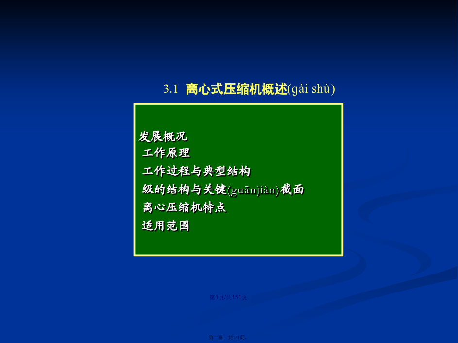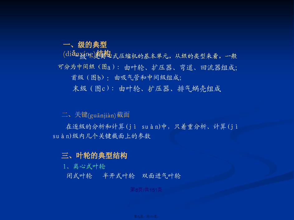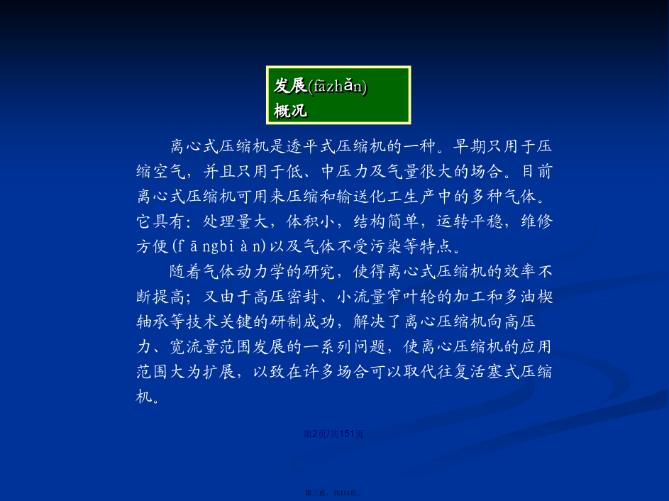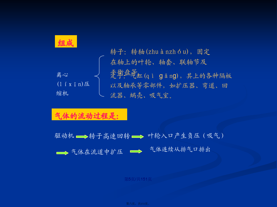 会计学3.1离心式压缩机概述(ɡàishù)发展(fāzhǎn)概况工作(gōngzuò)原理工作过程与典型(diǎnxíng)结构离心(líxīn)压缩机离心式压缩机常用(chánɡyònɡ)术语:级的典型(diǎnxíng)结构与关键截面一、级的典型(diǎnxíng)结构/2、按叶片弯曲形式后弯叶片:弯曲方向与叶轮旋转方向相反,级效率高,β2A<90径向叶片:β2A=90,工作稳定范围宽,常用前弯叶片:弯曲方向与叶轮旋转方向相同,β2A>90,效率低,稳定工作范围较窄,多用于一部分通风机。3、叶轮的速度(sùdù)三角形在讨论其工作原理时,常常会用到叶轮进、出口处的三角形/适用范围3.2基本(jīběn)方程式连续方程是质量守恒定律在流体力学(liútǐlìxué)中的数学表达式,在气体作定常一元流动的情况下,流经机器任意截面的质量流量相等,其连续方程表示为:欧拉方程(fāngchéng)欧拉方程的物理意义为:①欧拉方程指出的是叶轮与流体之间的能量转换关系,它遵循能量转换与守恒定律;②只要知道叶轮进出口的流体速度,即可计算出一千克流体与叶轮之间机械能转换的大小,而不管叶轮内部的流动情况;③适用于任何气体或液体(yètǐ),既适用于叶轮式的压缩机也适用与叶轮式的泵;④推而广之只需将等式右边各项的进出口符号调换一下,亦适用于叶轮式的原动机。能量(néngliàng)方程能量方程的物理意义为:①表示由叶轮所做的机械功,转化为级内气体温度(或焓)的升高和动能的增加;②对有粘无粘的气体都适用,因为对有粘气体所引起的能量损失(sǔnshī)也以热量形式传递给气体,从而式气体温度(焓)升高;③可认为气体在机器内做绝热运动,q=0;④该方程适用于一级,也适用于多级整机或其中任一通流部件,这由所取的进出口截面决定。应用伯努力方程将流体所获得的能量区分为有用能量和能量损失,并引用压缩机中所最关注的压力参数(cānshù),以显示出压力的增加。叶轮所做的机械功还可与级内表征流体压力升高的静压能联系起来,表达成通用的伯努力方程,对级内流体而言有伯努利方程的物理意义为:①表示叶轮所做机械功转换为级中流体的有用能量(静压能和动能增加)的同时,还需付出一部分能量克服流动损失(sǔnshī)或级中的所有损失(sǔnshī);②它建立了机械能与气体压力p、流速c和能量损失(sǔnshī)之间的相互关系;③该方程适用一级,亦适用于多级整机或其中任一通流通部件,这由所取的进出口截面而定;④对于不可压缩流体来说应用伯努利方程计算压力的升高是方便的。而对于可压缩流体,尚需获知压力和密度的函数关系才能求解静压能头积分,这还要联系热力学的基础知识加以解决。压缩(yāsuō)过程与压缩(yāsuō)功将连续方程、欧拉方程、能量方程、伯努利方程、热力过程方程和压缩功的表达式相关联,就可知流量和流体速度在机器中的变化,而通常无论是级的进出口,还是整个压缩机的进出口,其流速几乎相同,故这部分进出口的动能增量可略而不计。同时还可获知由原动机通过轴和叶轮传递给流体的机械能,而其中一部分有用能量即静压能头的增加,使流体的压力得以提高,而另一部分是损失的能量,它是必须付出的代价。还可获知上述静压能头增量和能量损失两者造成流体温度(wēndù)(或焓)的增加,于是流体在机器内的速度、压力、温度(wēndù)等诸参数的变化规律也就都知道了。3.3级内的各种流体(liútǐ)损失式中l为沿程长度,dhm为水平直径,cm为气流平均速度,为磨阻系数,通常级中的Re>Recr,故在一定的相对粗糙度下,λ为常数。由该式可知(kězhī),从而。漏气(lòuqì)损失(1)产生(chǎnshēng)漏气损失的原因(2)密封件的结构(jiégòu)形式及漏气量的计算(3)轮盖密封的漏气(lòuqì)量及漏气(lòuqì)损失系数轮阻损失(sǔnshī)进而可得轮阻损失(sǔnshī)系数为3.4多级压缩(yāsuō)(1)采用(cǎiyòng)多级串联和多缸串联的必要性(2)分段与中间(zhōngjiān)冷却以减少耗功2)用户要求排出的气体温度高,以利于化学反应(由氮、氢化合为氮)或燃烧,则不必采用中间冷却,或尽量减少冷却次数。3)考虑压缩机的具体结构、冷却器的布置、输送(shūsònɡ)冷却水的泵耗功、设备成本与环境条件等综合因素。4)段数确定后,每一段的最佳压力比,可根据总耗功最小的原则来确定。(3)级数与叶轮圆周速度(sùdù)和气体分子量的关系b.级数与气体分子量的关系(guānxì):气体分子量对马赫数的影响;气体分子量对所需压缩功的影响。3.5功率(gōnglǜ)与效率单级总耗功、功率(gōnglǜ)和效率级总耗功、总功率(gōnglǜ)级