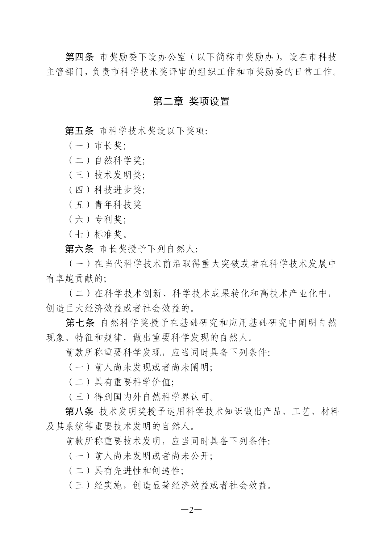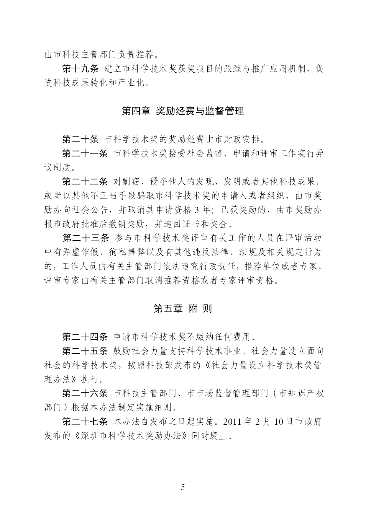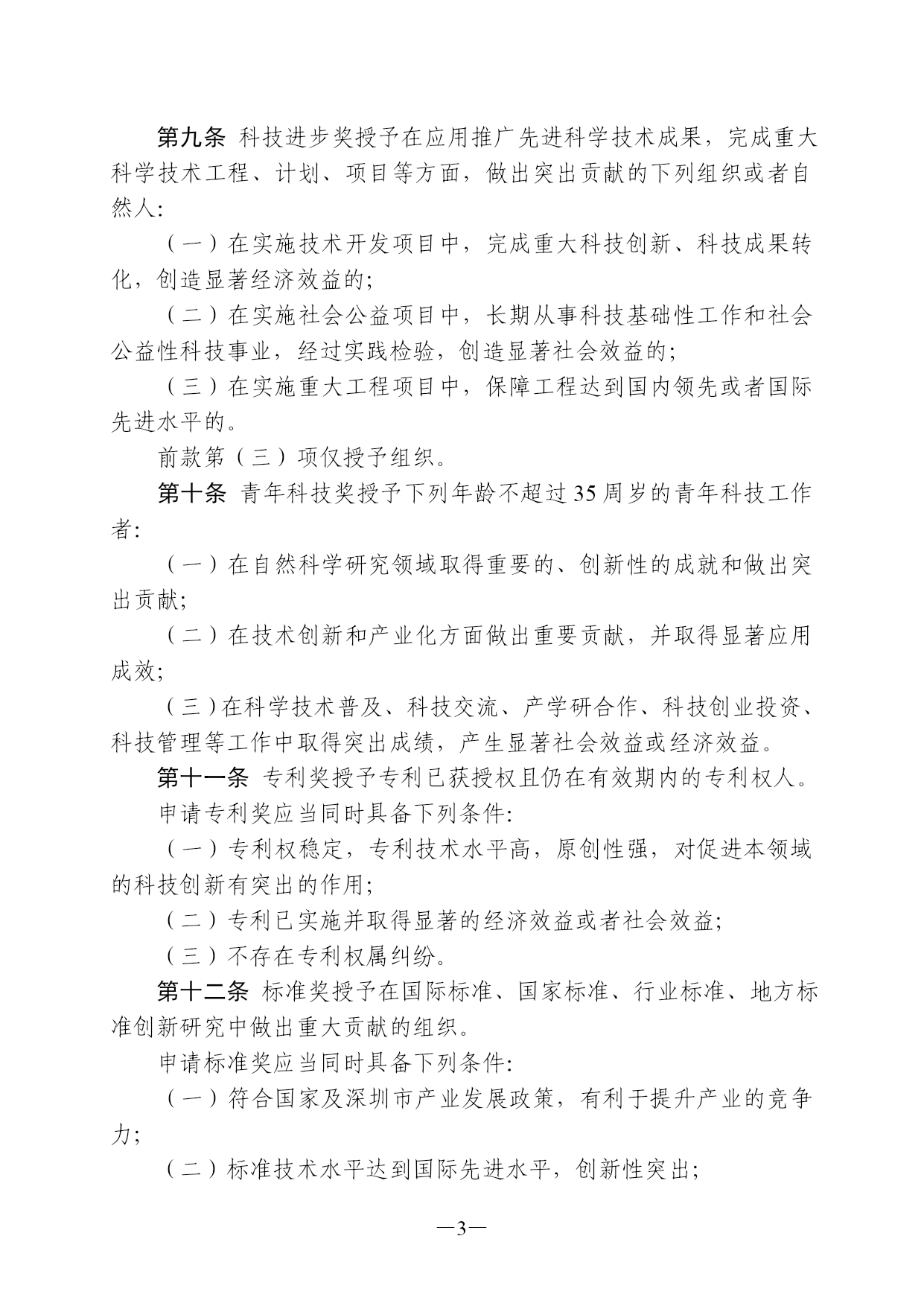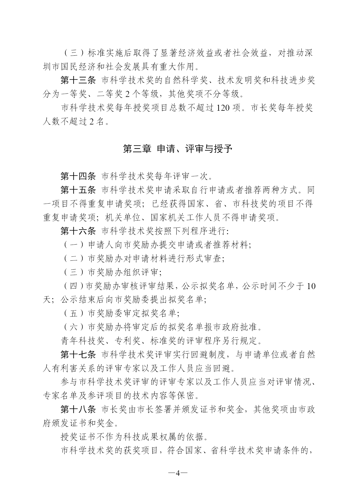 ——深圳市人民政府关于印发深圳市科学技术奖励办法的通知深府〔2012〕126号各区人民政府,市政府直属各单位:《深圳市科学技术奖励办法》已经市政府同意,现予印发,请遵照执行。深圳市人民政府二○一二年十一月二日深圳市科学技术奖励办法第一章总则第一条为了调动广大科技工作者的积极性和创造性,鼓励科技创新,推动科技进步,加快国家创新型城市建设,根据《国家科学技术奖励条例》和《广东省科学技术奖励办法》的有关规定,结合深圳实际,制定本办法。第二条深圳市人民政府设立深圳市科学技术奖(以下简称市科学技术奖)。市科学技术奖的申报、评审和授奖,坚持公开、公平、公正的原则,不受任何组织或者个人的非法干涉。第三条深圳市人民政府设立市科学技术奖励委员会(以下简称市奖励委),由分管副市长担任主任,成员包括市政府各相关部门负责人和专家。市奖励委主要职责是:审议市科学技术奖工作的重大问题,审定市科学技术奖评审结果。第四条市奖励委下设办公室(以下简称市奖励办),设在市科技主管部门,负责市科学技术奖评审的组织工作和市奖励委的日常工作。第二章奖项设置第五条市科学技术奖设以下奖项:(一)市长奖;(二)自然科学奖;(三)技术发明奖;(四)科技进步奖;(五)青年科技奖(六)专利奖;(七)标准奖。第六条市长奖授予下列自然人:(一)在当代科学技术前沿取得重大突破或者在科学技术发展中有卓越贡献的;(二)在科学技术创新、科学技术成果转化和高技术产业化中,创造巨大经济效益或者社会效益的。第七条自然科学奖授予在基础研究和应用基础研究中阐明自然现象、特征和规律,做出重要科学发现的自然人。前款所称重要科学发现,应当同时具备下列条件:(一)前人尚未发现或者尚未阐明;(二)具有重要科学价值;(三)得到国内外自然科学界认可。第八条技术发明奖授予运用科学技术知识做出产品、工艺、材料及其系统等重要技术发明的自然人。前款所称重要技术发明,应当同时具备下列条件:(一)前人尚未发明或者尚未公开;(二)具有先进性和创造性;(三)经实施,创造显著经济效益或者社会效益。第九条科技进步奖授予在应用推广先进科学技术成果,完成重大科学技术工程、计划、项目等方面,做出突出贡献的下列组织或者自然人:(一)在实施技术开发项目中,完成重大科技创新、科技成果转化,创造显著经济效益的;(二)在实施社会公益项目中,长期从事科技基础性工作和社会公益性科技事业,经过实践检验,创造显著社会效益的;(三)在实施重大工程项目中,保障工程达到国内领先或者国际先进水平的。前款第(三)项仅授予组织。第十条青年科技奖授予下列年龄不超过35周岁的青年科技工作者:(一)在自然科学研究领域取得重要的、创新性的成就和做出突出贡献;(二)在技术创新和产业化方面做出重要贡献,并取得显著应用成效;(三)在科学技术普及、科技交流、产学研合作、科技创业投资、科技管理等工作中取得突出成绩,产生显著社会效益或经济效益。第十一条专利奖授予专利已获授权且仍在有效期内的专利权人。申请专利奖应当同时具备下列条件:(一)专利权稳定,专利技术水平高,原创性强,对促进本领域的科技创新有突出的作用;(二)专利已实施并取得显著的经济效益或者社会效益;(三)不存在专利权属纠纷。第十二条标准奖授予在国际标准、国家标准、行业标准、地方标准创新研究中做出重大贡献的组织。申请标准奖应当同时具备下列条件:(一)符合国家及深圳市产业发展政策,有利于提升产业的竞争力;(二)标准技术水平达到国际先进水平,创新性突出;(三)标准实施后取得了显著经济效益或者社会效益,对推动深圳市国民经济和社会发展具有重大作用。第十三条市科学技术奖的自然科学奖、技术发明奖和科技进步奖分为一等奖、二等奖2个等级,其他奖项不分等级。市科学技术奖每年授奖项目总数不超过120项。市长奖每年授奖人数不超过2名。第三章申请、评审与授予第十四条市科学技术奖每年评审一次。第十五条市科学技术奖申请采取自行申请或者推荐两种方式。同一项目不得重复申请奖项;已经获得国家、省、市科技奖的项目不得重复申请奖项;机关单位、国家机关工作人员不得申请奖项。第十六条市科学技术奖按照下列程序进行:(一)申请人向市奖励办提交申请或者推荐材料;(二)市奖励办对申请材料进行形式审查;(三)市奖励办组织评审;(四)市奖励办审核评审结果,公示拟奖名单,公示时间不少于10天;公示结束后向市奖励委提出拟奖名单;(五)市奖励委审定拟奖名单;(六)市奖励办将审定后的拟奖名单报市政府批准。青年科技奖、专利奖、标准奖的评审程序另行规定。第十七条市科学技术奖评审实行回避制度,与申请单位或者自然人有利害关系的评审专家以及工作人员应当回避。参与市科学技术奖评审的评审专家以及工作人员应当对评审情况、专家名单及参评项目的技术内容等