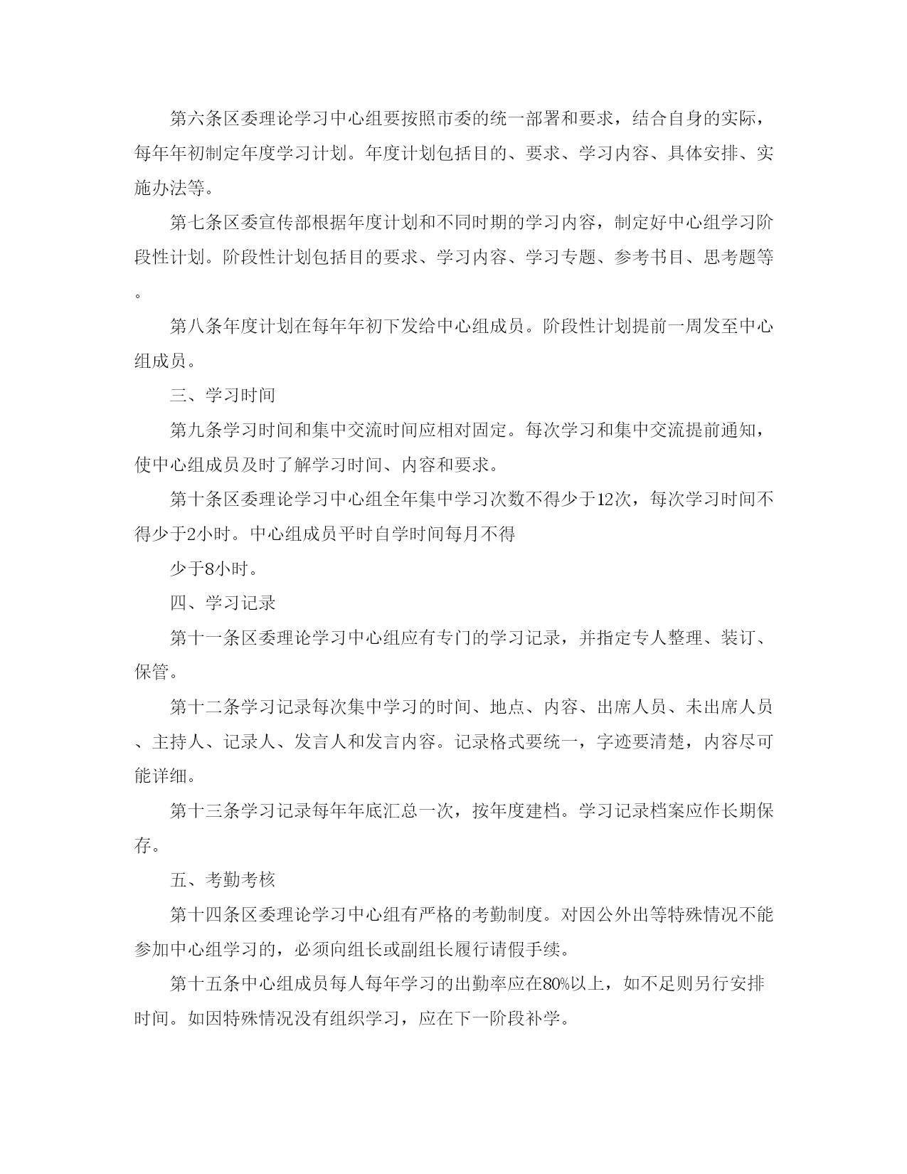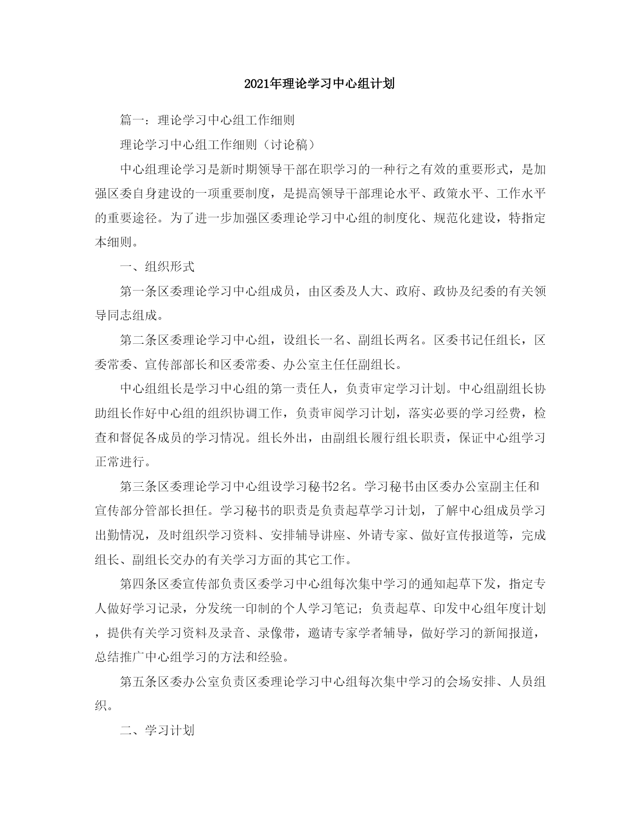 理论学习中心组计划(完整版)文档资料可直接使用,可编辑,欢迎下载2021年理论学习中心组计划篇一:理论学习中心组工作细则理论学习中心组工作细则(讨论稿)中心组理论学习是新时期领导干部在职学习的一种行之有效的重要形式,是加强区委自身建设的一项重要制度,是提高领导干部理论水平、政策水平、工作水平的重要途径。为了进一步加强区委理论学习中心组的制度化、规范化建设,特指定本细则。一、组织形式第一条区委理论学习中心组成员,由区委及人大、政府、政协及纪委的有关领导同志组成。第二条区委理论学习中心组,设组长一名、副组长两名。区委书记任组长,区委常委、宣传部部长和区委常委、办公室主任任副组长。中心组组长是学习中心组的第一责任人,负责审定学习计划。中心组副组长协助组长作好中心组的组织协调工作,负责审阅学习计划,落实必要的学习经费,检查和督促各成员的学习情况。组长外出,由副组长履行组长职责,保证中心组学习正常进行。第三条区委理论学习中心组设学习秘书2名。学习秘书由区委办公室副主任和宣传部分管部长担任。学习秘书的职责是负责起草学习计划,了解中心组成员学习出勤情况,及时组织学习资料、安排辅导讲座、外请专家、做好宣传报道等,完成组长、副组长交办的有关学习方面的其它工作。第四条区委宣传部负责区委学习中心组每次集中学习的通知起草下发,指定专人做好学习记录,分发统一印制的个人学习笔记;负责起草、印发中心组年度计划,提供有关学习资料及录音、录像带,邀请专家学者辅导,做好学习的新闻报道,总结推广中心组学习的方法和经验。第五条区委办公室负责区委理论学习中心组每次集中学习的会场安排、人员组织。二、学习计划第六条区委理论学习中心组要按照市委的统一部署和要求,结合自身的实际,每年年初制定年度学习计划。年度计划包括目的、要求、学习内容、具体安排、实施办法等。第七条区委宣传部根据年度计划和不同时期的学习内容,制定好中心组学习阶段性计划。阶段性计划包括目的要求、学习内容、学习专题、参考书目、思考题等。第八条年度计划在每年年初下发给中心组成员。阶段性计划提前一周发至中心组成员。三、学习时间第九条学习时间和集中交流时间应相对固定。每次学习和集中交流提前通知,使中心组成员及时了解学习时间、内容和要求。第十条区委理论学习中心组全年集中学习次数不得少于12次,每次学习时间不得少于2小时。中心组成员平时自学时间每月不得少于8小时。四、学习记录第十一条区委理论学习中心组应有专门的学习记录,并指定专人整理、装订、保管。第十二条学习记录每次集中学习的时间、地点、内容、出席人员、未出席人员、主持人、记录人、发言人和发言内容。记录格式要统一,字迹要清楚,内容尽可能详细。第十三条学习记录每年年底汇总一次,按年度建档。学习记录档案应作长期保存。五、考勤考核第十四条区委理论学习中心组有严格的考勤制度。对因公外出等特殊情况不能参加中心组学习的,必须向组长或副组长履行请假手续。第十五条中心组成员每人每年学习的出勤率应在80%以上,如不足则另行安排时间。如因特殊情况没有组织学习,应在下一阶段补学。第十六条区委理论学习中心组的学习列为全区社会主义精神文明建设目标和党建工作目标的重要内容。第十七条区委理论学习中心组每半年都要进行一次自查,年终形成书面材料。六、学习成果第十八条区委理论学习中心组每一阶段的学习,都要有一定数量的学习成果,并在学习记录上做好记录。第十九条每人每季度的学习摘录或心得体会不得少于2篇,每年应有一篇以上的调研文章或理论研讨文章。第二十条区委理论学习中心组每年至少举行一次专题调研报告会或理论研讨会。七、研讨交流制度第二十一条区委理论学习中心组的学习应坚持理论联系实际的原则,把个人自学与集中交流结合起来,把专题调研和理论研讨结合起来,在自学和调研基础上,建立集中研讨交流制度。第二十二条区委理论学习中心组的每一位成员,应按照中心组学习计划的统一要求,阅读完规定的书目,做好学习笔记。集中交流要按事先布置的题目,准备发言提纲或书面材料。每次集中交流有重点发言人,围绕主要议题,各抒己见。交流的内容应有深度,能对党员干部的理论学习起一定的指导作用。第二十三条区委理论学习中心组应围绕我区及各单位各部门需要解决的突出问题,每年年初或某个阶段确定一批调研课题,按照中心组成员的分工,分解调研题目。通过深入基层、现场办公、外出考察等途径进行调查。要从理性的高度对调查得来的素材进行分析、研究、综合、和归纳,提出解决问题的办法和措施。八、附则第二十四条区委理论学习中心组学习会,根据工作需要,吸收基层各党委(党组)、党工委中心组成员参加,组织区委两级中心组扩大学习会。第二十五条本细则适用区委理论学习中心组,并将根据形势和任务的需要,予以调整、