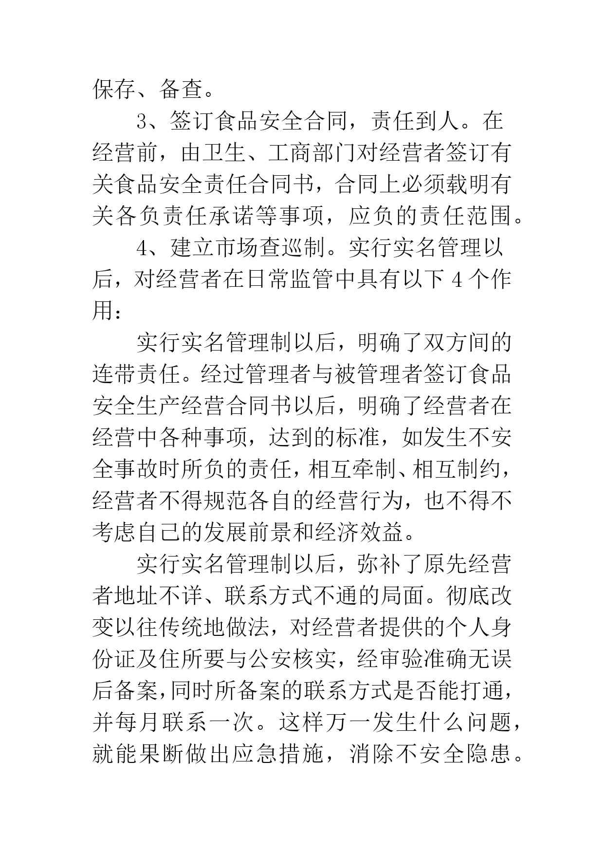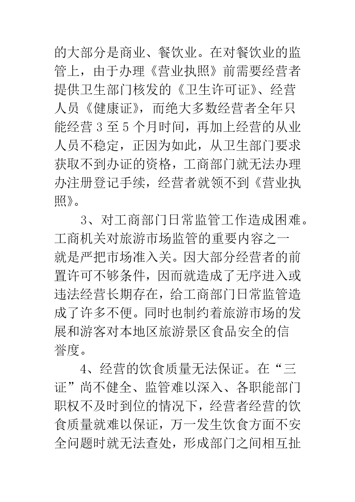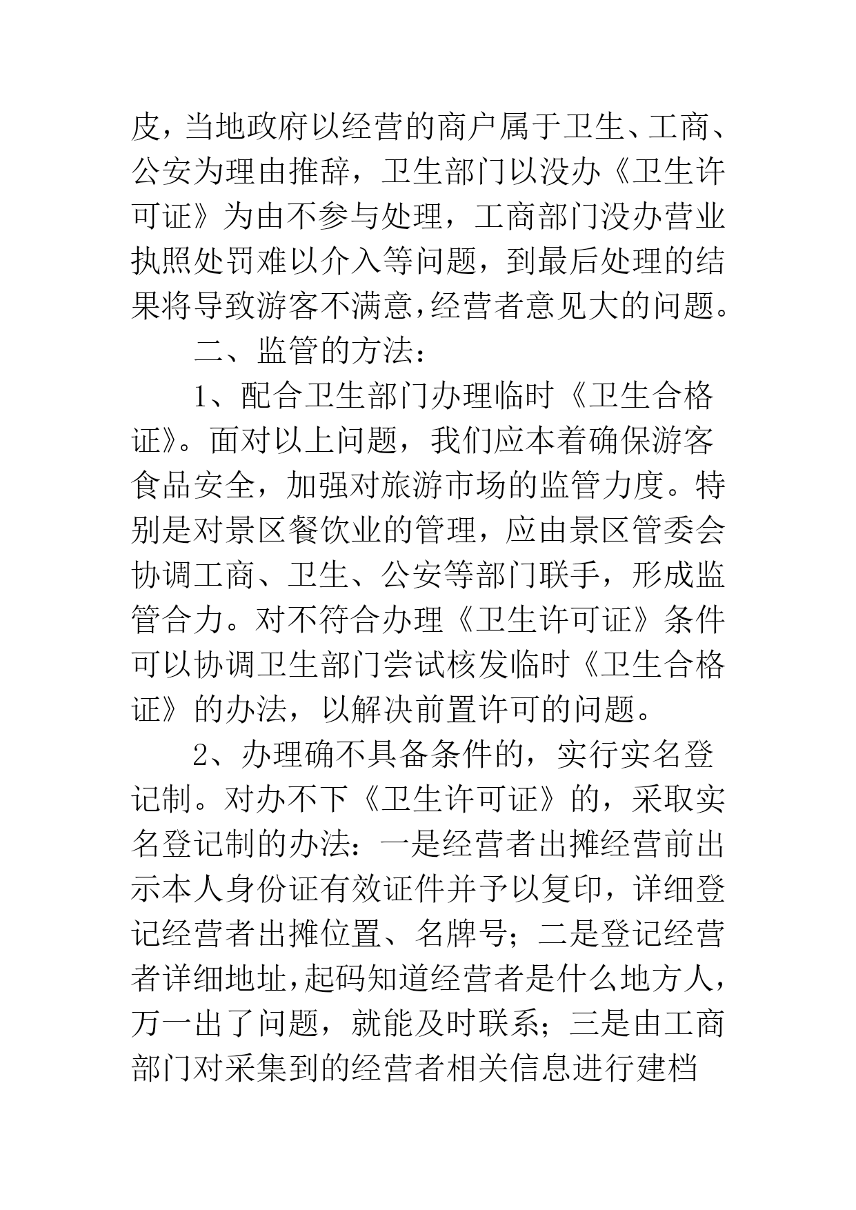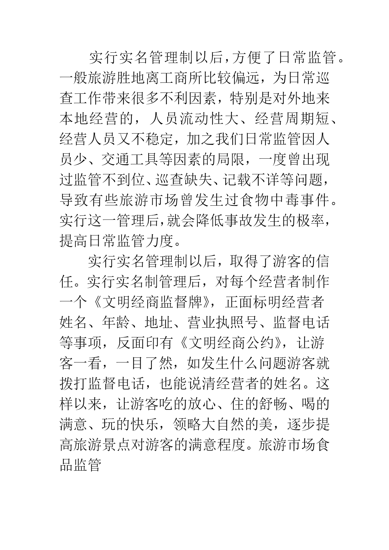 旅游市场食品监管目前正值旅游旺季,确保旅客食品安全,是旅游景点监管的重点,也是工商部门监管的主要对象。针对旅游市场周期短、游客相对集中,食品经营者结构复杂、客流量大、监管难度大等特点,如何加大对旅游市场食品、餐饮的监管,是摆在我们工商部门的首要问题,探索对其监管方式和方法,对于今后监管工作将起到一定的促进作用。一、目前季节性旅游市场餐饮经营存在的问题:1、因经营的条件所制,难以办理《卫生许可证》。这些旅游胜地由于受自然、生活等环境的制约,再加上经营设备简陋,经营周期短,经营地址不固定等因素,按照卫生部门要求,不具备办理《卫生许可证》的条件,因而卫生行政主管部门不予颁发《卫生许可证》。2、因有关前置手续的制约,为办理营业执照造成难度。季节性强的旅游胜地经营的大部分是商业、餐饮业。在对餐饮业的监管上,由于办理《营业执照》前需要经营者提供卫生部门核发的《卫生许可证》、经营人员《健康证》,而绝大多数经营者全年只能经营3至5个月时间,再加上经营的从业人员不稳定,正因为如此,从卫生部门要求获取不到办证的资格,工商部门就无法办理办注册登记手续,经营者就领不到《营业执照》。3、对工商部门日常监管工作造成困难。工商机关对旅游市场监管的重要内容之一就是严把市场准入关。因大部分经营者的前置许可不够条件,因而就造成了无序进入或违法经营长期存在,给工商部门日常监管造成了许多不便。同时也制约着旅游市场的发展和游客对本地区旅游景区食品安全的信誉度。4、经营的饮食质量无法保证。在“三证”尚不健全、监管难以深入、各职能部门职权不及时到位的情况下,经营者经营的饮食质量就难以保证,万一发生饮食方面不安全问题时就无法查处,形成部门之间相互扯皮,当地政府以经营的商户属于卫生、工商、公安为理由推辞,卫生部门以没办《卫生许可证》为由不参与处理,工商部门没办营业执照处罚难以介入等问题,到最后处理的结果将导致游客不满意,经营者意见大的问题。二、监管的方法:1、配合卫生部门办理临时《卫生合格证》。面对以上问题,我们应本着确保游客食品安全,加强对旅游市场的监管力度。特别是对景区餐饮业的管理,应由景区管委会协调工商、卫生、公安等部门联手,形成监管合力。对不符合办理《卫生许可证》条件可以协调卫生部门尝试核发临时《卫生合格证》的办法,以解决前置许可的问题。2、办理确不具备条件的,实行实名登记制。对办不下《卫生许可证》的,采取实名登记制的办法:一是经营者出摊经营前出示本人身份证有效证件并予以复印,详细登记经营者出摊位置、名牌号;二是登记经营者详细地址,起码知道经营者是什么地方人,万一出了问题,就能及时联系;三是由工商部门对采集到的经营者相关信息进行建档保存、备查。3、签订食品安全合同,责任到人。在经营前,由卫生、工商部门对经营者签订有关食品安全责任合同书,合同上必须载明有关各负责任承诺等事项,应负的责任范围。4、建立市场查巡制。实行实名管理以后,对经营者在日常监管中具有以下4个作用:实行实名管理制以后,明确了双方间的连带责任。经过管理者与被管理者签订食品安全生产经营合同书以后,明确了经营者在经营中各种事项,达到的标准,如发生不安全事故时所负的责任,相互牵制、相互制约,经营者不得规范各自的经营行为,也不得不考虑自己的发展前景和经济效益。实行实名管理制以后,弥补了原先经营者地址不详、联系方式不通的局面。彻底改变以往传统地做法,对经营者提供的个人身份证及住所要与公安核实,经审验准确无误后备案,同时所备案的联系方式是否能打通,并每月联系一次。这样万一发生什么问题,就能果断做出应急措施,消除不安全隐患。实行实名管理制以后,方便了日常监管。一般旅游胜地离工商所比较偏远,为日常巡查工作带来很多不利因素,特别是对外地来本地经营的,人员流动性大、经营周期短、经营人员又不稳定,加之我们日常监管因人员少、交通工具等因素的局限,一度曾出现过监管不到位、巡查缺失、记载不详等问题,导致有些旅游市场曾发生过食物中毒事件。实行这一管理后,就会降低事故发生的极率,提高日常监管力度。实行实名管理制以后,取得了游客的信任。实行实名制管理后,对每个经营者制作一个《文明经商监督牌》,正面标明经营者姓名、年龄、地址、营业执照号、监督电话等事项,反面印有《文明经商公约》,让游客一看,一目了然,如发生什么问题游客就拨打监督电话,也能说清经营者的姓名。这样以来,让游客吃的放心、住的舒畅、喝的满意、玩的快乐,领略大自然的美,逐步提高旅游景点对游客的满意程度。旅游市场食品监管