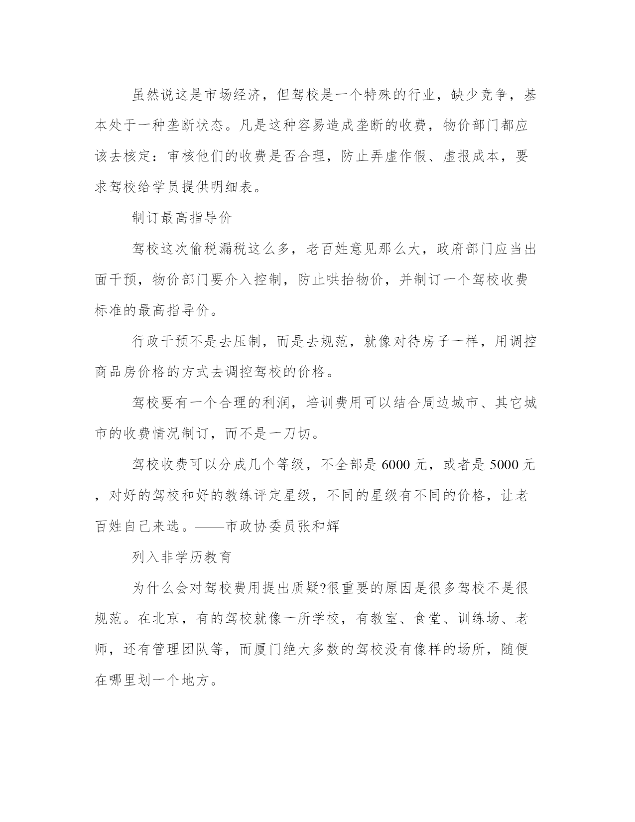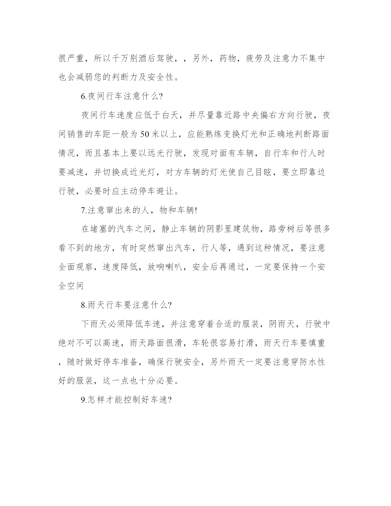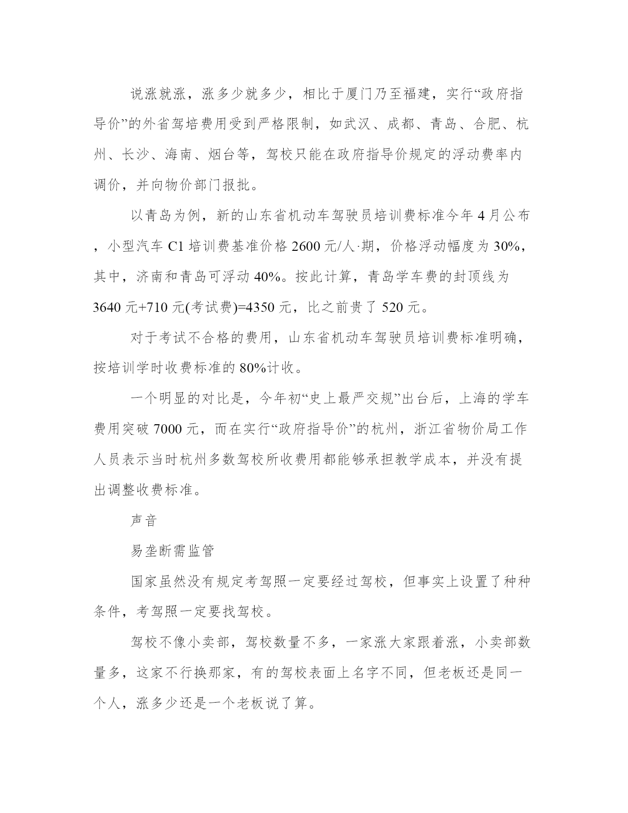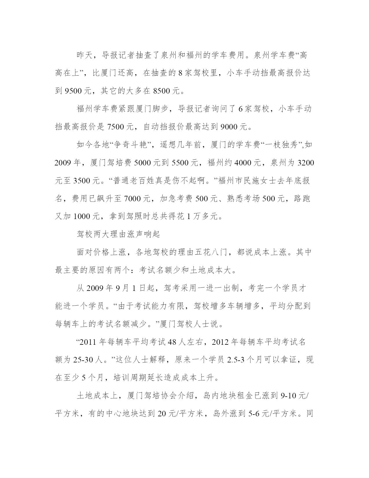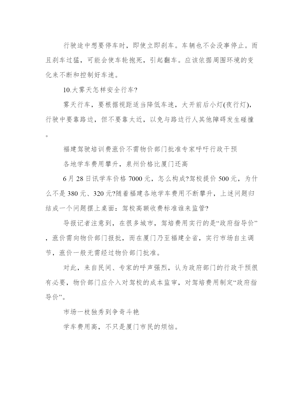 安全驾驶守则和交通守则安全驾驶守则安全交通守则2.确认周围的环境情况,慢慢起步,骑上摩托车将要启动时,从骑行前方道路左右两侧开始到你的后方进行确认,并用转向灯发出信号,确认安全后,慢慢加大油门,启动车辆。3.在泥土或者沙石路上行驶时注意什么?摩托车在土路上行驶必须降低车速,否则会缩短使用寿命。驾驶员要俩腿撑起全身重量,使重量全部用在脚蹬上,身体向前微倾,两手握紧车把,摩托车在沙路上行驶要提前减速,紧握车把,不要使用紧急制动,尤其不要单独使用前制动,以免引起滑倒事故。4.上下坡如何换挡?摩托车上坡时,如果用高速档行驶,就会感到动力不足,会发生停止,后退等现象,应换成抵挡行驶,下坡行驶时,请不要挂高档,以原档位行驶换成抵挡行驶时,请注意速度不要太快,行驶中掌握适当的速度是很重要的。5.为什么酒后驾车交通事故多?饮酒后,会刺激并麻痹人的神经,易使人产生冲动,神志模糊,会极大影响您驾驶状态,酒后开车不仅发生交通事故,而且早成后果很严重,所以千万别酒后驾驶,,另外,药物,疲劳及注意力不集中也会减弱您的判断力及安全性。6.夜间行车注意什么?夜间行车速度应低于白天,并尽量靠近路中央偏右方向行驶,夜间销售的车距一般为50米以上,应能熟练变换灯光和正确地判断路面情况,而且基本上要以远光行驶,发现对面有车辆,自行车和行人时要减速,并切换成近光灯,对方车辆的灯光使自己目眩,要立即靠边行驶,必要时应主动停车避让。7.注意窜出来的人,物和车辆!在堵塞的汽车之间,静止车辆的阴影里建筑物,路旁树后等很多看不到的地方,有时突然窜出汽车,行人等,遇到这种情况,要注意全面观察,速度降低,放响喇叭,安全后再通过,一定要保持一个安全空间8.雨天行车要注意什么?下雨天必须降低车速,并注意穿着合适的服装,阴雨天,行驶中绝对不可以高速,雨天路面很滑,车轮很容易打滑,雨天行车要慎重,随时做好停车准备,确保行驶安全,另外雨天一定要注意穿防水性好的服装,这一点也十分必要。9.怎样才能控制好车速?行驶途中想要停车时,即使立即刹车。车辆也不会没事停止。而且刹车过猛,可能会使车轮抱死,引起翻车。应该依据周围环境的变化来不断和控制好车速。10.大雾天怎样安全行车?雾天行车,要根据视距适当降低车速,大开前后小灯(夜行灯),行驶中要靠路边,但不要靠太近,以免与路边行人其他障碍发生碰撞。福建驾驶培训费涨价不需物价部门批准专家呼吁行政干预各地学车费用攀升,泉州价格比厦门还高6月28日讯学车价格7000元,怎么构成?驾校提价500元,为什么不是380元、320元?随着福建各地学车费用不断攀升,上述问题归结成一个问题摆上桌面:驾校高额收费标准谁来监管?导报记者注意到,在很多城市,驾培费用实行的是“政府指导价”,涨价需向物价部门报批,而在厦门乃至福建全省,实行市场自主调节,涨价一般无需经过物价部门批准。对此,来自民间、专家的呼声强烈,认为政府部门的行政干预很有必要,物价部门应介入对驾校的成本监审,对驾培费用制定“政府指导价”。市场一枝独秀到争奇斗艳学车费用高,不只是厦门市民的烦恼。昨天,导报记者抽查了泉州和福州的学车费用。泉州学车费“高高在上”,比厦门还高,在抽查的8家驾校里,小车手动挡最高报价达到9500元,其它的大多在8500元。福州学车费紧跟厦门脚步,导报记者询问了6家驾校,小车手动挡最高报价是7500元,自动挡报价最高达到9000元。如今各地“争奇斗艳”,遥想几年前,厦门的学车费“一枝独秀”,如2009年,厦门驾培费5000元到5500元,福州约4000元,泉州为3200元至3500元。“普通老百姓真是伤不起啊。”福州市民施女士去年底报名,费用已飙升至7000元,加急考费500元、熟悉考场500元,路跑又加1000元,拿到驾照时总共得花1万多元。驾校两大理由涨声响起面对价格上涨,各地驾校的理由五花八门,都说成本上涨。其中最主要的原因有两个:考试名额少和土地成本大。从2009年9月1日起,驾考采用一进一出制,考完一个学员才能进一个学员。“由于考试能力有限,驾校增多车辆增多,平均分配到每辆车上的考试名额减少。”厦门驾校人士说。“2011年每辆车平均考试48人左右,2012年每辆车平均考试名额为25-30人。”这位人士解释,原来一个学员2.5-3个月可以拿证,现在至少5个月,培训周期延长造成成本上升。土地成本上,厦门驾培协会介绍,岛内地块租金已涨到9-10元/平方米,有的中心地块达到20元/平方米,岛外涨到5-6元/平方米。同时,用地存在极大不稳定性,一旦培训场地被征用,必须重新寻找,造成重复投资建设。反思驾培收费缺乏标准上述情况确实存在,但作为“涨多少”的理由显得缺乏说服力,有市民质疑:一进一出制不是在全国范围实施吗,土地
