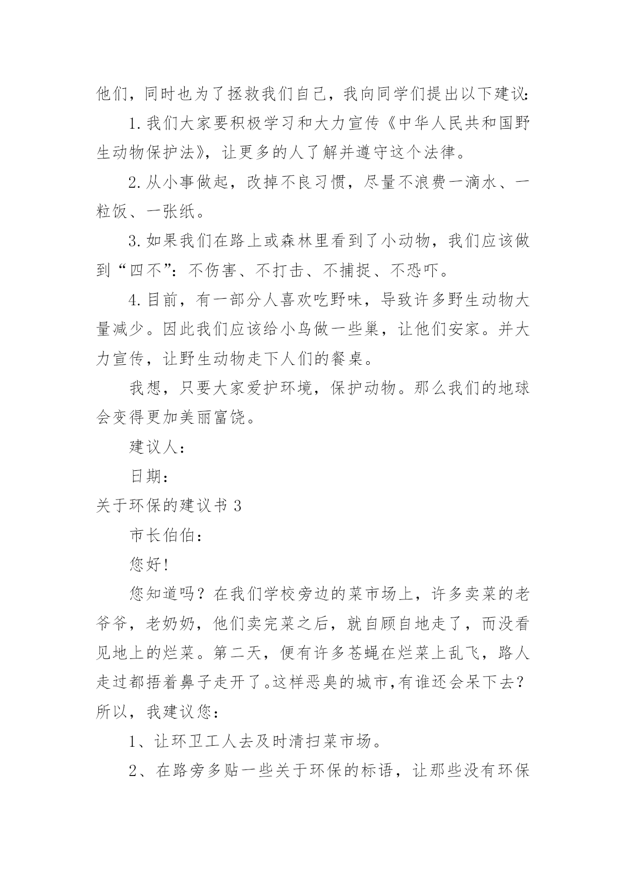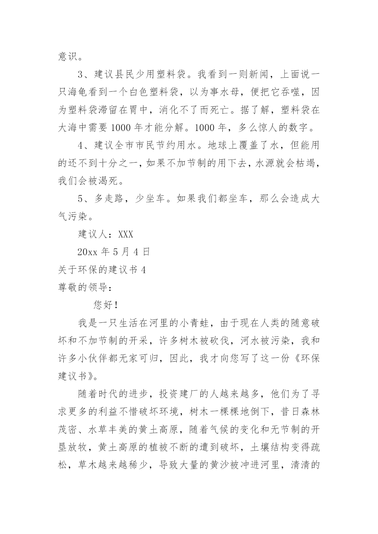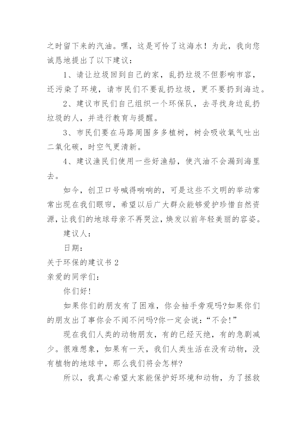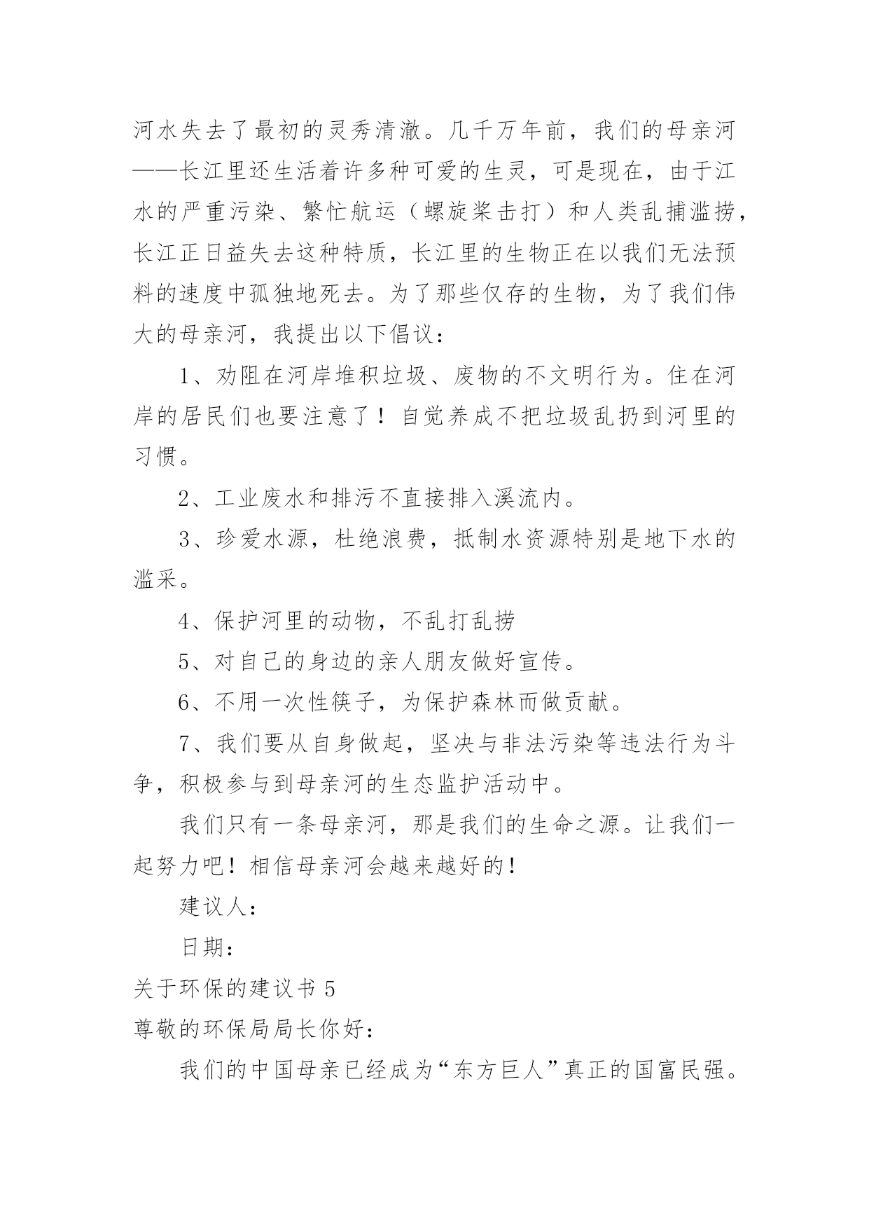 环保的建议书【热】关于环保的建议书在日常生活和工作中,我们都跟建议书有着直接或间接的联系,建议书是就某项工作提出某种建议时使用的一种常用书信,要求具体明确,有针对性。还是对建议书一筹莫展吗?下面是小编整理的关于环保的建议书,供大家参考借鉴,希望可以帮助到有需要的朋友。关于环保的建议书1广大市民们:你们好。我们生长在这个美丽而又富饶的地球上,是地球母亲给了我们一个温暖的家。然而,在此同时,我们却不顾后果的破坏各种资源,不但使他们不能再生,还造成了一系列的生态灾难。在大街上,一些在乱扔垃圾的人屈指可数,还有一些不讲卫生的人随地吐痰,一个个细菌蔓延开来,使人胆战心惊。沈家门近几年来,气温在逐渐上升,不再是冬暖夏凉之地,这还不是人们滥用电资源造成的。夏天,每家每户都开着空调,虽然解决了一时的危机,但给许多人都造成了危害。来到大海边,海面上漂浮着许多杂物,有罐头、水果皮、食品包装袋,甚至还有一些居民扔掉的剩饭与剩菜。大海也不是以前的原样了,在汽油的污染下,原本蓝色的海水变成了黑通通的了,见了使人害怕。这都是一些捕鱼的渔民捕鱼之时留下来的汽油。嘿,这是可怜了这海水!为此,我向您诚恳地提出了以下建议:1、请让垃圾回到自己的家,乱扔垃圾不但影响市容,还污染了环境,请市民们不要乱扔垃圾,更不要扔到海边。2、建议市民们自己组织一个环保队,去寻找身边乱扔垃圾的人,并进行教育与提醒。3、市民们要在马路周围多多植树,树会吸收氧气吐出二氧化碳,时空气更清新。4、建议渔民们使用一些好渔船,使汽油不会漏到海里去。如今,创卫口号喊得响响的,可是这些不文明的举动常常出现在我们眼帘,希望以后广大群众能够爱护珍惜自然资源,让我们的地球母亲不再哭泣,焕发以前年轻美丽的容姿。建议人:日期:关于环保的建议书2亲爱的同学们:你们好!如果你们的朋友有了困难,你会袖手旁观吗?如果你们的朋友出了事你会不闻不问吗?你一定会说:“不会!”现在我们人类的动物朋友,有的已经灭绝,有的急剧减少。很难想象,如果有一天,我们人类生活在没有动物,没有植物的地球中,那么我们将会怎样?所以,我真心希望大家能保护好环境和动物,为了拯救他们,同时也为了拯救我们自己,我向同学们提出以下建议:1.我们大家要积极学习和大力宣传《中华人民共和国野生动物保护法》,让更多的人了解并遵守这个法律。2.从小事做起,改掉不良习惯,尽量不浪费一滴水、一粒饭、一张纸。3.如果我们在路上或森林里看到了小动物,我们应该做到“四不”:不伤害、不打击、不捕捉、不恐吓。4.目前,有一部分人喜欢吃野味,导致许多野生动物大量减少。因此我们应该给小鸟做一些巢,让他们安家。并大力宣传,让野生动物走下人们的餐桌。我想,只要大家爱护环境,保护动物。那么我们的地球会变得更加美丽富饶。建议人:日期:关于环保的建议书3市长伯伯:您好!您知道吗?在我们学校旁边的菜市场上,许多卖菜的老爷爷,老奶奶,他们卖完菜之后,就自顾自地走了,而没看见地上的烂菜。第二天,便有许多苍蝇在烂菜上乱飞,路人走过都捂着鼻子走开了。这样恶臭的城市,有谁还会呆下去?所以,我建议您:1、让环卫工人去及时清扫菜市场。2、在路旁多贴一些关于环保的标语,让那些没有环保意识。3、建议县民少用塑料袋。我看到一则新闻,上面说一只海龟看到一个白色塑料袋,以为事水母,便把它吞噬,因为塑料袋滞留在胃中,消化不了而死亡。据了解,塑料袋在大海中需要1000年才能分解。1000年,多么惊人的数字。4、建议全市市民节约用水。地球上覆盖了水,但能用的还不到十分之一,如果不加节制的用下去,水源就会枯竭,我们会被渴死。5、多走路,少坐车。如果我们都坐车,那么会造成大气污染。建议人:XXX20xx年5月4日关于环保的建议书4尊敬的领导:您好!我是一只生活在河里的小青蛙,由于现在人类的随意破坏和不加节制的开采,许多树木被砍伐,河水被污染,我和许多小伙伴都无家可归,因此,我才向您写了这一份《环保建议书》。随着时代的进步,投资建厂的人越来越多,他们为了寻求更多的利益不惜破坏环境,树木一棵棵地倒下,昔日森林茂密、水草丰美的黄土高原,随着气候的变化和无节制的开垦放牧,黄土高原的植被不断的遭到破坏,土壤结构变得疏松,草木越来越稀少,导致大量的黄沙被冲进河里,清清的河水失去了最初的灵秀清澈。几千万年前,我们的母亲河——长江里还生活着许多种可爱的生灵,可是现在,由于江水的严重污染、繁忙航运(螺旋桨击打)和人类乱捕滥捞,长江正日益失去这种特质,长江里的生物正在以我们无法预料的速度中孤独地死去。为了那些仅存的生物,为了我们伟大的母亲河,我提出以下倡议:1、劝阻在河岸堆积垃圾、废物的不文明行为。住在河岸的居民们也要注意了!自觉养成不把垃圾乱扔到河里的习惯。2、工业废水和排污不直接排入溪流内。3、珍爱水源,杜绝浪费,抵制水资源特别是地下