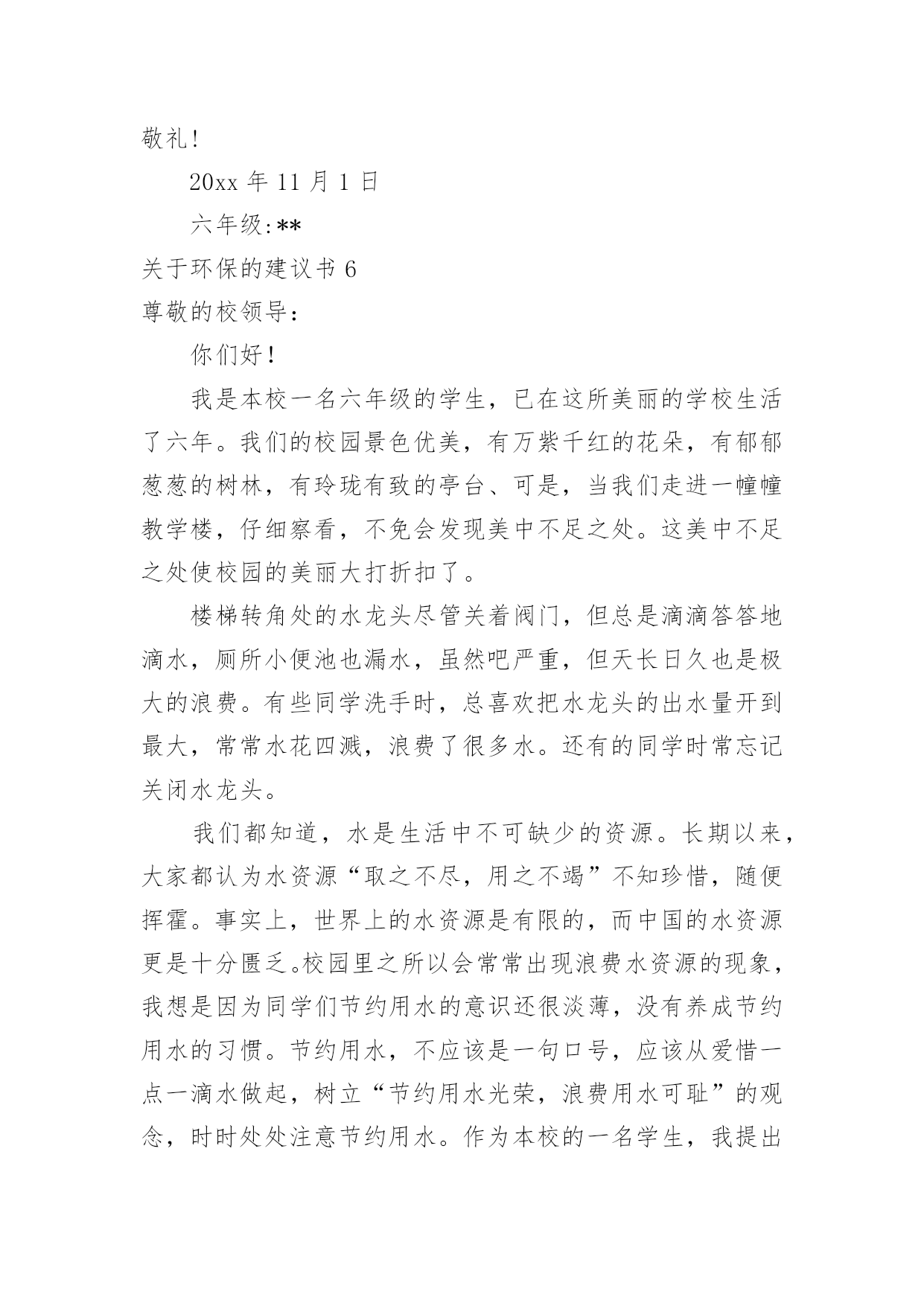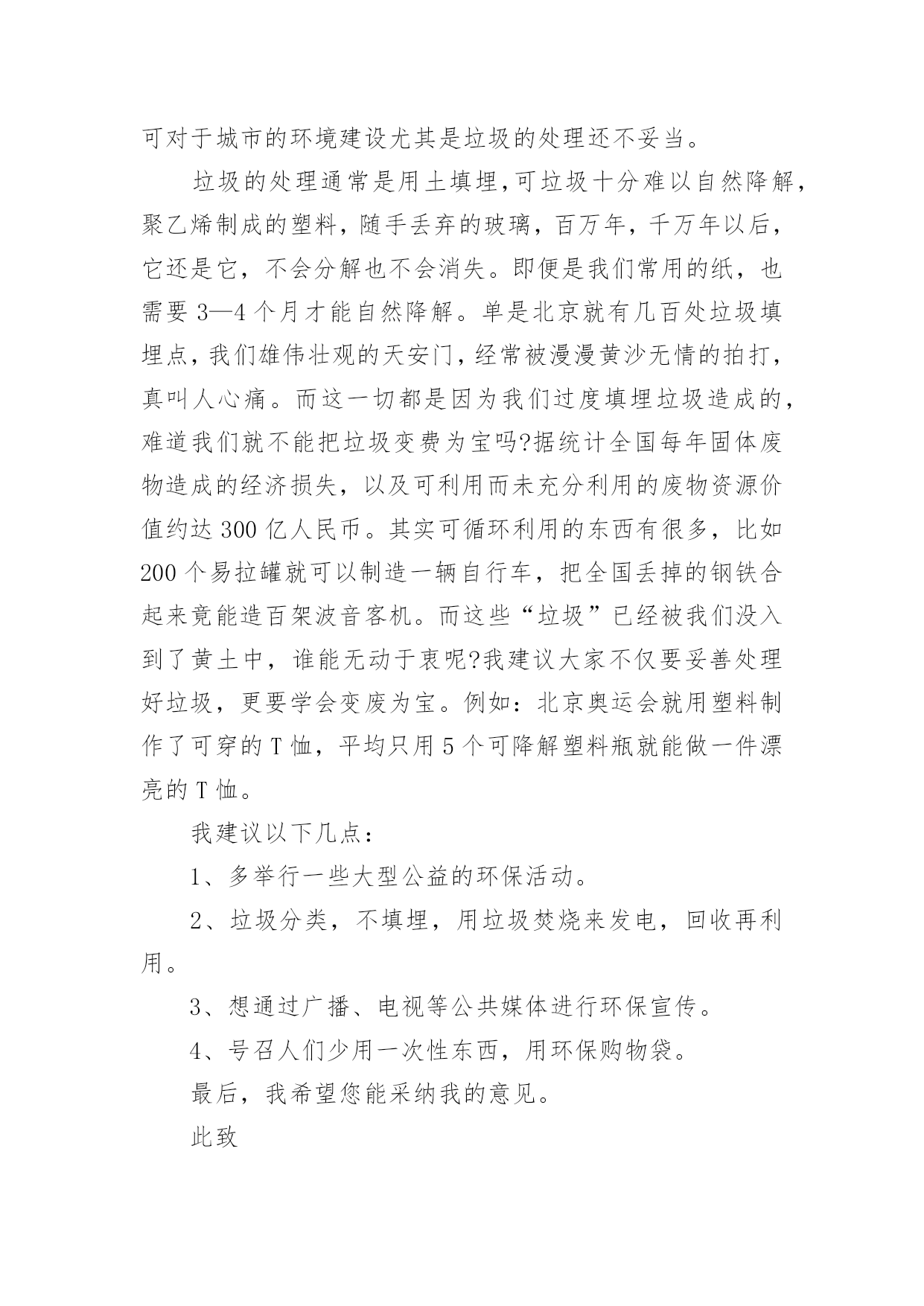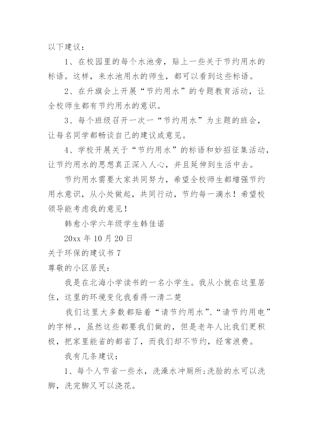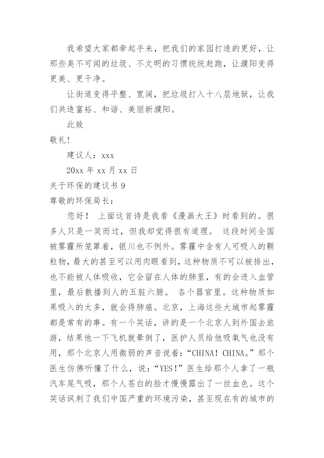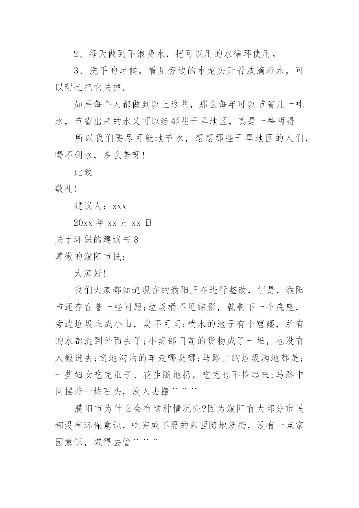 环保的建议书【热】关于环保的建议书在日常生活和工作中,我们都跟建议书有着直接或间接的联系,建议书是就某项工作提出某种建议时使用的一种常用书信,要求具体明确,有针对性。还是对建议书一筹莫展吗?下面是小编整理的关于环保的建议书,供大家参考借鉴,希望可以帮助到有需要的朋友。关于环保的建议书1广大市民们:你们好。我们生长在这个美丽而又富饶的地球上,是地球母亲给了我们一个温暖的家。然而,在此同时,我们却不顾后果的破坏各种资源,不但使他们不能再生,还造成了一系列的生态灾难。在大街上,一些在乱扔垃圾的人屈指可数,还有一些不讲卫生的人随地吐痰,一个个细菌蔓延开来,使人胆战心惊。沈家门近几年来,气温在逐渐上升,不再是冬暖夏凉之地,这还不是人们滥用电资源造成的。夏天,每家每户都开着空调,虽然解决了一时的危机,但给许多人都造成了危害。来到大海边,海面上漂浮着许多杂物,有罐头、水果皮、食品包装袋,甚至还有一些居民扔掉的剩饭与剩菜。大海也不是以前的原样了,在汽油的污染下,原本蓝色的海水变成了黑通通的了,见了使人害怕。这都是一些捕鱼的渔民捕鱼之时留下来的汽油。嘿,这是可怜了这海水!为此,我向您诚恳地提出了以下建议:1、请让垃圾回到自己的家,乱扔垃圾不但影响市容,还污染了环境,请市民们不要乱扔垃圾,更不要扔到海边。2、建议市民们自己组织一个环保队,去寻找身边乱扔垃圾的人,并进行教育与提醒。3、市民们要在马路周围多多植树,树会吸收氧气吐出二氧化碳,时空气更清新。4、建议渔民们使用一些好渔船,使汽油不会漏到海里去。如今,创卫口号喊得响响的,可是这些不文明的举动常常出现在我们眼帘,希望以后广大群众能够爱护珍惜自然资源,让我们的地球母亲不再哭泣,焕发以前年轻美丽的容姿。建议人:日期:关于环保的建议书2亲爱的同学们:你们好!如果你们的朋友有了困难,你会袖手旁观吗?如果你们的朋友出了事你会不闻不问吗?你一定会说:“不会!”现在我们人类的动物朋友,有的已经灭绝,有的急剧减少。很难想象,如果有一天,我们人类生活在没有动物,没有植物的地球中,那么我们将会怎样?所以,我真心希望大家能保护好环境和动物,为了拯救他们,同时也为了拯救我们自己,我向同学们提出以下建议:1.我们大家要积极学习和大力宣传《中华人民共和国野生动物保护法》,让更多的人了解并遵守这个法律。2.从小事做起,改掉不良习惯,尽量不浪费一滴水、一粒饭、一张纸。3.如果我们在路上或森林里看到了小动物,我们应该做到“四不”:不伤害、不打击、不捕捉、不恐吓。4.目前,有一部分人喜欢吃野味,导致许多野生动物大量减少。因此我们应该给小鸟做一些巢,让他们安家。并大力宣传,让野生动物走下人们的餐桌。我想,只要大家爱护环境,保护动物。那么我们的地球会变得更加美丽富饶。建议人:日期:关于环保的建议书3市长伯伯:您好!您知道吗?在我们学校旁边的菜市场上,许多卖菜的老爷爷,老奶奶,他们卖完菜之后,就自顾自地走了,而没看见地上的烂菜。第二天,便有许多苍蝇在烂菜上乱飞,路人走过都捂着鼻子走开了。这样恶臭的城市,有谁还会呆下去?所以,我建议您:1、让环卫工人去及时清扫菜市场。2、在路旁多贴一些关于环保的标语,让那些没有环保意识。3、建议县民少用塑料袋。我看到一则新闻,上面说一只海龟看到一个白色塑料袋,以为事水母,便把它吞噬,因为塑料袋滞留在胃中,消化不了而死亡。据了解,塑料袋在大海中需要1000年才能分解。1000年,多么惊人的数字。4、建议全市市民节约用水。地球上覆盖了水,但能用的还不到十分之一,如果不加节制的用下去,水源就会枯竭,我们会被渴死。5、多走路,少坐车。如果我们都坐车,那么会造成大气污染。建议人:XXX20xx年5月4日关于环保的建议书4尊敬的领导:您好!我是一只生活在河里的小青蛙,由于现在人类的随意破坏和不加节制的开采,许多树木被砍伐,河水被污染,我和许多小伙伴都无家可归,因此,我才向您写了这一份《环保建议书》。随着时代的进步,投资建厂的人越来越多,他们为了寻求更多的利益不惜破坏环境,树木一棵棵地倒下,昔日森林茂密、水草丰美的黄土高原,随着气候的变化和无节制的开垦放牧,黄土高原的植被不断的遭到破坏,土壤结构变得疏松,草木越来越稀少,导致大量的黄沙被冲进河里,清清的河水失去了最初的灵秀清澈。几千万年前,我们的母亲河——长江里还生活着许多种可爱的生灵,可是现在,由于江水的严重污染、繁忙航运(螺旋桨击打)和人类乱捕滥捞,长江正日益失去这种特质,长江里的生物正在以我们无法预料的速度中孤独地死去。为了那些仅存的生物,为了我们伟大的母亲河,我提出以下倡议:1、劝阻在河岸堆积垃圾、废物的不文明行为。住在河岸的居民们也要注意了!自觉养成不把垃圾乱扔到河里的习惯。2、工业废水和排污不直接排入溪流内。3、珍爱水源,杜绝浪费,抵制水资源特别是地下