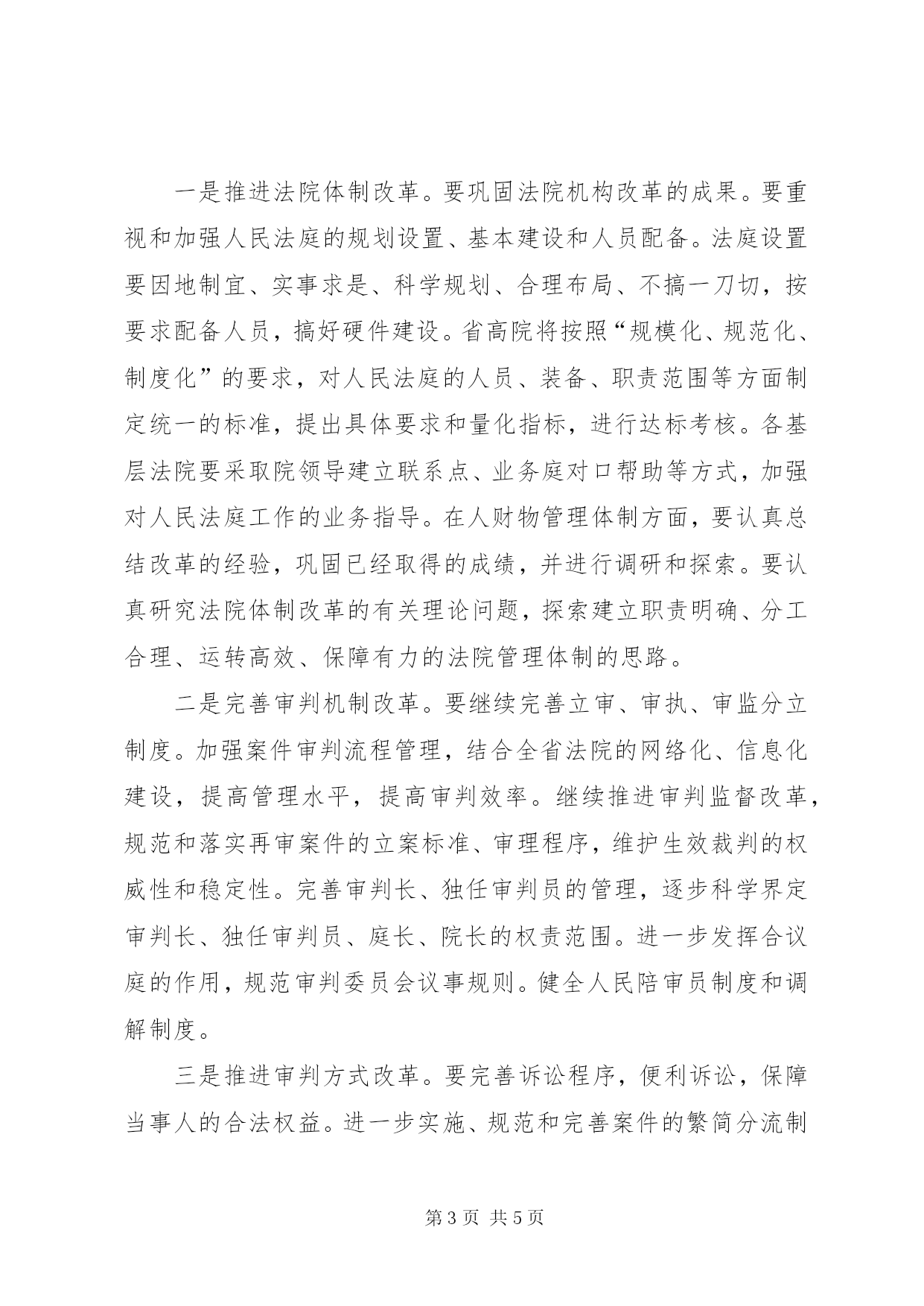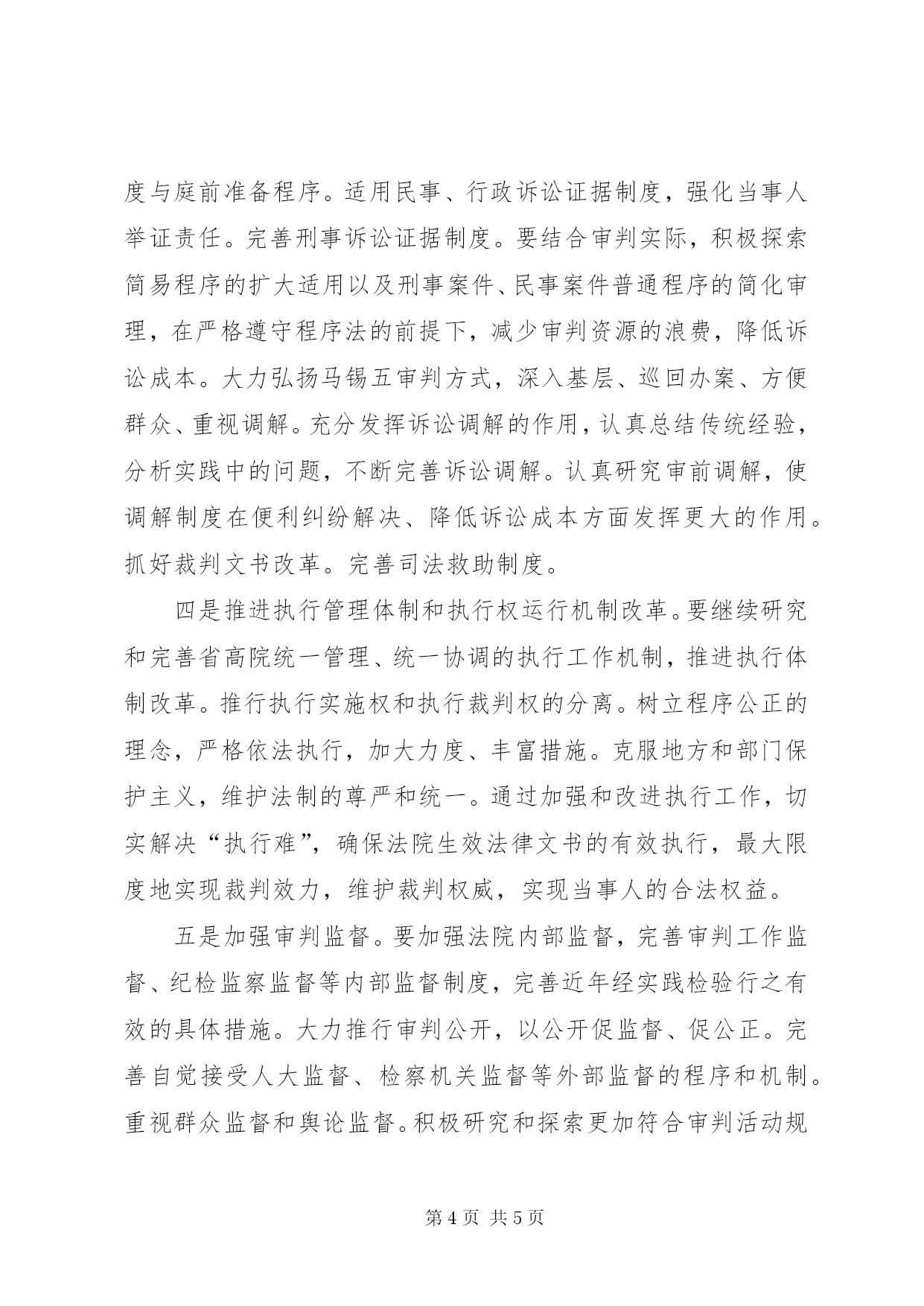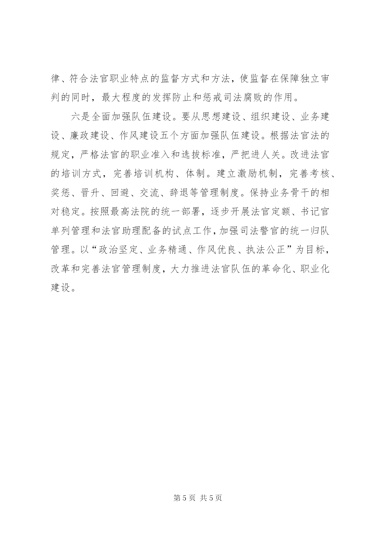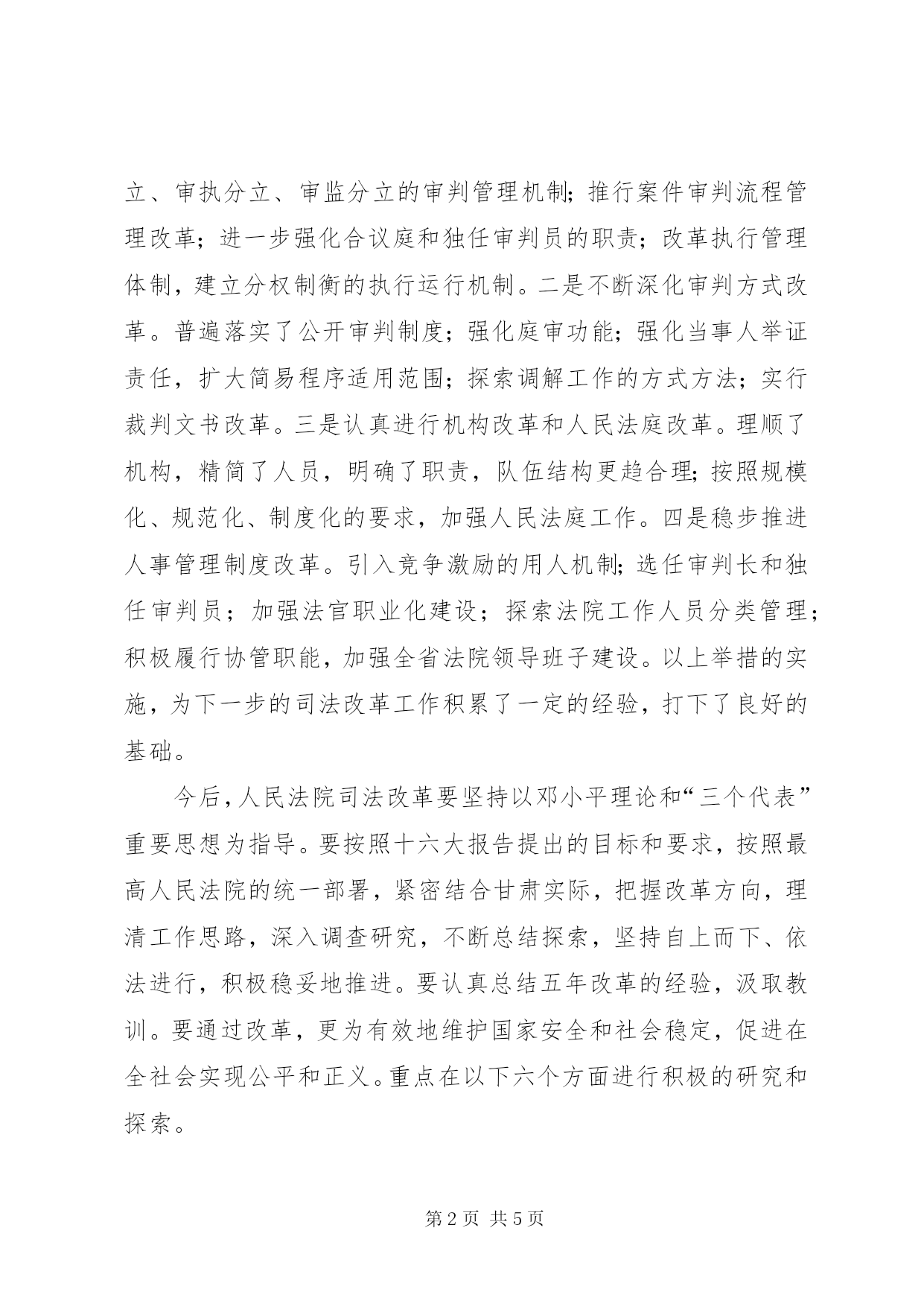 第PAGE\*Arabic\*MERGEFORMAT5页共NUMPAGES\*MERGEFORMAT5页小议学习贯彻会议精神推进司法完善江泽民同志在党的十六大报告中指出。“社会主义司法制度必须保障在全社会实现公平和正义。按照公正司法和严格执法的要求,完善司法机关的机构设置、职权划分和管理制度,进一步健全权责明确、相互配合、相互制约、高效运行的司法体制。从制度上保证审判机关和检察机关依法独立公正地行使审判权和检察权。完善诉讼程序,保障公民和法人的合法权益。切实解决执行难问题。改革司法机关的工作机制和人财物管理体制,逐步实现司法审判和检察同司法行政事务相分离。加强对司法工作的监督,惩治司法领域中的腐败。建设一支政治坚定、业务精通、作风优良、执法公正的司法队伍。”十六大报告关于司法体制改革的论述,从实现全面建设小康社会的奋斗目标,实施依法治国基本方略,促进社会主义物质文明、政治文明、精神文明的战略高度,明确提出了司法体制改革的根本目标和主要任务,意义重大、内涵丰富。我们一定要高度重视、深入学习、深刻领会,认真贯彻落实。党的十五大以来,我省各级法院在党委的领导下,在人大的监督和政府的支持和帮助下,贯彻落实十五大精神和“三个代表”重要思想,贯彻落实最高人民法院《人民法院五年改革纲要》,从本地实际出发,积极稳妥,循序渐进,不断推进,法院改革取得了较大进展。一是积极开展审判机制改革。普遍建立了立审分立、审执分立、审监分立的审判管理机制;推行案件审判流程管理改革;进一步强化合议庭和独任审判员的职责;改革执行管理体制,建立分权制衡的执行运行机制。二是不断深化审判方式改革。普遍落实了公开审判制度;强化庭审功能;强化当事人举证责任,扩大简易程序适用范围;探索调解工作的方式方法;实行裁判文书改革。三是认真进行机构改革和人民法庭改革。理顺了机构,精简了人员,明确了职责,队伍结构更趋合理;按照规模化、规范化、制度化的要求,加强人民法庭工作。四是稳步推进人事管理制度改革。引入竞争激励的用人机制;选任审判长和独任审判员;加强法官职业化建设;探索法院工作人员分类管理;积极履行协管职能,加强全省法院领导班子建设。以上举措的实施,为下一步的司法改革工作积累了一定的经验,打下了良好的基础。今后,人民法院司法改革要坚持以邓小平理论和“三个代表”重要思想为指导。要按照十六大报告提出的目标和要求,按照最高人民法院的统一部署,紧密结合甘肃实际,把握改革方向,理清工作思路,深入调查研究,不断总结探索,坚持自上而下、依法进行,积极稳妥地推进。要认真总结五年改革的经验,汲取教训。要通过改革,更为有效地维护国家安全和社会稳定,促进在全社会实现公平和正义。重点在以下六个方面进行积极的研究和探索。一是推进法院体制改革。要巩固法院机构改革的成果。要重视和加强人民法庭的规划设置、基本建设和人员配备。法庭设置要因地制宜、实事求是、科学规划、合理布局、不搞一刀切,按要求配备人员,搞好硬件建设。省高院将按照“规模化、规范化、制度化”的要求,对人民法庭的人员、装备、职责范围等方面制定统一的标准,提出具体要求和量化指标,进行达标考核。各基层法院要采取院领导建立联系点、业务庭对口帮助等方式,加强对人民法庭工作的业务指导。在人财物管理体制方面,要认真总结改革的经验,巩固已经取得的成绩,并进行调研和探索。要认真研究法院体制改革的有关理论问题,探索建立职责明确、分工合理、运转高效、保障有力的法院管理体制的思路。二是完善审判机制改革。要继续完善立审、审执、审监分立制度。加强案件审判流程管理,结合全省法院的网络化、信息化建设,提高管理水平,提高审判效率。继续推进审判监督改革,规范和落实再审案件的立案标准、审理程序,维护生效裁判的权威性和稳定性。完善审判长、独任审判员的管理,逐步科学界定审判长、独任审判员、庭长、院长的权责范围。进一步发挥合议庭的作用,规范审判委员会议事规则。健全人民陪审员制度和调解制度。三是推进审判方式改革。要完善诉讼程序,便利诉讼,保障当事人的合法权益。进一步实施、规范和完善案件的繁简分流制度与庭前准备程序。适用民事、行政诉讼证据制度,强化当事人举证责任。完善刑事诉讼证据制度。要结合审判实际,积极探索简易程序的扩大适用以及刑事案件、民事案件普通程序的简化审理,在严格遵守程序法的前提下,减少审判资源的浪费,降低诉讼成本。大力弘扬马锡五审判方式,深入基层、巡回办案、方便群众、重视调解。充分发挥诉讼调解的作用,认真总结传统经验,分析实践中的问题,不断完善诉讼调解。认真研究审前调解,使调解制度在便利纠纷解决、降低诉讼成本方面发挥更大的作用。抓好裁判文书改革。完善司法救助制度。四是推进执行管理体制和执行权运行机制改革。要继续研究和完善省高院统一管理、统一协调的执行工作机制,推进