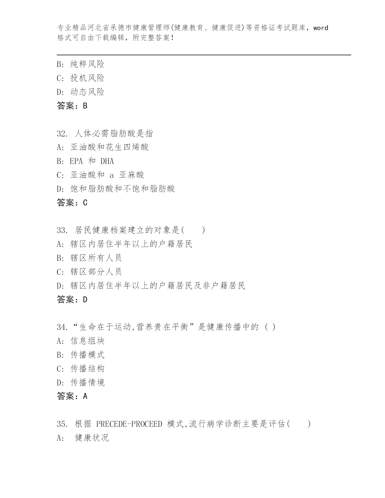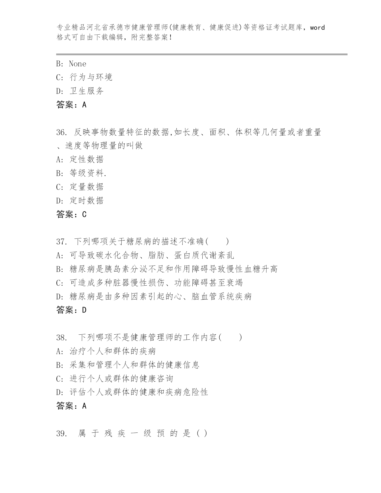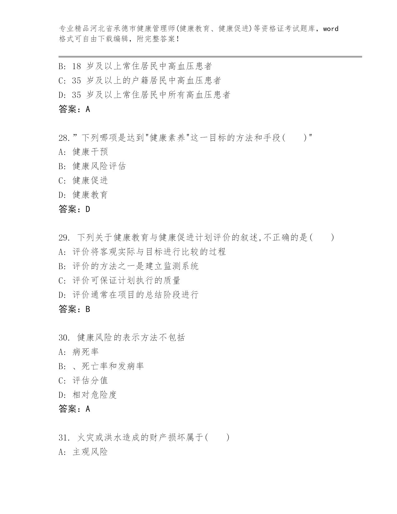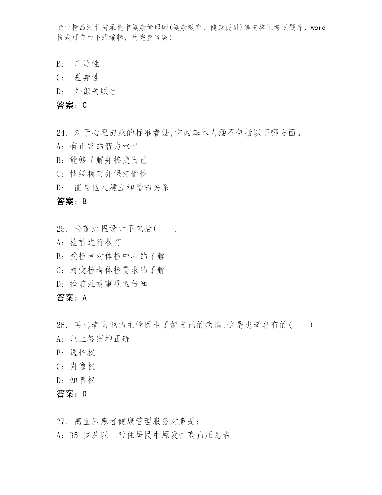 精编河北省承德市健康管理师(健康教育、健康促进)等资格证考试内部题库【精练】