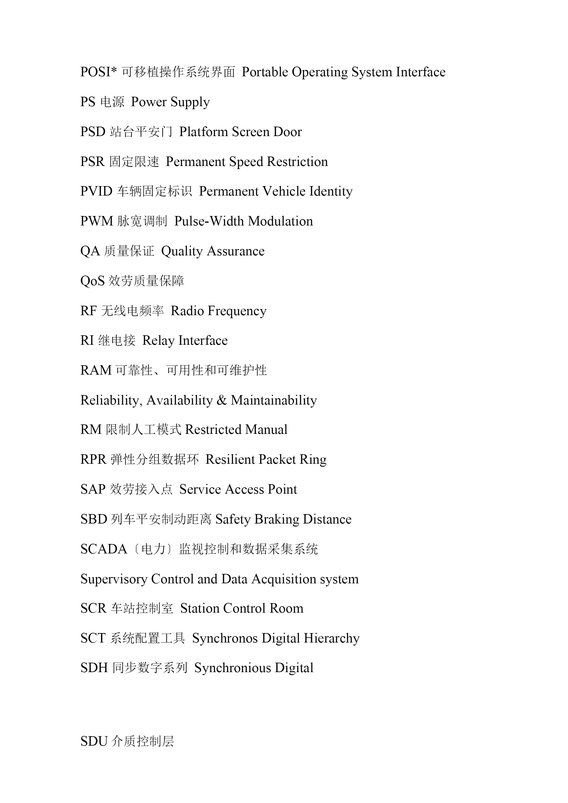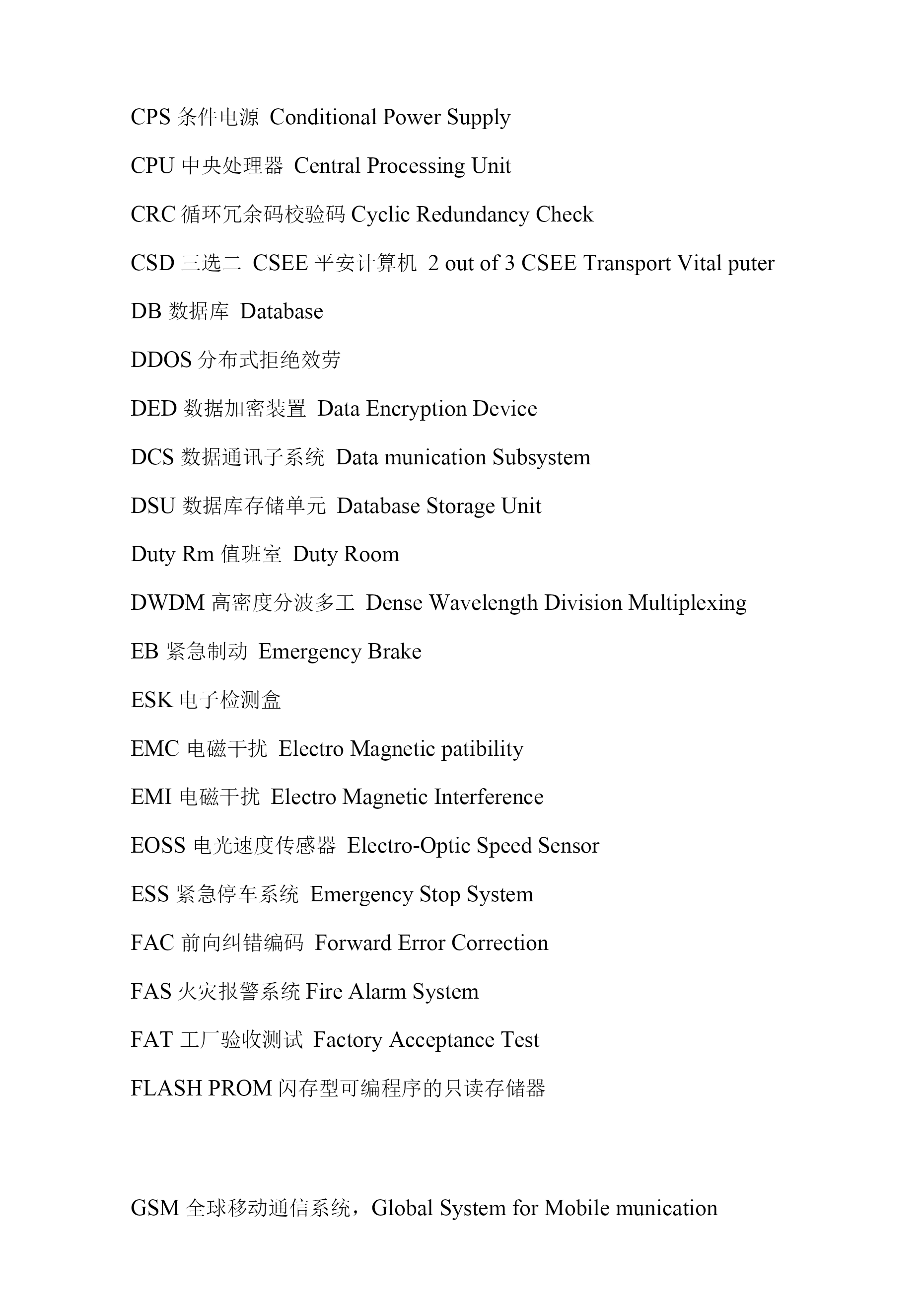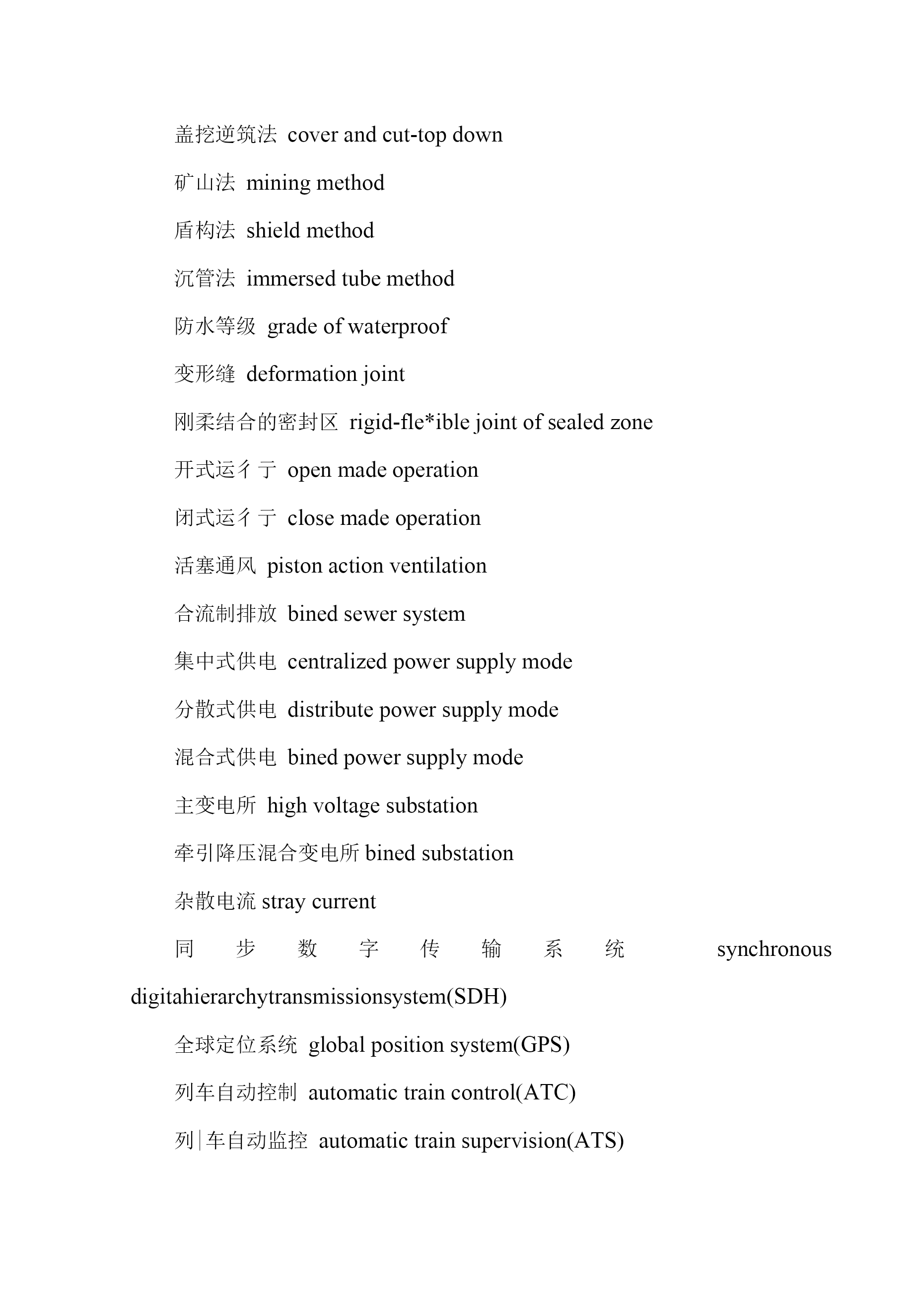 城市轨道交通urbanrailtransit/masstransit设计使用年限designedlifetime运营概念operationconcept旅行速度operationspeed限界gaugePlatformScreenDoors(PSD平安门正线mainline辅助线assistantline联络线connectingline试车线testingline轨道构造trackstructure轨距gaugeoftrack无缝线路seamlesstrack整体道床monolithictrack-bed路基subgrade站台计算长度putedlengthofplatform车站公共区publiczoneofstation无缝线路纵向水平力longitudinahorizontalforceofseamlesstrack无缝线路断轨力brokenrailforceofseamlesstrack名挖法cutandcover盖挖顺筑法coverandcut-bottomup盖挖逆筑法coverandcut-topdown矿山法miningmethod盾构法shieldmethod沉管法immersedtubemethod防水等级gradeofwaterproof变形缝deformationjoint刚柔结合的密封区rigid-fle*iblejointofsealedzone开式运彳亍openmadeoperation闭式运彳亍closemadeoperation活塞通风pistonactionventilation合流制排放binedsewersystem集中式供电centralizedpowersupplymode分散式供电distributepowersupplymode混合式供电binedpowersupplymode主变电所highvoltagesubstation牵引降压混合变电所binedsubstation杂散电流straycurrent同步数字传输系统synchronousdigitahierarchytransmissionsystem(SDH)全球定位系统globalpositionsystem(GPS)列车自动控制automatictraincontrol(ATC)列|车自动监控automatictrainsupervision(ATS)列车自动防护automatictrainprotection(ATP)列|车自动运彳亍automatictrainoperation(ATO)调度集中centralizedtrafficcontrol(CTC)自动人行道movingpavement自动售检票设备automaticfarecollection火灾自动报警系统firealarmsystem区域报警系统localalarmsystem集中报警系统remotealarmsystem环境与设备监控系统buildingautomaticsystem(BAS)系统集成systemintegration(SI)运营控制中心operationcontrolcenter(OCC)集中监控和管理concentrationsupervisorycontrolandmanagement车辆段depot停车场stablingyard检修修程e*amineandrepairprogram检修周期e*amineandrepairperiod建筑设备自动化系统BuildingAutomationSystem供电系统管理自动化ScanControlAlarmDatabase人机接ManMachineInterface不连续电源供给UninterruptedPowerSupply**—通系统NanJingTransportationCardSystem建立部MinistryofCorporation**地铁公司NanJingMetroCorporation清结算数据中心IntermodalityDataCenter局域网LocalAreaNetwork广域网WideAreaNetwork开放传输网络OpenTransportNetwork拖车TrailerCar(Tc(A))带受电弓的动车MotorCarWithPantograph(Mp(B))动车MotorCar(M(C))空载AW0每位乘客都有座位AW1每平方米6人AW2每平方米9人AW3非接触智能卡ContactlessSmartCard(CSC)非接触智能筹码ContactlessSmartCard(CST)设备运行参数E