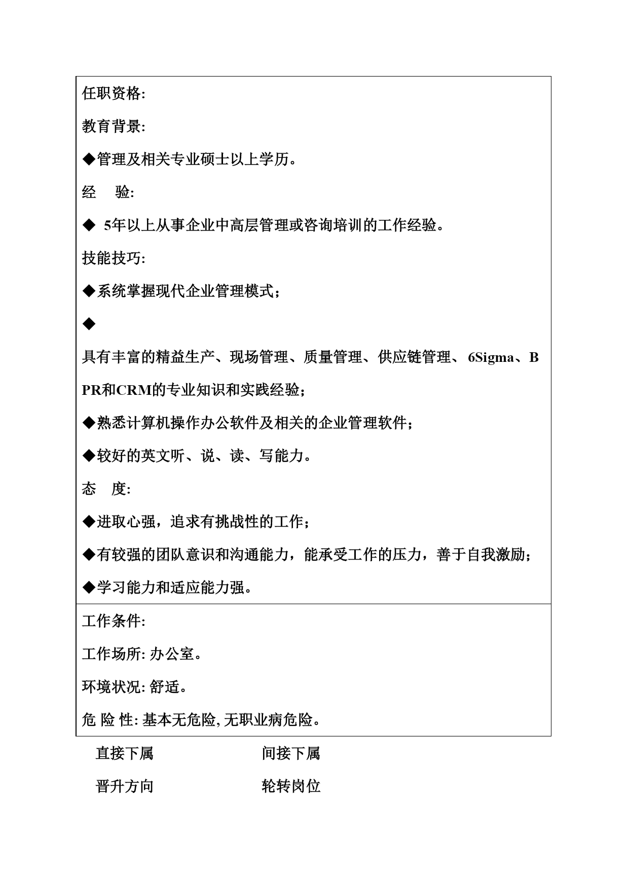 管理顾问职位说明书职位名称管理顾问职位代码所属部门董事会职系职等职级直属上级董事长薪金标准填写日期核准人职位概要:管理顾问负责针对客户具体状况,提出管理咨询方案,提供管理咨询服务。可以全职,也可以兼职。工作内容:1、对企业客户进行调研、分析、诊断并策划管理咨询方案;2、对企业客户提供管理咨询服务,内容涉及以下几个方面:管理变革:公司战略转型、管理模式的变革等的策划、推进、评价,组织结构设计;公司绩效管理:公司各业务部门激励与评价体系的设计与项目管理;战略管理:组织结构、激励评价等的研究与咨询制度体系建设;其他事宜:如管理思想宣传贯彻、集团制度体系规划,实施企业培训和解决方案等;3、参与企业文化创建和培训产品开发;4、维护和发展与大客户的关系。任职资格:教育背景:◆管理及相关专业硕士以上学历。经验:◆5年以上从事企业中高层管理或咨询培训的工作经验。技能技巧:◆系统掌握现代企业管理模式;◆具有丰富的精益生产、现场管理、质量管理、供应链管理、6Sigma、BPR和CRM的专业知识和实践经验;◆熟悉计算机操作办公软件及相关的企业管理软件;◆较好的英文听、说、读、写能力。态度:◆进取心强,追求有挑战性的工作;◆有较强的团队意识和沟通能力,能承受工作的压力,善于自我激励;◆学习能力和适应能力强。工作条件:工作场所:办公室。环境状况:舒适。危险性:基本无危险,无职业病危险。直接下属间接下属晋升方向轮转岗位