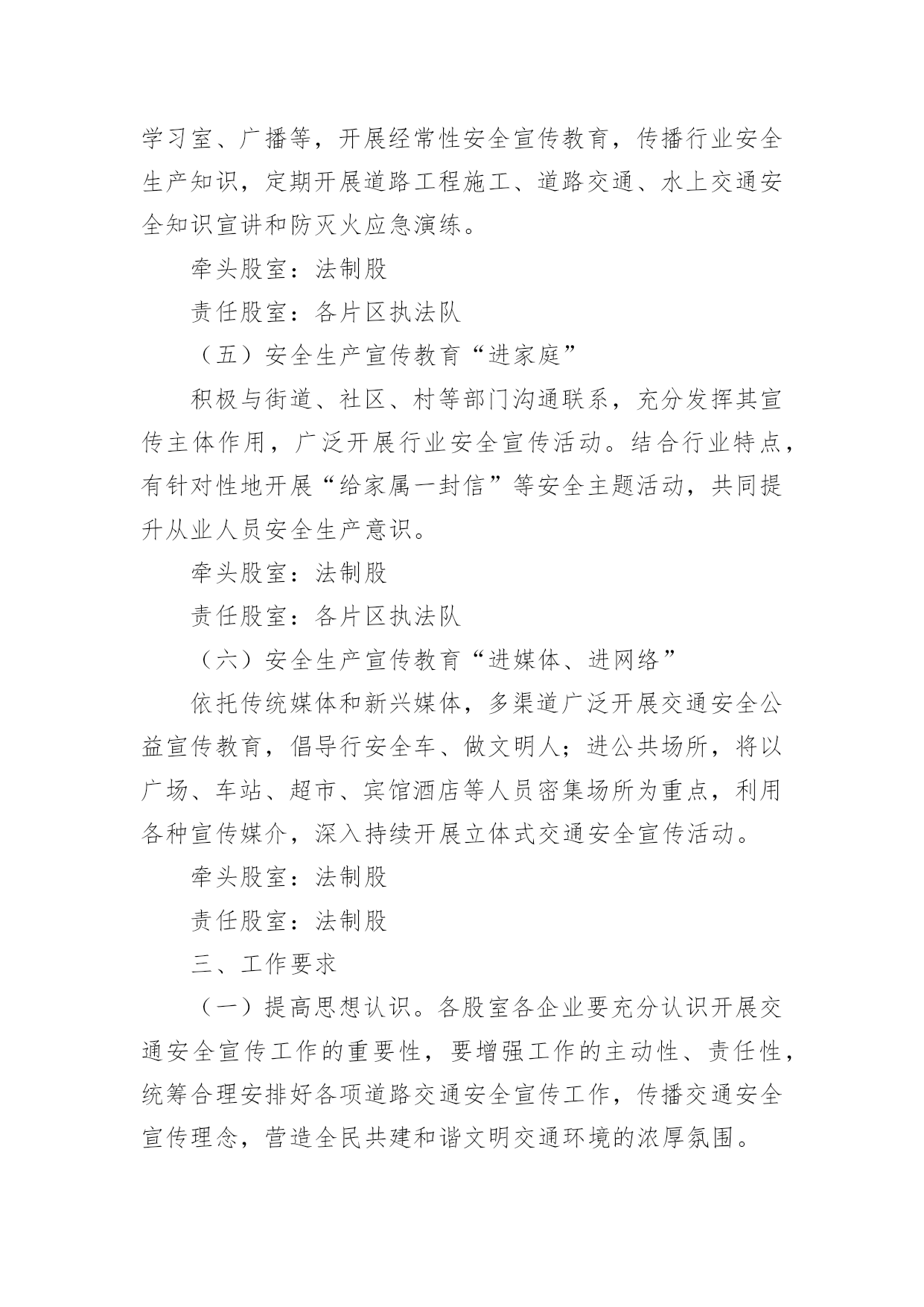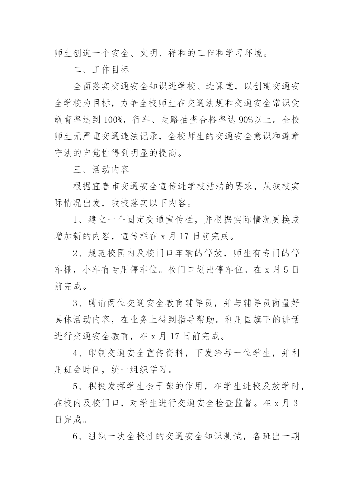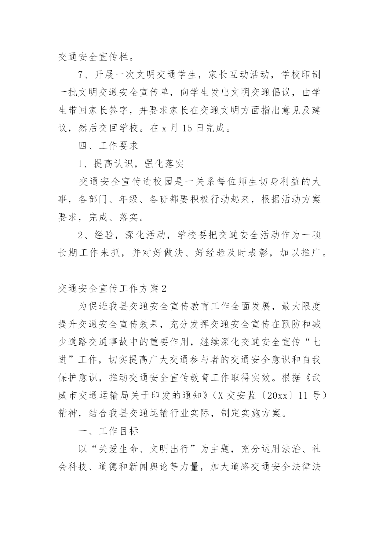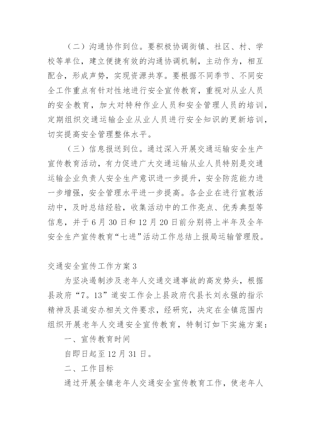 交通安全宣传工作方案为保障事情或工作顺利开展,就常常需要事先准备方案,方案的内容和形式都要围绕着主题来展开,最终达到预期的效果和意义。那么我们该怎么去写方案呢?下面是小编为大家收集的交通安全宣传工作方案,欢迎大家借鉴与参考,希望对大家有所帮助。交通安全宣传工作方案1为响应市政府号召,切实加强我校师生交通安全管理,提高广大师生交通安全意识、交通文明意识、社会公德意识、自我保护意识,充分发挥交通安全宣传教育在预防和减少道路交通事故的重要作用,有效防范师生的交通事故的发生,全力打造“平安校园”。遵照《宜春市中心城区交通安全宣传进学校活动实施方案》,根据我校实际情况特制定本方案:一、指导思想根据《宜春市开展交通安全宣传进学校活动工作方案》为指导思想,以“关心师生,爱护生命”为主题,以教育“一个学生、影响一个家庭、带动整个社会”为目标,广泛深入的在全校师生中开展交通安全宣传教育活动,使广大师生受到深刻教育,进一步的增强师生的交通安全意识,提高遵章守法的自觉性,在整个校园内形成“珍爱生命,安全出行”的浓厚氛围。针对校园交通安全管理的.薄弱环节,采取有效的措施,扎实的做好校园交通安全宣传工作,为全校师生创造一个安全、文明、祥和的工作和学习环境。二、工作目标全面落实交通安全知识进学校、进课堂,以创建交通安全学校为目标,力争全校师生在交通法规和交通安全常识受教育率达到100%,行车、走路抽查合格率达90%以上。全校师生无严重交通违法记录,全校师生的交通安全意识和遵章守法的自觉性得到明显的提高。三、活动内容根据宜春市交通安全宣传进学校活动的要求,从我校实际情况出发,我校落实以下内容。1、建立一个固定交通宣传栏,并根据实际情况更换或增加新的内容,宣传栏在x月17日前完成。2、规范校园内及校门口车辆的停放,师生有专门的停车棚,小车有专用停车位。校门口划出停车位。在x月5日前完成。3、聘请两位交通安全教育辅导员,并与辅导员商量好具体活动内容,在业务上得到指导帮助。利用国旗下的讲话进行交通安全教育,在x月17日前完成。4、印制交通安全宣传资料,下发给每一位学生,并利用班会时间,统一组织学习。5、积极发挥学生会干部的作用,在学生进校及放学时,在校内及校门口,对学生进行交通安全检查监督。在x月3日完成。6、组织一次全校性的交通安全知识测试,各班出一期交通安全宣传栏。7、开展一次文明交通学生,家长互动活动,学校印制一批文明交通安全宣传单,向学生发出文明交通倡议,由学生带回家长签字,并要求家长在交通文明方面指出意见及建议,然后交回学校。在x月15日完成。四、工作要求1、提高认识,强化落实交通安全宣传进校园是一关系每位师生切身利益的大事,各部门、年级、各班都要积极行动起来,根据活动方案要求,完成、落实。2、经验,深化活动,学校要把交通安全活动作为一项长期工作来抓,并对好做法、好经验及时表彰,加以推广。交通安全宣传工作方案2为促进我县交通安全宣传教育工作全面发展,最大限度提升交通安全宣传效果,充分发挥交通安全宣传在预防和减少道路交通事故中的重要作用,继续深化交通安全宣传“七进”工作,切实提高广大交通参与者的交通安全意识和自我保护意识,推动交通安全宣传教育工作取得实效。根据《武威市交通运输局关于印发的通知》(X交安监〔20xx〕11号)精神,结合我县交通运输行业实际,制定实施方案。一、工作目标以“关爱生命、文明出行”为主题,充分运用法治、社会科技、道德和新闻舆论等力量,加大道路交通安全法律法规宣传力度,持续开展文明交通宣传教育。各单位根据各自职能,采取有效措施,全面推进交通安全宣传进企业、进学校、进社区、进农村、进家庭、进媒体、进网络,实现交通安全公益广告全普及全覆盖,充分曝光交通违法和交通陋习,促进文明交通安全宣传工作常态化。二、工作任务(一)安全生产宣传教育“进企业”1、有制度。各交通运输企业要将安全生产宣传教育纳入企业日常管理工作,与生产经营各项工作同研究、同部署、同落实,确保有专门责任人和专项工作经费。2、有培训。各交通运输企业要将安全生产宣传教育作为班前会、月度例会、生产经营会和安全生产工作会议的固定议题研究部署;每年至少组织开展1次岗位安全知识普及与培训及安全应急演练。3、有活动。深入开展“安全生产月”、“平安交通”、《安全生产法》宣传周、《职业病防治法》宣传周以及其他安全生产宣传教育活动。4、有文化。各交通运输企业要积极开展安全文化创建工作,将企业安全文化建设作为安全生产标准化建设重要内容,同时要切实承担起安全文化辐射全社会的责任。5、有警示。各交通运输企业要在单位内部醒目位置设置安全生产宣传专栏,悬挂张贴安全生产宣传标语、安全生产系列挂图。利用电子屏滚动播放安全宣传片和安全警示提示。高危行业企业及规模以上企业每季度至少要组织全体职工观看一次安全生产