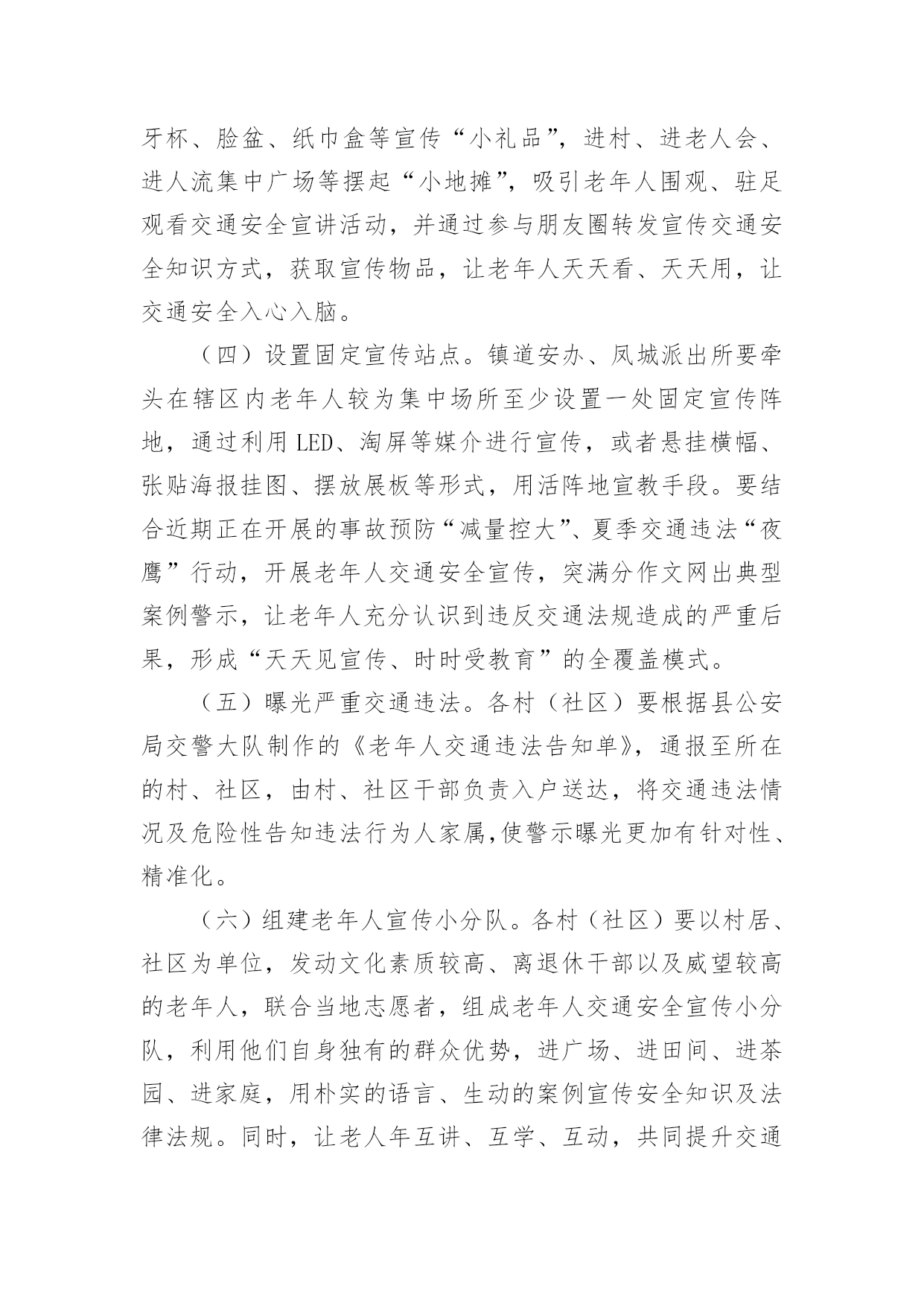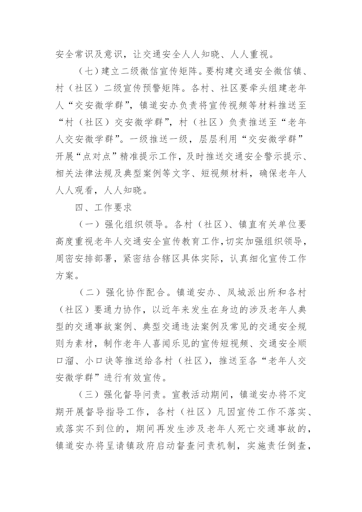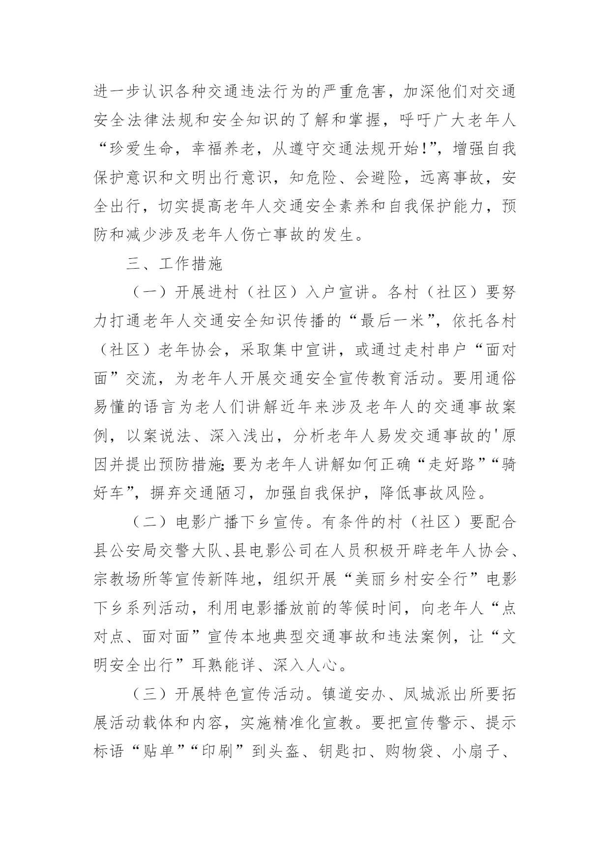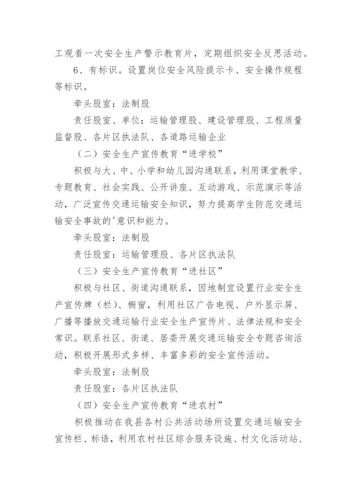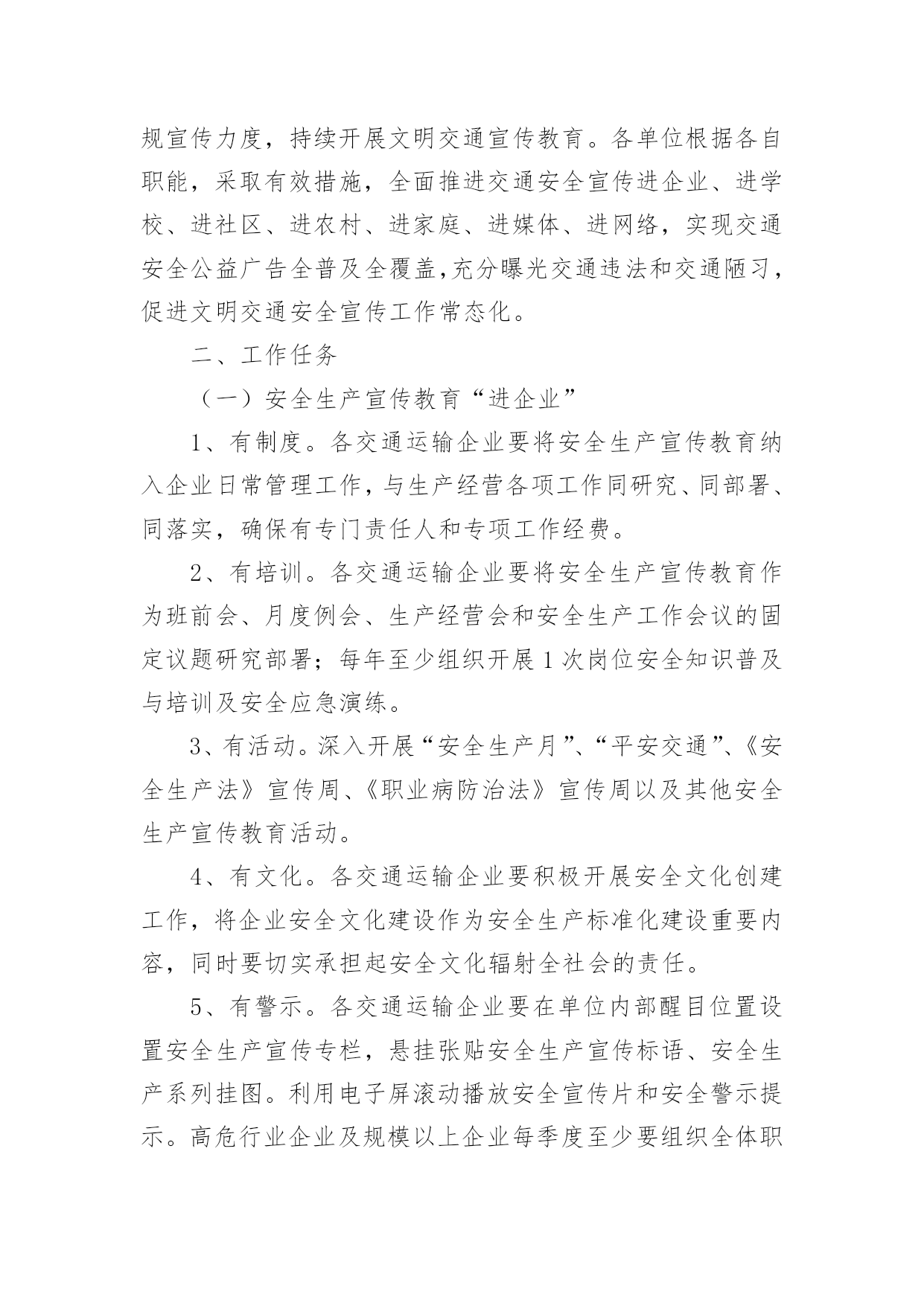 交通安全宣传工作方案为保障事情或工作顺利开展,就常常需要事先准备方案,方案的内容和形式都要围绕着主题来展开,最终达到预期的效果和意义。那么我们该怎么去写方案呢?下面是小编为大家收集的交通安全宣传工作方案,欢迎大家借鉴与参考,希望对大家有所帮助。交通安全宣传工作方案1为响应市政府号召,切实加强我校师生交通安全管理,提高广大师生交通安全意识、交通文明意识、社会公德意识、自我保护意识,充分发挥交通安全宣传教育在预防和减少道路交通事故的重要作用,有效防范师生的交通事故的发生,全力打造“平安校园”。遵照《宜春市中心城区交通安全宣传进学校活动实施方案》,根据我校实际情况特制定本方案:一、指导思想根据《宜春市开展交通安全宣传进学校活动工作方案》为指导思想,以“关心师生,爱护生命”为主题,以教育“一个学生、影响一个家庭、带动整个社会”为目标,广泛深入的在全校师生中开展交通安全宣传教育活动,使广大师生受到深刻教育,进一步的增强师生的交通安全意识,提高遵章守法的自觉性,在整个校园内形成“珍爱生命,安全出行”的浓厚氛围。针对校园交通安全管理的.薄弱环节,采取有效的措施,扎实的做好校园交通安全宣传工作,为全校师生创造一个安全、文明、祥和的工作和学习环境。二、工作目标全面落实交通安全知识进学校、进课堂,以创建交通安全学校为目标,力争全校师生在交通法规和交通安全常识受教育率达到100%,行车、走路抽查合格率达90%以上。全校师生无严重交通违法记录,全校师生的交通安全意识和遵章守法的自觉性得到明显的提高。三、活动内容根据宜春市交通安全宣传进学校活动的要求,从我校实际情况出发,我校落实以下内容。1、建立一个固定交通宣传栏,并根据实际情况更换或增加新的内容,宣传栏在x月17日前完成。2、规范校园内及校门口车辆的停放,师生有专门的停车棚,小车有专用停车位。校门口划出停车位。在x月5日前完成。3、聘请两位交通安全教育辅导员,并与辅导员商量好具体活动内容,在业务上得到指导帮助。利用国旗下的讲话进行交通安全教育,在x月17日前完成。4、印制交通安全宣传资料,下发给每一位学生,并利用班会时间,统一组织学习。5、积极发挥学生会干部的作用,在学生进校及放学时,在校内及校门口,对学生进行交通安全检查监督。在x月3日完成。6、组织一次全校性的交通安全知识测试,各班出一期交通安全宣传栏。7、开展一次文明交通学生,家长互动活动,学校印制一批文明交通安全宣传单,向学生发出文明交通倡议,由学生带回家长签字,并要求家长在交通文明方面指出意见及建议,然后交回学校。在x月15日完成。四、工作要求1、提高认识,强化落实交通安全宣传进校园是一关系每位师生切身利益的大事,各部门、年级、各班都要积极行动起来,根据活动方案要求,完成、落实。2、经验,深化活动,学校要把交通安全活动作为一项长期工作来抓,并对好做法、好经验及时表彰,加以推广。交通安全宣传工作方案2为促进我县交通安全宣传教育工作全面发展,最大限度提升交通安全宣传效果,充分发挥交通安全宣传在预防和减少道路交通事故中的重要作用,继续深化交通安全宣传“七进”工作,切实提高广大交通参与者的交通安全意识和自我保护意识,推动交通安全宣传教育工作取得实效。根据《武威市交通运输局关于印发的通知》(X交安监〔20xx〕11号)精神,结合我县交通运输行业实际,制定实施方案。一、工作目标以“关爱生命、文明出行”为主题,充分运用法治、社会科技、道德和新闻舆论等力量,加大道路交通安全法律法规宣传力度,持续开展文明交通宣传教育。各单位根据各自职能,采取有效措施,全面推进交通安全宣传进企业、进学校、进社区、进农村、进家庭、进媒体、进网络,实现交通安全公益广告全普及全覆盖,充分曝光交通违法和交通陋习,促进文明交通安全宣传工作常态化。二、工作任务(一)安全生产宣传教育“进企业”1、有制度。各交通运输企业要将安全生产宣传教育纳入企业日常管理工作,与生产经营各项工作同研究、同部署、同落实,确保有专门责任人和专项工作经费。2、有培训。各交通运输企业要将安全生产宣传教育作为班前会、月度例会、生产经营会和安全生产工作会议的固定议题研究部署;每年至少组织开展1次岗位安全知识普及与培训及安全应急演练。3、有活动。深入开展“安全生产月”、“平安交通”、《安全生产法》宣传周、《职业病防治法》宣传周以及其他安全生产宣传教育活动。4、有文化。各交通运输企业要积极开展安全文化创建工作,将企业安全文化建设作为安全生产标准化建设重要内容,同时要切实承担起安全文化辐射全社会的责任。5、有警示。各交通运输企业要在单位内部醒目位置设置安全生产宣传专栏,悬挂张贴安全生产宣传标语、安全生产系列挂图。利用电子屏滚动播放安全宣传片和安全警示提示。高危行业企业及规模以上企业每季度至少要组织全体职工观看一次安全生产