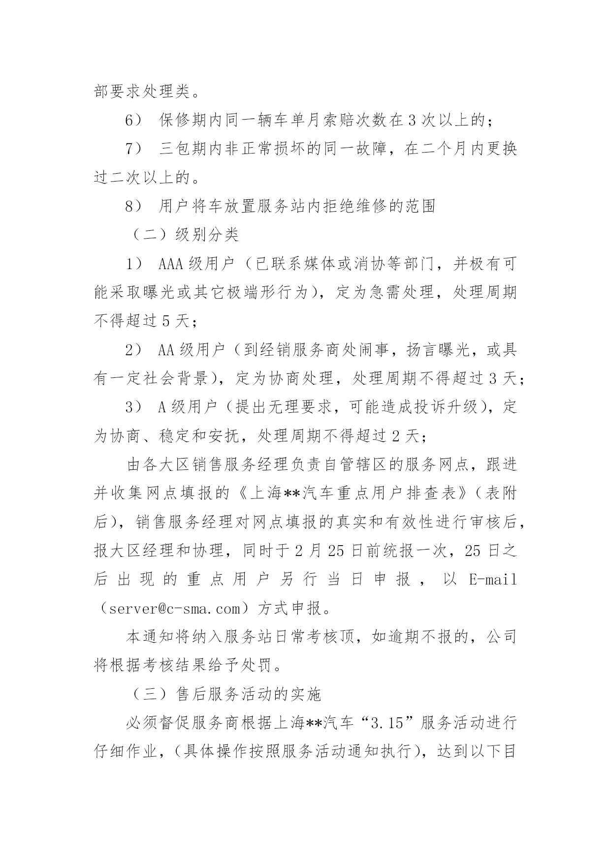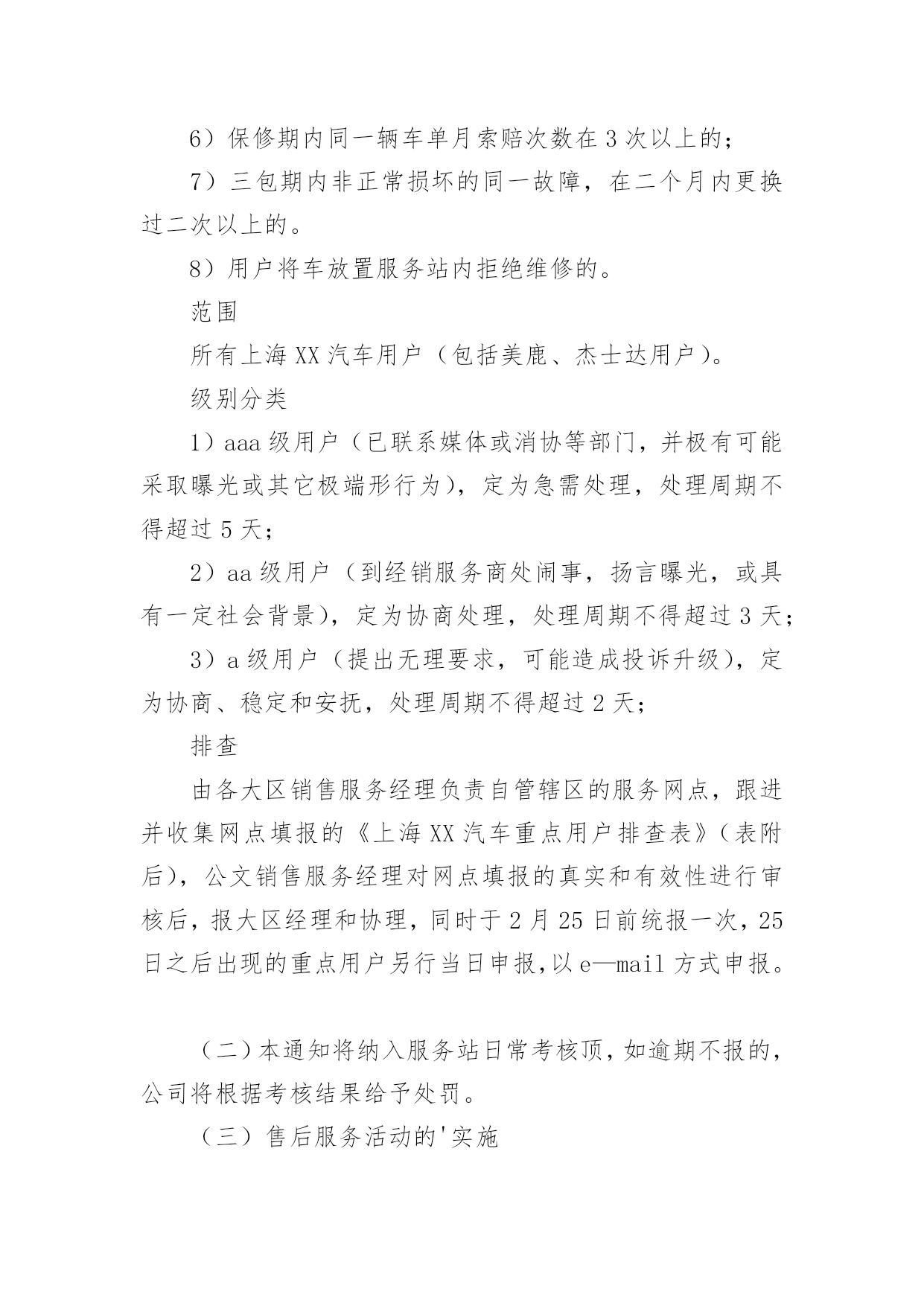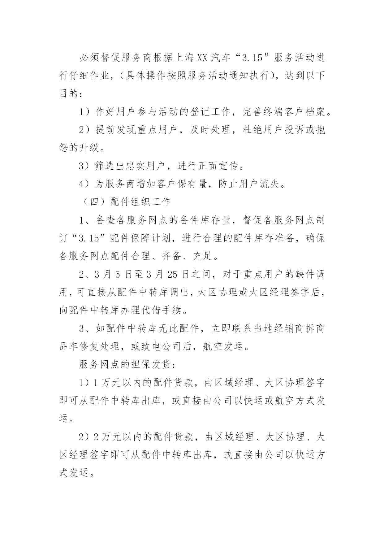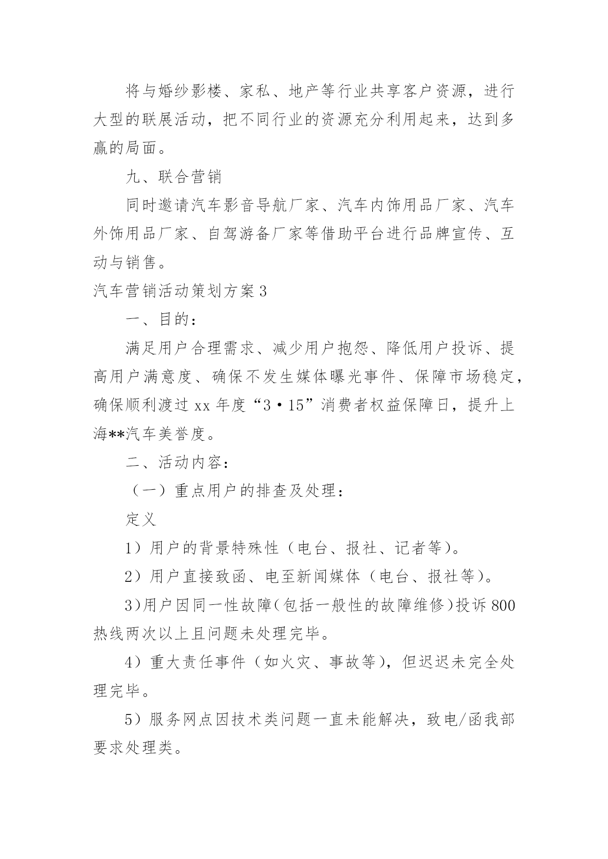汽车营销活动策划方案汽车营销活动策划方案集锦[15篇]为了确保事情或工作科学有序进行,常常需要提前制定一份优秀的方案,方案是书面计划,是具体行动实施办法细则,步骤等。方案应该怎么制定才好呢?以下是小编为大家收集的汽车营销活动策划方案,欢迎大家分享。汽车营销活动策划方案1一、目的:满足用户合理需求、减少用户抱怨、降低用户投诉、提高用户满意度、确保不发生媒体曝光事件、保障市场稳定,确保顺利渡过20xx年度“315”消费者权益保障日,提升上海**汽车美誉度。二、活动内容:(一)重点用户的排查及处理:1)用户的背景特殊性(电台、报社、记者等)。2)用户直接致函、电至新闻媒体(电台、报社等)。3)用户因同一性故障(包括一般性的故障维修)投诉800热线两次以上且问题未处理完毕。4)重大责任事件(如火灾、事故等),但迟迟未完全处理完毕。5)服务网点因技术类问题一直未能解决,致电/函我部要求处理类。6)保修期内同一辆车单月索赔次数在3次以上的;7)三包期内非正常损坏的同一故障,在二个月内更换过二次以上的。8)用户将车放置服务站内拒绝维修的范围(二)级别分类1)AAA级用户(已联系媒体或消协等部门,并极有可能采取曝光或其它极端形行为),定为急需处理,处理周期不得超过5天;2)AA级用户(到经销服务商处闹事,扬言曝光,或具有一定社会背景),定为协商处理,处理周期不得超过3天;3)A级用户(提出无理要求,可能造成投诉升级),定为协商、稳定和安抚,处理周期不得超过2天;由各大区销售服务经理负责自管辖区的服务网点,跟进并收集网点填报的《上海**汽车重点用户排查表》(表附后),销售服务经理对网点填报的真实和有效性进行审核后,报大区经理和协理,同时于2月25日前统报一次,25日之后出现的重点用户另行当日申报,以E-mail(server@c-sma.com)方式申报。本通知将纳入服务站日常考核顶,如逾期不报的,公司将根据考核结果给予处罚。(三)售后服务活动的实施必须督促服务商根据上海**汽车“3.15”服务活动进行仔细作业,(具体操作按照服务活动通知执行),达到以下目的:1)作好用户参与活动的登记工作,完善终端客户档案。2)提前发现重点用户,及时处理,杜绝用户投诉或抱怨的'升级。3)筛选出忠实用户,进行正面宣传。4)为服务商增加客户保有量,防止用户流失。(四)配件组织工作备查各服务网点的备件库存量,督促各服务网点制订“3.15”配件保障计划,进行合理的配件库存准备,确保各服务网点配件合理、齐备、充足。3月5日至3月25日之间,对于重点用户的缺件调用,可直接从配件中转库调出,大区协理或大区经理签字后,向配件中转库办理代借手续。如配件中转库无此配件,立即联系当地经销商拆商品车修复处理,或致电公司后,航空发运。服务网点的担保发货:1)1万元以内的配件货款,由区域经理、大区协理签字即可从配件中转库出库,或直接由公司以快运或航空方式发运。2)2万元以内的配件货款,由区域经理、大区协理、大区经理签字即可从配件中转库出库,或直接由公司以快运方式发运。3)2万元以上的配件货款,由区域经理、大区协理、大区经理签字后报统筹组组长廖雄辉签字即可从配件中转库出库,或直接由公司以快运方式发运。(五)经销、服务网点应对方案:设立“3.15”专项岗位,人员名单及方案报备公司,具体要求如下:实行24小时热线服务制度。确保一次性故障解决率,注重服务态度。实行“3.15”现场活动监督、参与及派人蹲点。协助销售、服务经理对当地媒体、消协、工商、质检等单位进行拜访。建立重点用户台帐,并建立危机预警机制。对重点用户的挖掘和排查。建立市场用户回访机制,并对重点用户进行不定期电话回访,必要时进行上门走访,个别用户实行24小时监控。保证配件的供应,保证优质的维修保养工作。按要求及时、有效的向销售服务经理汇报工作。汽车营销活动策划方案2一、活动背景xx汽车凭借国内外品牌知名度和美誉度,经多年以来销售量得到大幅度的增长,已是有口皆碑;同时在适当时机提供更高品质服务满足消费者的需求,让懂得生活的人能更好的享受生活,为市场提供最好的、最有影响力的服务,成了xx汽车的理想与抱负。xx汽车借助公益活动走进社区、广场,与目标客户群零距离的接触与互动,将受到各界的关注,提升更高的品牌地位,让品牌深入民心,进一步得到消费者的肯定,最终成为xx汽车最忠诚的客户。二、活动目的1、与目标消费者追求尊贵、地位、身份、品牌、、时尚、安全性、高品位的特性完美结合,满足消费者的心理需求。2、借夏日人们向往的轻松心理,推出个性、时尚、轻松、公益的活动形式,让消费者体验夏日的轻松心情。3、通过品牌与公益结合,提高媒体炒作,促进销售力。4、通过系列活动拉近消费者与xx的`距离,提高公司的品牌形象。三、活动重点1、针对客户:追求时尚、尊贵