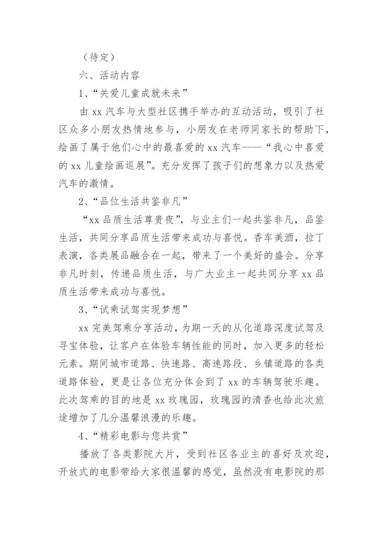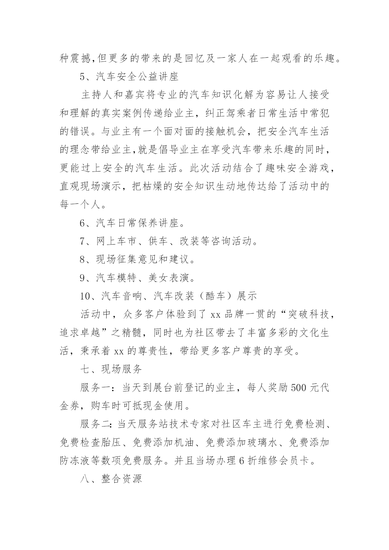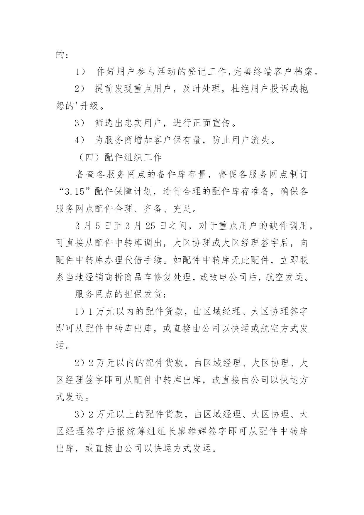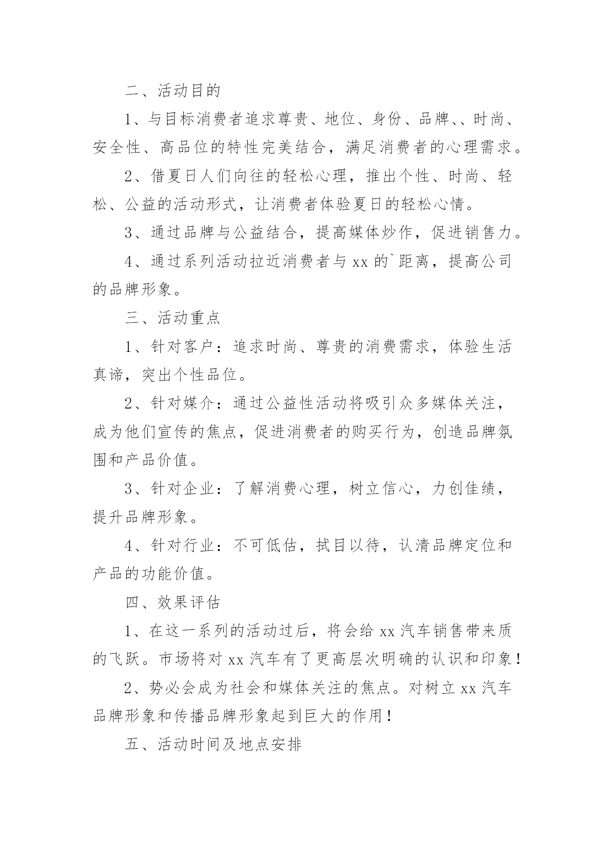 汽车营销活动策划方案汽车营销活动策划方案集锦[15篇]为了确保事情或工作科学有序进行,常常需要提前制定一份优秀的方案,方案是书面计划,是具体行动实施办法细则,步骤等。方案应该怎么制定才好呢?以下是小编为大家收集的汽车营销活动策划方案,欢迎大家分享。汽车营销活动策划方案1一、目的:满足用户合理需求、减少用户抱怨、降低用户投诉、提高用户满意度、确保不发生媒体曝光事件、保障市场稳定,确保顺利渡过20xx年度“315”消费者权益保障日,提升上海**汽车美誉度。二、活动内容:(一)重点用户的排查及处理:1)用户的背景特殊性(电台、报社、记者等)。2)用户直接致函、电至新闻媒体(电台、报社等)。3)用户因同一性故障(包括一般性的故障维修)投诉800热线两次以上且问题未处理完毕。4)重大责任事件(如火灾、事故等),但迟迟未完全处理完毕。5)服务网点因技术类问题一直未能解决,致电/函我部要求处理类。6)保修期内同一辆车单月索赔次数在3次以上的;7)三包期内非正常损坏的同一故障,在二个月内更换过二次以上的。8)用户将车放置服务站内拒绝维修的范围(二)级别分类1)AAA级用户(已联系媒体或消协等部门,并极有可能采取曝光或其它极端形行为),定为急需处理,处理周期不得超过5天;2)AA级用户(到经销服务商处闹事,扬言曝光,或具有一定社会背景),定为协商处理,处理周期不得超过3天;3)A级用户(提出无理要求,可能造成投诉升级),定为协商、稳定和安抚,处理周期不得超过2天;由各大区销售服务经理负责自管辖区的服务网点,跟进并收集网点填报的《上海**汽车重点用户排查表》(表附后),销售服务经理对网点填报的真实和有效性进行审核后,报大区经理和协理,同时于2月25日前统报一次,25日之后出现的重点用户另行当日申报,以E-mail(server@c-sma.com)方式申报。本通知将纳入服务站日常考核顶,如逾期不报的,公司将根据考核结果给予处罚。(三)售后服务活动的实施必须督促服务商根据上海**汽车“3.15”服务活动进行仔细作业,(具体操作按照服务活动通知执行),达到以下目的:1)作好用户参与活动的登记工作,完善终端客户档案。2)提前发现重点用户,及时处理,杜绝用户投诉或抱怨的'升级。3)筛选出忠实用户,进行正面宣传。4)为服务商增加客户保有量,防止用户流失。(四)配件组织工作备查各服务网点的备件库存量,督促各服务网点制订“3.15”配件保障计划,进行合理的配件库存准备,确保各服务网点配件合理、齐备、充足。3月5日至3月25日之间,对于重点用户的缺件调用,可直接从配件中转库调出,大区协理或大区经理签字后,向配件中转库办理代借手续。如配件中转库无此配件,立即联系当地经销商拆商品车修复处理,或致电公司后,航空发运。服务网点的担保发货:1)1万元以内的配件货款,由区域经理、大区协理签字即可从配件中转库出库,或直接由公司以快运或航空方式发运。2)2万元以内的配件货款,由区域经理、大区协理、大区经理签字即可从配件中转库出库,或直接由公司以快运方式发运。3)2万元以上的配件货款,由区域经理、大区协理、大区经理签字后报统筹组组长廖雄辉签字即可从配件中转库出库,或直接由公司以快运方式发运。(五)经销、服务网点应对方案:设立“3.15”专项岗位,人员名单及方案报备公司,具体要求如下:实行24小时热线服务制度。确保一次性故障解决率,注重服务态度。实行“3.15”现场活动监督、参与及派人蹲点。协助销售、服务经理对当地媒体、消协、工商、质检等单位进行拜访。建立重点用户台帐,并建立危机预警机制。对重点用户的挖掘和排查。建立市场用户回访机制,并对重点用户进行不定期电话回访,必要时进行上门走访,个别用户实行24小时监控。保证配件的供应,保证优质的维修保养工作。按要求及时、有效的向销售服务经理汇报工作。汽车营销活动策划方案2一、活动背景xx汽车凭借国内外品牌知名度和美誉度,经多年以来销售量得到大幅度的增长,已是有口皆碑;同时在适当时机提供更高品质服务满足消费者的需求,让懂得生活的人能更好的享受生活,为市场提供最好的、最有影响力的服务,成了xx汽车的理想与抱负。xx汽车借助公益活动走进社区、广场,与目标客户群零距离的接触与互动,将受到各界的关注,提升更高的品牌地位,让品牌深入民心,进一步得到消费者的肯定,最终成为xx汽车最忠诚的客户。二、活动目的1、与目标消费者追求尊贵、地位、身份、品牌、、时尚、安全性、高品位的特性完美结合,满足消费者的心理需求。2、借夏日人们向往的轻松心理,推出个性、时尚、轻松、公益的活动形式,让消费者体验夏日的轻松心情。3、通过品牌与公益结合,提高媒体炒作,促进销售力。4、通过系列活动拉近消费者与xx的`距离,提高公司的品牌形象。三、活动重点1、针对客户:追求时尚、尊贵