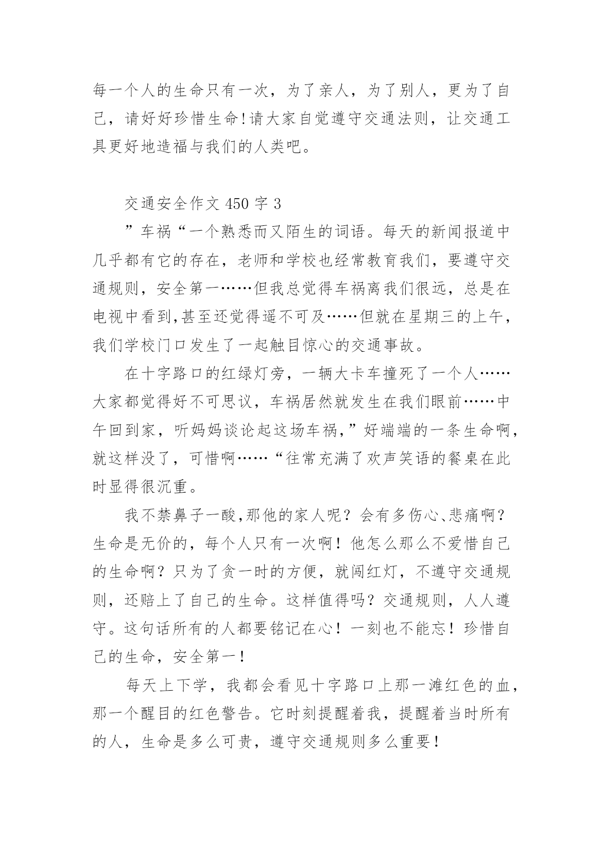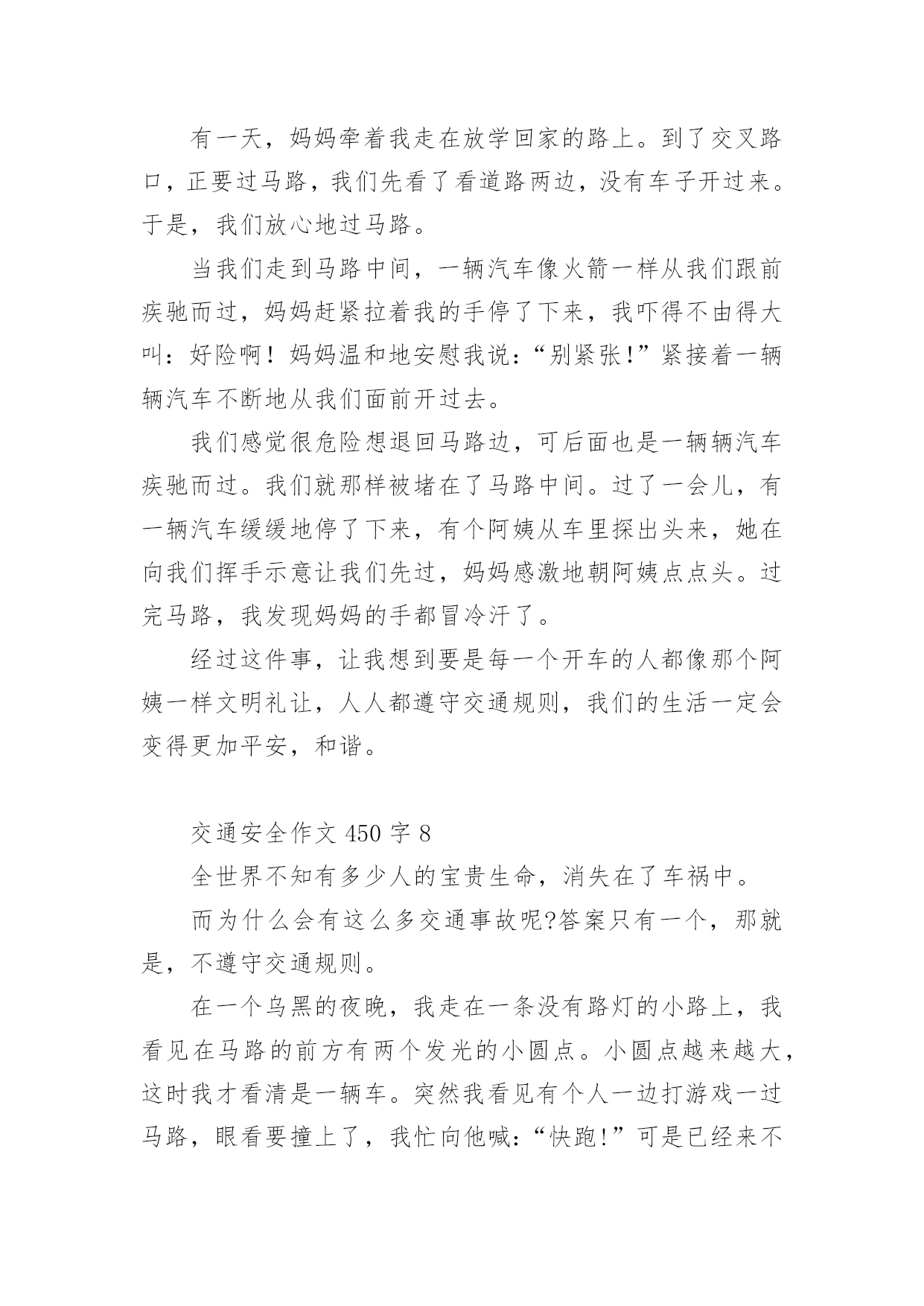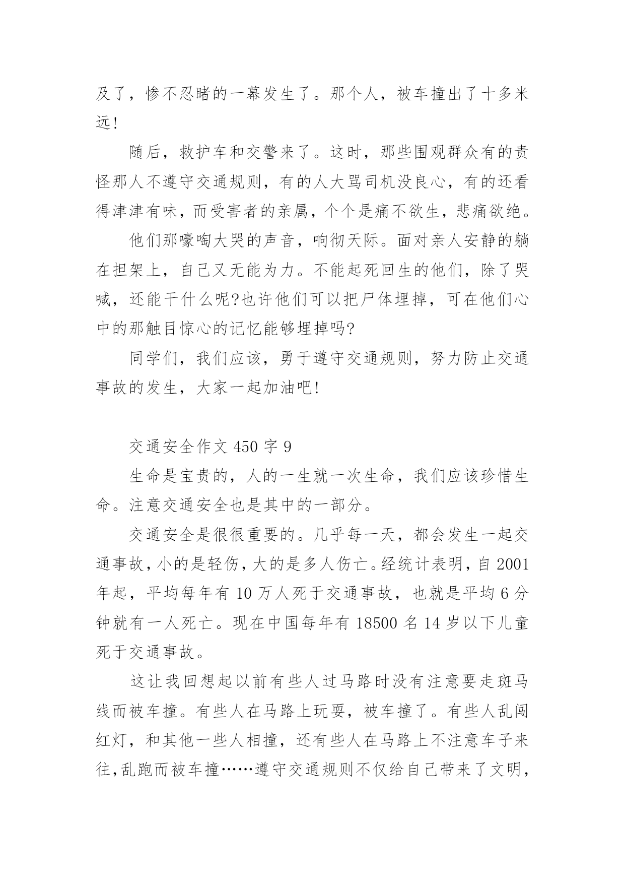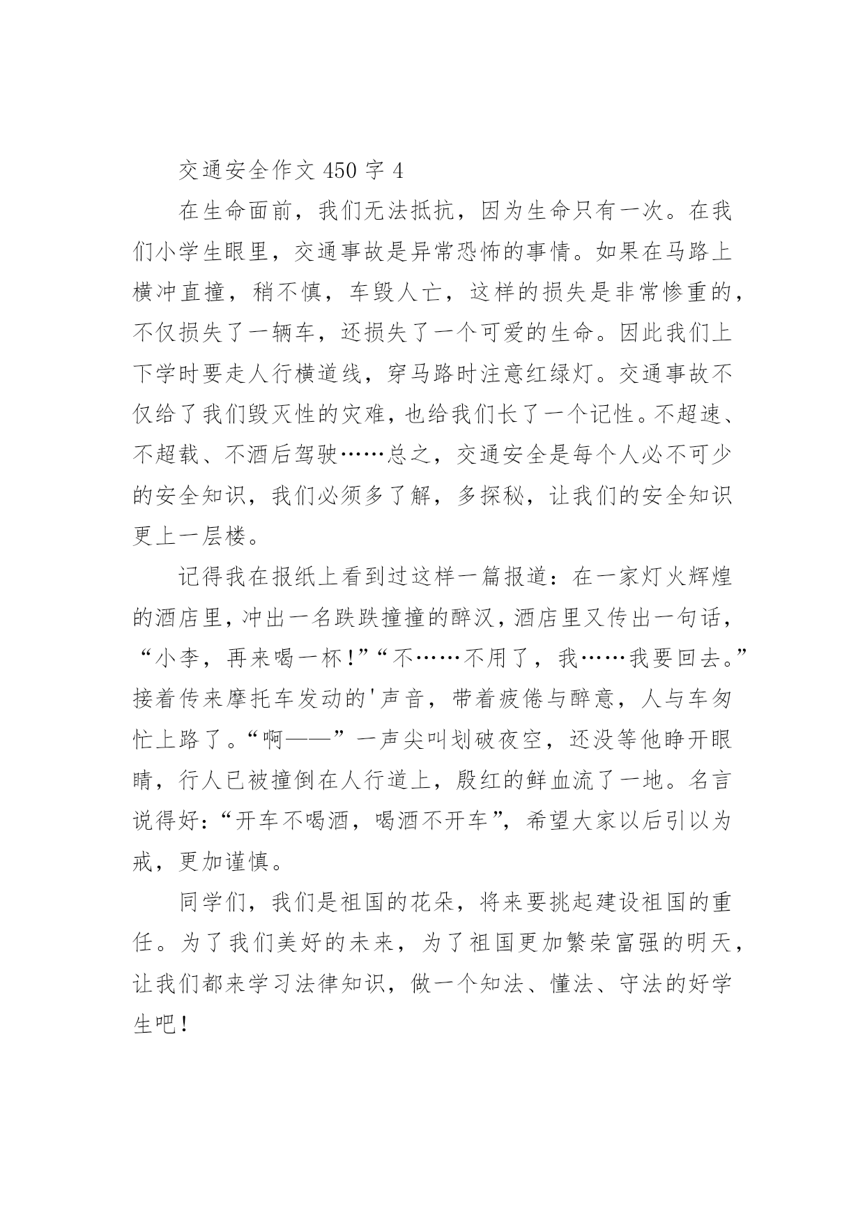 交通安全作文450字交通安全作文范文450字(精选9篇)无论是在学校还是在社会中,说到作文,大家肯定都不陌生吧,作文根据写作时限的不同可以分为限时作文和非限时作文。那么你有了解过作文吗?以下是小编帮大家整理的交通安全作文范文450字(精选9篇),供大家参考借鉴,希望可以帮助到有需要的朋友。交通安全作文450字1现在,人们的生活水平提高了,许多家庭都有了私家车,外来人口也逐渐增多。因此,给交通安全带来了许多困扰。这天,奶奶带我放学回家。在楼下看见隔壁楼梯的阿姨在抽泣,阿姨的肩膀颤动着,晶莹的泪水顺着她秀丽的脸颊流下来。我和奶奶上前询问,才得知她妈妈被车撞到,送到医院急救的消息:那天下午,隔壁老奶奶骑着自行车接小孙女回家,来到斑马线前,她自觉地下了自行车,牵着车子走过斑马线。这时,一辆出租车直撞过来,一下子就把老奶奶和小孙女撞倒在地上。老奶奶一瞬间便失去知觉,不醒人世了。老奶奶被人紧急送到医院抢救,可还是不治身亡了。听了这件事,我顿时愣住了,看者阿姨伤心的样子,心里不由泛起一阵同情和怜悯。我想:老天爷真不公平,这么好的人,这么善良的老奶奶,却因一场交通事故被夺去了宝贵的生命。如果那位出租车司机遵守交通规则,在斑马线前减慢速度,让老奶奶和行人先过,再慢慢驾车离去。就不会造成这起悲惨的事故。通过这件事,希望在未来的日子里,司机和行人都能自觉遵守,交通规则,如果人人都懂得红灯停,绿灯行的重要性,如果行人和司机在斑马线前能互相礼让,那就能避免因为交通事故而给伤着家庭带来的痛苦。交通安全作文450字2“交通安全,人人有责”这句话我相信大家一定并不陌生,从我们刚上学时老师就这样常常嘱咐我们这句话,可是,就是这样一句常挂在嘴边的话,又真正有多少人做到呢?下面,我给大家讲一个真实的故事:一个学生在马路边踢毽子,她一不小心,把毽子踢斜了,毽子便掉在马路中间去了,她想也没想,就跑去捡,突然,一辆大卡车迎面驶来,毫不留情地从她身上压过去,就在这短暂的一刹那,她丧失了宝贵的生命。她的爸爸妈妈知道了,哭的伤心极了。看,这就是不遵守交通事故而造成的后果。而且据有关资料显示,全球每年因交通事故死亡人数已超过3000万,占意外死亡总人数的50%以上,而且每年有18万以上的15岁以下儿童死于道路交通事故,数十万的儿童致残,所以,请大家一定要遵守交通法则,爱护自己的生命。交通事故就是隐藏在我们身边的隐形杀手,专门来等待那些违反交通规则的人,所以,我们要时时刻刻注意着交通安全,要养成文明行车、文明行走的良好习惯。宇宙给我们每一个人的生命只有一次,为了亲人,为了别人,更为了自己,请好好珍惜生命!请大家自觉遵守交通法则,让交通工具更好地造福与我们的人类吧。交通安全作文450字3”车祸“一个熟悉而又陌生的词语。每天的新闻报道中几乎都有它的存在,老师和学校也经常教育我们,要遵守交通规则,安全第一……但我总觉得车祸离我们很远,总是在电视中看到,甚至还觉得遥不可及……但就在星期三的上午,我们学校门口发生了一起触目惊心的交通事故。在十字路口的红绿灯旁,一辆大卡车撞死了一个人……大家都觉得好不可思议,车祸居然就发生在我们眼前……中午回到家,听妈妈谈论起这场车祸,”好端端的一条生命啊,就这样没了,可惜啊……“往常充满了欢声笑语的餐桌在此时显得很沉重。我不禁鼻子一酸,那他的家人呢?会有多伤心、悲痛啊?生命是无价的,每个人只有一次啊!他怎么那么不爱惜自己的生命啊?只为了贪一时的方便,就闯红灯,不遵守交通规则,还赔上了自己的生命。这样值得吗?交通规则,人人遵守。这句话所有的人都要铭记在心!一刻也不能忘!珍惜自己的生命,安全第一!每天上下学,我都会看见十字路口上那一滩红色的血,那一个醒目的红色警告。它时刻提醒着我,提醒着当时所有的人,生命是多么可贵,遵守交通规则多么重要!交通安全作文450字4在生命面前,我们无法抵抗,因为生命只有一次。在我们小学生眼里,交通事故是异常恐怖的事情。如果在马路上横冲直撞,稍不慎,车毁人亡,这样的损失是非常惨重的,不仅损失了一辆车,还损失了一个可爱的生命。因此我们上下学时要走人行横道线,穿马路时注意红绿灯。交通事故不仅给了我们毁灭性的灾难,也给我们长了一个记性。不超速、不超载、不酒后驾驶……总之,交通安全是每个人必不可少的安全知识,我们必须多了解,多探秘,让我们的安全知识更上一层楼。记得我在报纸上看到过这样一篇报道:在一家灯火辉煌的酒店里,冲出一名跌跌撞撞的醉汉,酒店里又传出一句话,“小李,再来喝一杯!”“不……不用了,我……我要回去。”接着传来摩托车发动的'声音,带着疲倦与醉意,人与车匆忙上路了。“啊——”一声尖叫划破夜空,还没等他睁开眼睛,行人已被撞倒在人行道上,殷红的鲜血流了一地。名言说得好:“开车不喝酒,喝酒不开车”,希望大家以后引以为戒,更加谨慎。同学