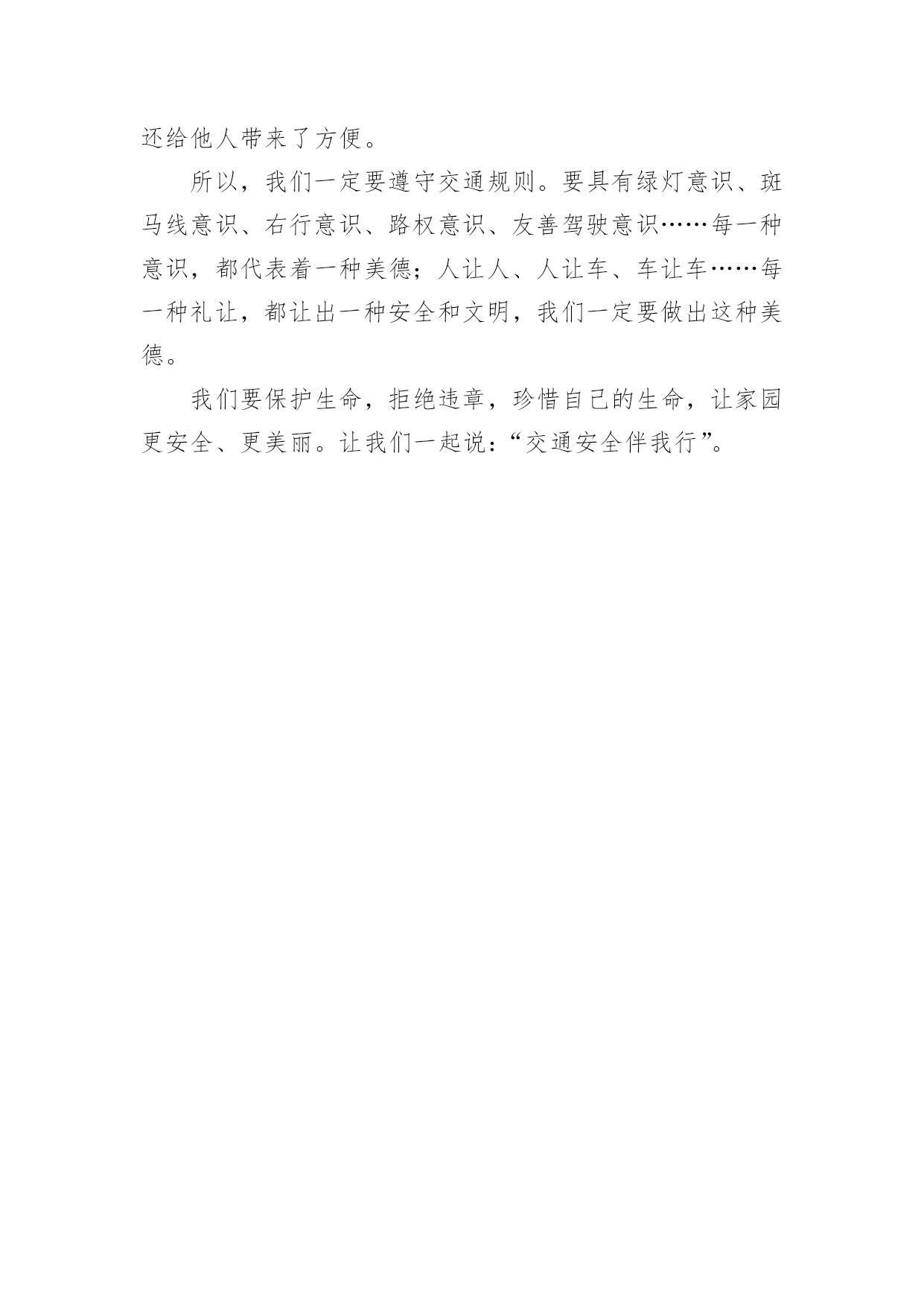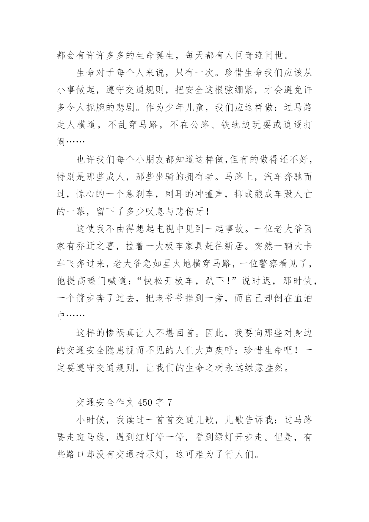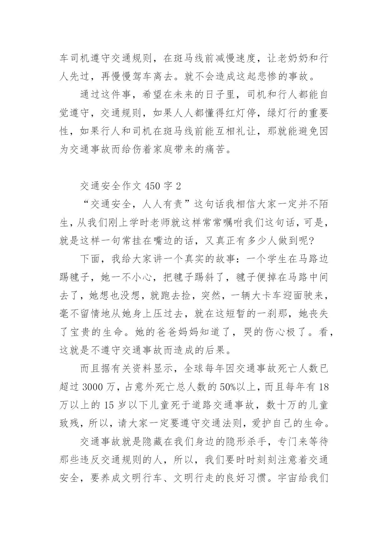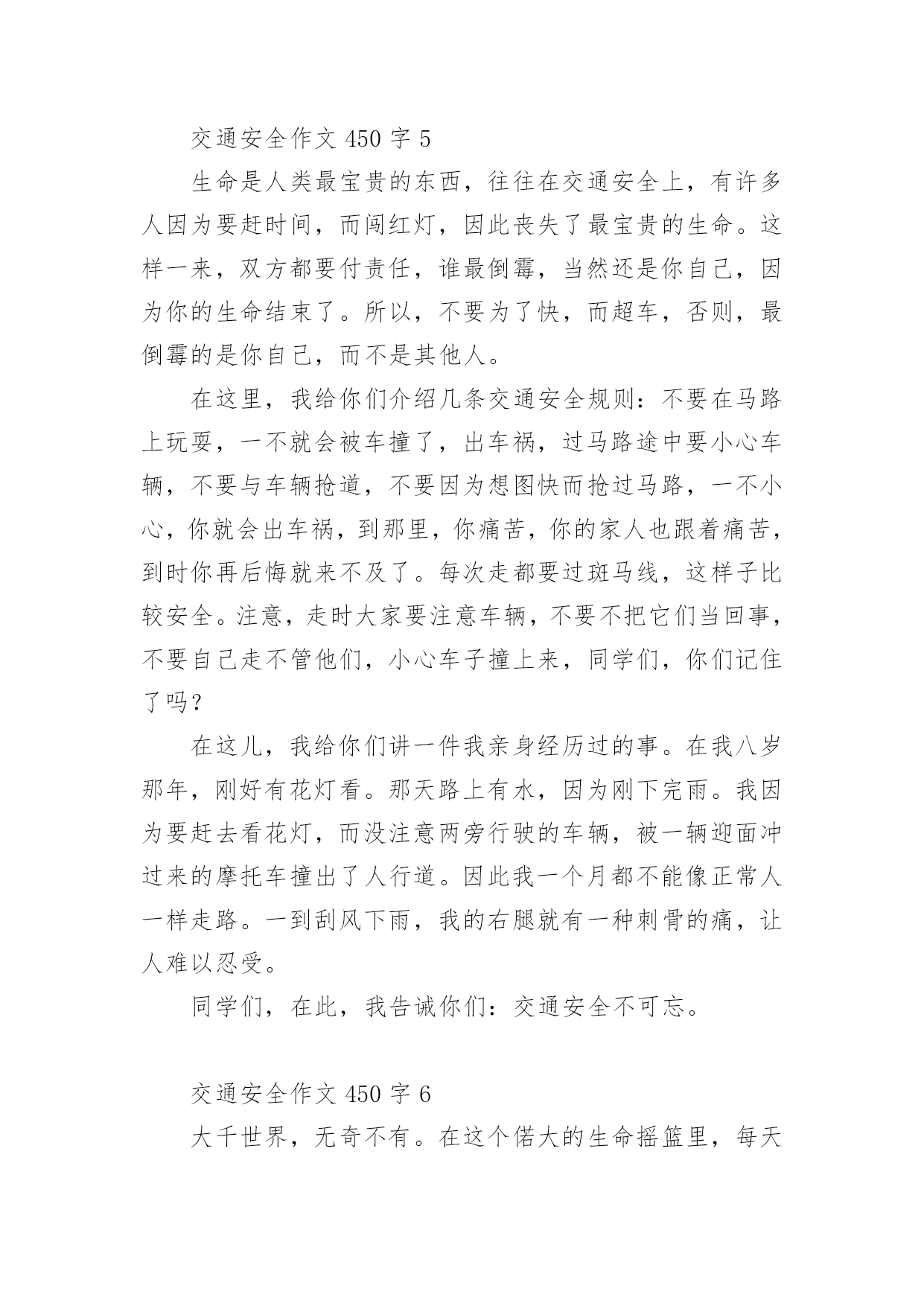 交通安全作文450字交通安全作文范文450字(精选9篇)无论是在学校还是在社会中,说到作文,大家肯定都不陌生吧,作文根据写作时限的不同可以分为限时作文和非限时作文。那么你有了解过作文吗?以下是小编帮大家整理的交通安全作文范文450字(精选9篇),供大家参考借鉴,希望可以帮助到有需要的朋友。交通安全作文450字1现在,人们的生活水平提高了,许多家庭都有了私家车,外来人口也逐渐增多。因此,给交通安全带来了许多困扰。这天,奶奶带我放学回家。在楼下看见隔壁楼梯的阿姨在抽泣,阿姨的肩膀颤动着,晶莹的泪水顺着她秀丽的脸颊流下来。我和奶奶上前询问,才得知她妈妈被车撞到,送到医院急救的消息:那天下午,隔壁老奶奶骑着自行车接小孙女回家,来到斑马线前,她自觉地下了自行车,牵着车子走过斑马线。这时,一辆出租车直撞过来,一下子就把老奶奶和小孙女撞倒在地上。老奶奶一瞬间便失去知觉,不醒人世了。老奶奶被人紧急送到医院抢救,可还是不治身亡了。听了这件事,我顿时愣住了,看者阿姨伤心的样子,心里不由泛起一阵同情和怜悯。我想:老天爷真不公平,这么好的人,这么善良的老奶奶,却因一场交通事故被夺去了宝贵的生命。如果那位出租车司机遵守交通规则,在斑马线前减慢速度,让老奶奶和行人先过,再慢慢驾车离去。就不会造成这起悲惨的事故。通过这件事,希望在未来的日子里,司机和行人都能自觉遵守,交通规则,如果人人都懂得红灯停,绿灯行的重要性,如果行人和司机在斑马线前能互相礼让,那就能避免因为交通事故而给伤着家庭带来的痛苦。交通安全作文450字2“交通安全,人人有责”这句话我相信大家一定并不陌生,从我们刚上学时老师就这样常常嘱咐我们这句话,可是,就是这样一句常挂在嘴边的话,又真正有多少人做到呢?下面,我给大家讲一个真实的故事:一个学生在马路边踢毽子,她一不小心,把毽子踢斜了,毽子便掉在马路中间去了,她想也没想,就跑去捡,突然,一辆大卡车迎面驶来,毫不留情地从她身上压过去,就在这短暂的一刹那,她丧失了宝贵的生命。她的爸爸妈妈知道了,哭的伤心极了。看,这就是不遵守交通事故而造成的后果。而且据有关资料显示,全球每年因交通事故死亡人数已超过3000万,占意外死亡总人数的50%以上,而且每年有18万以上的15岁以下儿童死于道路交通事故,数十万的儿童致残,所以,请大家一定要遵守交通法则,爱护自己的生命。交通事故就是隐藏在我们身边的隐形杀手,专门来等待那些违反交通规则的人,所以,我们要时时刻刻注意着交通安全,要养成文明行车、文明行走的良好习惯。宇宙给我们每一个人的生命只有一次,为了亲人,为了别人,更为了自己,请好好珍惜生命!请大家自觉遵守交通法则,让交通工具更好地造福与我们的人类吧。交通安全作文450字3”车祸“一个熟悉而又陌生的词语。每天的新闻报道中几乎都有它的存在,老师和学校也经常教育我们,要遵守交通规则,安全第一……但我总觉得车祸离我们很远,总是在电视中看到,甚至还觉得遥不可及……但就在星期三的上午,我们学校门口发生了一起触目惊心的交通事故。在十字路口的红绿灯旁,一辆大卡车撞死了一个人……大家都觉得好不可思议,车祸居然就发生在我们眼前……中午回到家,听妈妈谈论起这场车祸,”好端端的一条生命啊,就这样没了,可惜啊……“往常充满了欢声笑语的餐桌在此时显得很沉重。我不禁鼻子一酸,那他的家人呢?会有多伤心、悲痛啊?生命是无价的,每个人只有一次啊!他怎么那么不爱惜自己的生命啊?只为了贪一时的方便,就闯红灯,不遵守交通规则,还赔上了自己的生命。这样值得吗?交通规则,人人遵守。这句话所有的人都要铭记在心!一刻也不能忘!珍惜自己的生命,安全第一!每天上下学,我都会看见十字路口上那一滩红色的血,那一个醒目的红色警告。它时刻提醒着我,提醒着当时所有的人,生命是多么可贵,遵守交通规则多么重要!交通安全作文450字4在生命面前,我们无法抵抗,因为生命只有一次。在我们小学生眼里,交通事故是异常恐怖的事情。如果在马路上横冲直撞,稍不慎,车毁人亡,这样的损失是非常惨重的,不仅损失了一辆车,还损失了一个可爱的生命。因此我们上下学时要走人行横道线,穿马路时注意红绿灯。交通事故不仅给了我们毁灭性的灾难,也给我们长了一个记性。不超速、不超载、不酒后驾驶……总之,交通安全是每个人必不可少的安全知识,我们必须多了解,多探秘,让我们的安全知识更上一层楼。记得我在报纸上看到过这样一篇报道:在一家灯火辉煌的酒店里,冲出一名跌跌撞撞的醉汉,酒店里又传出一句话,“小李,再来喝一杯!”“不……不用了,我……我要回去。”接着传来摩托车发动的'声音,带着疲倦与醉意,人与车匆忙上路了。“啊——”一声尖叫划破夜空,还没等他睁开眼睛,行人已被撞倒在人行道上,殷红的鲜血流了一地。名言说得好:“开车不喝酒,喝酒不开车”,希望大家以后引以为戒,更加谨慎。同学